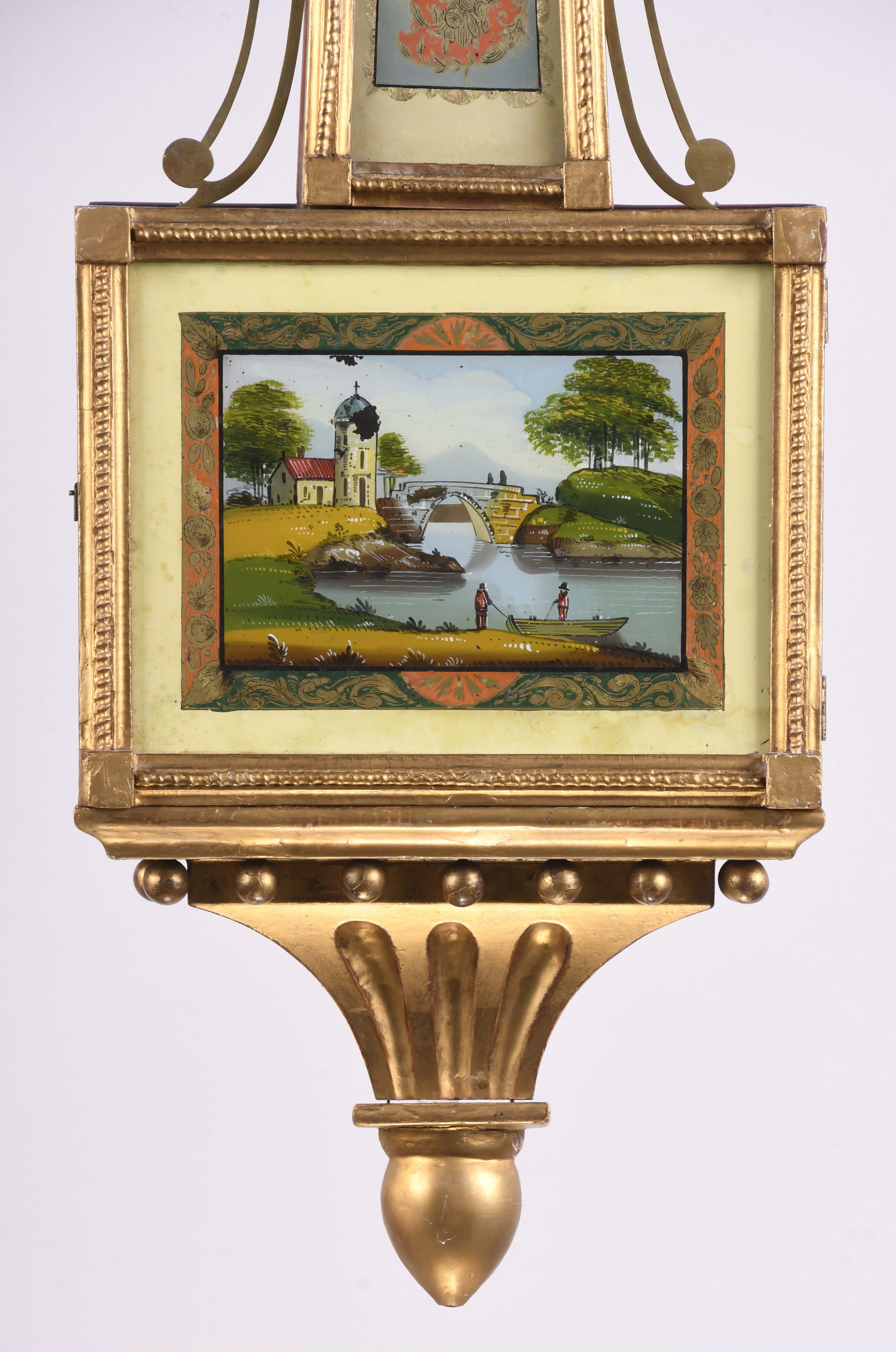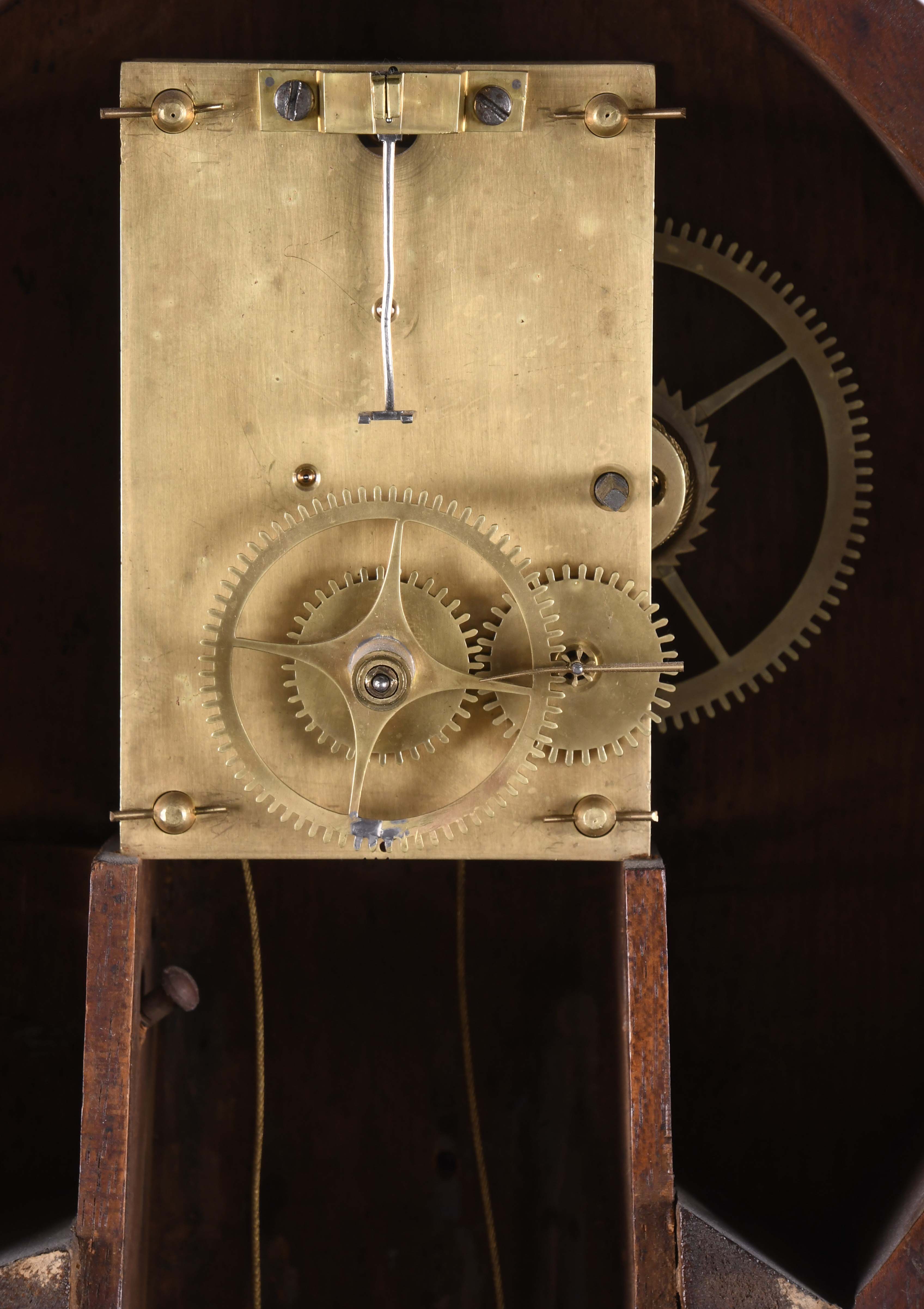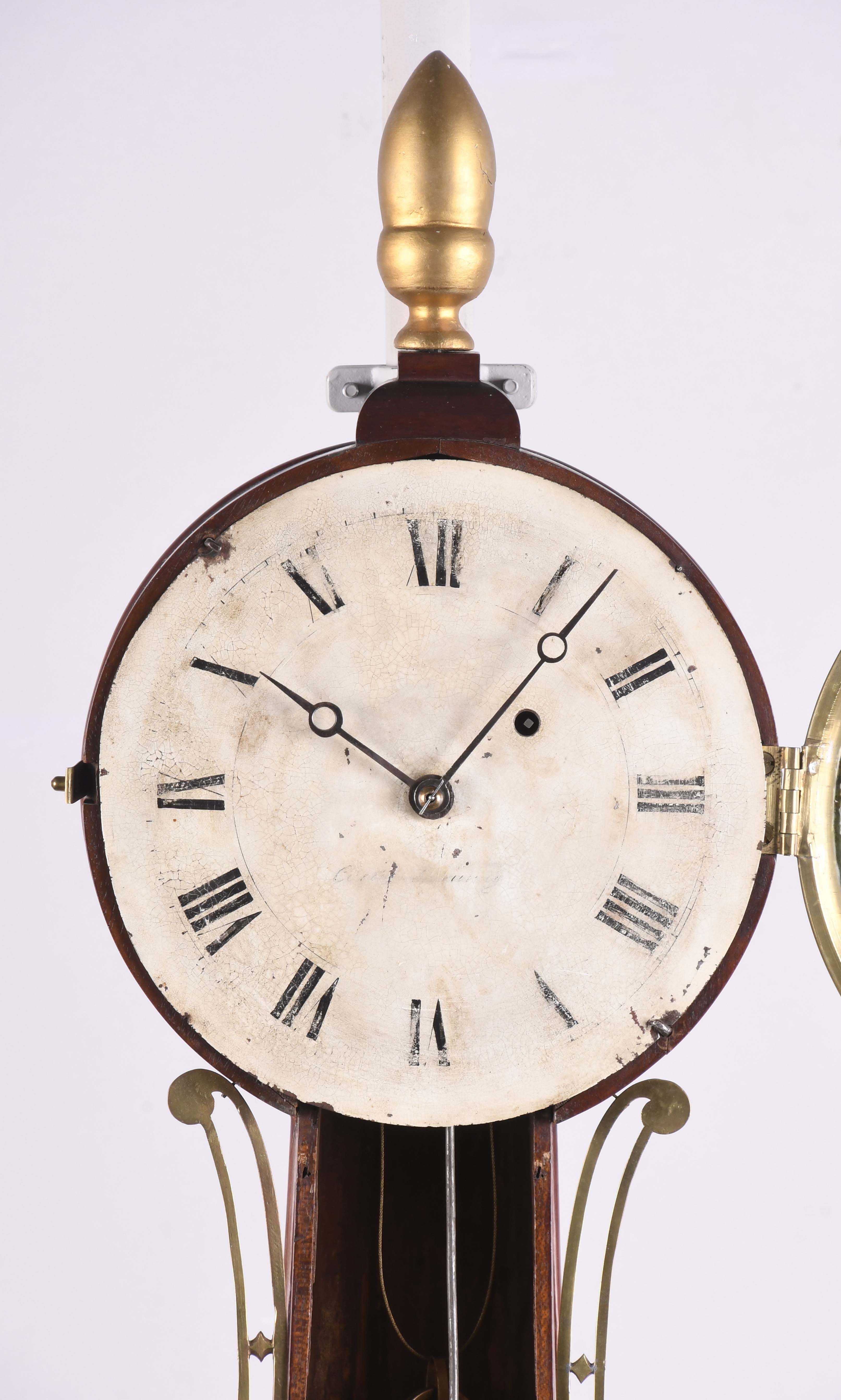 case in good condition in an old finish, original dial is fastened to the case with two L-turns has wear to the numbers and surface stains, original signature is worn and difficult to read, but enough remains to identify the maker, both tablets are old and possibly original, but they have been out of the frames, bottom corner glue blocks are replacements.