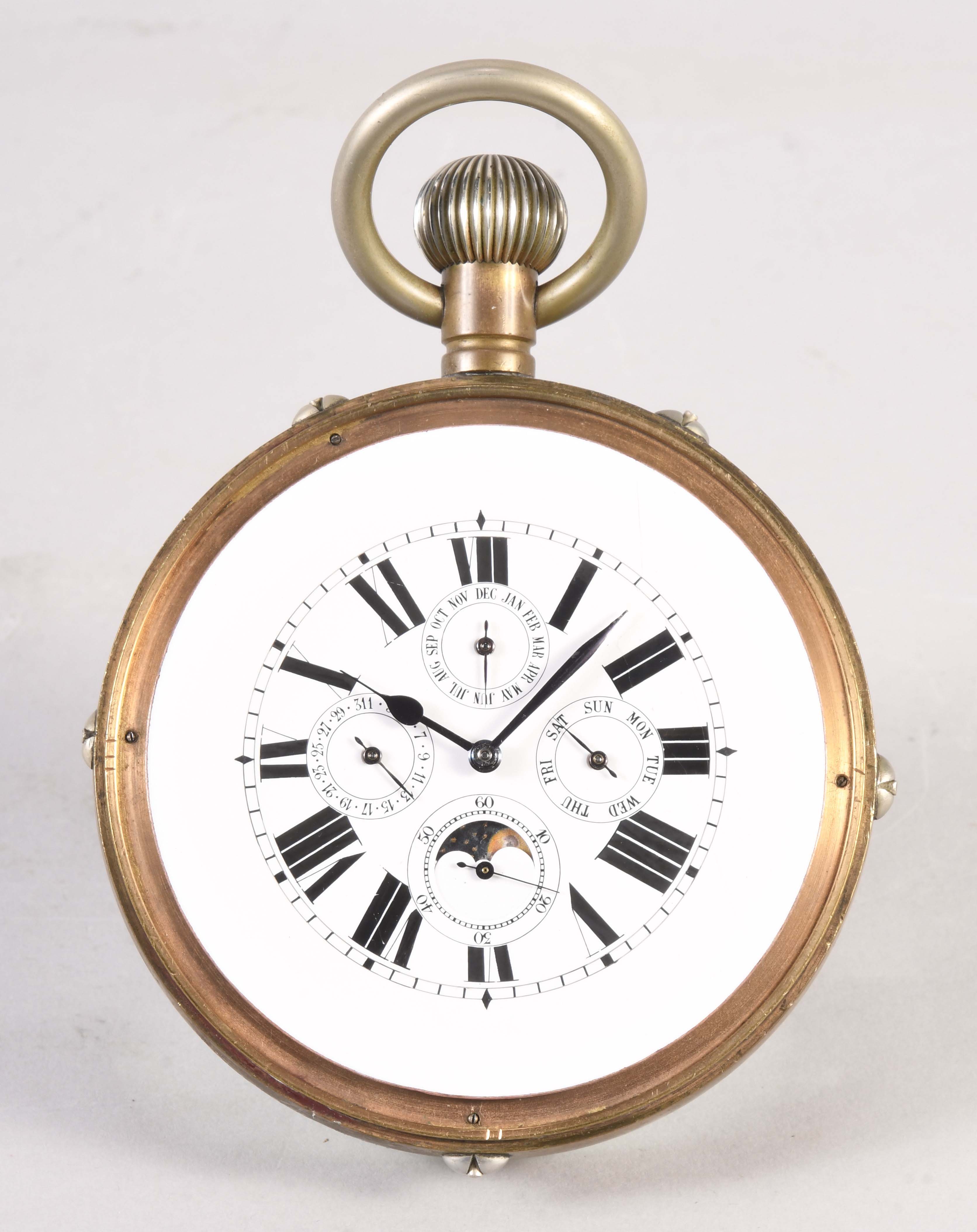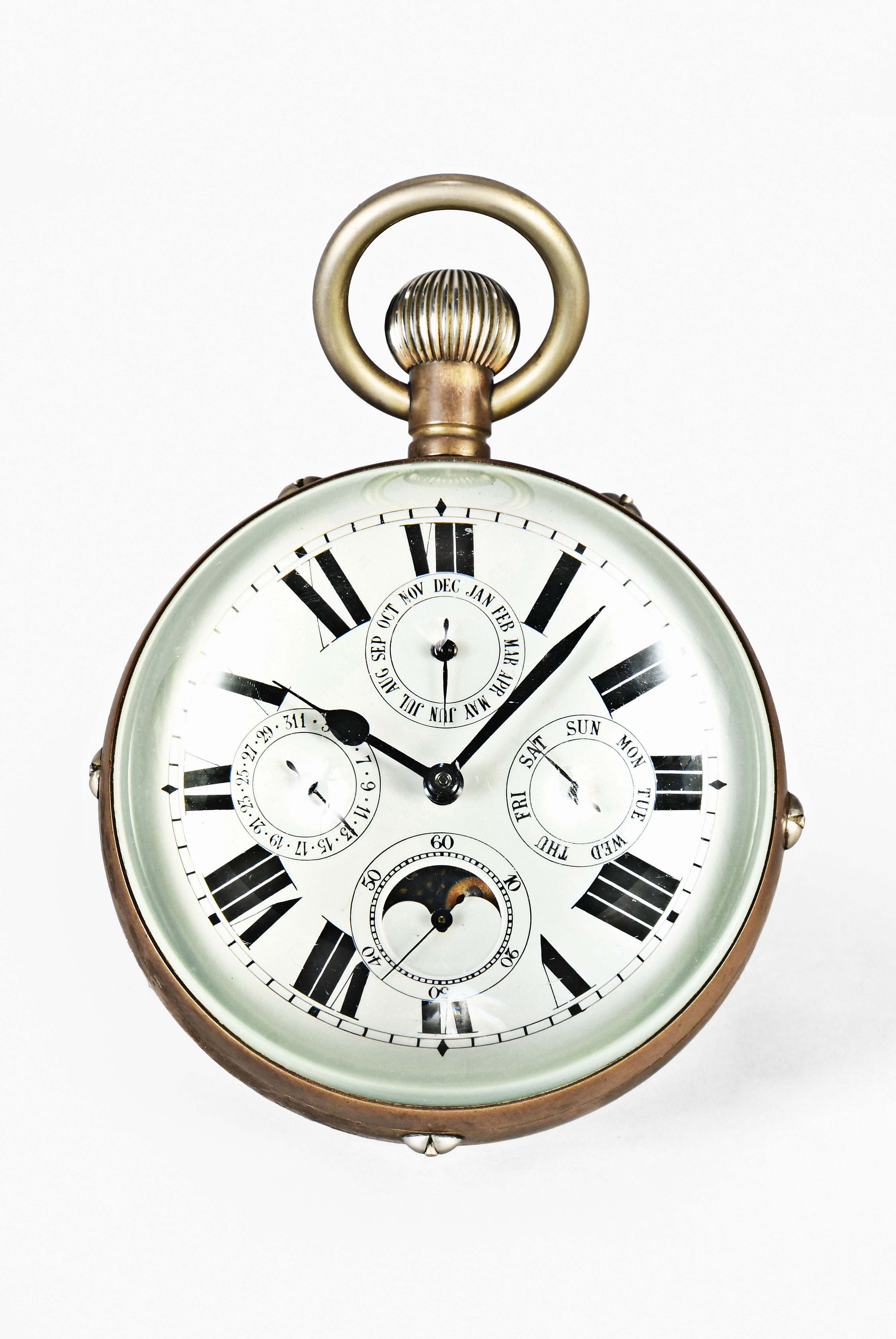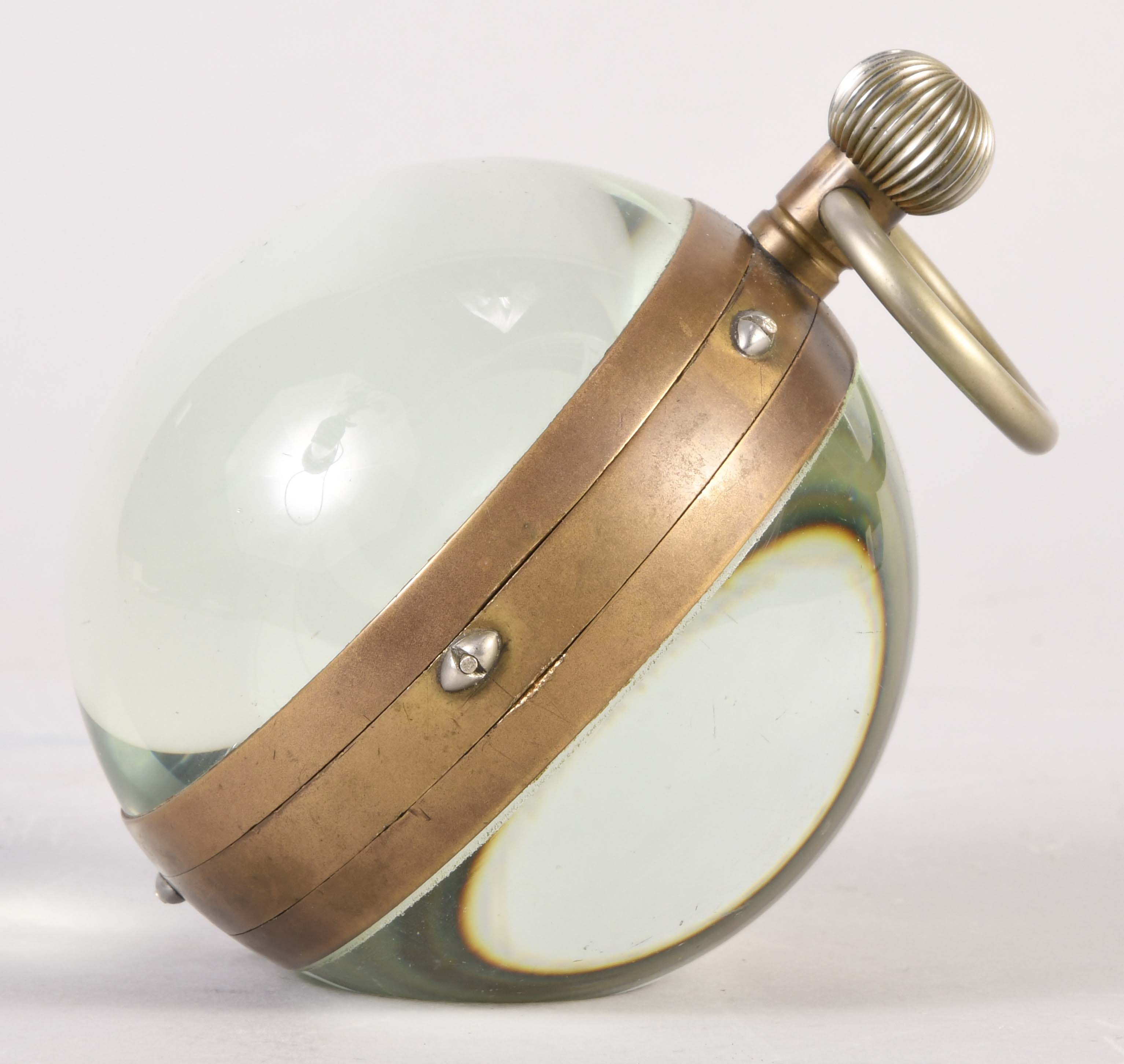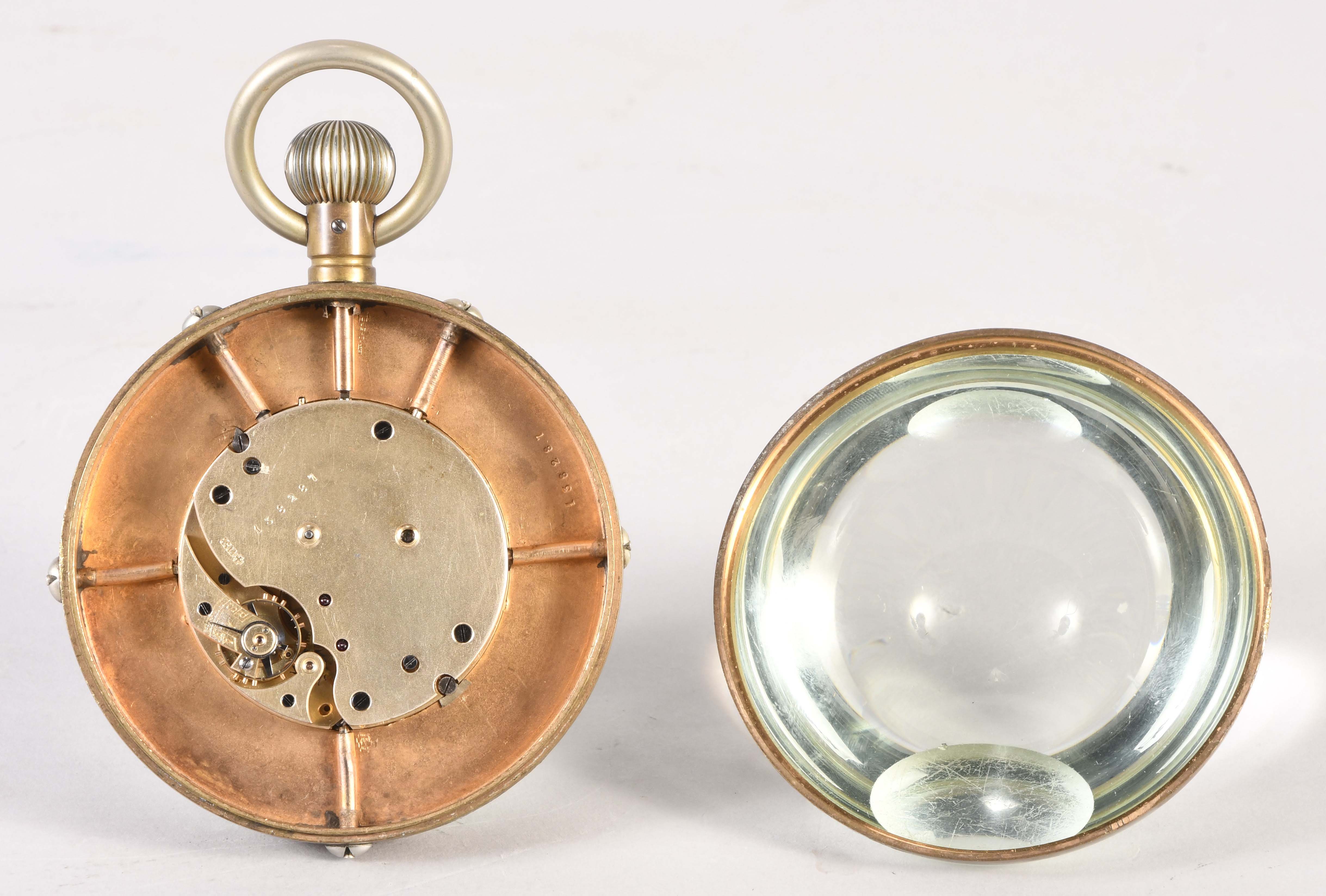 Switzerland, an early 20th century Swiss paperweight clock with calendar, 13 jewel gilt plate movement with lever escapement, white enamel dial with subsidiary dials indicating the month, day and date, and with moon phase display at 6:00, contained in a glass sphere, serial #138287