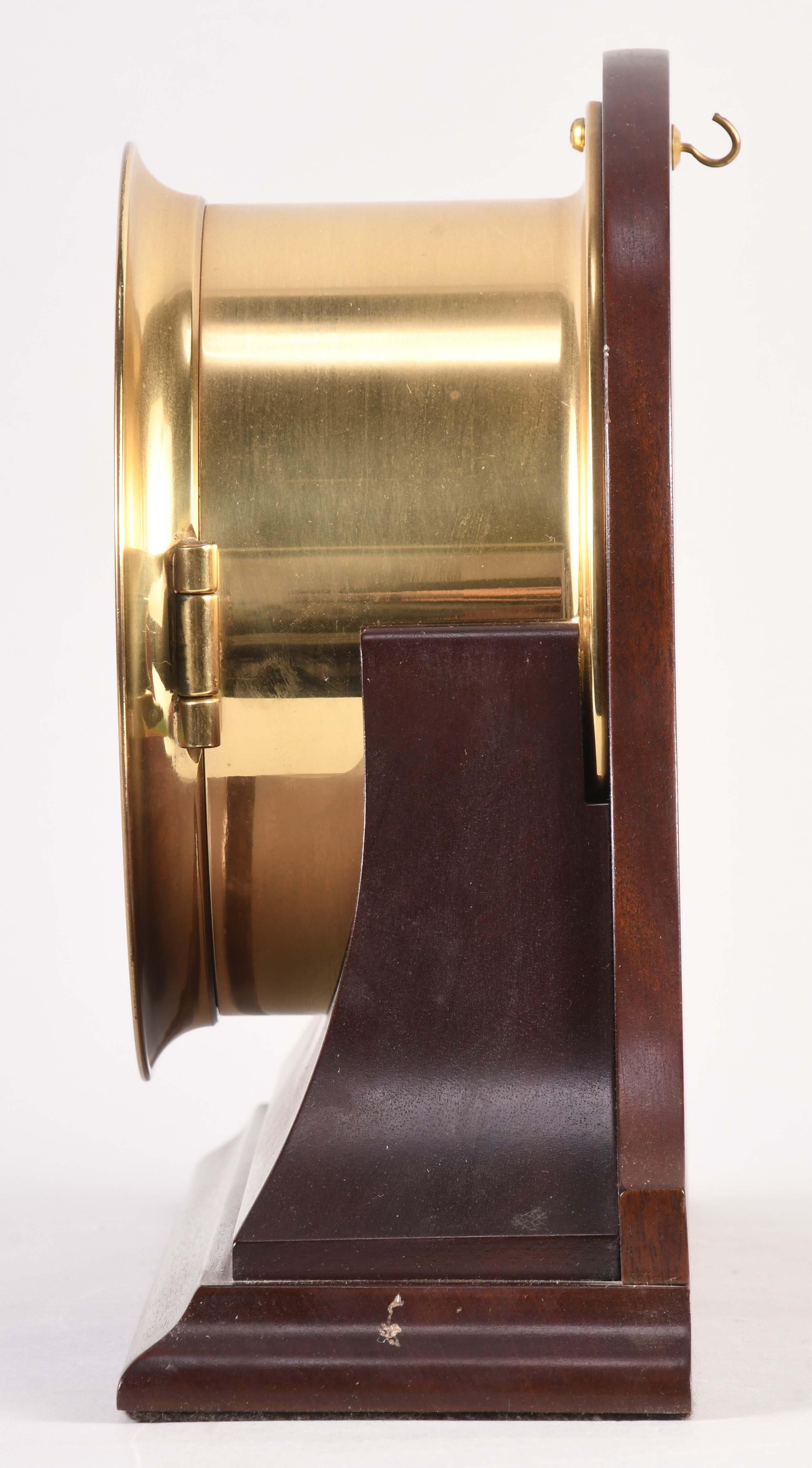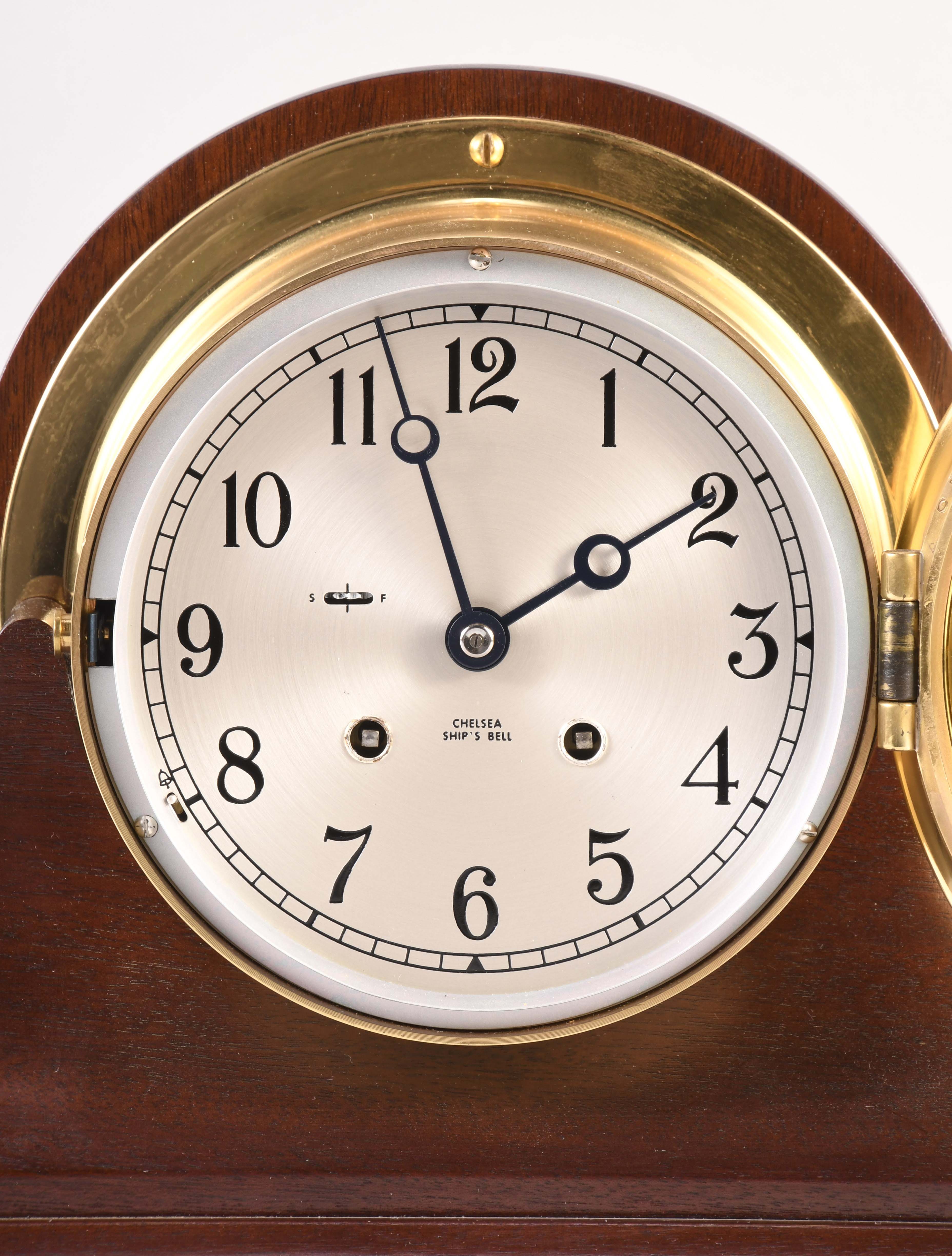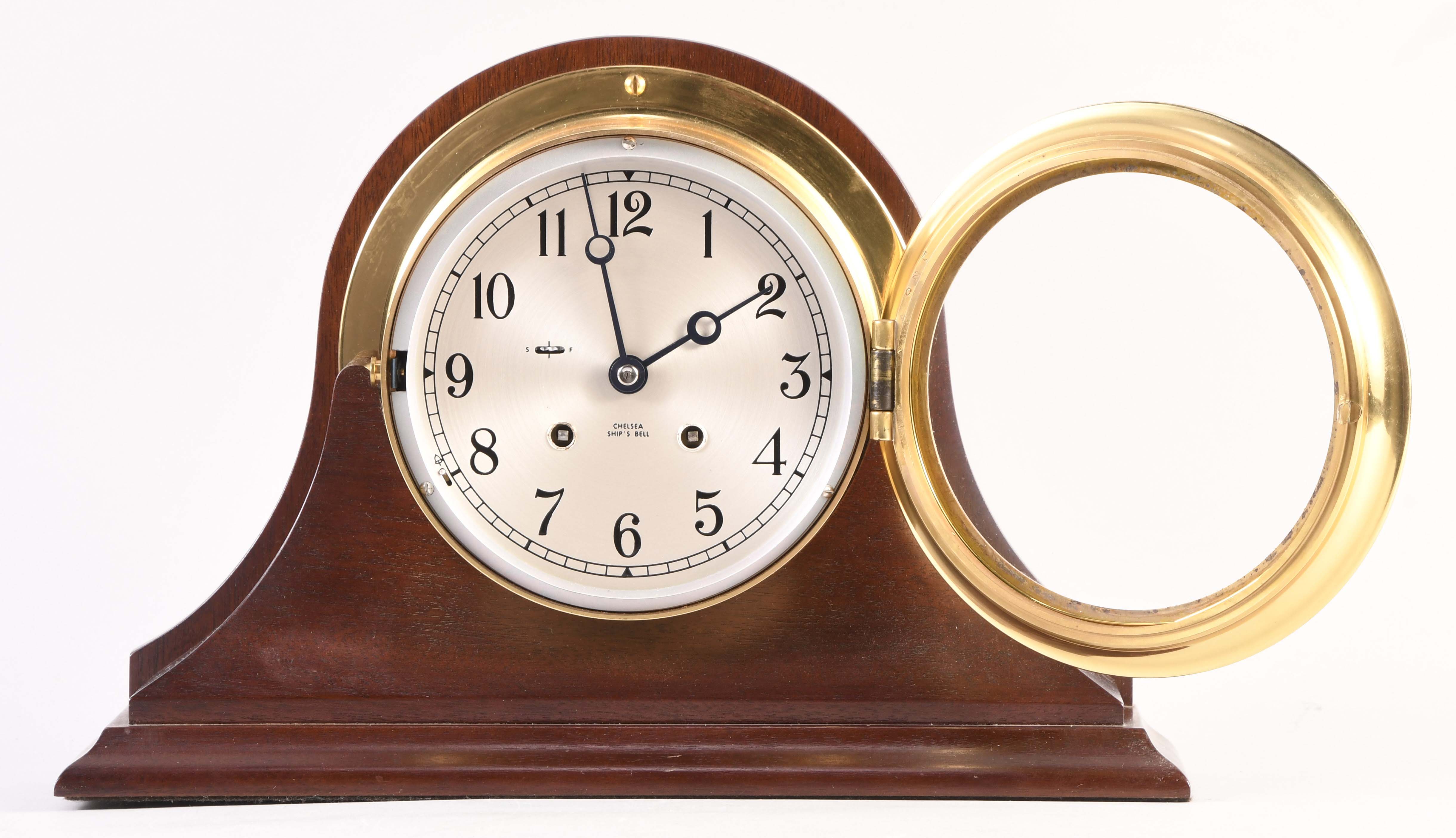 Chelsea Clock Co., Boston, Mass. "Marine" ships clock in polished brass case mounted on mahogany stand, silvered dial with arabic numerals, blued moon hands, eight day, time and ships bell strike, case serial #91