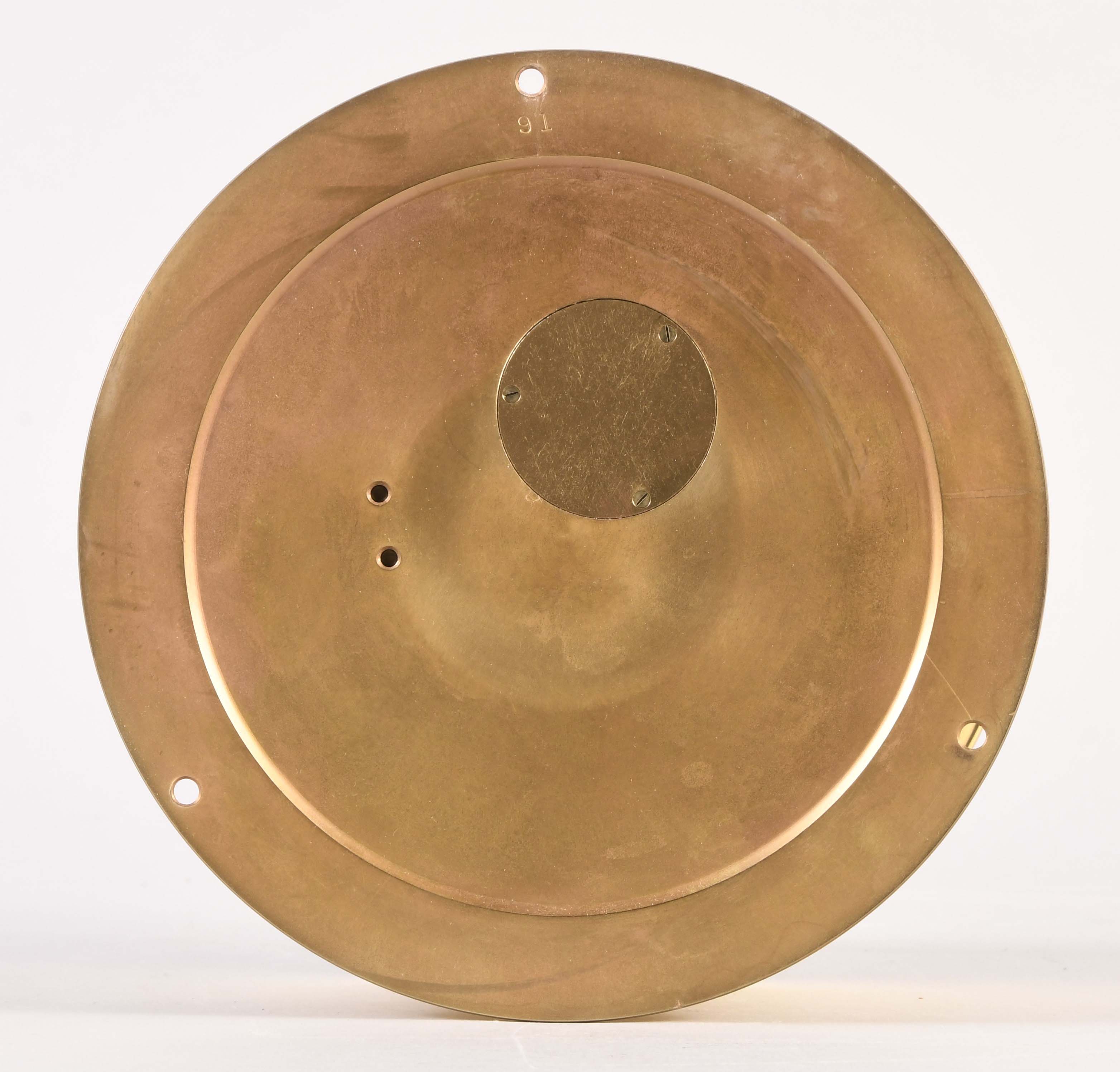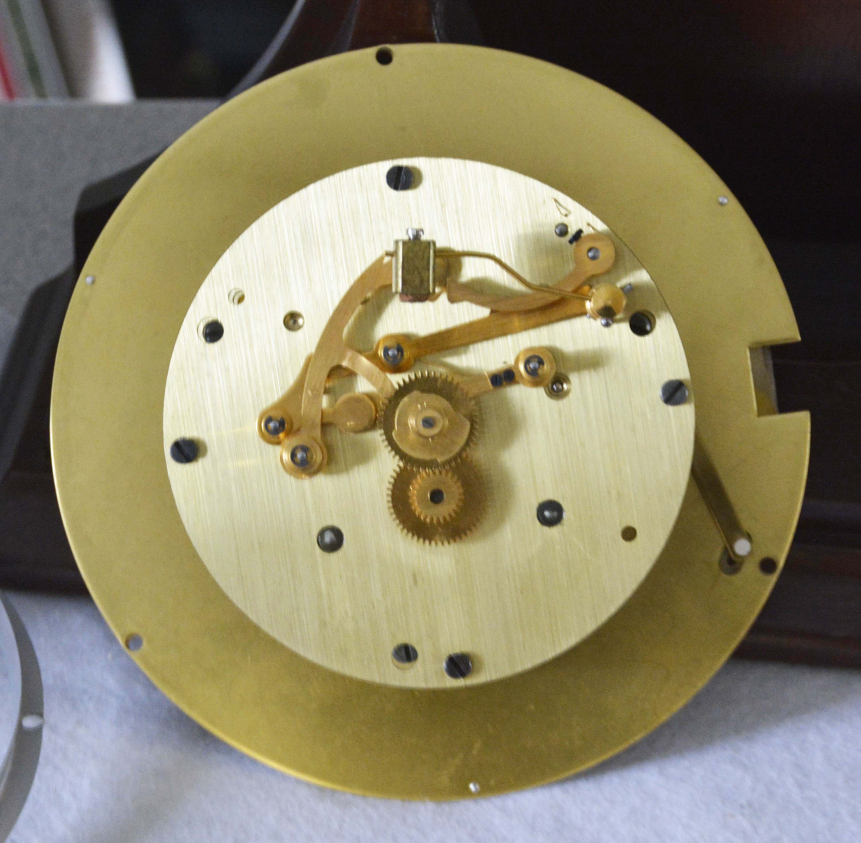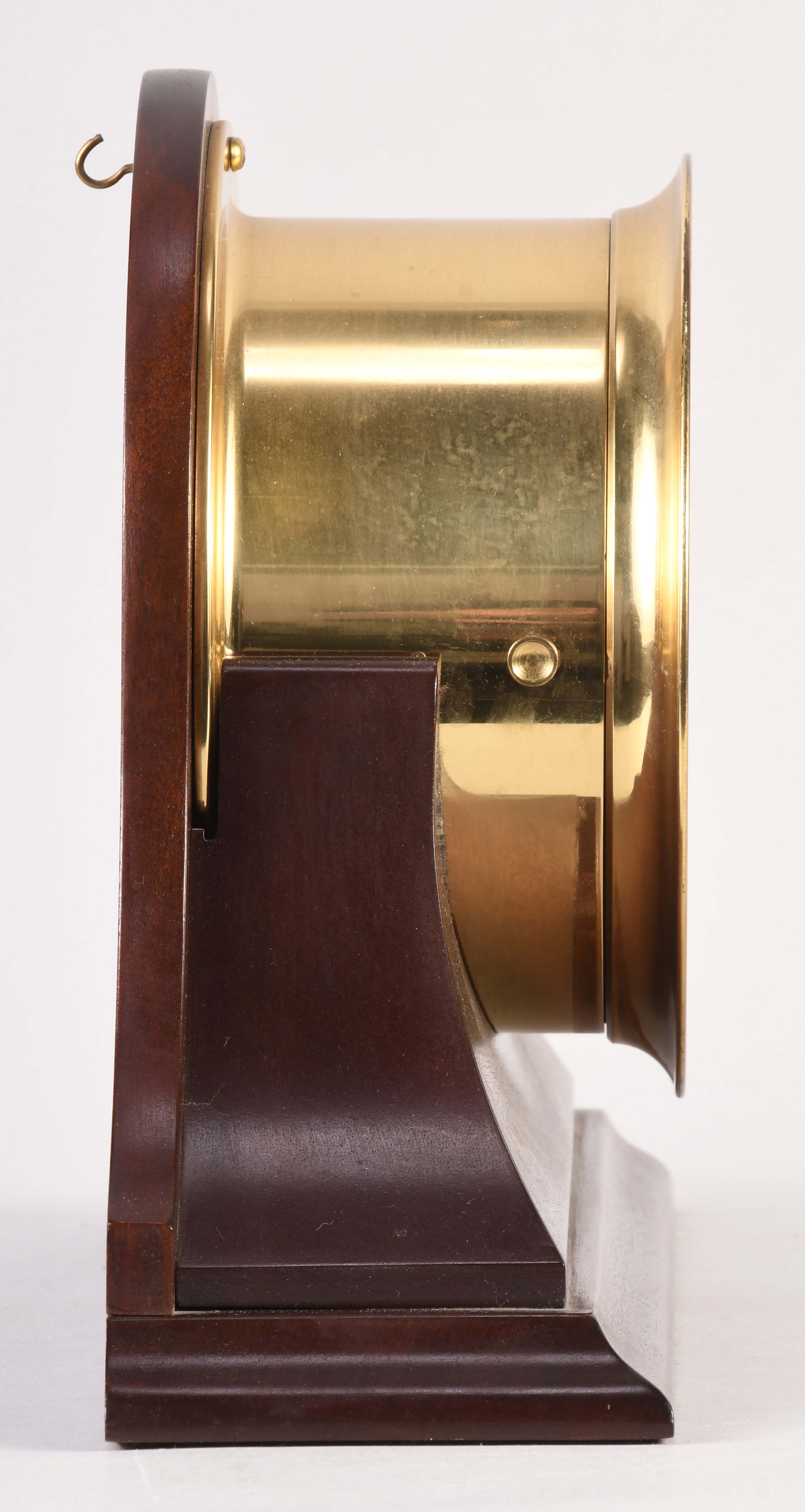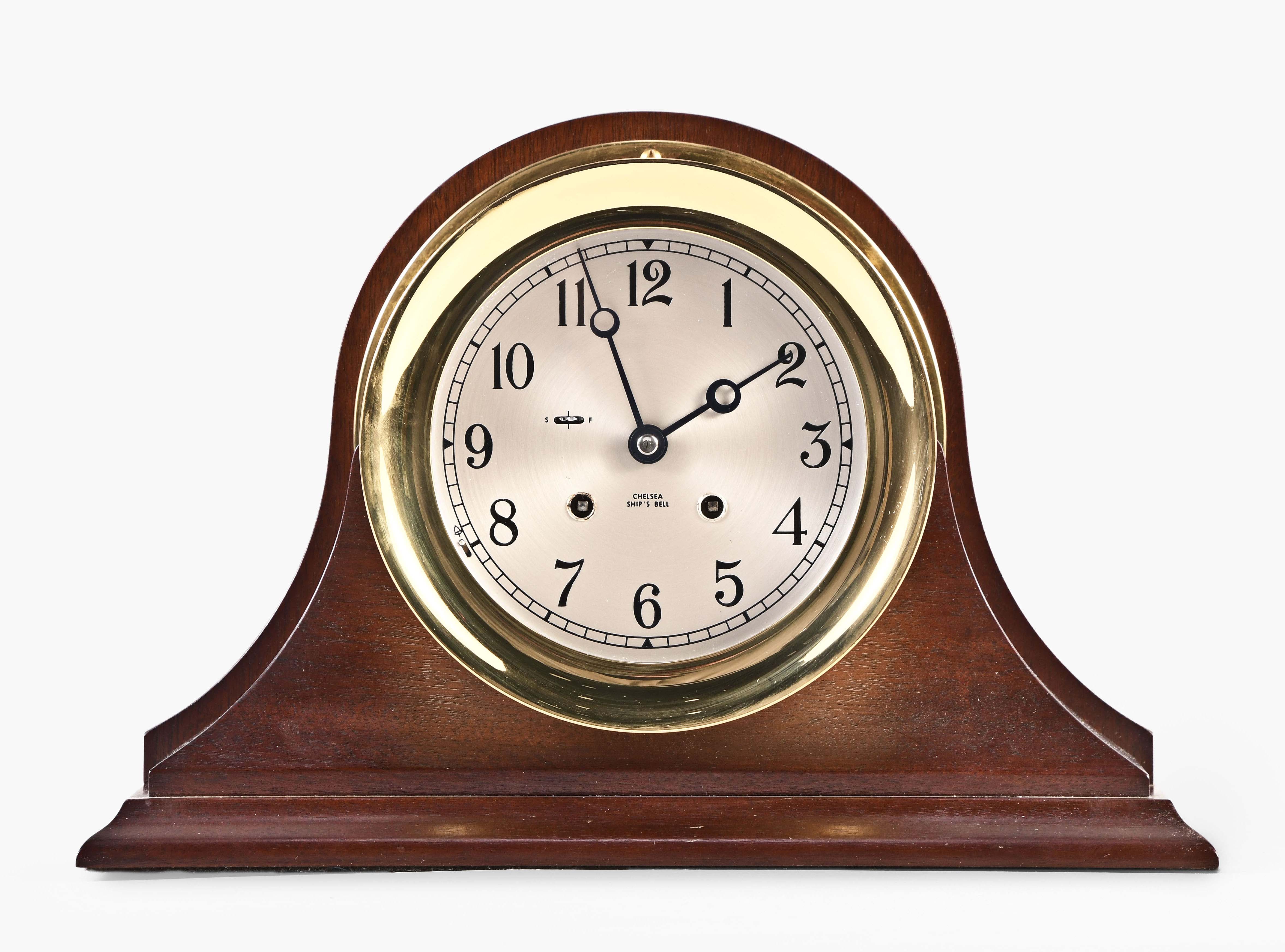Chelsea Clock Co., Boston, Mass. "Marine" ships clock in polished brass case mounted on mahogany stand, silvered dial with arabic numerals, blued moon hands, eight day, time and ships bell strike, case serial #91