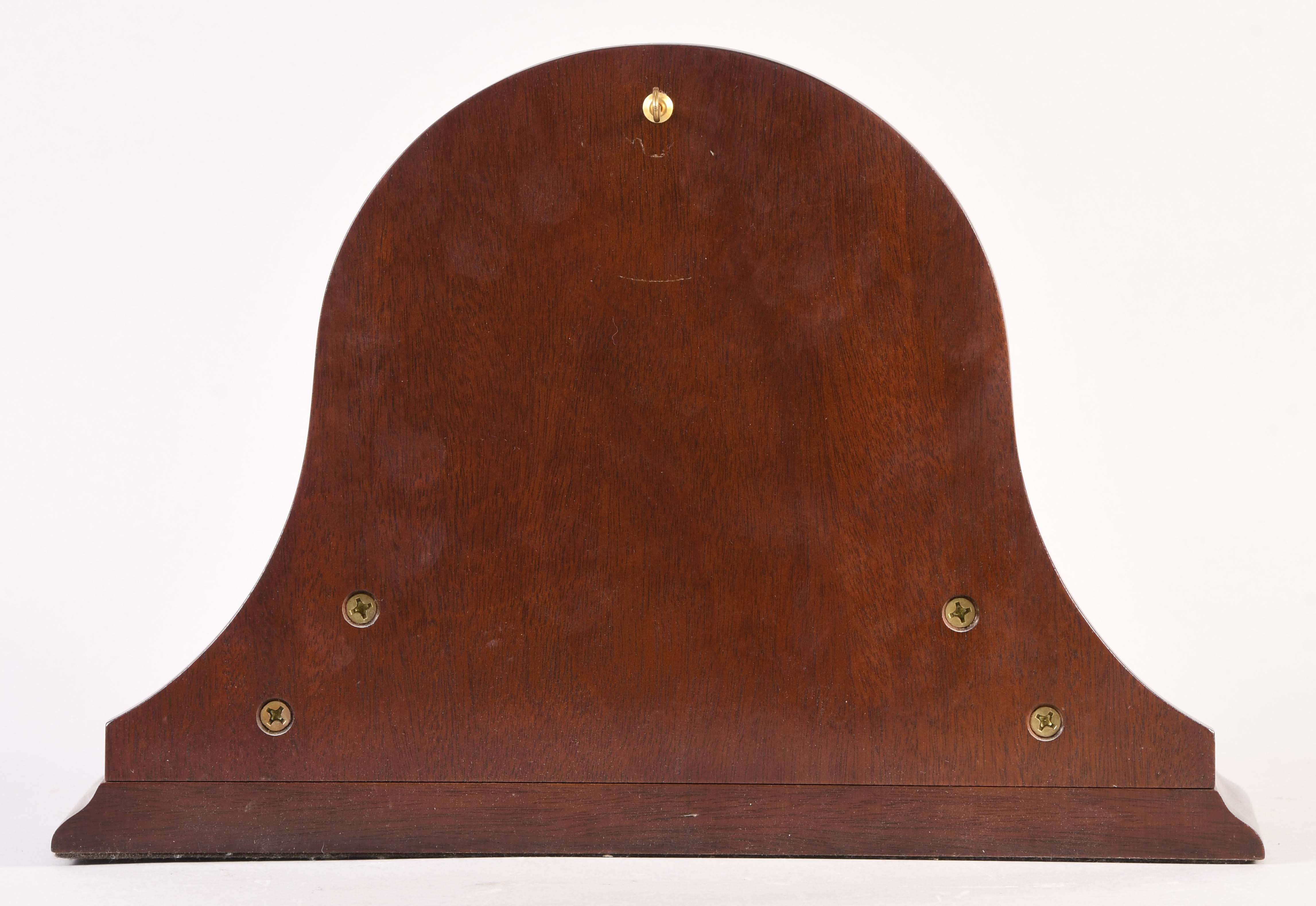 movement without serial number, brass case retains its finish, mahogany stand with a small scratch on left hand base, silvered brass dial in excellent condition, movement clean and appears in good working order; ticking and striking
