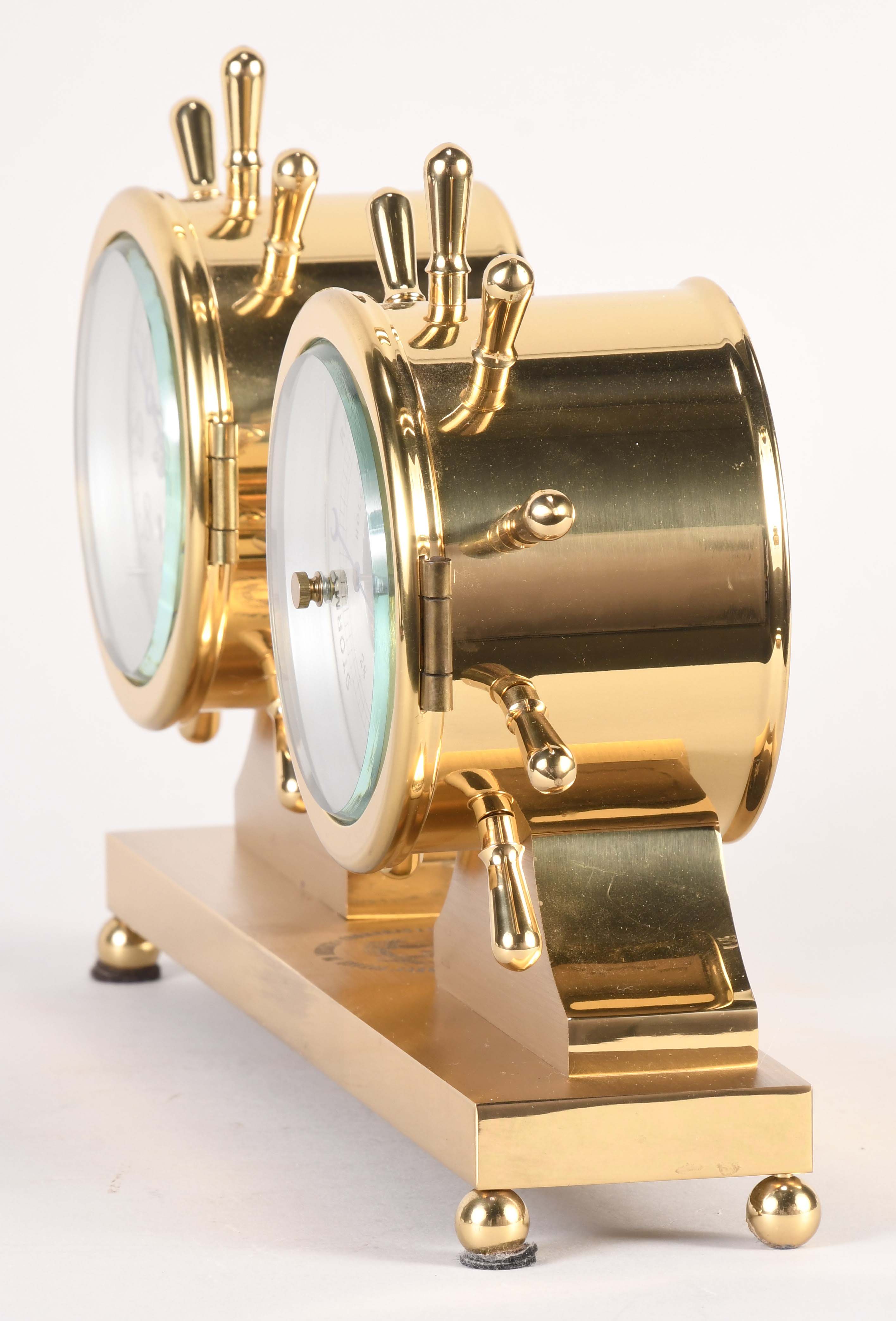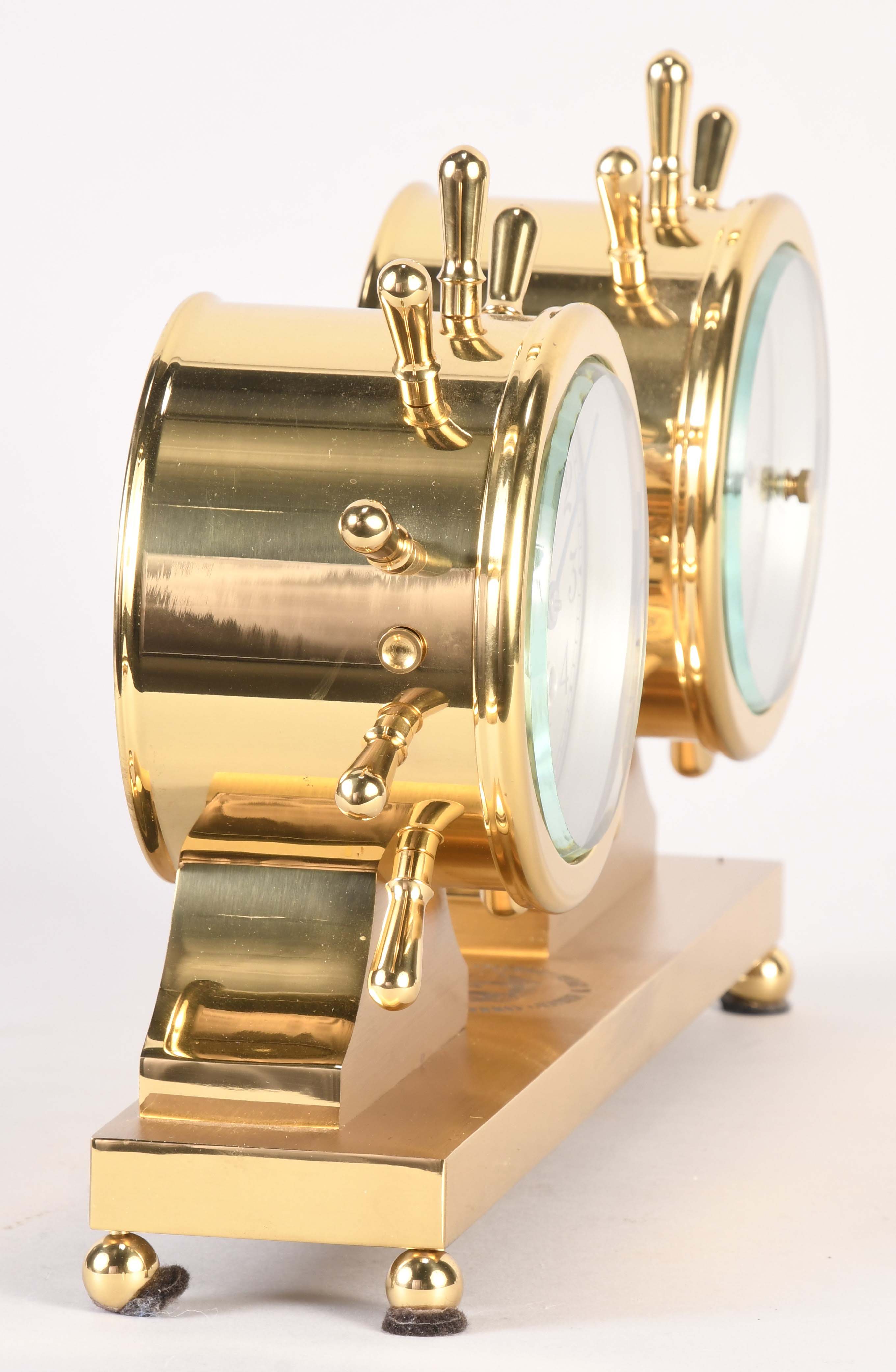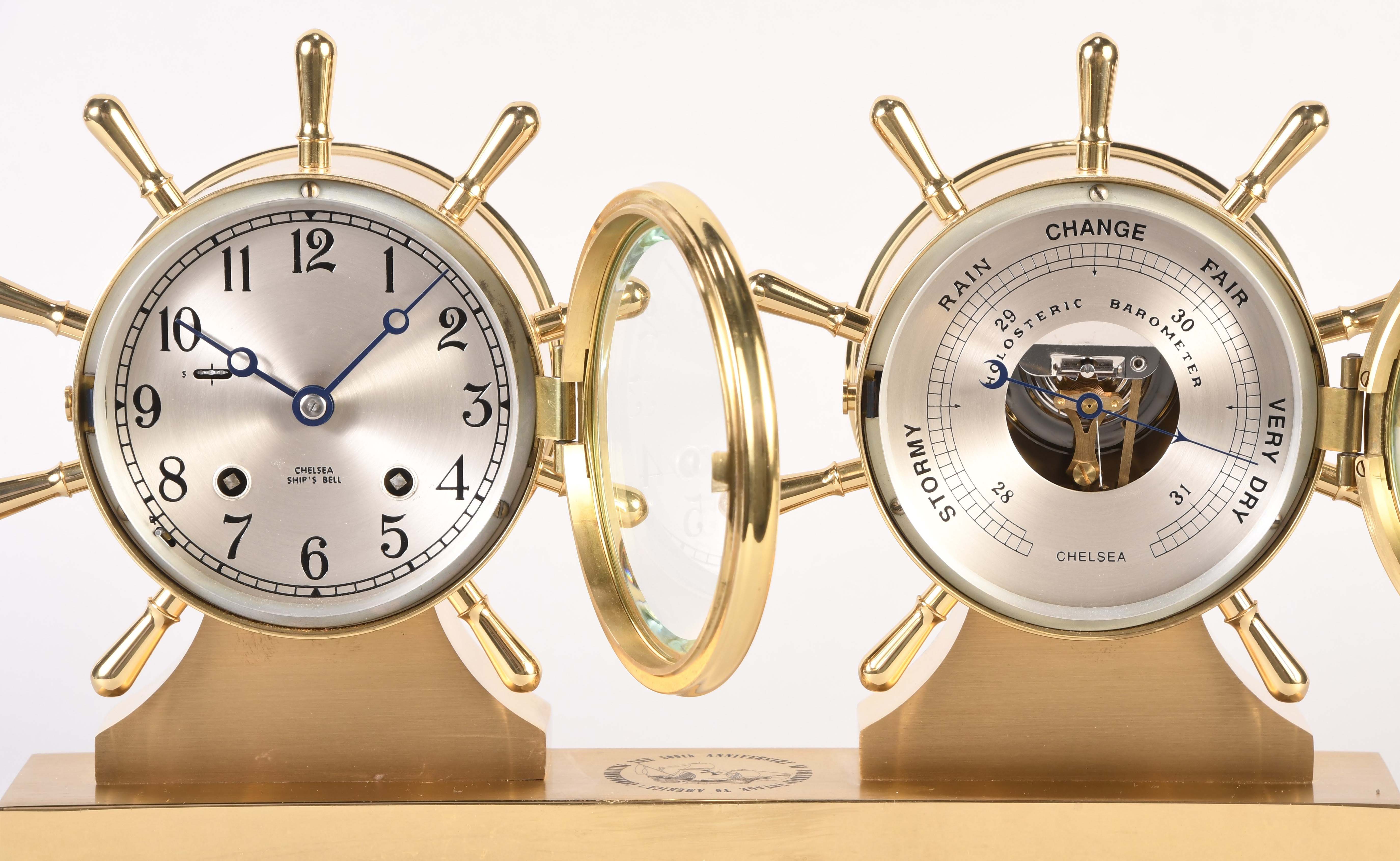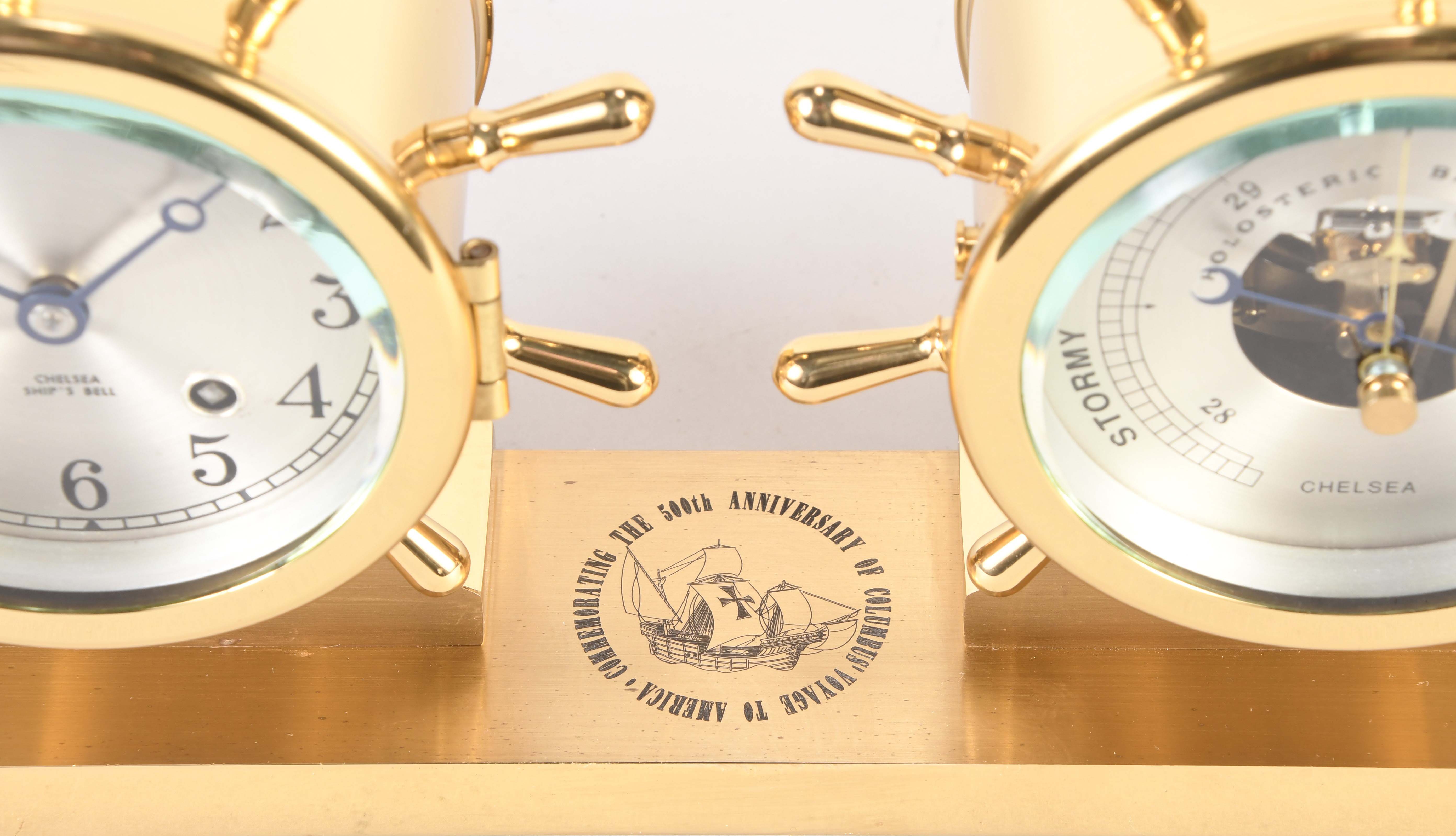 Chelsea Clock Co., Boston, Mass., "Claremont" shelf clock and barometer in original box, polished brass case mounted on an engraved brass base atop of balled feet, case marked "Commemorating the 500th anniversary of Columbus' Voyage to America" and "Limited Edition #235", silvered brass dial, blued moon hands, eight day, time and ship's bell strike spring driven lever movement, holosteric barometer