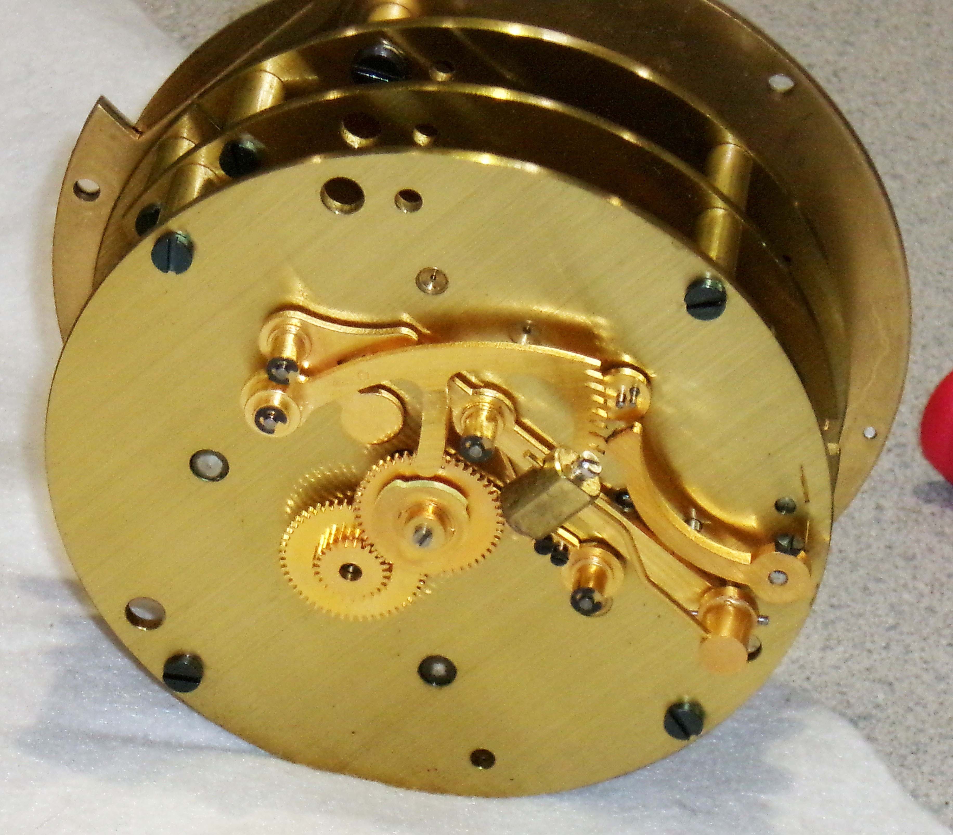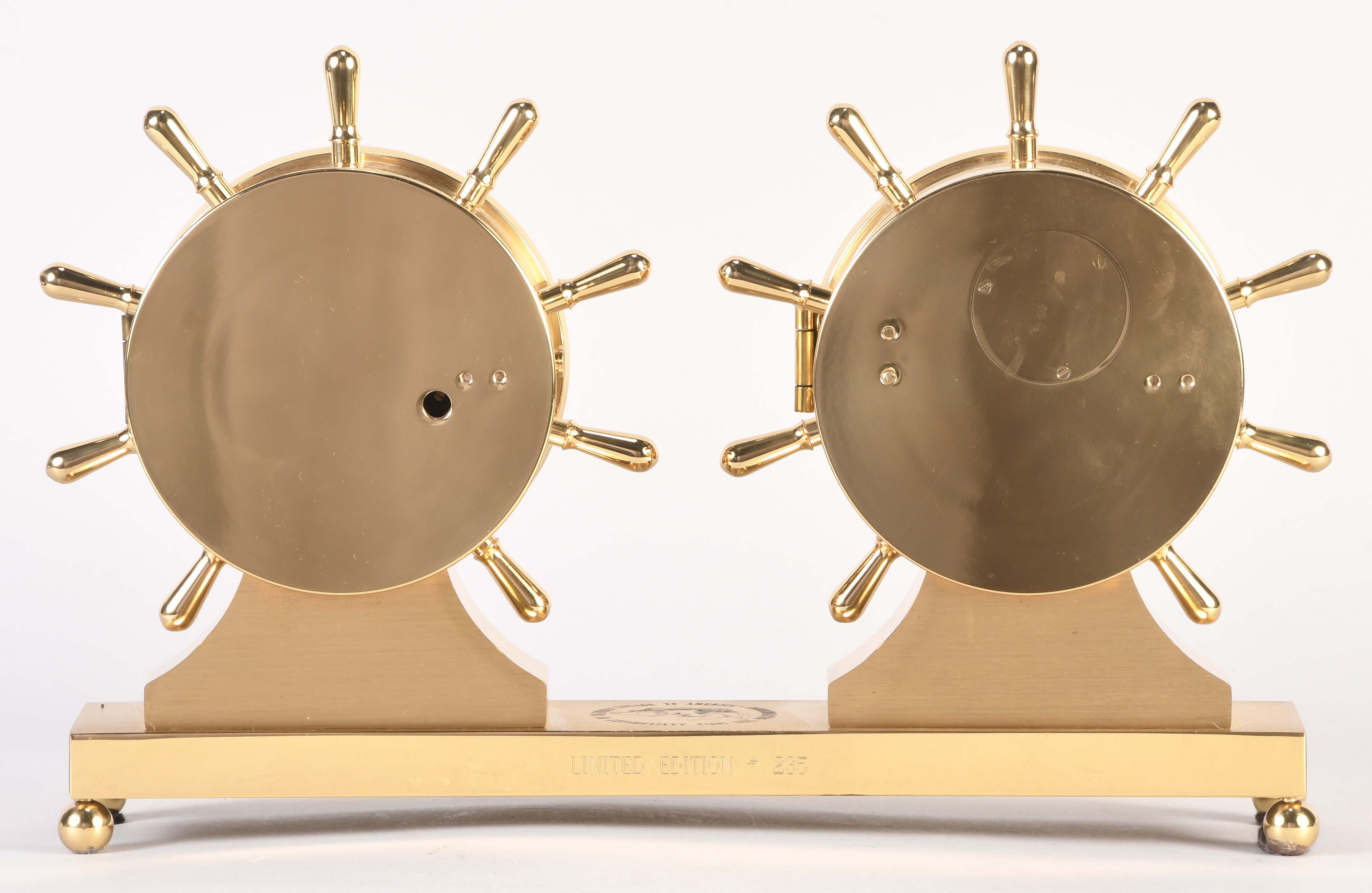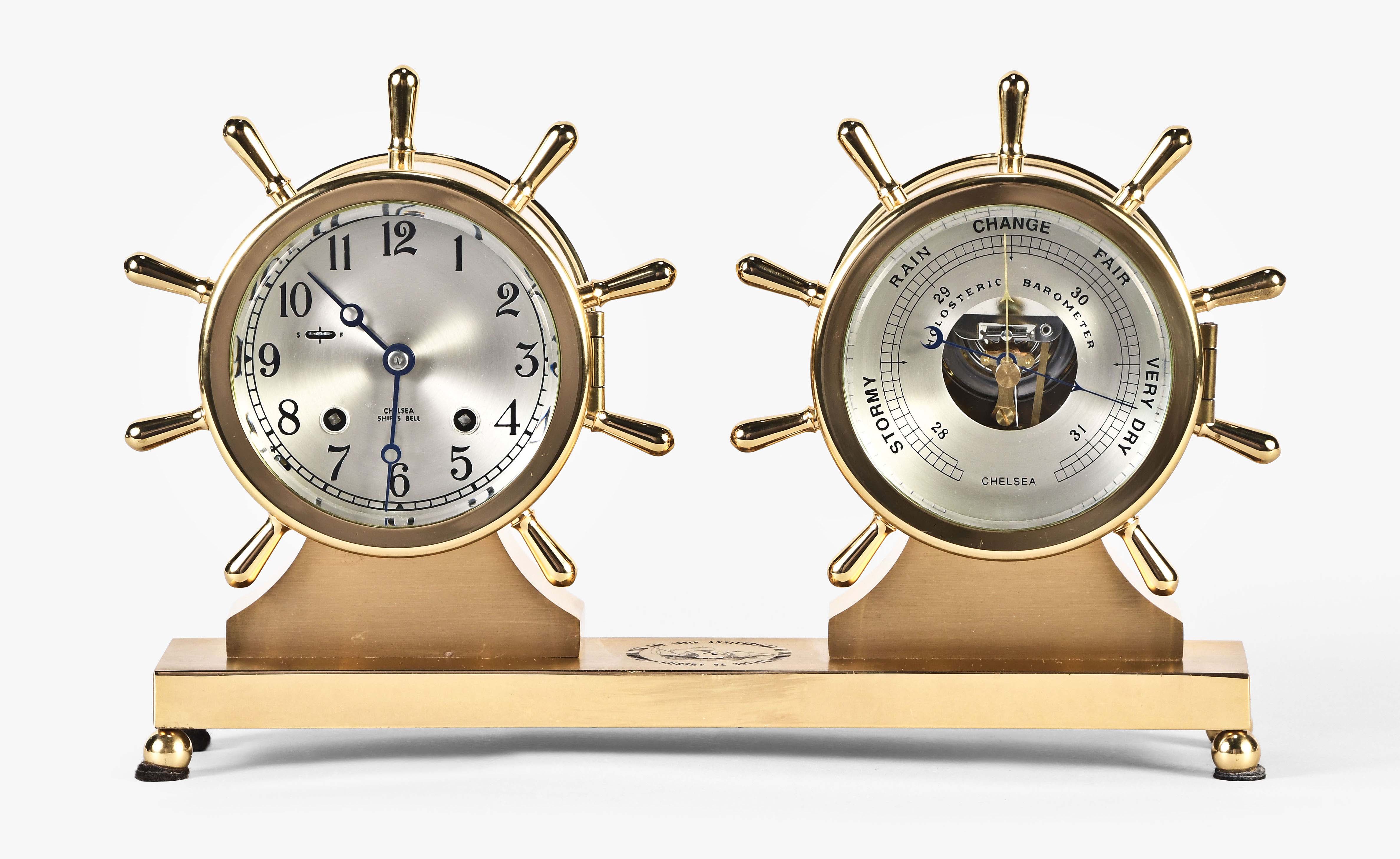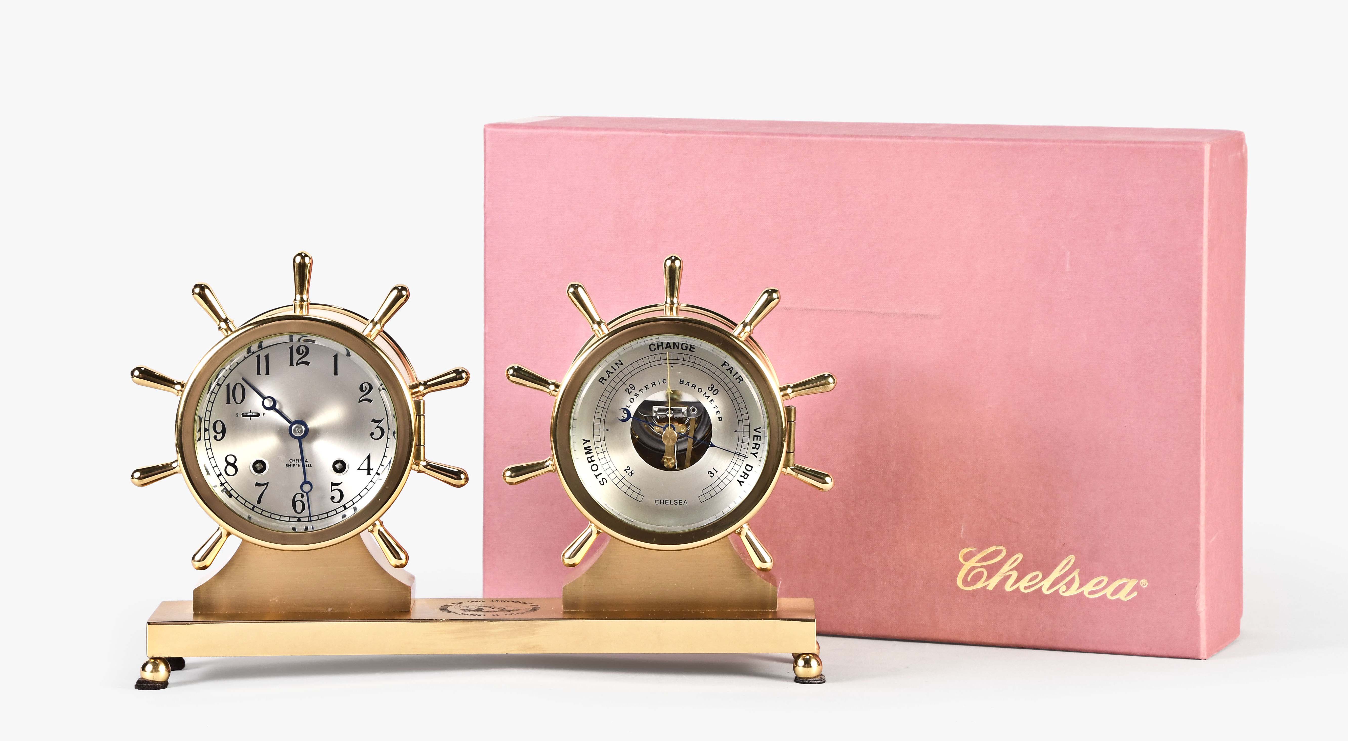 Chelsea Clock Co., Boston, Mass., "Claremont" shelf clock and barometer in original box, polished brass case mounted on an engraved brass base atop of balled feet, case marked "Commemorating the 500th anniversary of Columbus' Voyage to America" and "Limited Edition #235", silvered brass dial, blued moon hands, eight day, time and ship's bell strike spring driven lever movement, holosteric barometer