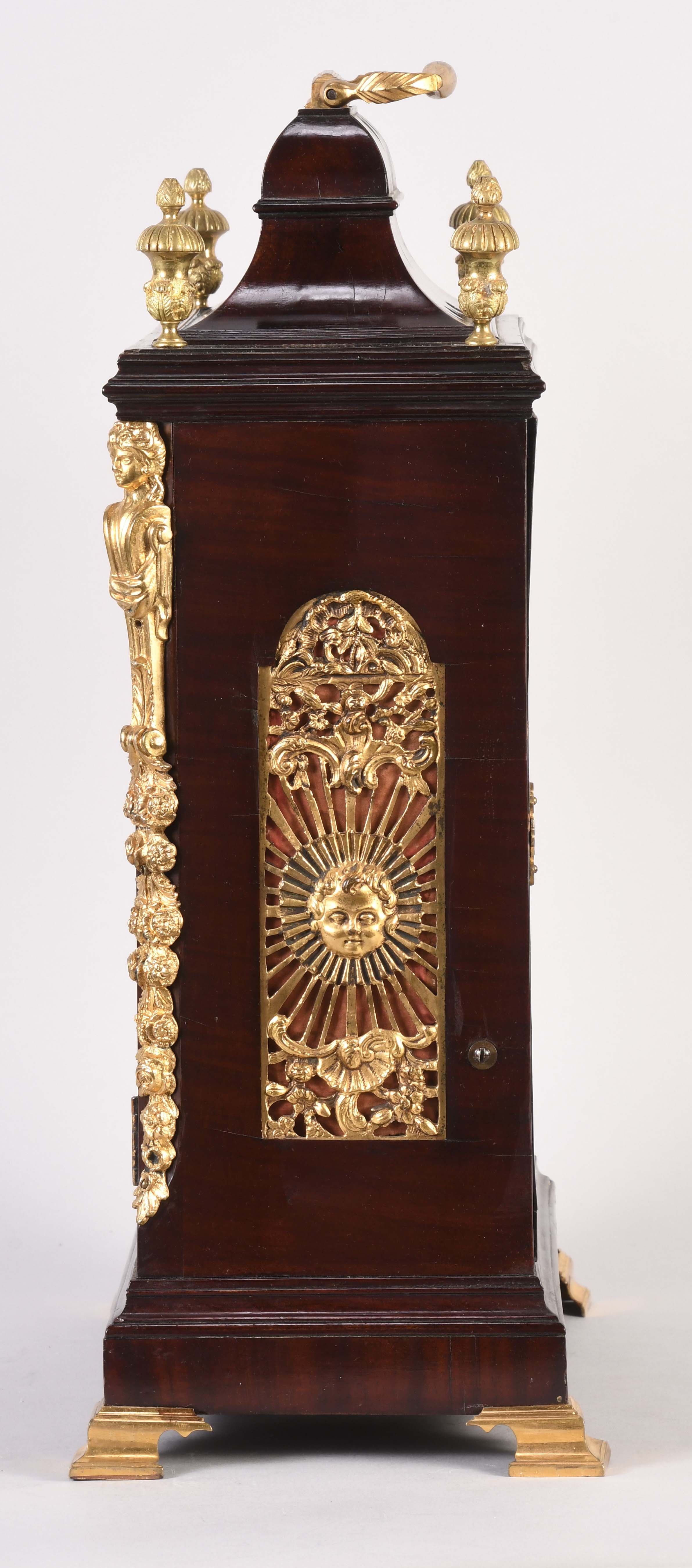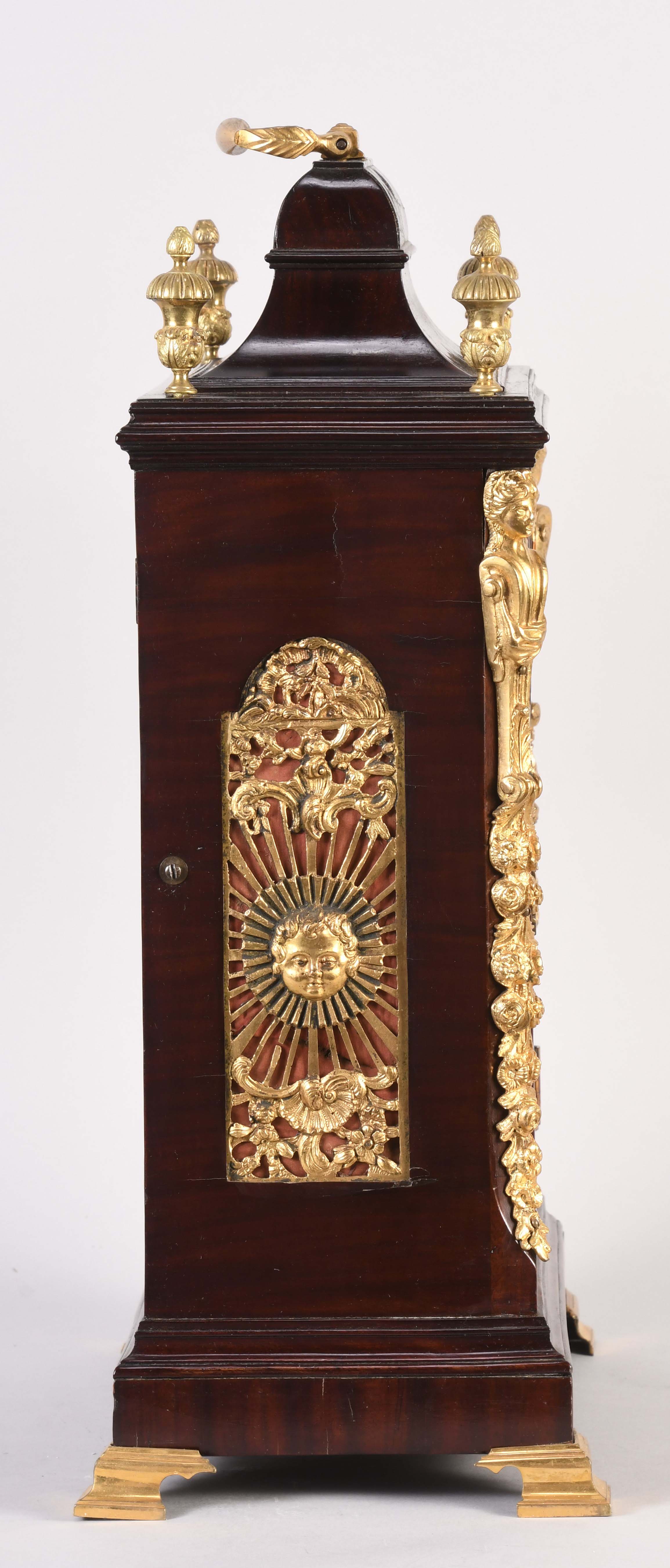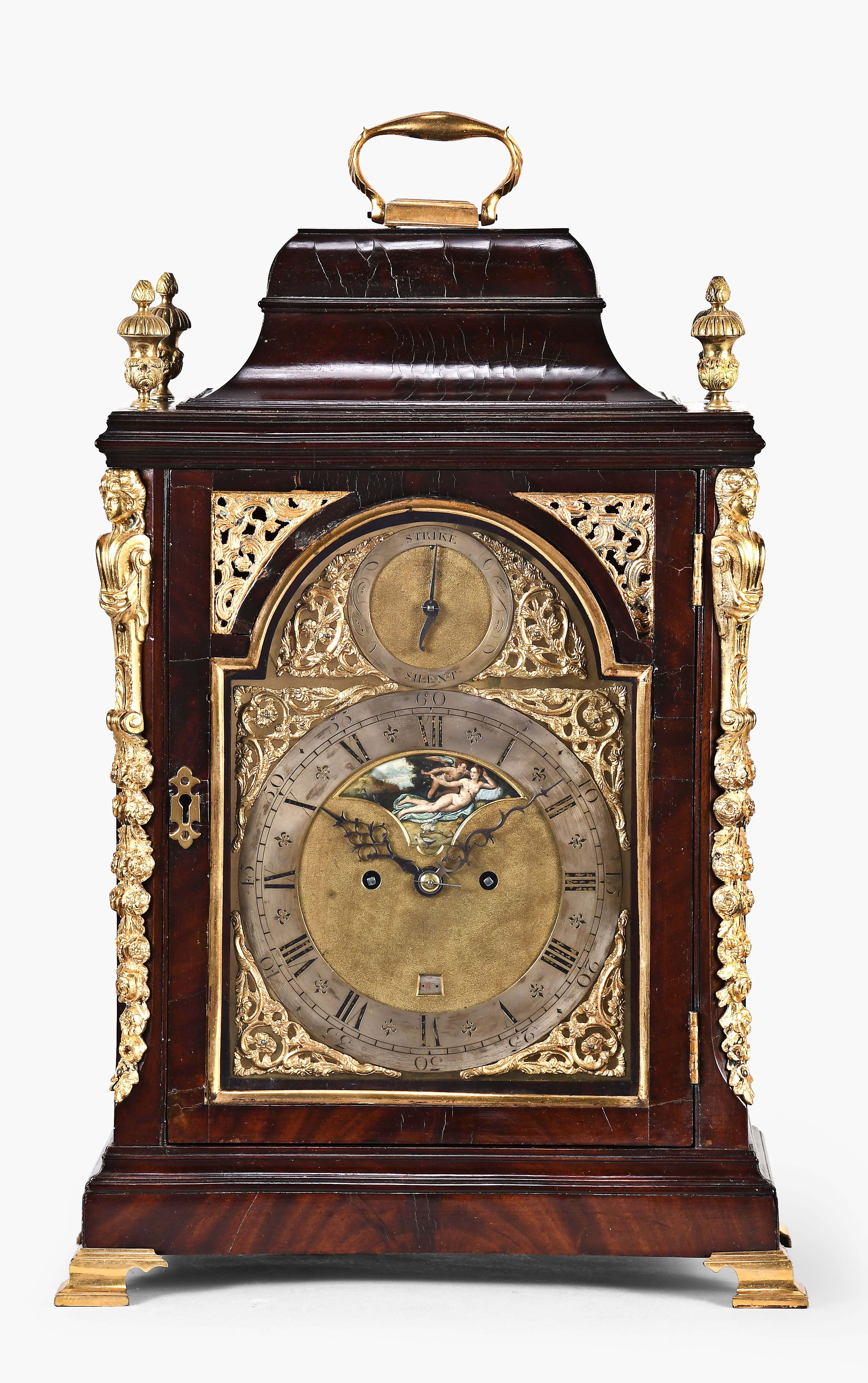 England, a good unsigned late 18th century English mahogany table clock, on a molded base with gilt bracket feet, the door with gilt spandrels and flanking caryatid and floral pendant mounts, side frets with gilt masks and naturalistic ornament, and bell top with gilt handle and finials, composite dial with gilt spandrels, silvered roman numeral chapter ring, the arch with subsidiary strike/ silent, and an oil painting on copper below 12:00 featuring a landscape with cupid and a reclining nude, blued steel serpentine hands, and two train fusee movement with verge escapement and bob pendulum, striking the hours on a bell, the back plate engraved with Adamesque ornament.