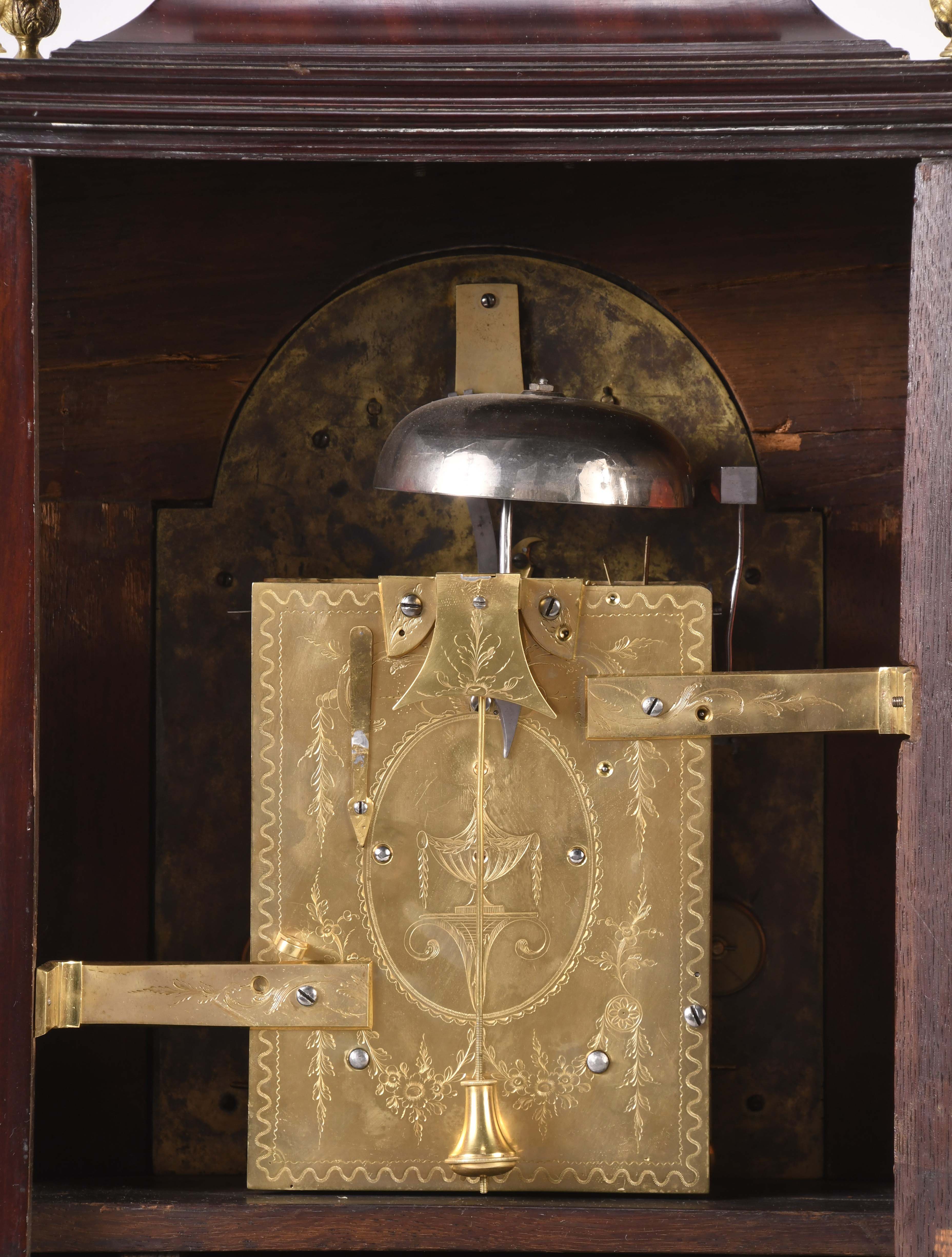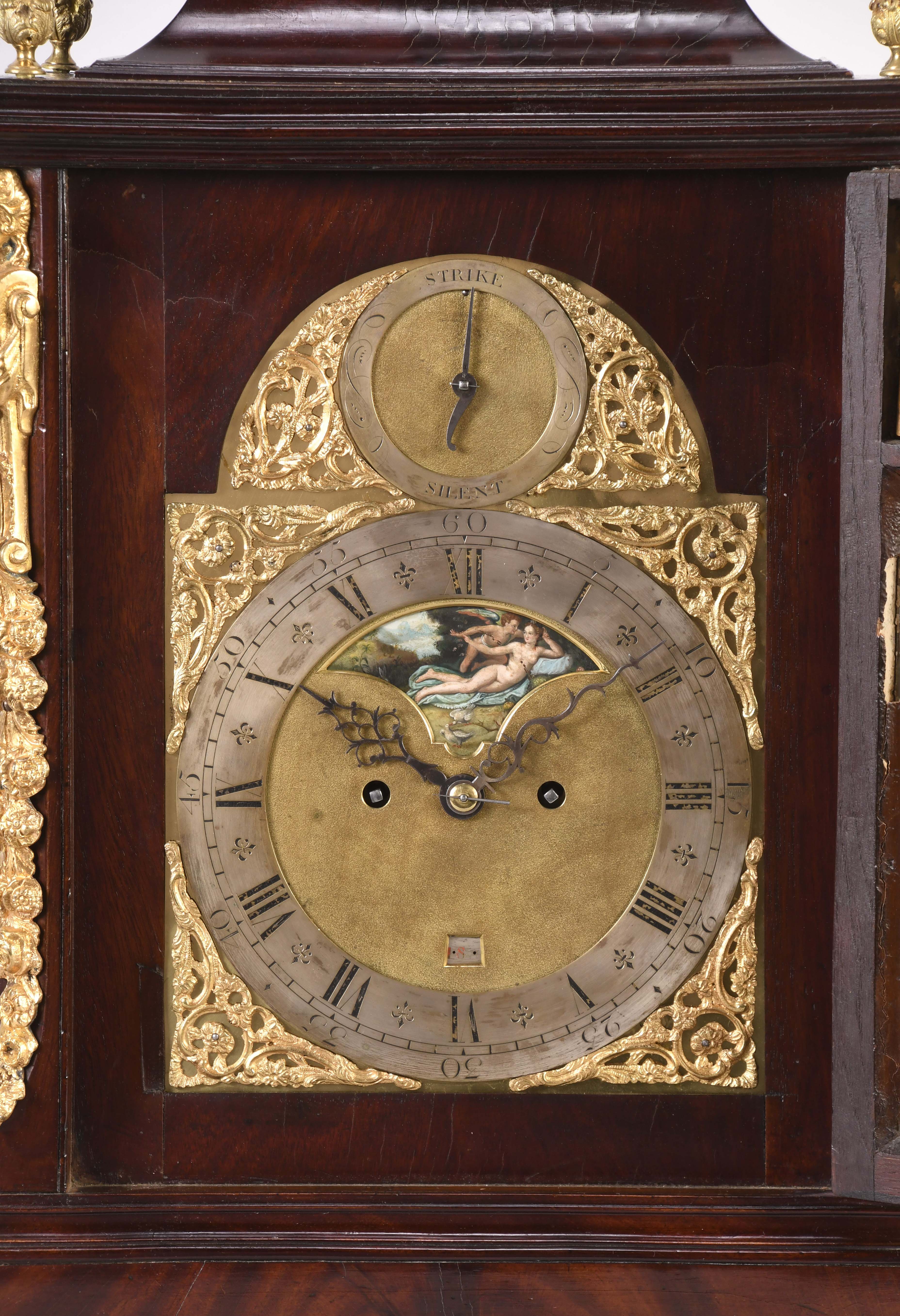 case polished, veneer with checking and minor losses, case with splits visible from the inside, feet with minor bends, mounts and frets with minor dirt and verdigris, dial plate polished and chapter ring with losses to silver, painting with minor losses, the back of the dial with 1802 repair date and the back of the painting with another from "A. Saunders 5 Southampton Row 19/9/23", hands good, movement fairly clean, strike/ silent arbor spring with solder repair, back cock holes opened and steady pins removed, star wheel jumping at about 20 minutes past the hour, adjustment needed, running and striking