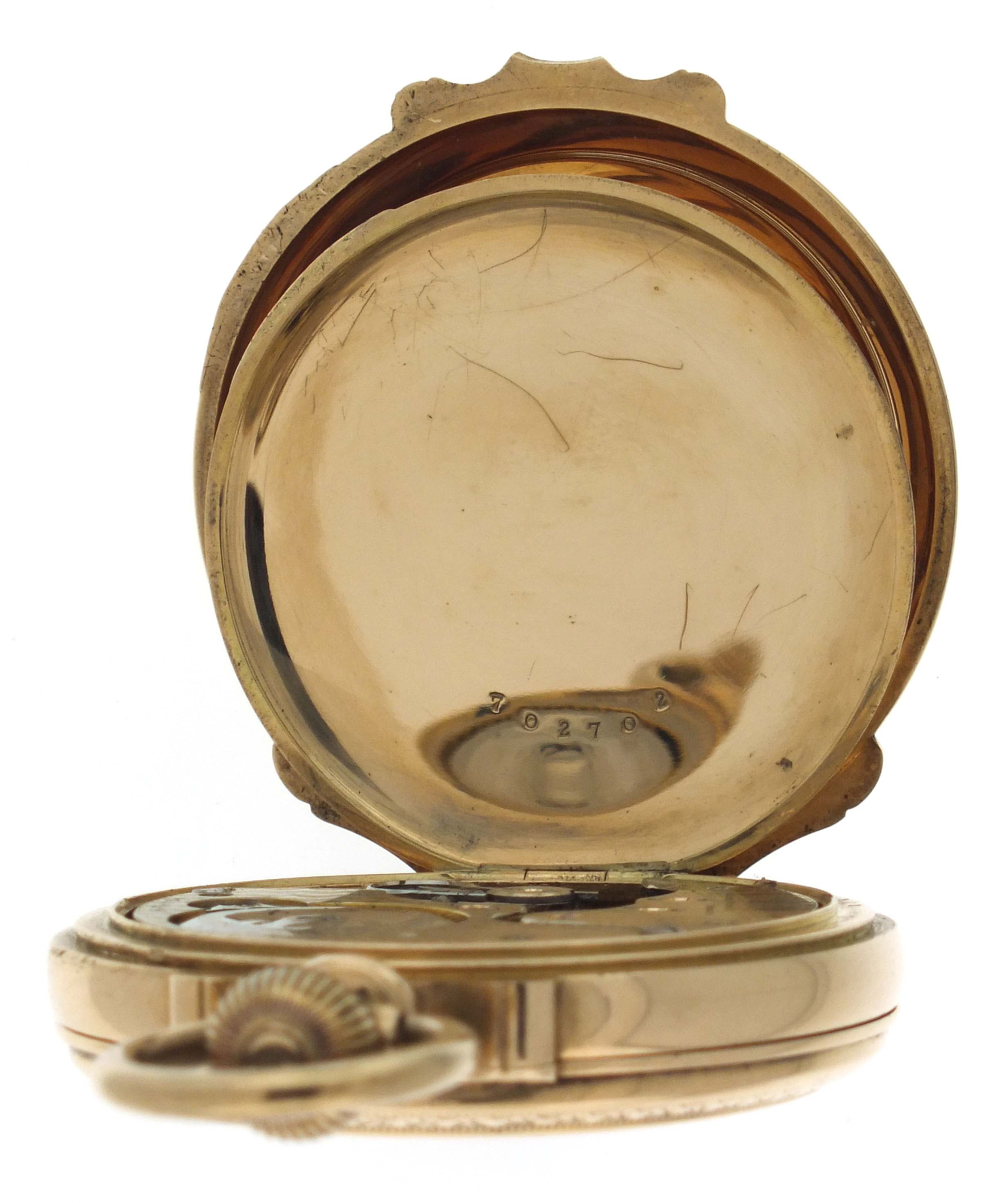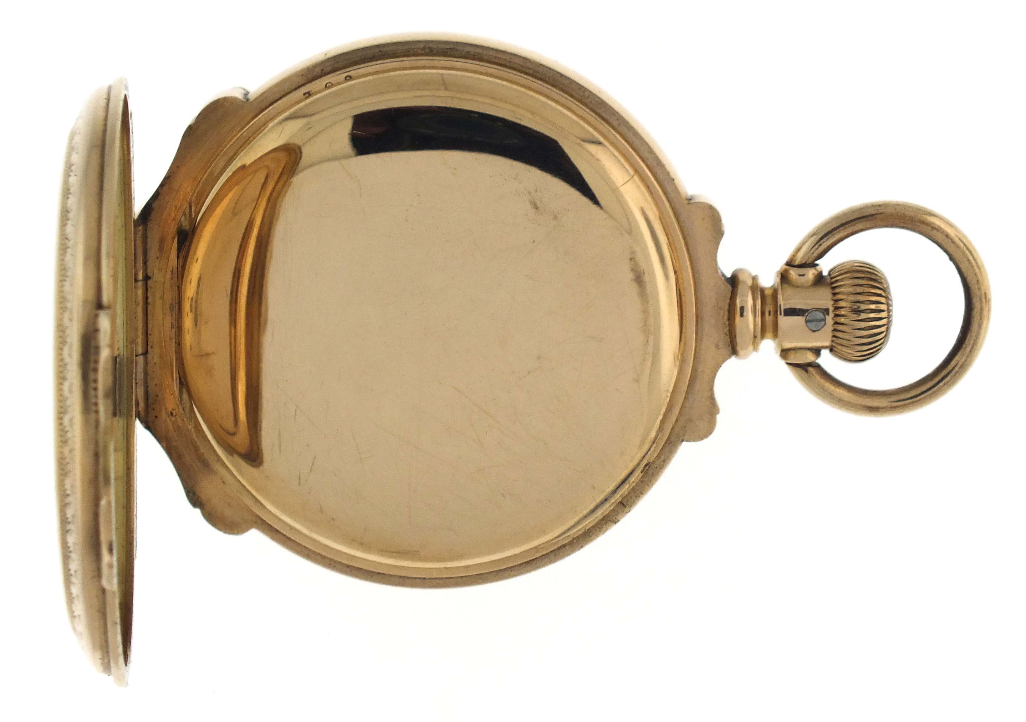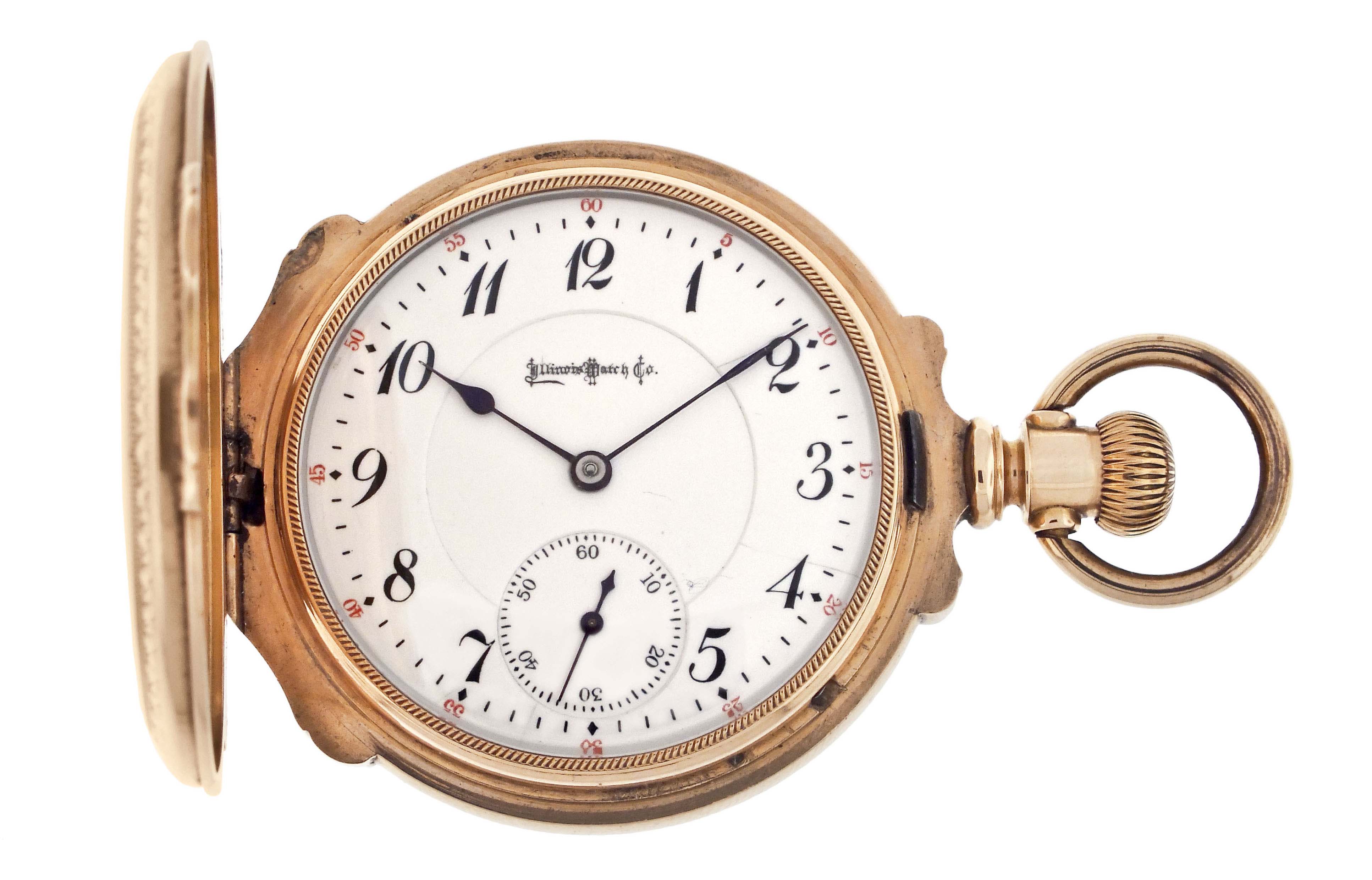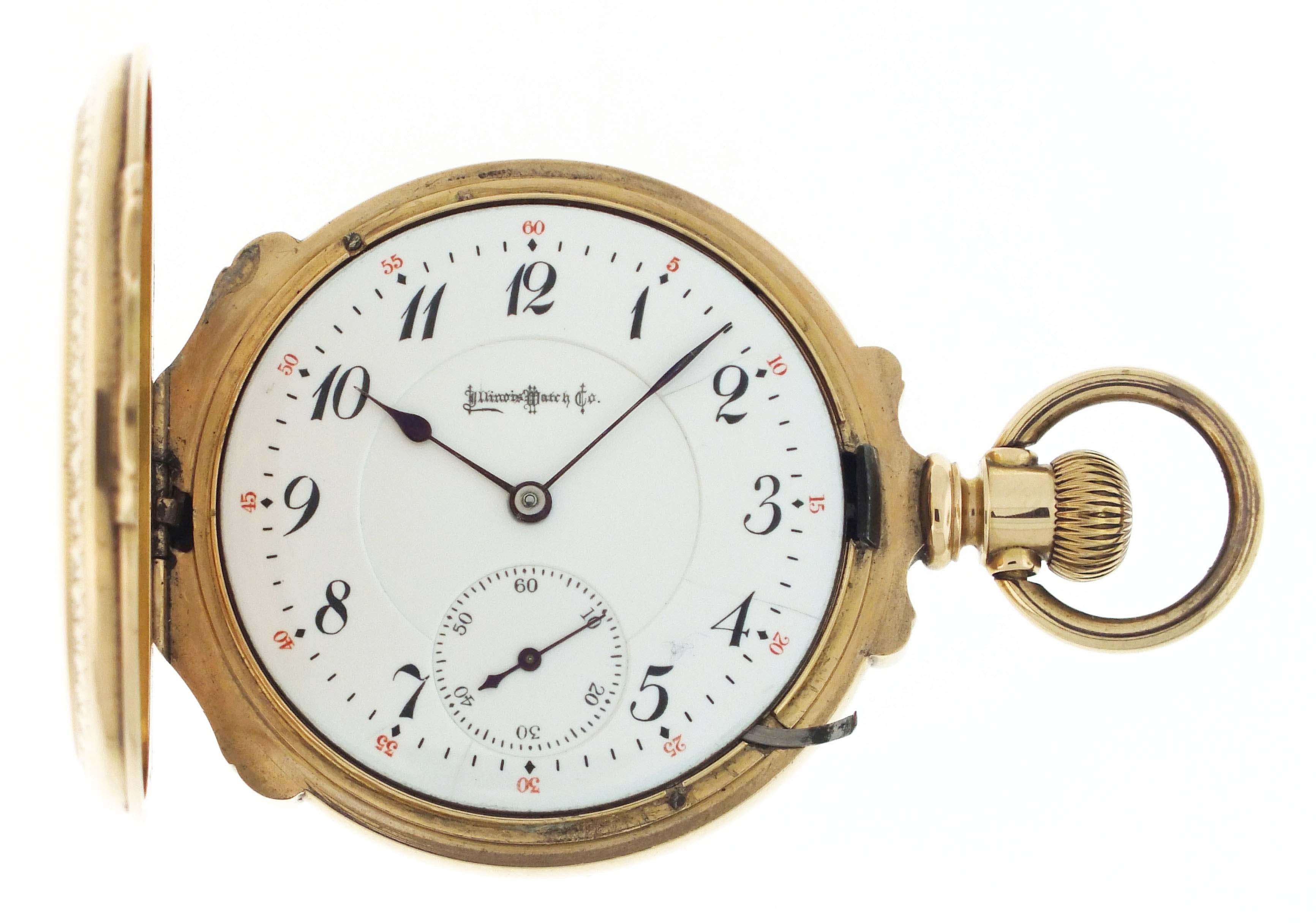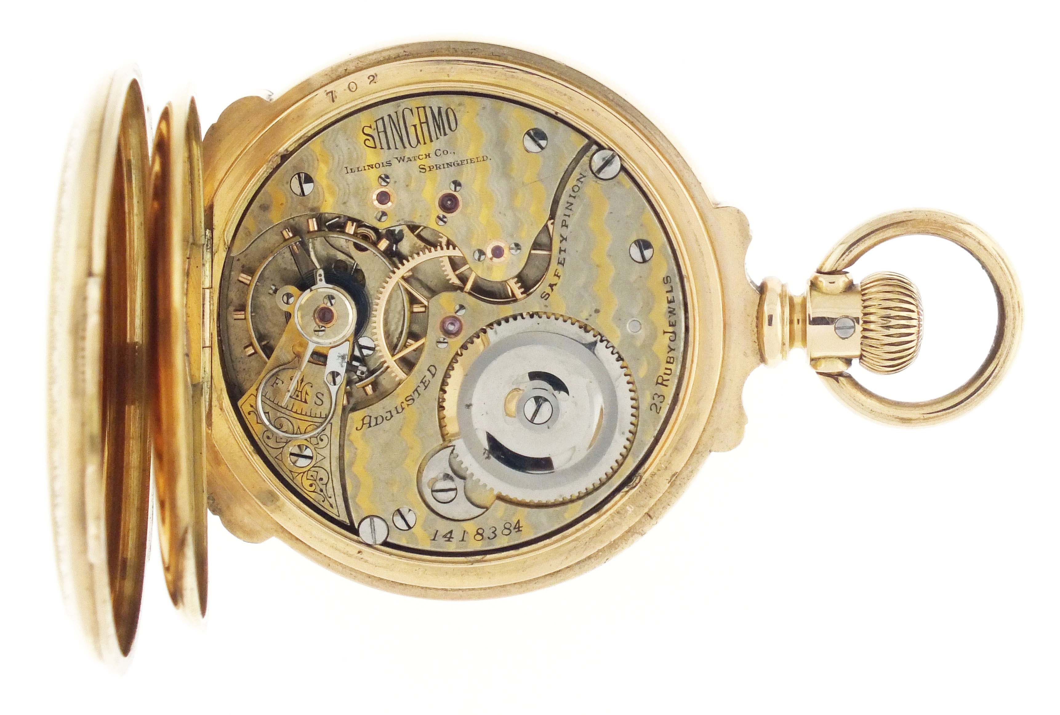 Illinois Watch Co., Springfield, Illinois, a late 19th century "Sangamo" pocket watch with box hinge case, 16 size, 23 jewels, stem wind and lever set, adjusted to 6 positions, temperature and isochronism, two tone damascened nickel plate movement with lever escapement, cut bimetallic balance with gold screws, gold jewel settings, gold wheel train, and whiplash micrometric regulator in a 14 karat, yellow gold, engraved box hinge hunting case with engraved cipher on front cover, arabic numeral, outer red 5-minute markers, single sunk white enamel dial with plum colored steel whip and spade hands, serial #1418384, 132.9g TW