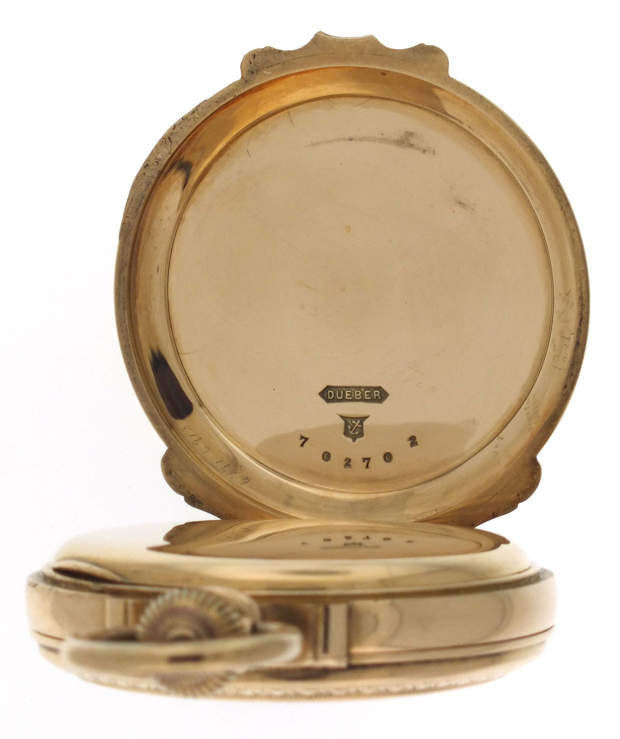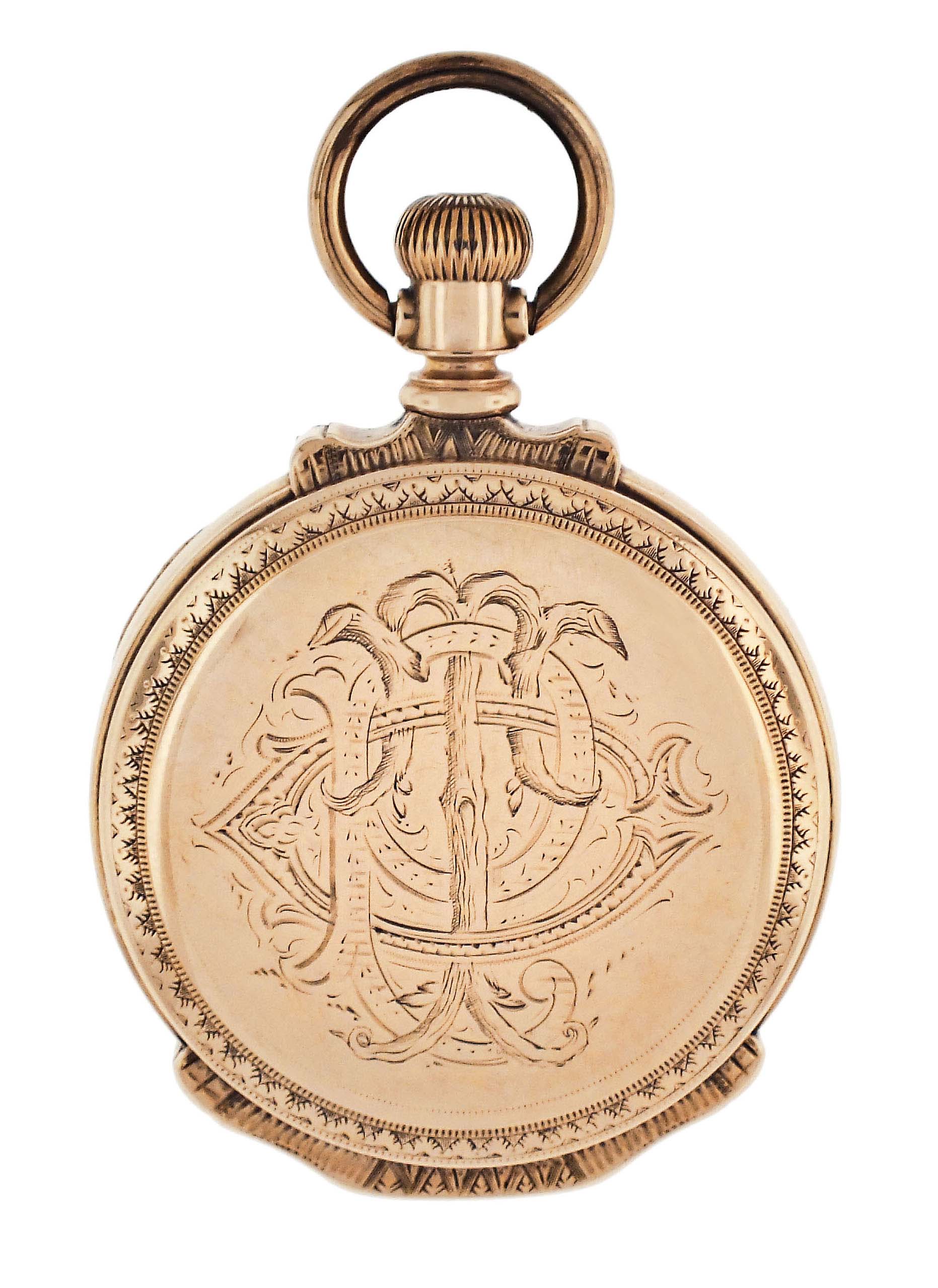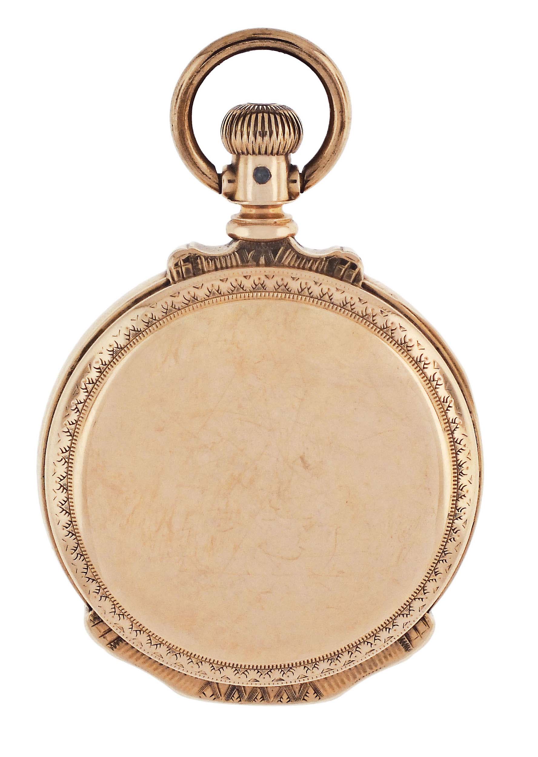 CASE: Case has housed another movement; Shallow dent, band; Very fine scratches on outer surface of case; Very fine scratches on cuvette; Engraving with moderate wear; Front cover lift spring opening cover to 45 deg.; Acrylic crystal; Bow replaced; Crown shell worn through; Precious metal content tested. DIAL: A few hairlines. HANDS: Minor losses to color. MOVEMENT PLATES: Scattered spotting; Very fine scratches on plate; Significant scratches on train bridge and on barrel bridge at case screw; Ratchet wheel with spots of oxide; Regulator assembly with specks of oxide; Center wheel with concentric scratches and marring; One case screw an incorrect replacement. MOVEMENT FUNCTION: Running order (winds, sets and ticks).