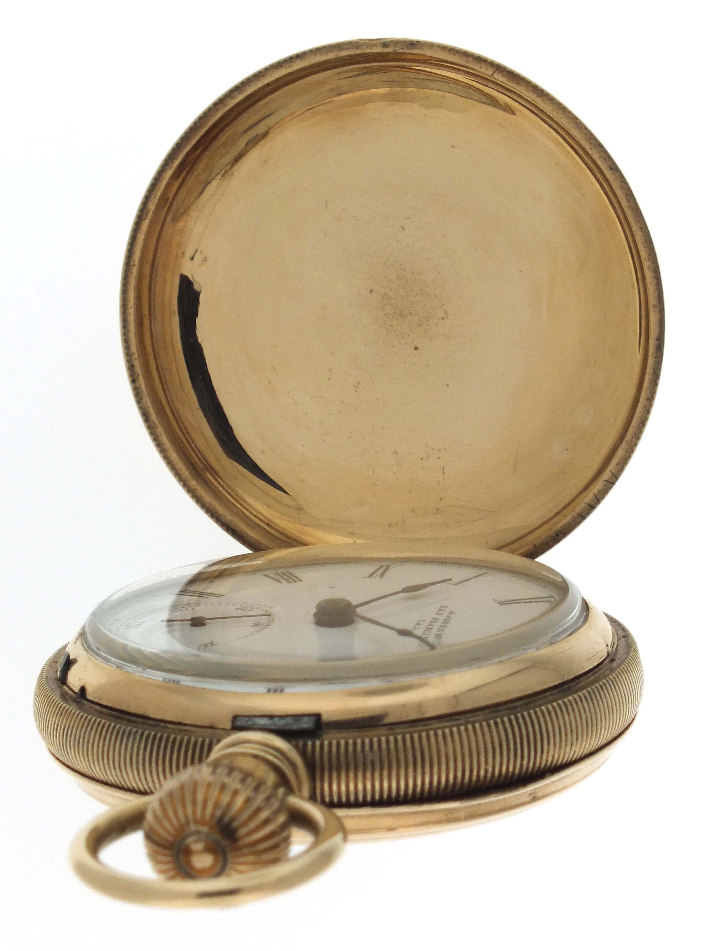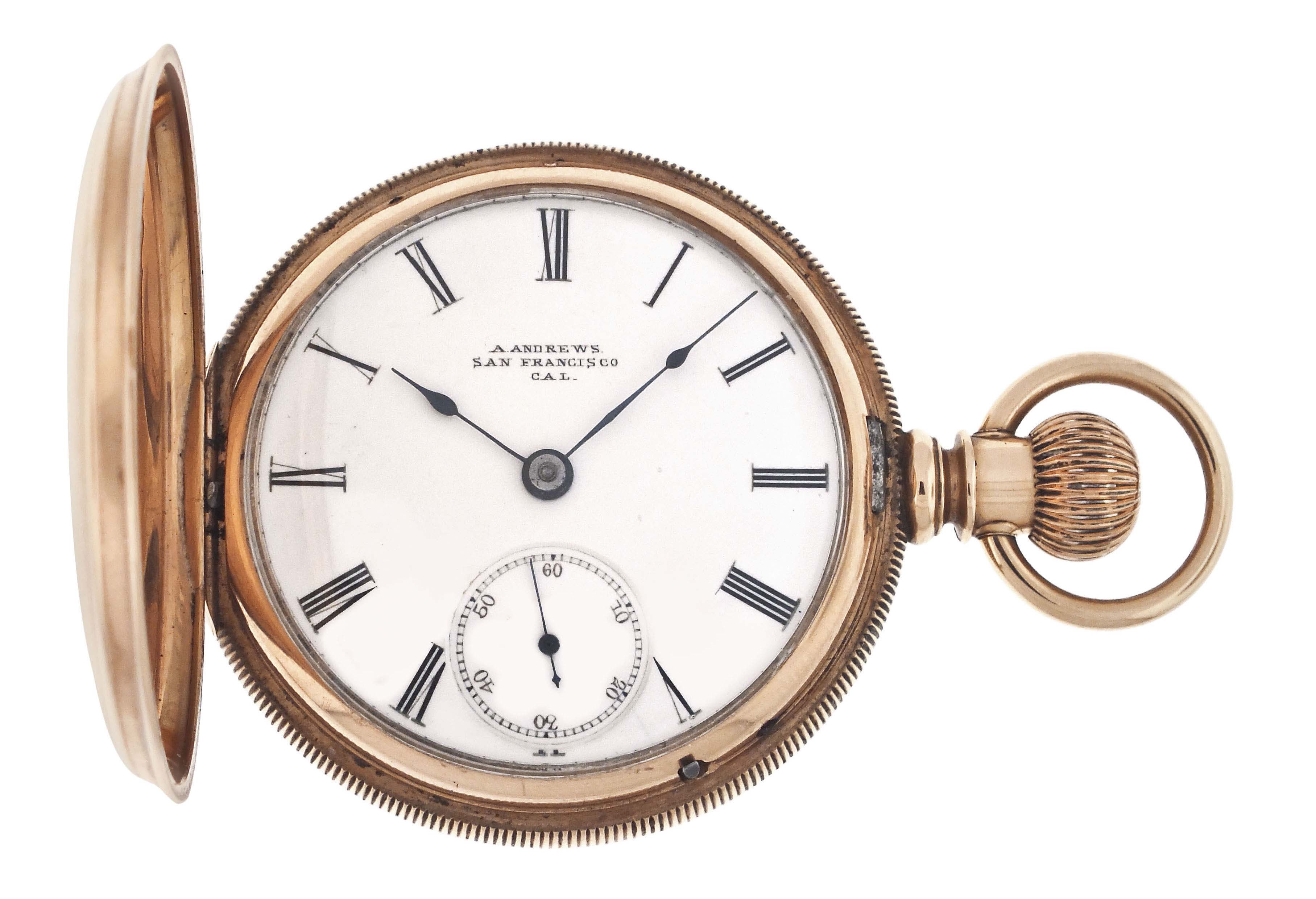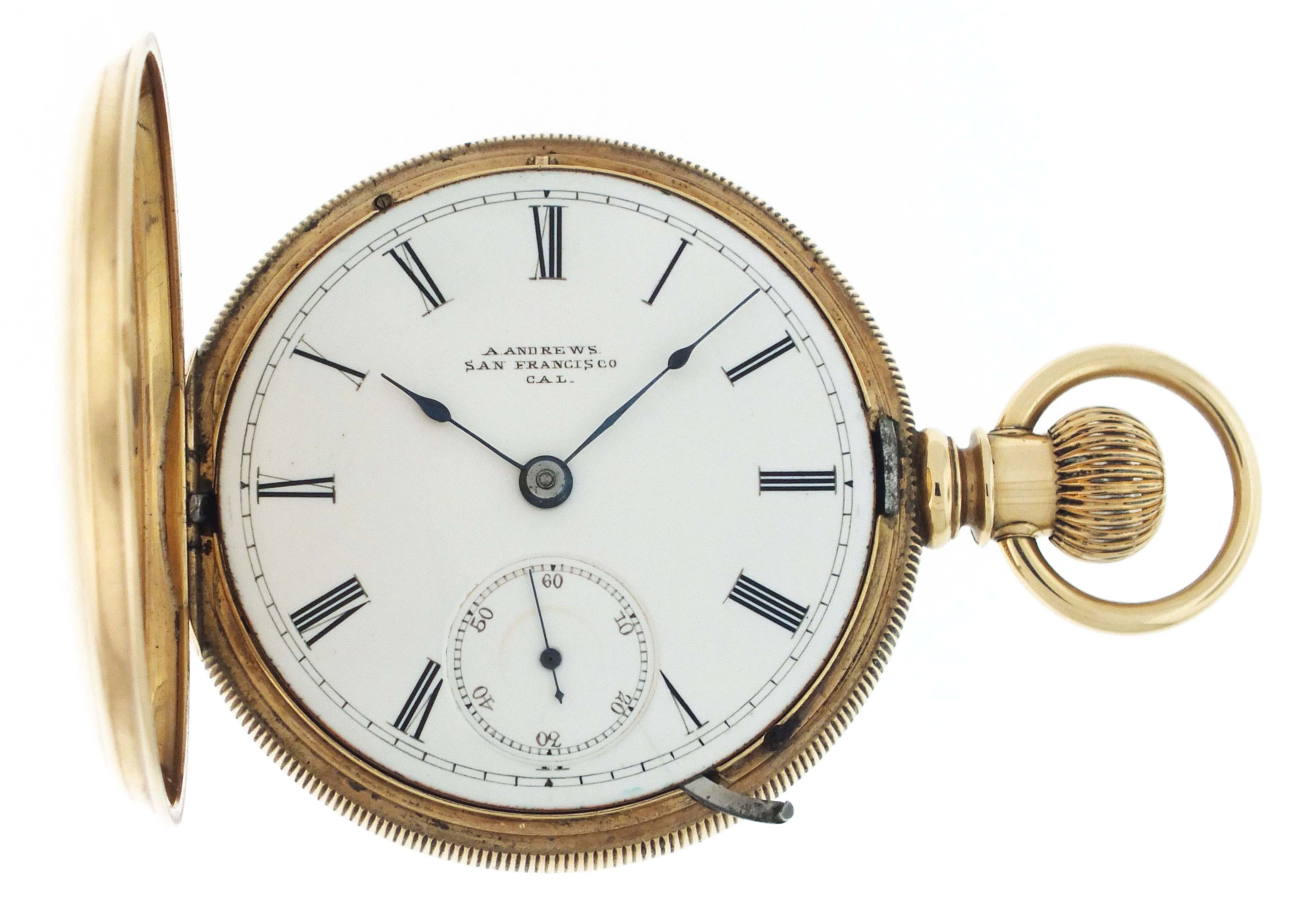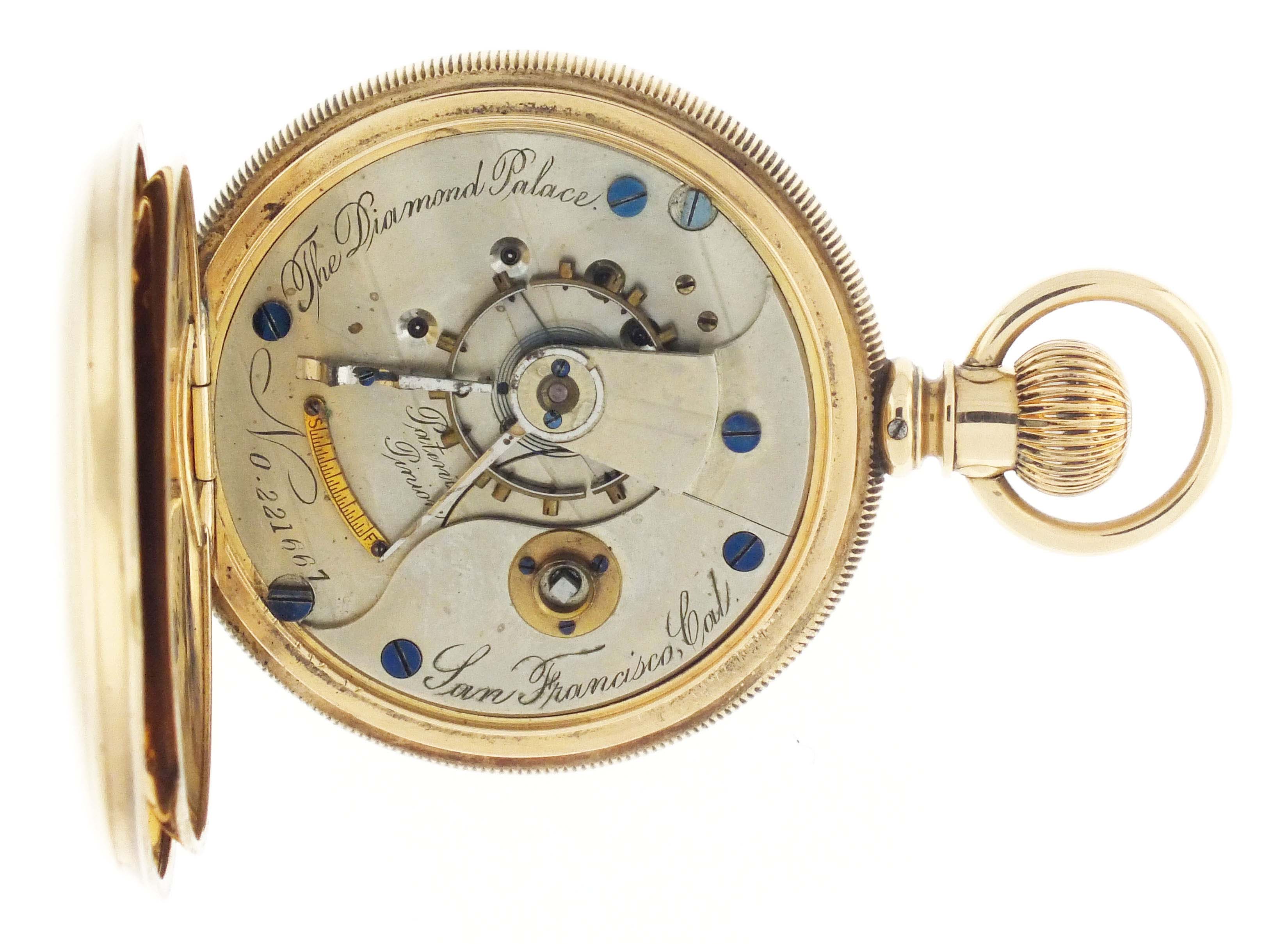 Illinois Watch Co., Springfield, Illinois, for A. Andrews Diamond Palace, a late 19th century gold, grade 101 pocket watch, 18 size, 11 jewels, transitional stem wind and lever set damascened nickel plate movement engraved "The Diamond Palace San Francisco, Cal.", with lever escapement and cut bimetallic balance, in a 14 karat, yellow gold, reeded edge, engine turned hunting case, roman numeral single sunk white enamel dial signed for the retailer, and blued steel spade hands, serial #221667, 122.6g TW