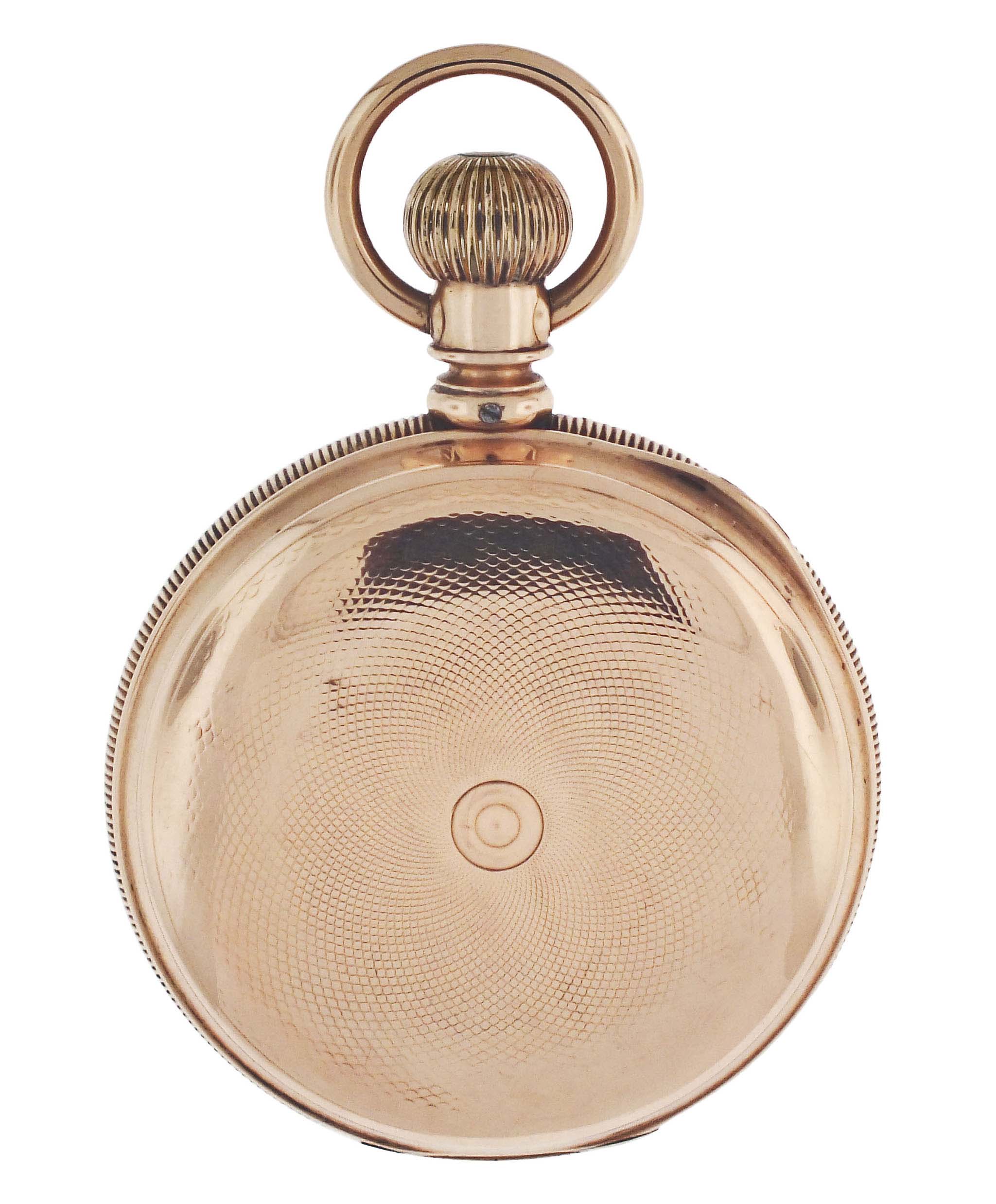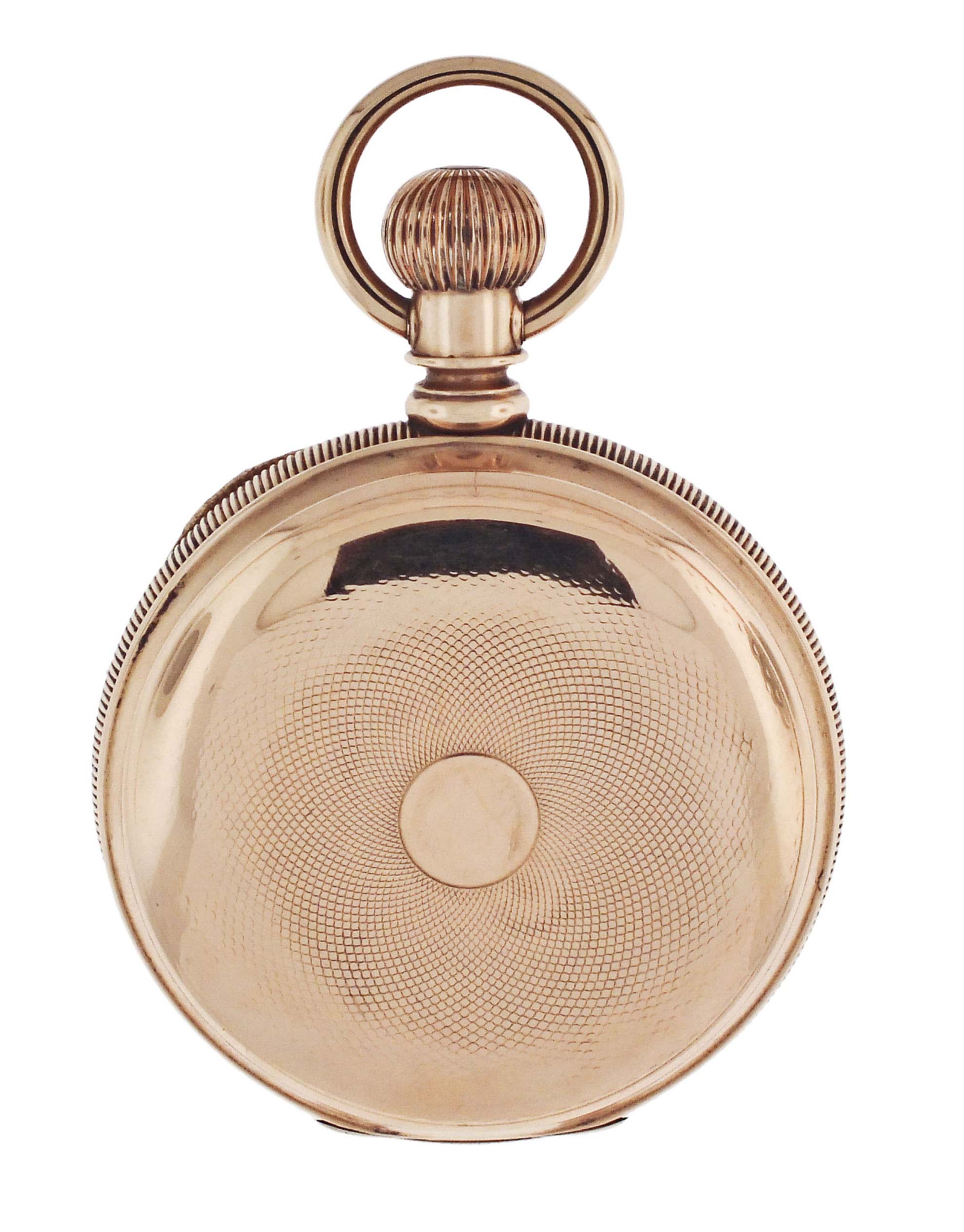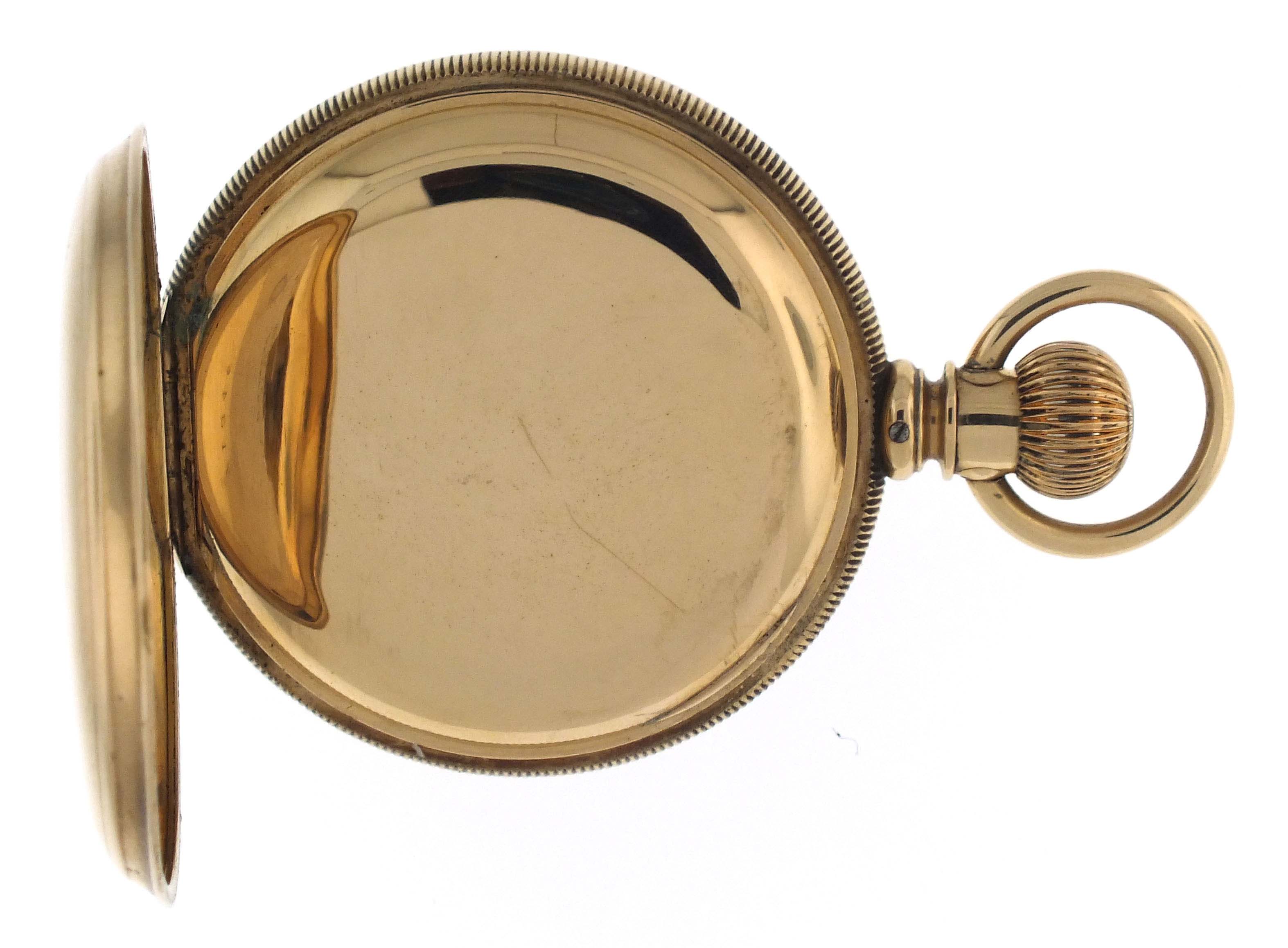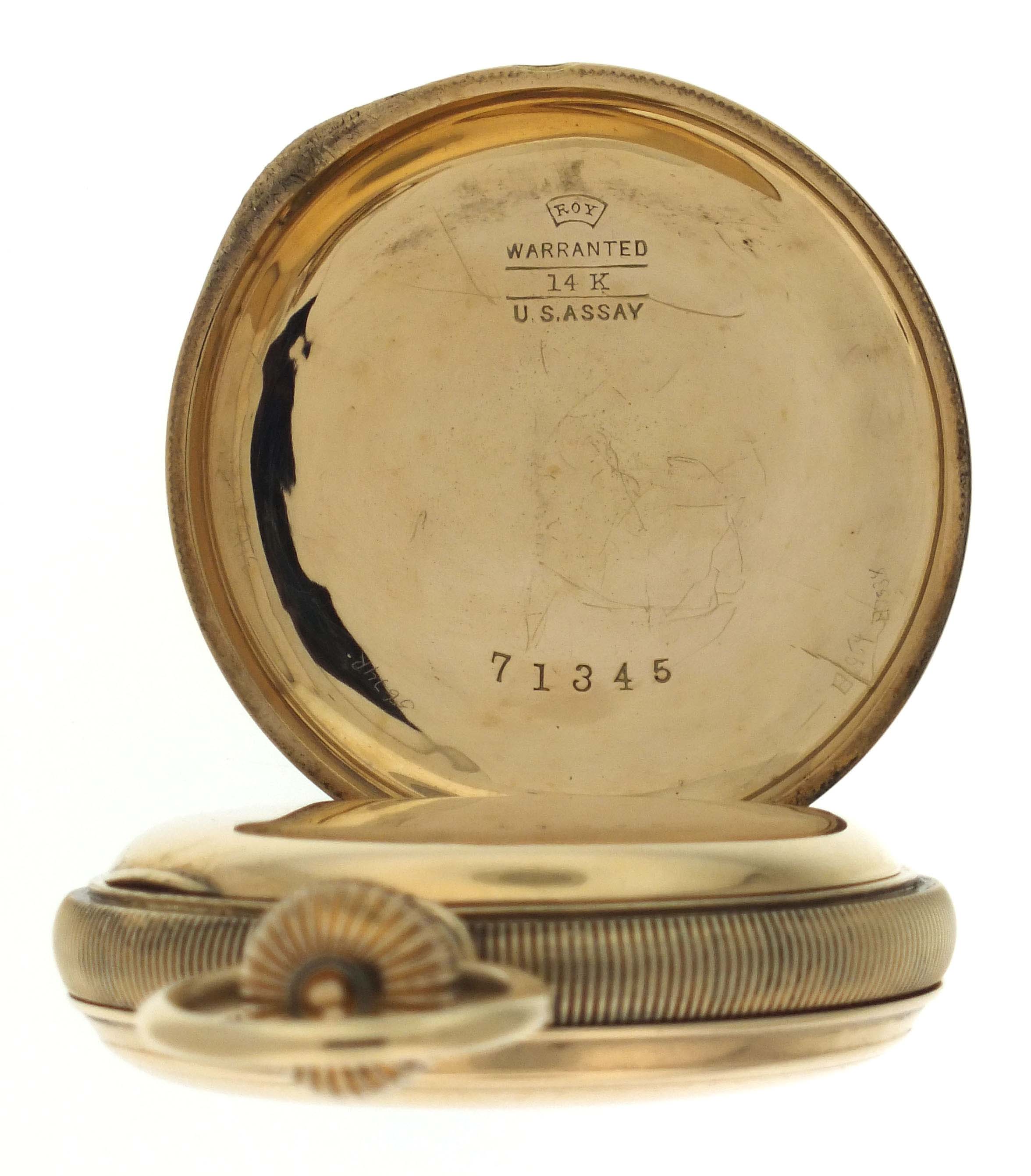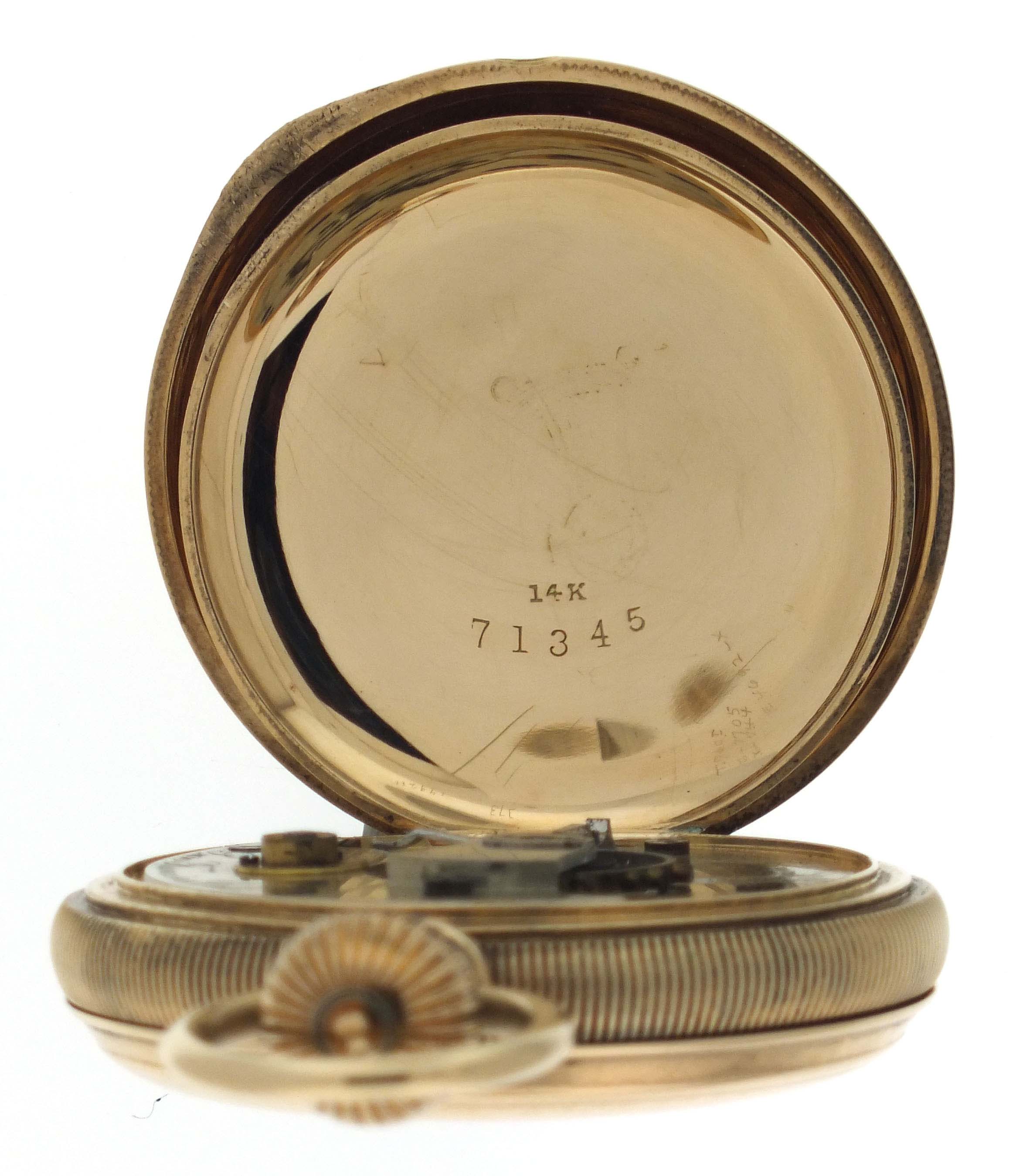 Illinois Watch Co., Springfield, Illinois, for A. Andrews Diamond Palace, a late 19th century gold, grade 101 pocket watch, 18 size, 11 jewels, transitional stem wind and lever set damascened nickel plate movement engraved "The Diamond Palace San Francisco, Cal.", with lever escapement and cut bimetallic balance, in a 14 karat, yellow gold, reeded edge, engine turned hunting case, roman numeral single sunk white enamel dial signed for the retailer, and blued steel spade hands, serial #221667, 122.6g TW