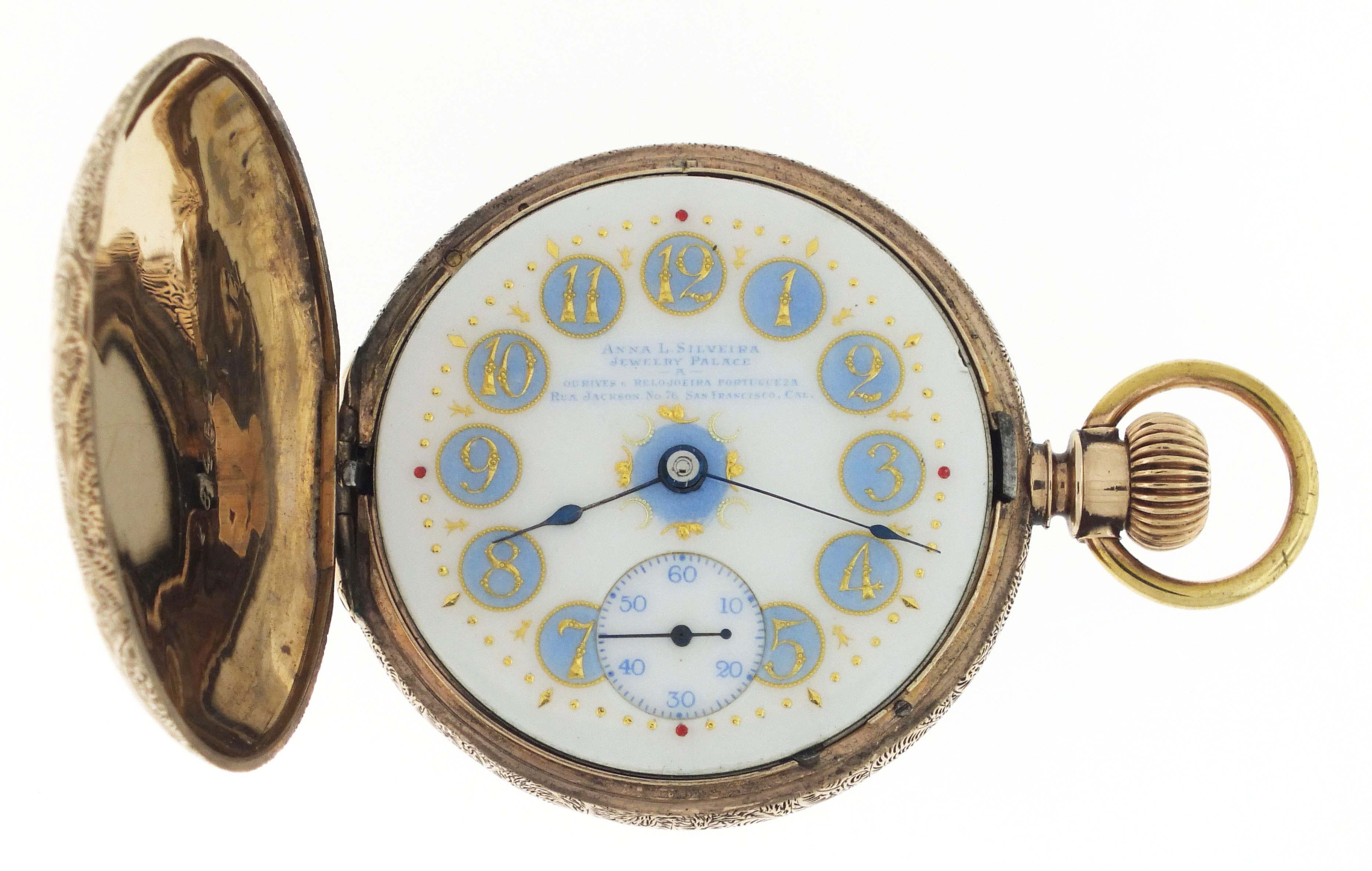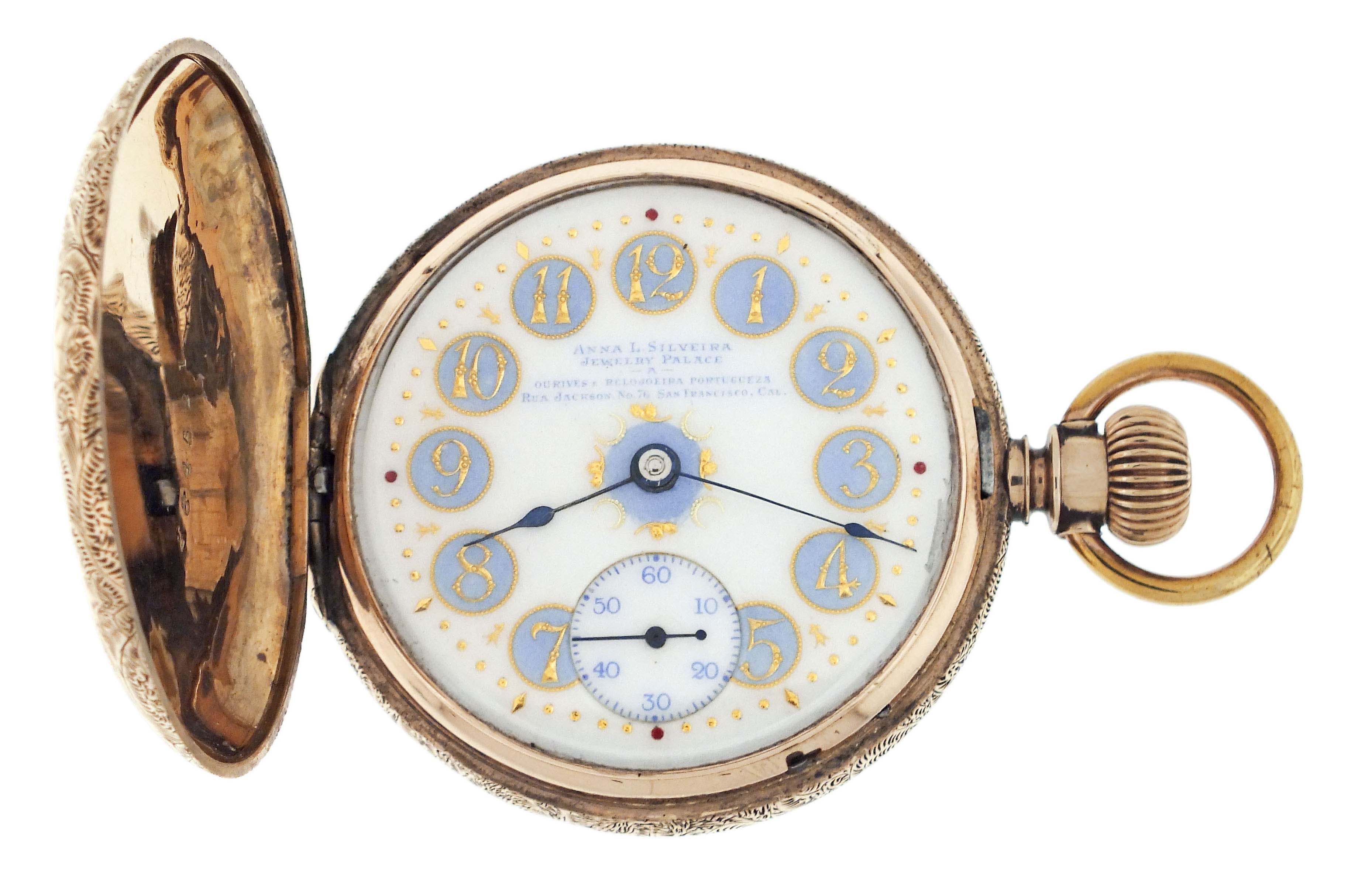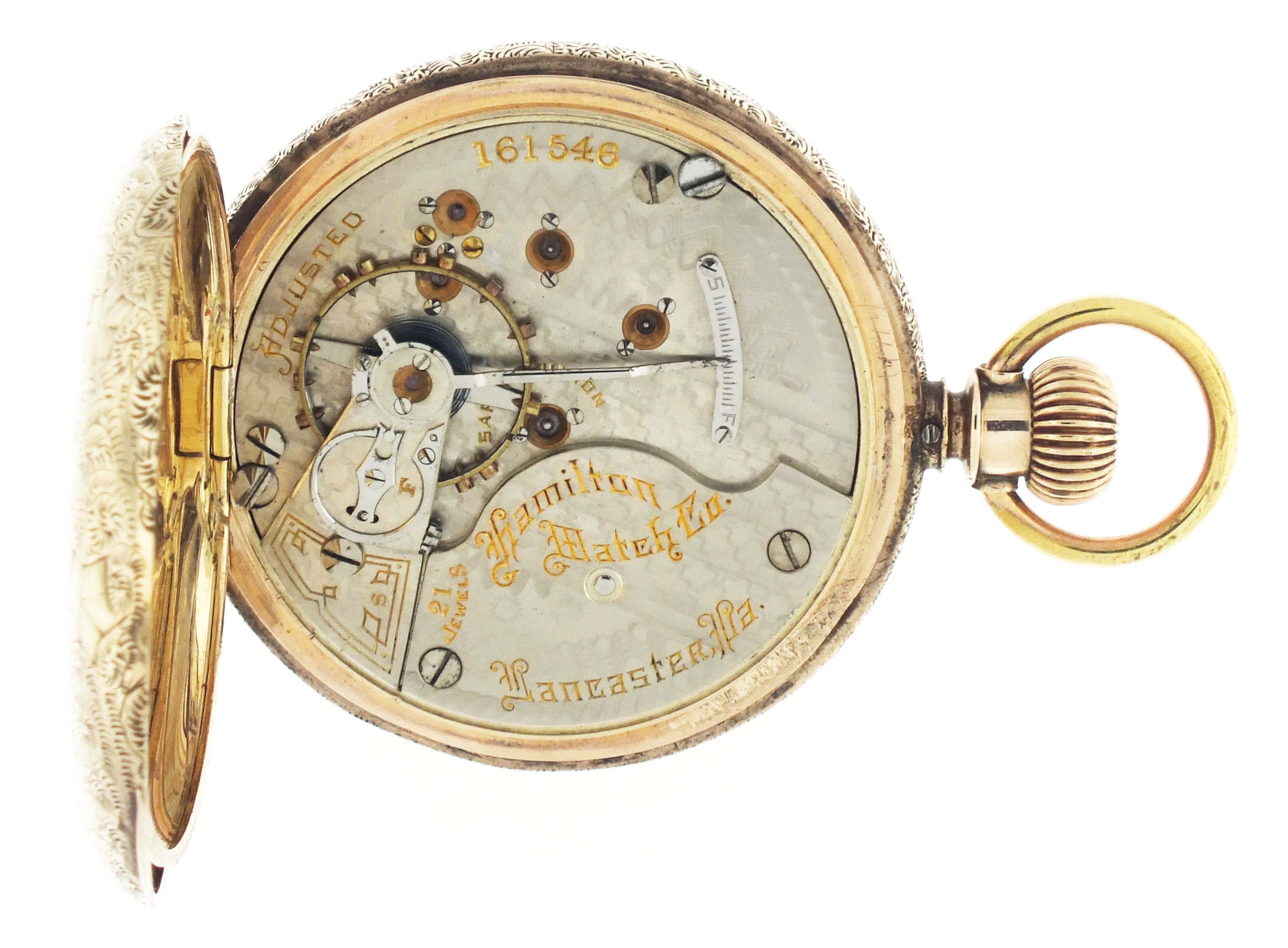 Hamilton Watch Co., Lancaster, Penn., for Anna Silveira's Jewelry Palace, a gold cased "941", 18 size, 21 jewels, stem wind and lever set, adjusted to 5 positions, temperature and isochronism, damascened nickel plate movement with lever escapement, cut bimetallic balance with gold screws, and Goldthwait micrometric regulator in a 10 - 12 karat, rose gold, ornately engraved hunting case with engraved cipher on gold cuvette, arabic numeral O'Hara style multicolor enamel dial with blued steel spade hands, serial #161546, 105.9g TW