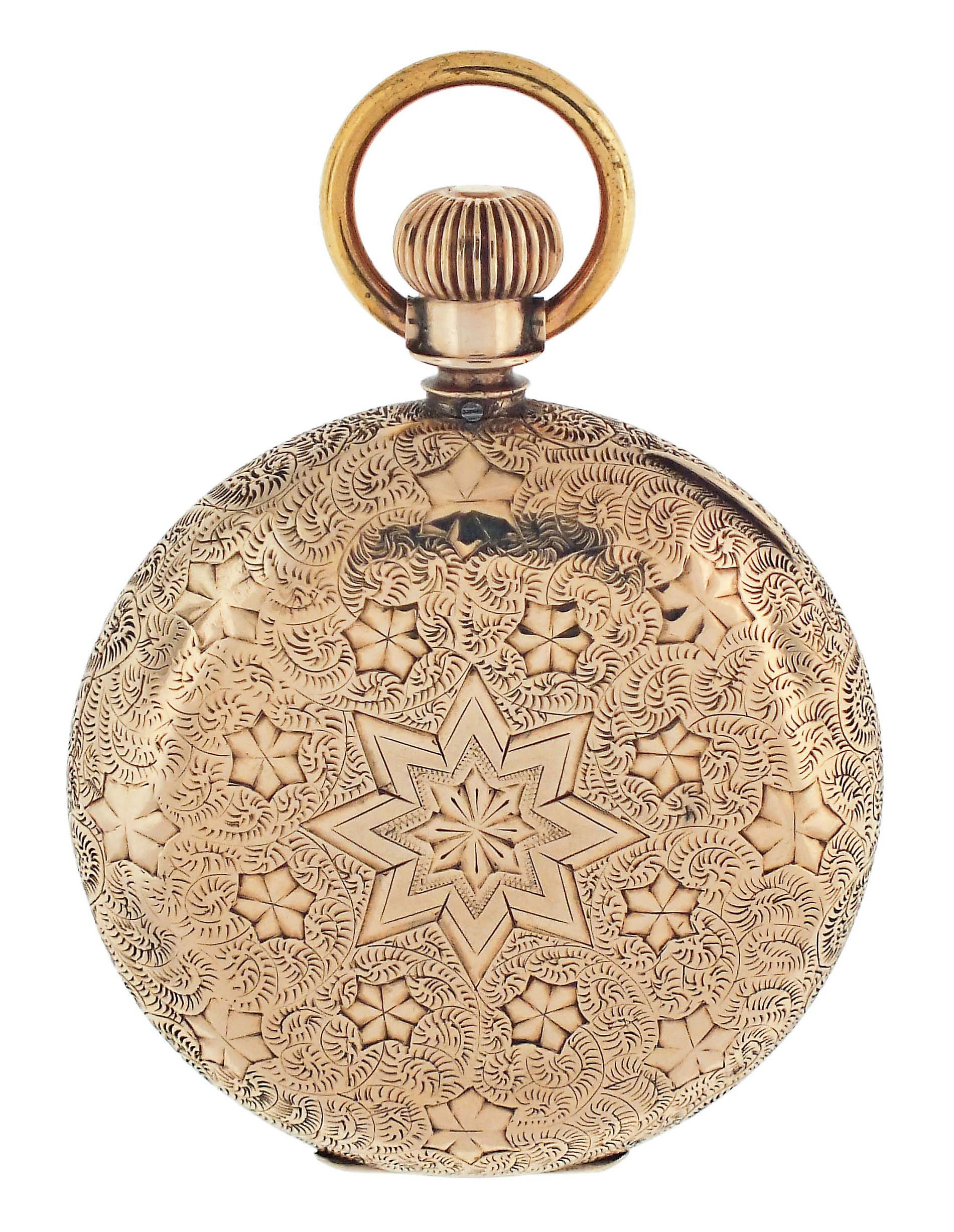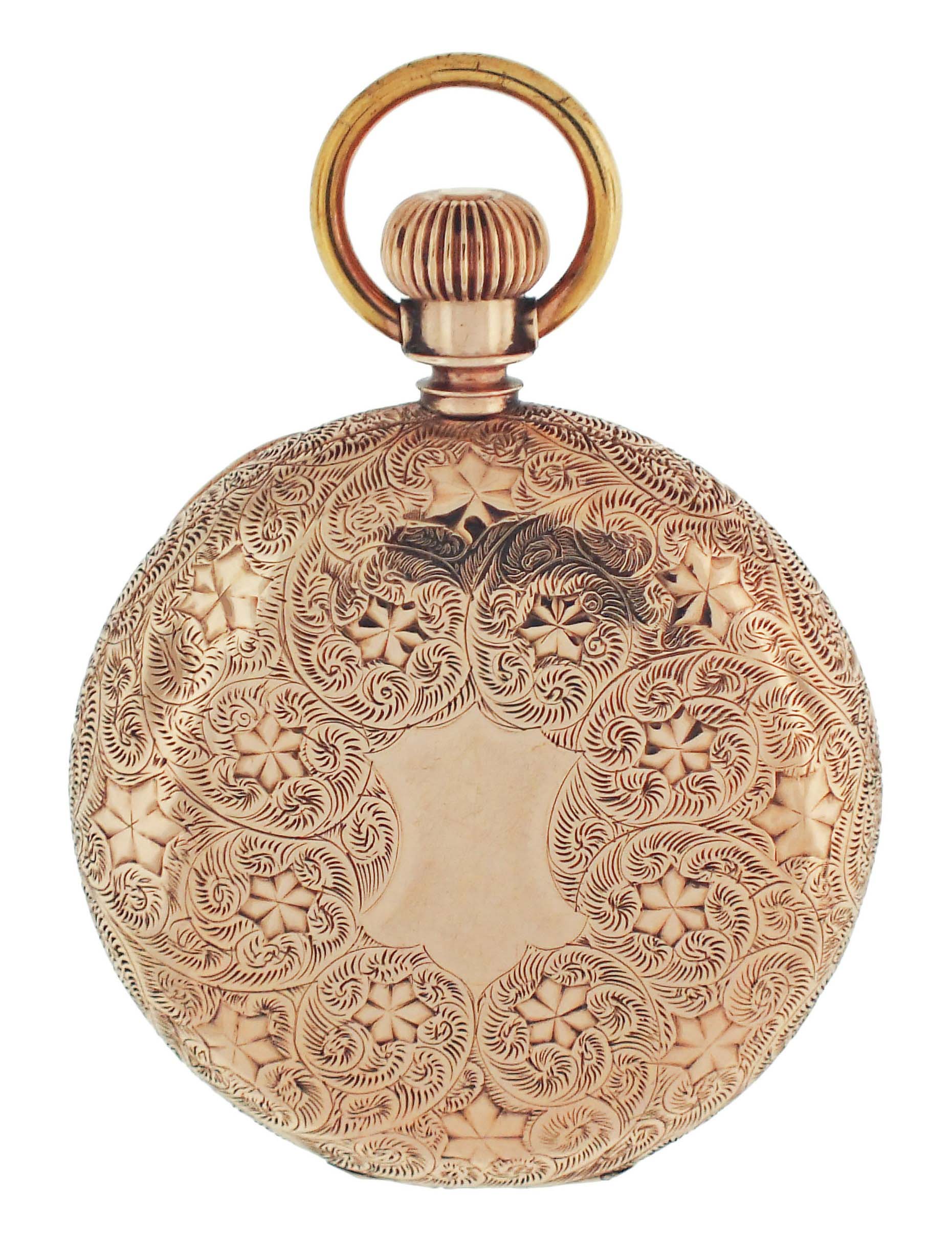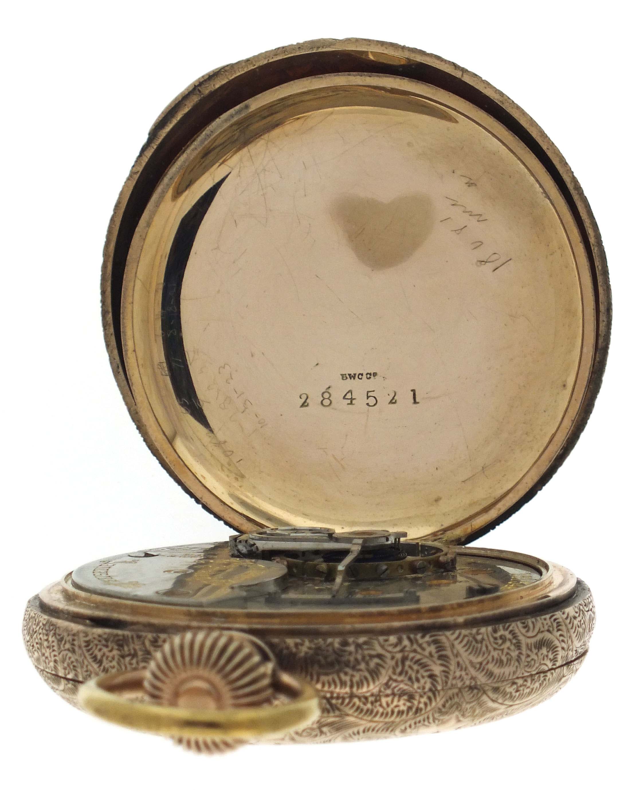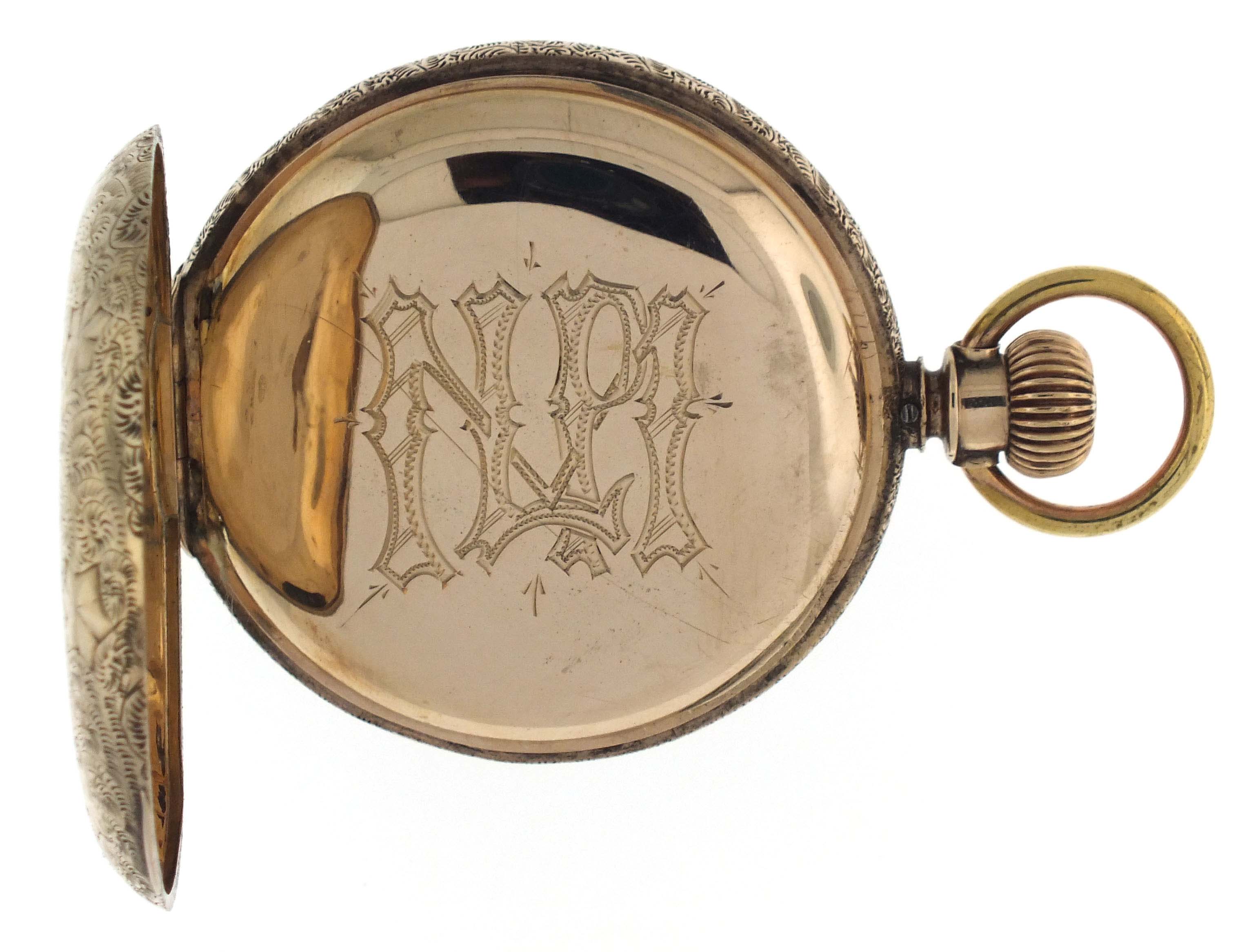 Hamilton Watch Co., Lancaster, Penn., for Anna Silveira's Jewelry Palace, a gold cased "941", 18 size, 21 jewels, stem wind and lever set, adjusted to 5 positions, temperature and isochronism, damascened nickel plate movement with lever escapement, cut bimetallic balance with gold screws, and Goldthwait micrometric regulator in a 10 - 12 karat, rose gold, ornately engraved hunting case with engraved cipher on gold cuvette, arabic numeral O'Hara style multicolor enamel dial with blued steel spade hands, serial #161546, 105.9g TW