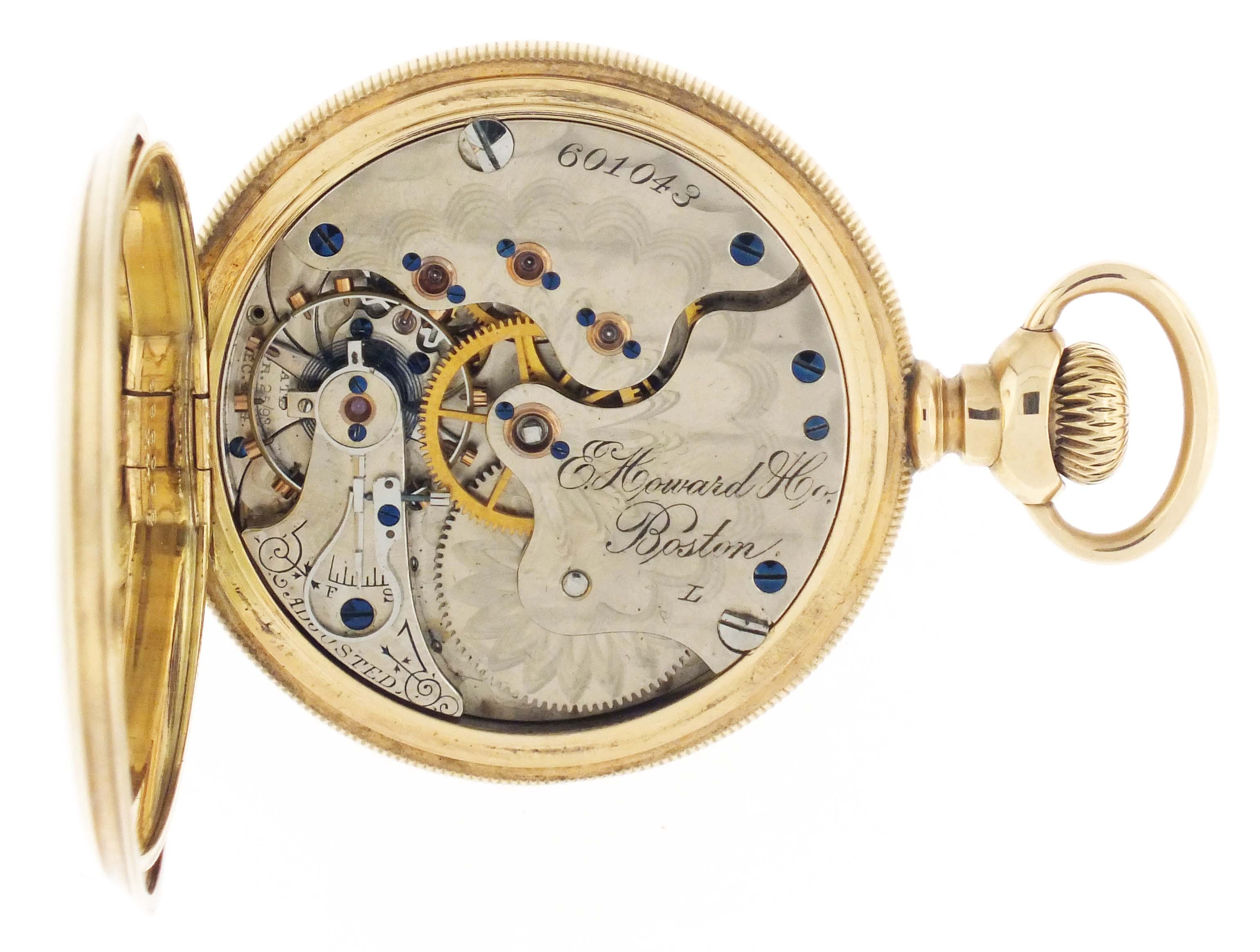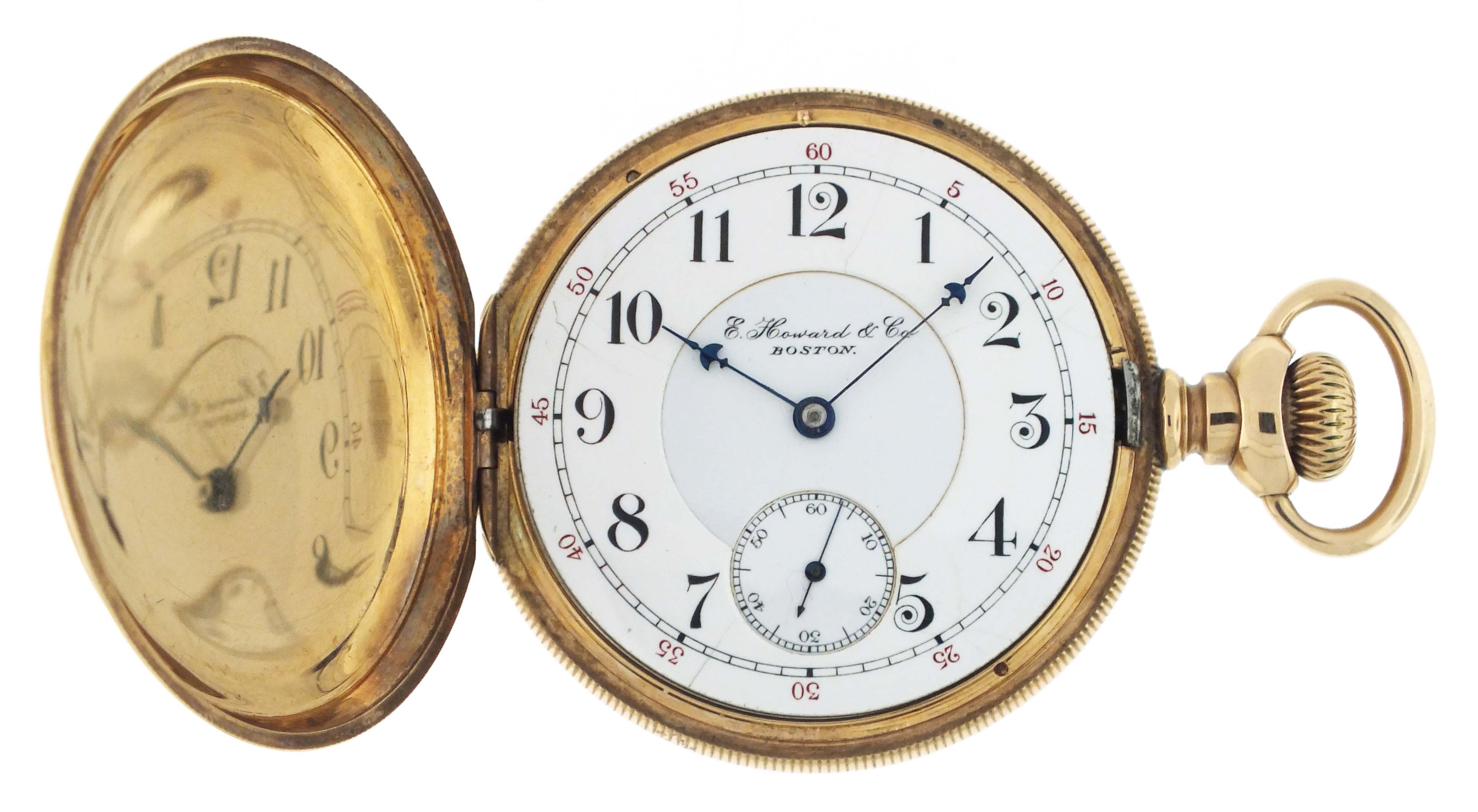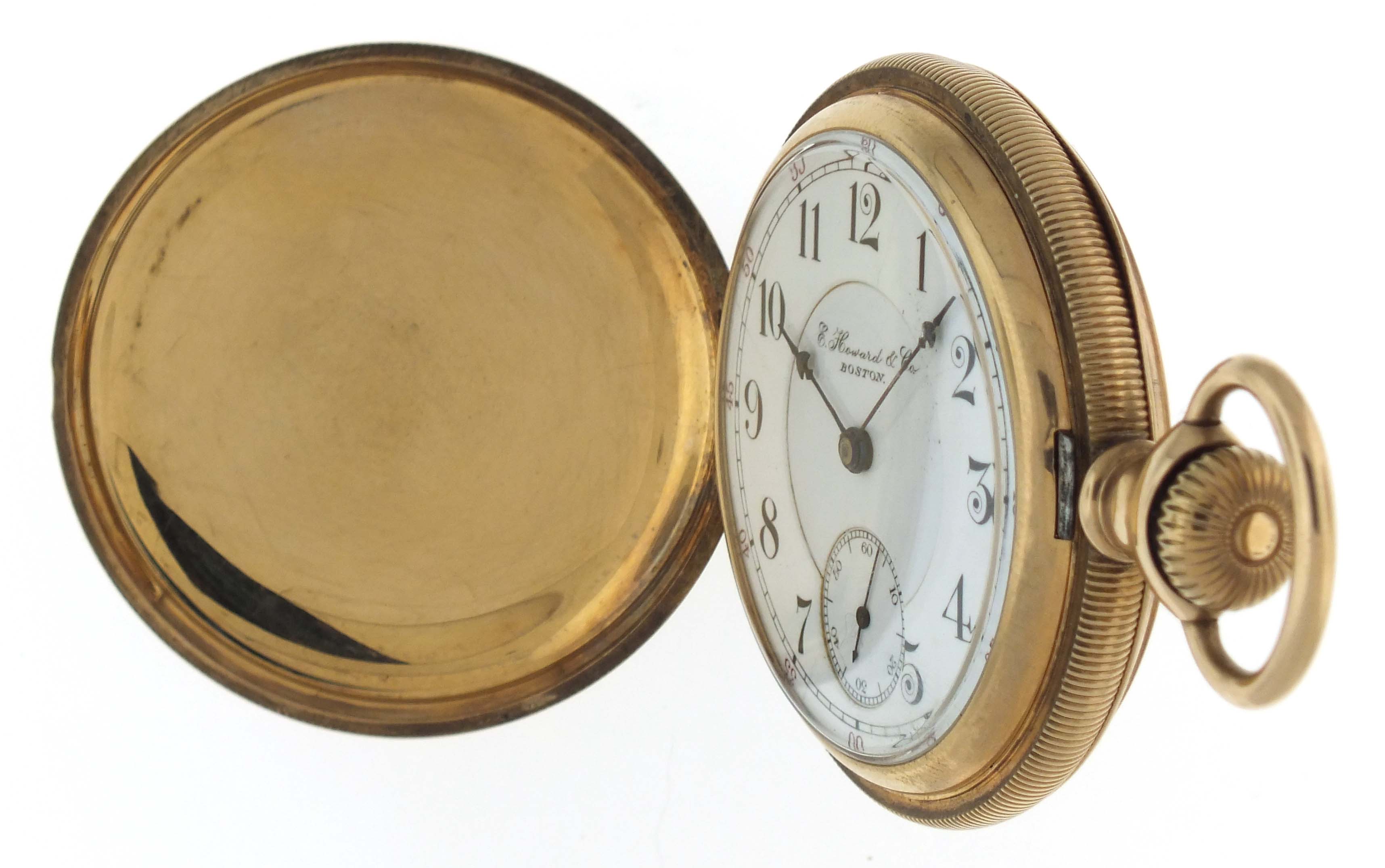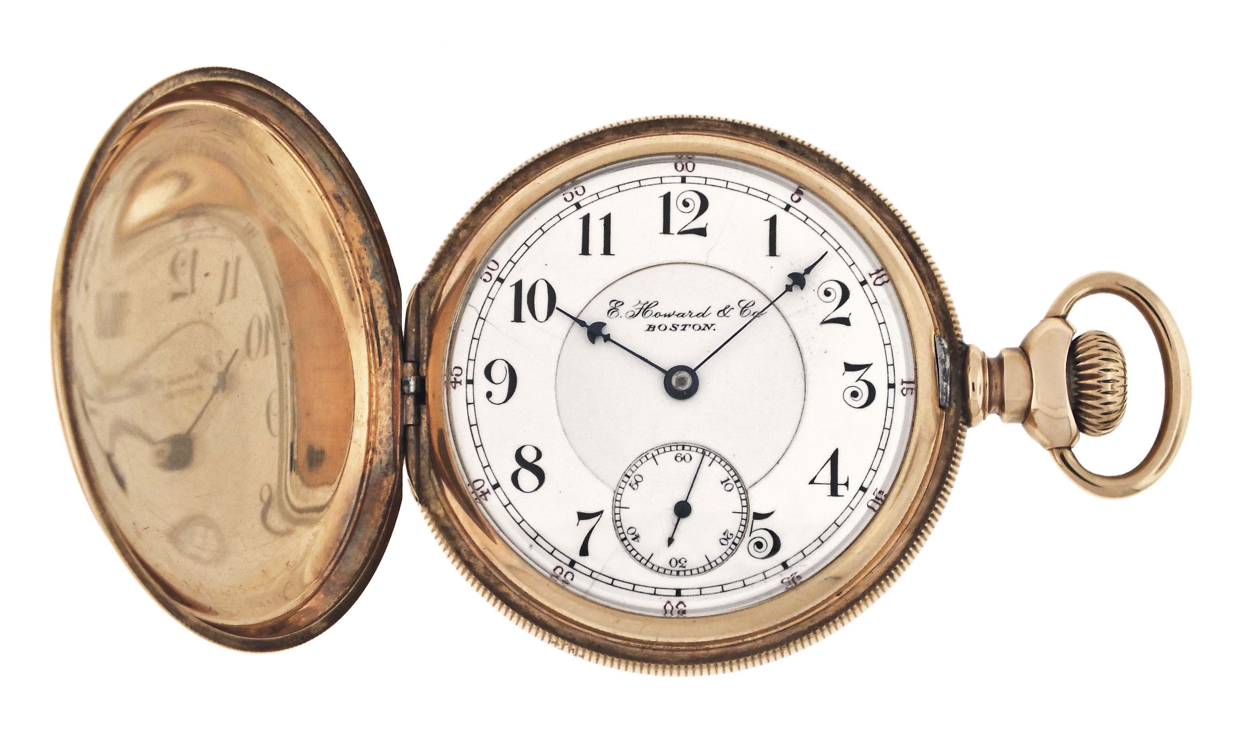 E. Howard & Co., Boston, Mass., a series XI split plate pocket watch, L size, 17 jewels, stem wind and set, adjusted, damascened nickel plate movement with lever escapement, cut bimetallic balance with gold screws, gold jewel settings, and whiplash micrometric regulator in a 14 karat, yellow gold, reeded edge, engine turned hunting case with engraved cipher on front cover, and engraved dedication on gold cuvette, arabic numeral, outer red 5-minute markers, double sunk white enamel dial with blued steel umbrella hands, serial #601043, 103.9g TW