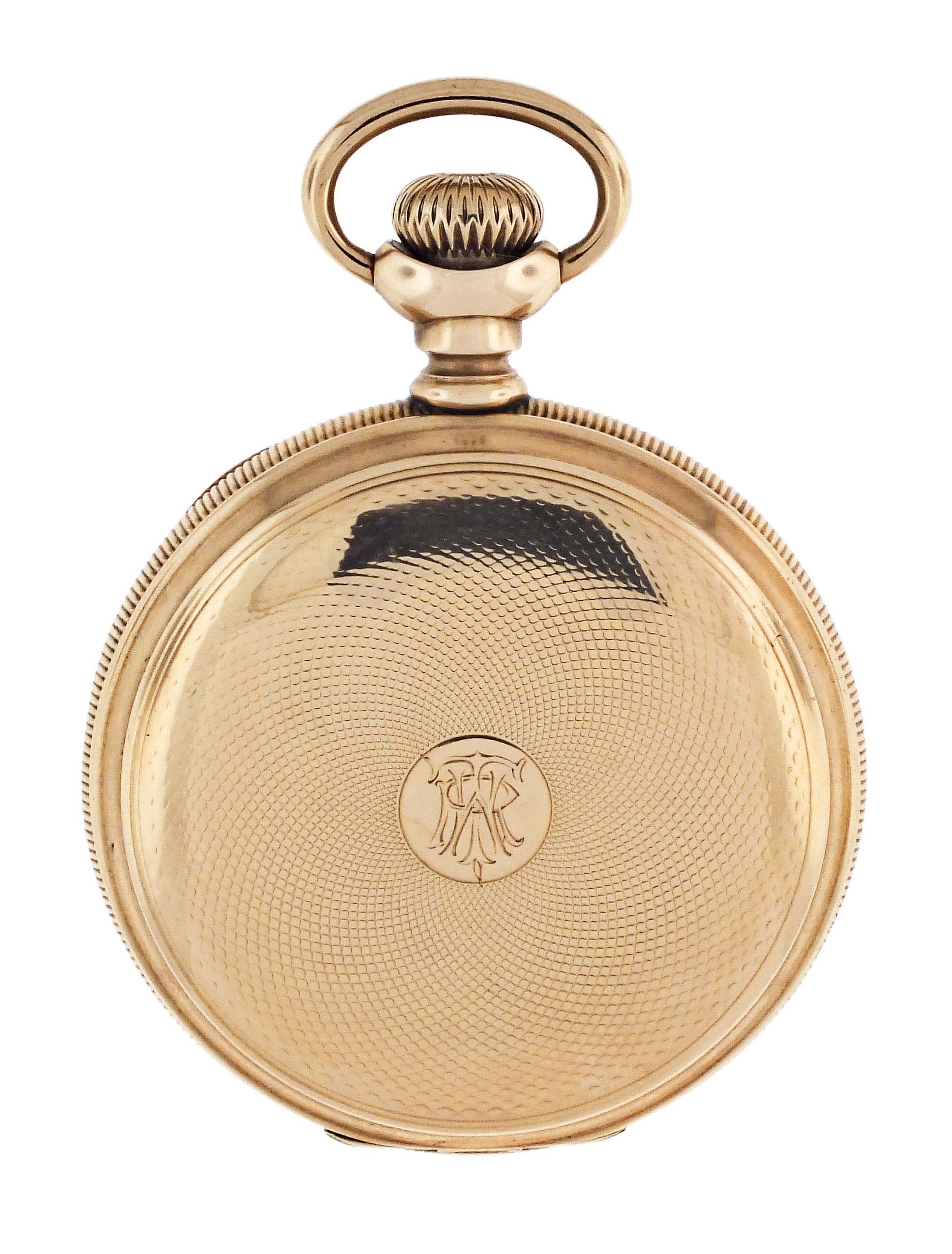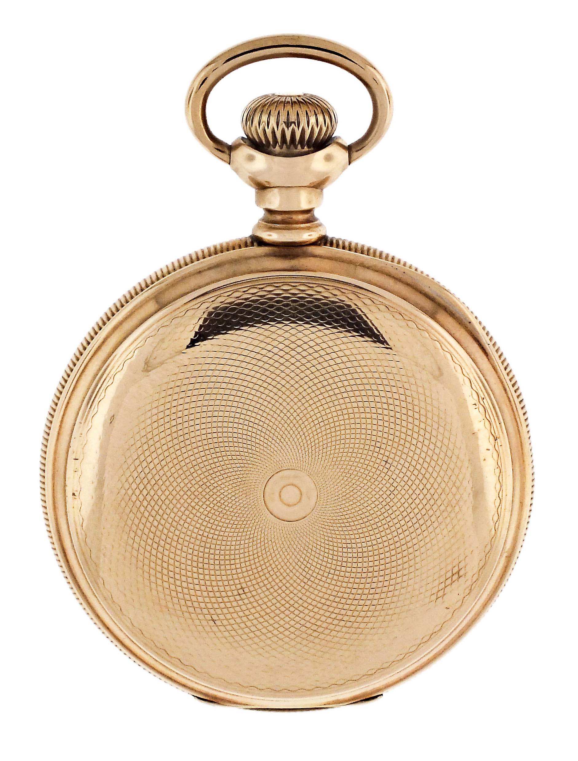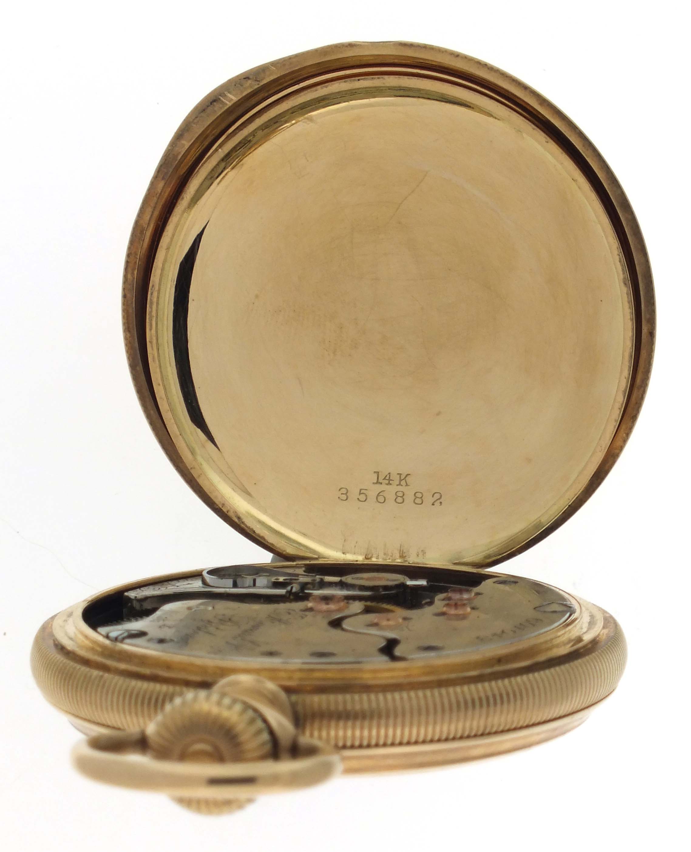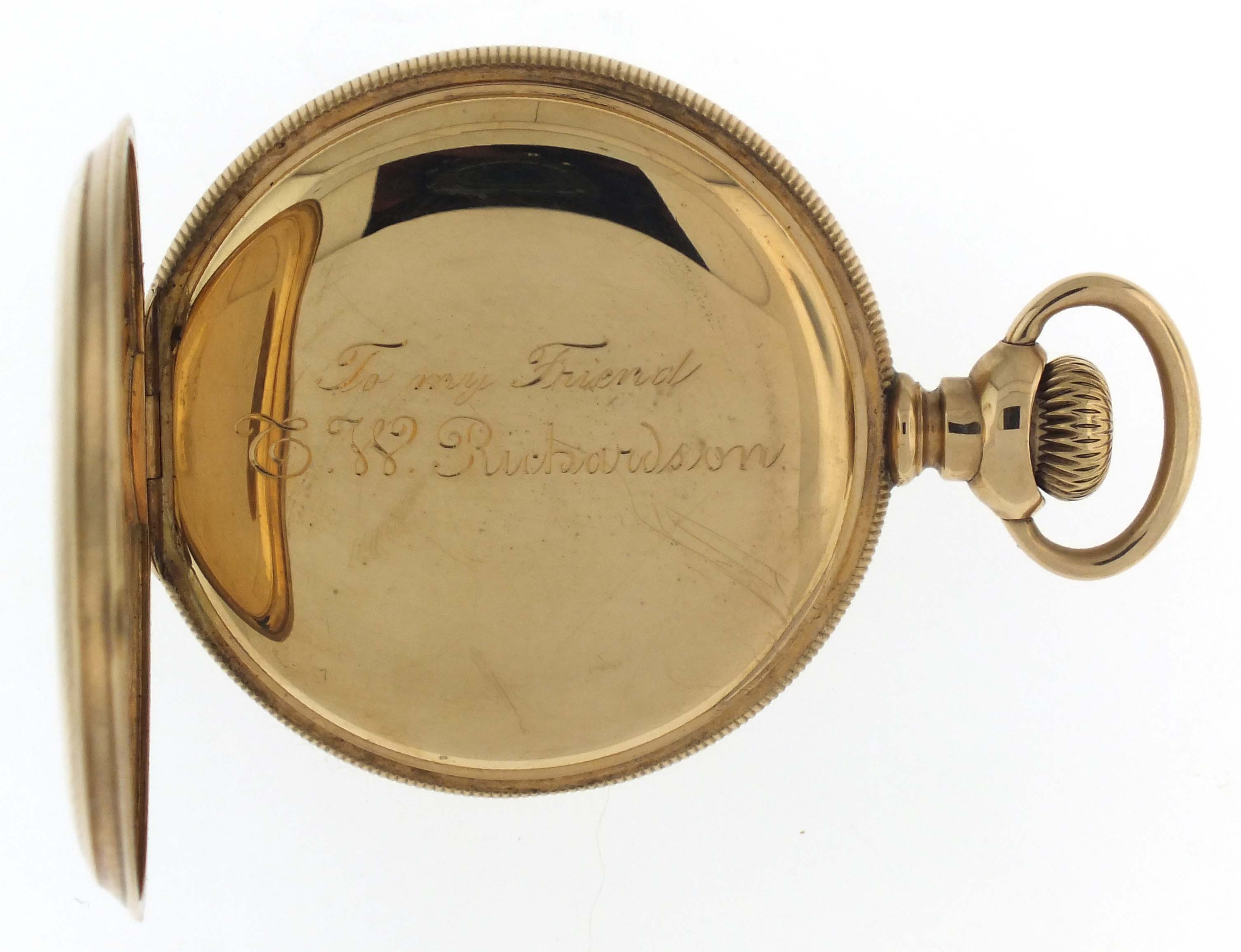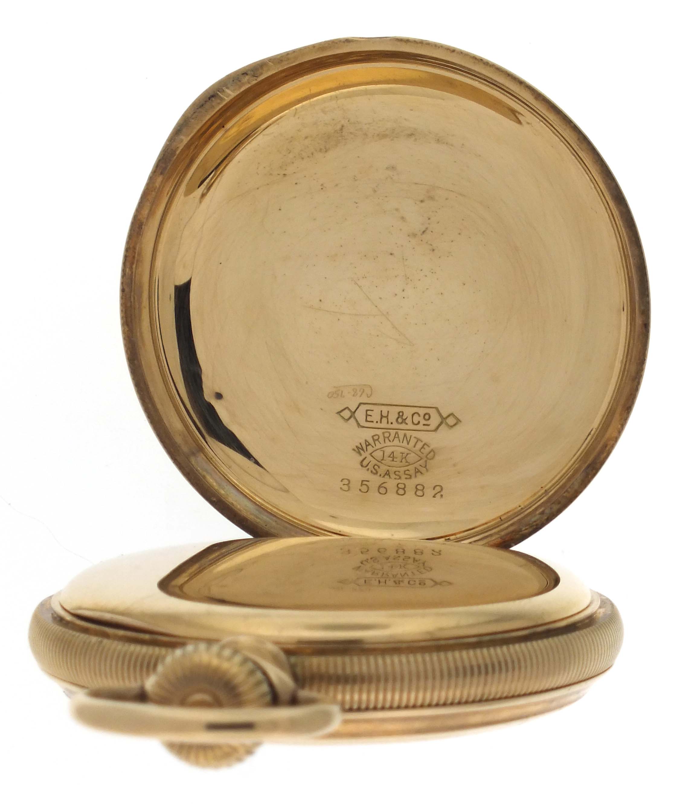 E. Howard & Co., Boston, Mass., a series XI split plate pocket watch, L size, 17 jewels, stem wind and set, adjusted, damascened nickel plate movement with lever escapement, cut bimetallic balance with gold screws, gold jewel settings, and whiplash micrometric regulator in a 14 karat, yellow gold, reeded edge, engine turned hunting case with engraved cipher on front cover, and engraved dedication on gold cuvette, arabic numeral, outer red 5-minute markers, double sunk white enamel dial with blued steel umbrella hands, serial #601043, 103.9g TW
