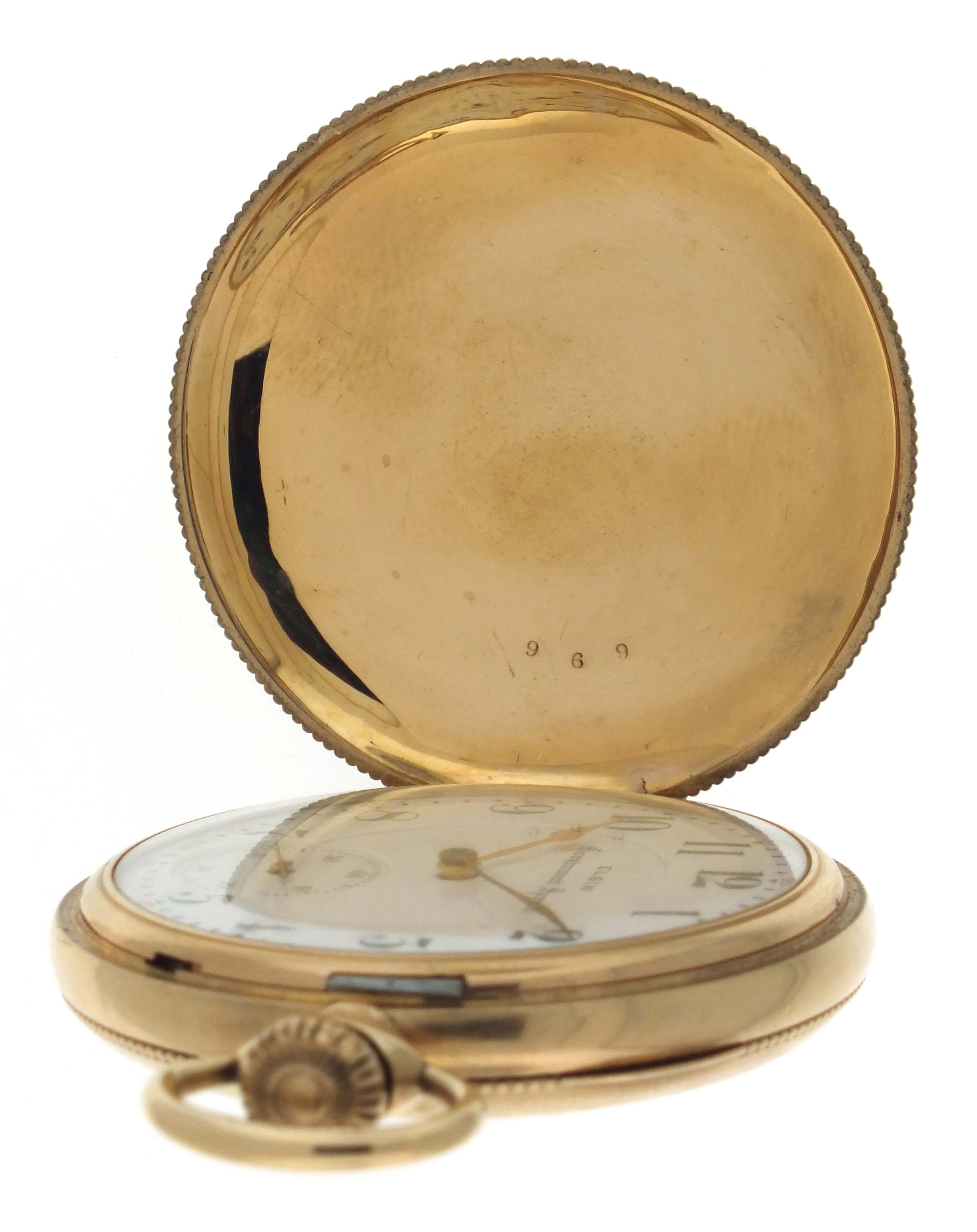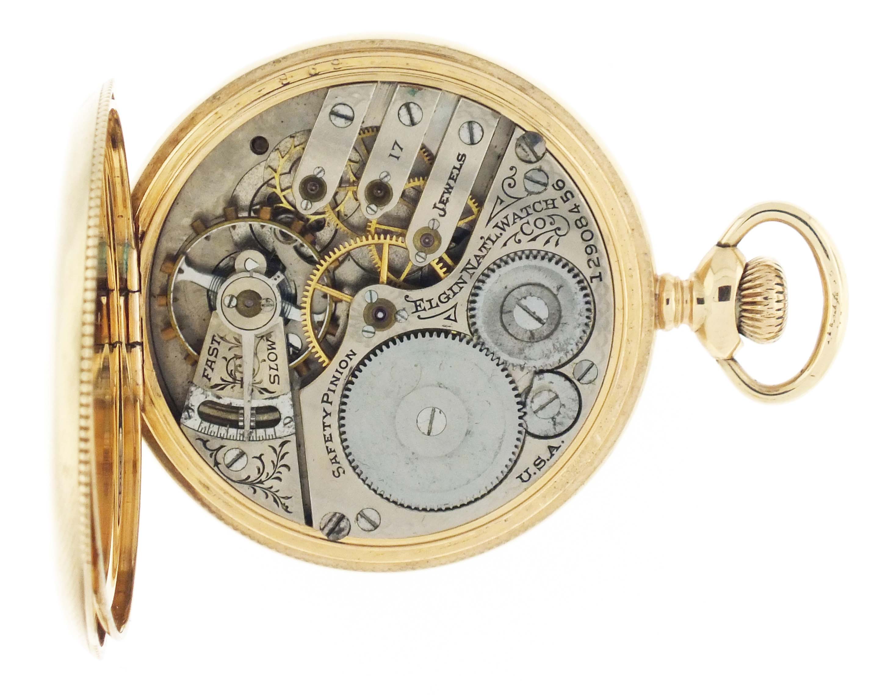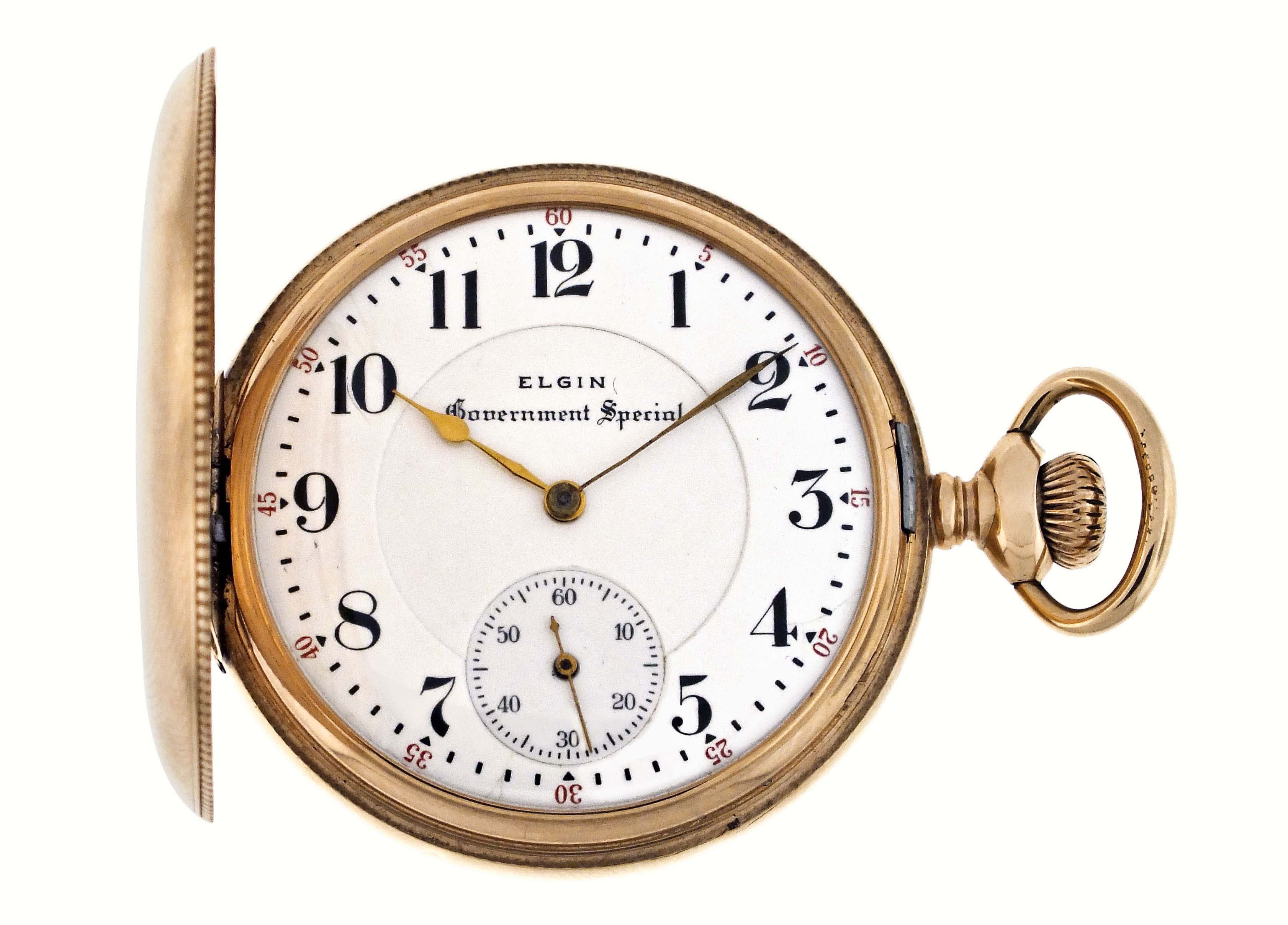Elgin National Watch Co., Elgin, Illinois, a gold cased pocket watch, 16 size, 17 jewels, stem wind and set, damascened nickel plate movement with lever escapement, cut bimetallic balance and Moseley micrometric regulator in a 14 karat, yellow gold, engine turned and engraved hunting case, arabic numeral, outer red 5-minute markers, single sunk white enamel dial marked "Government Special", with gold spade and whip hands, 12908456, 84.6g TW