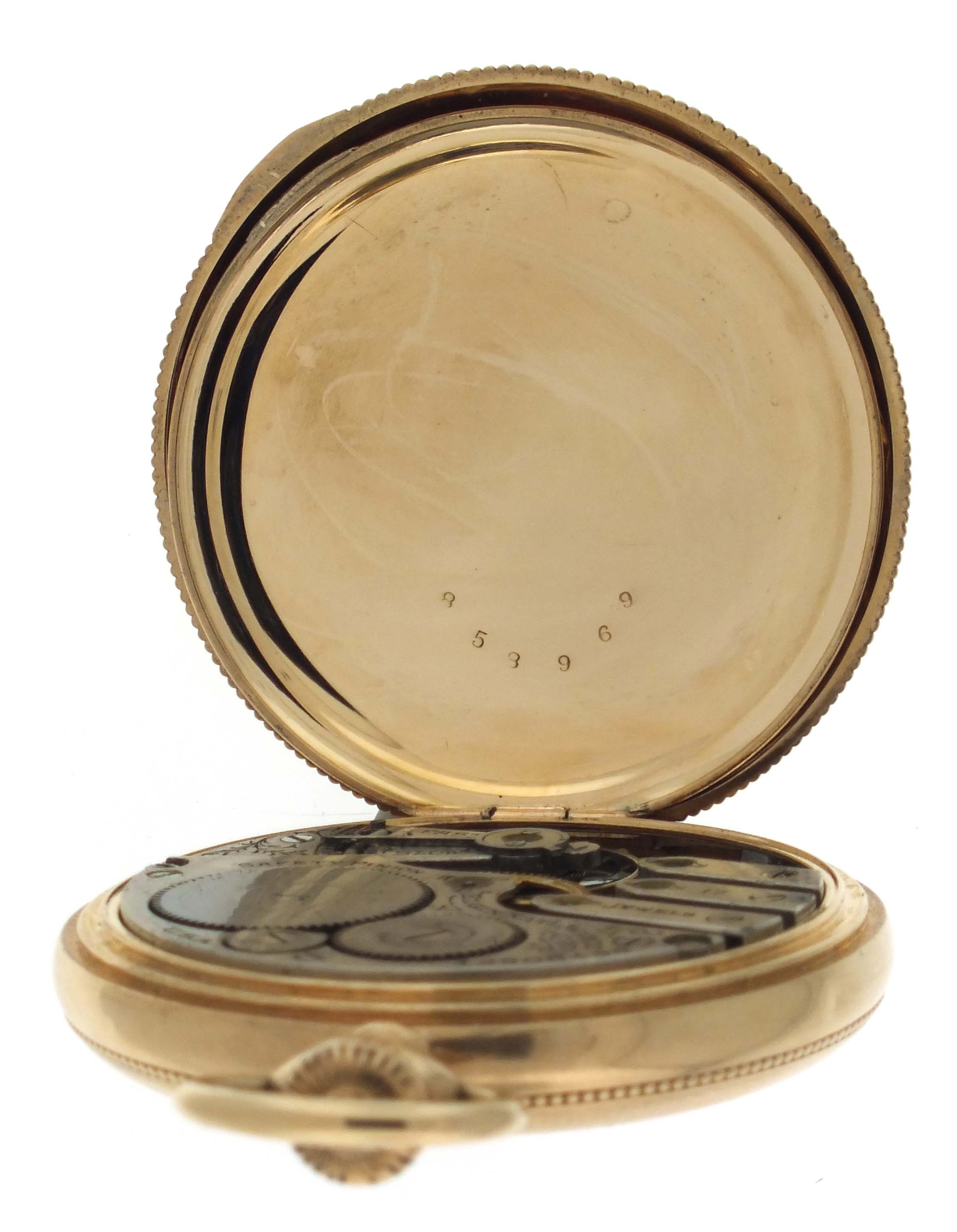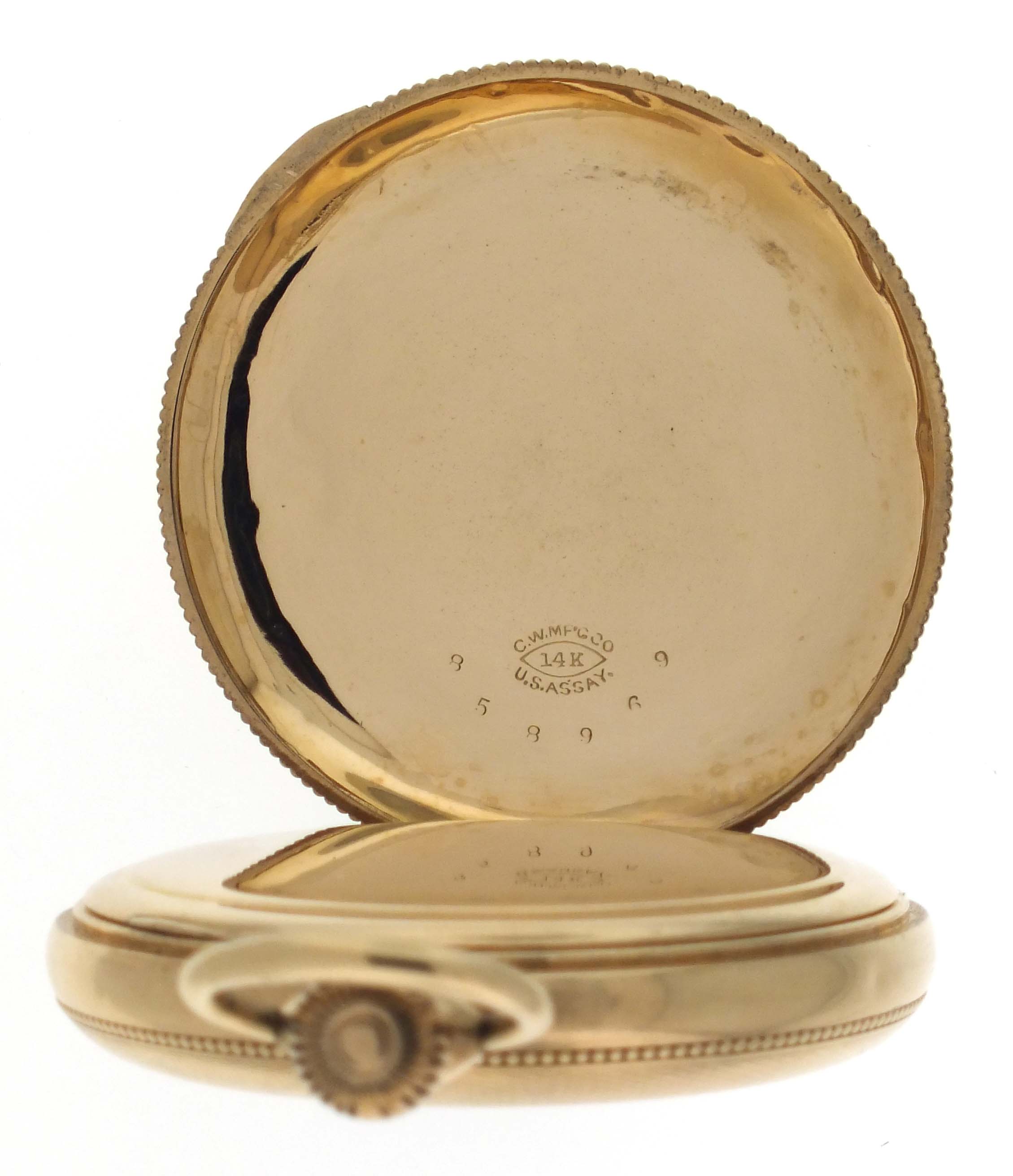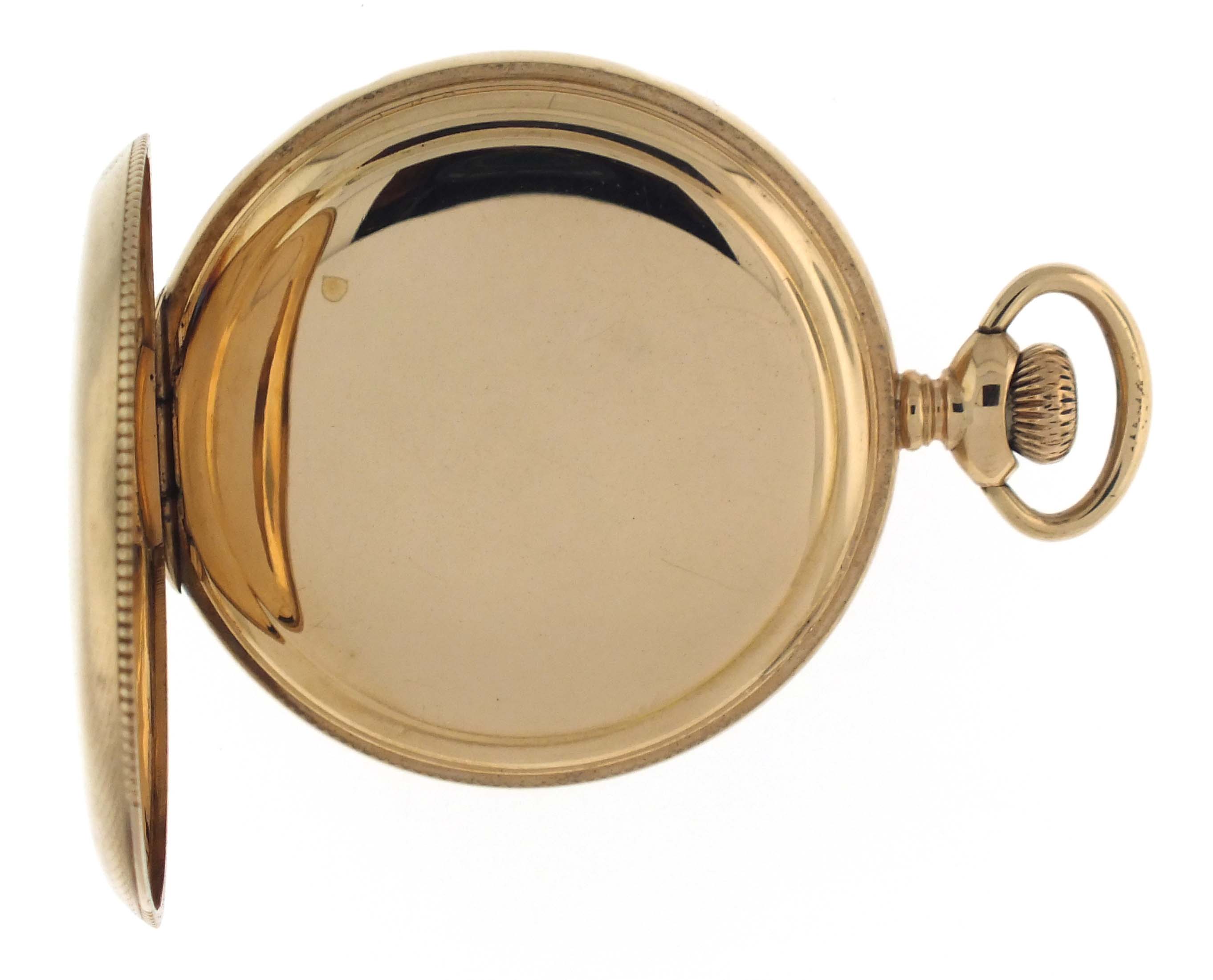 Elgin National Watch Co., Elgin, Illinois, a gold cased pocket watch, 16 size, 17 jewels, stem wind and set, damascened nickel plate movement with lever escapement, cut bimetallic balance and Moseley micrometric regulator in a 14 karat, yellow gold, engine turned and engraved hunting case, arabic numeral, outer red 5-minute markers, single sunk white enamel dial marked "Government Special", with gold spade and whip hands, 12908456, 84.6g TW