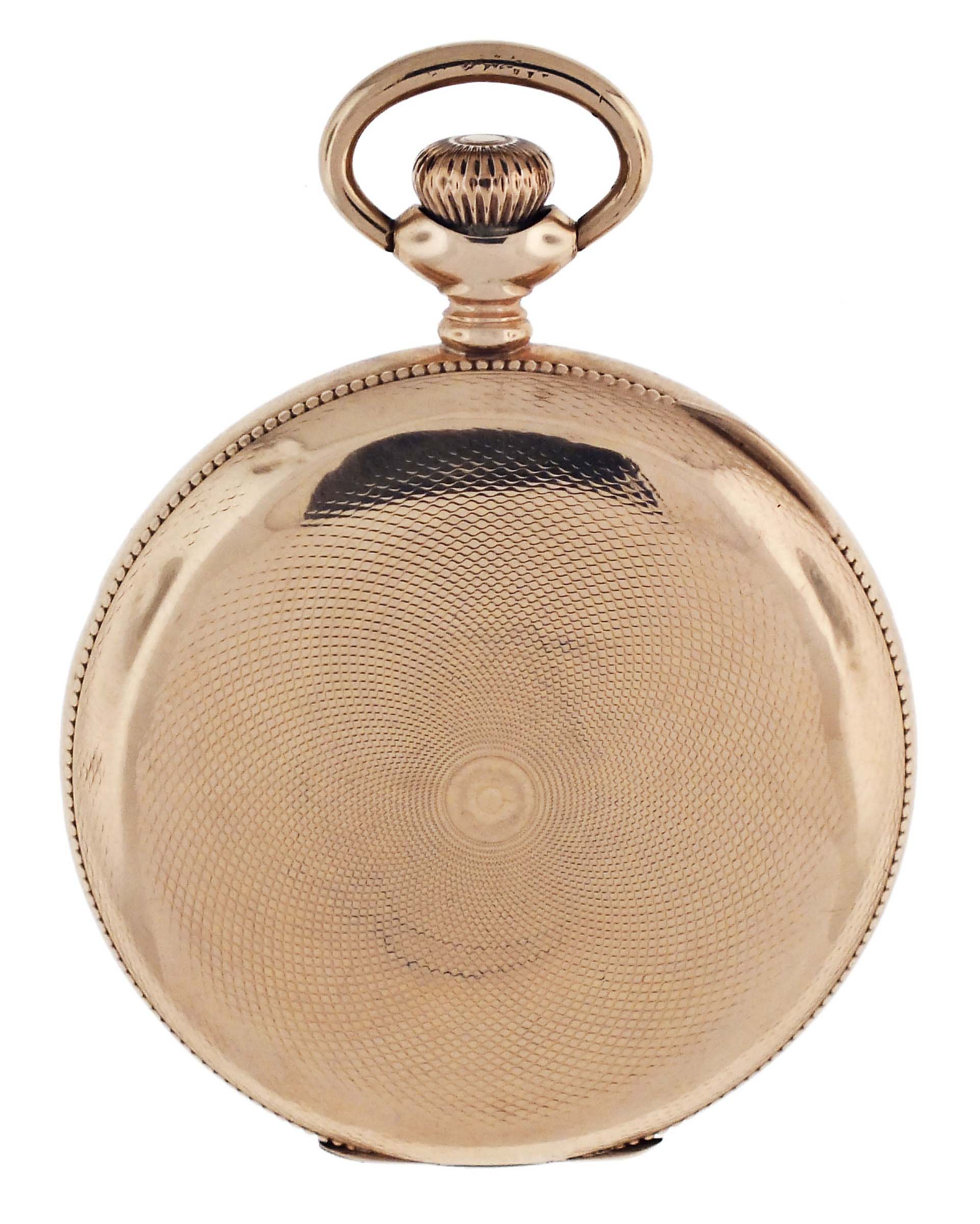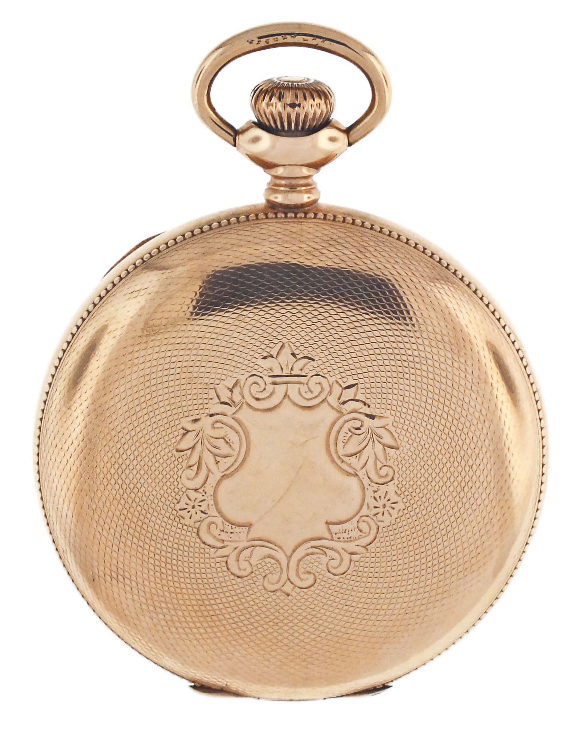 CASE: Case has housed another movement; Band with a few dents; Covers with tiny dents; Back with shallow dent; Very fine scratches on outer surface of case; Fine scratches on cuvette; Engine turning with moderate wear; Front cover hinge sticky; Significant pressure required to release front cover catch; Bow with pin pricks; Crown shell worn through; Precious metal content marked. DIAL: Faint hairlines. HANDS: Minor oxide, minute. MOVEMENT PLATES: Fine scratches and pin pricks on plate; Gouge at one barrel bridge screw; Ratchet wheel, regulator, click, and one bridge screw abraded; Regulator with specks of oxide; Train bridge with spot of corrosion; Some screw heads with marring and specks of oxide. MOVEMENT FUNCTION: Running order (winds, sets and ticks).