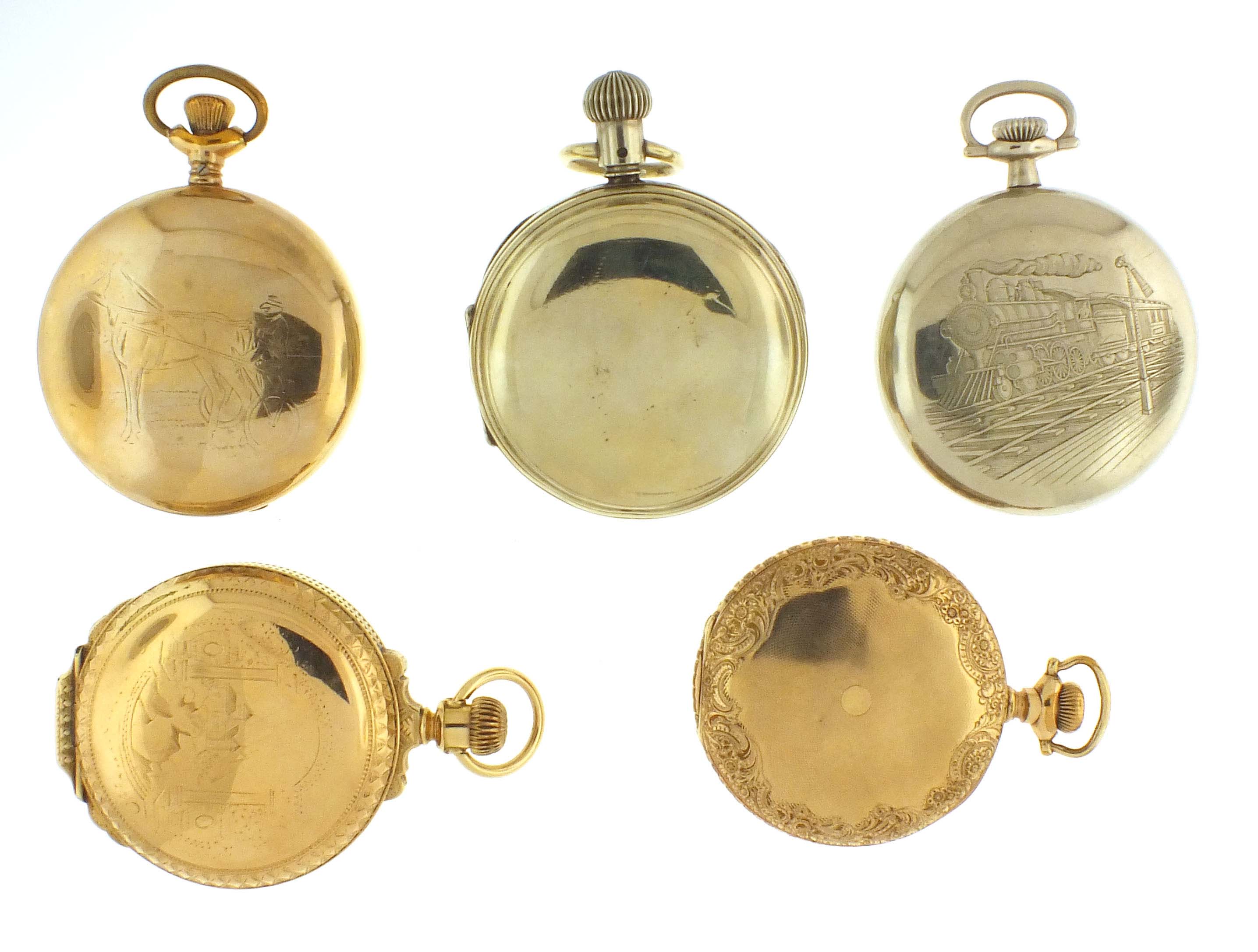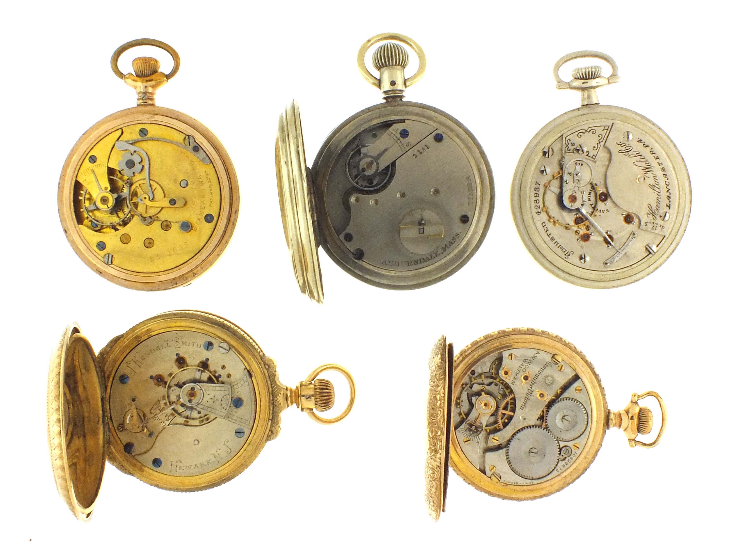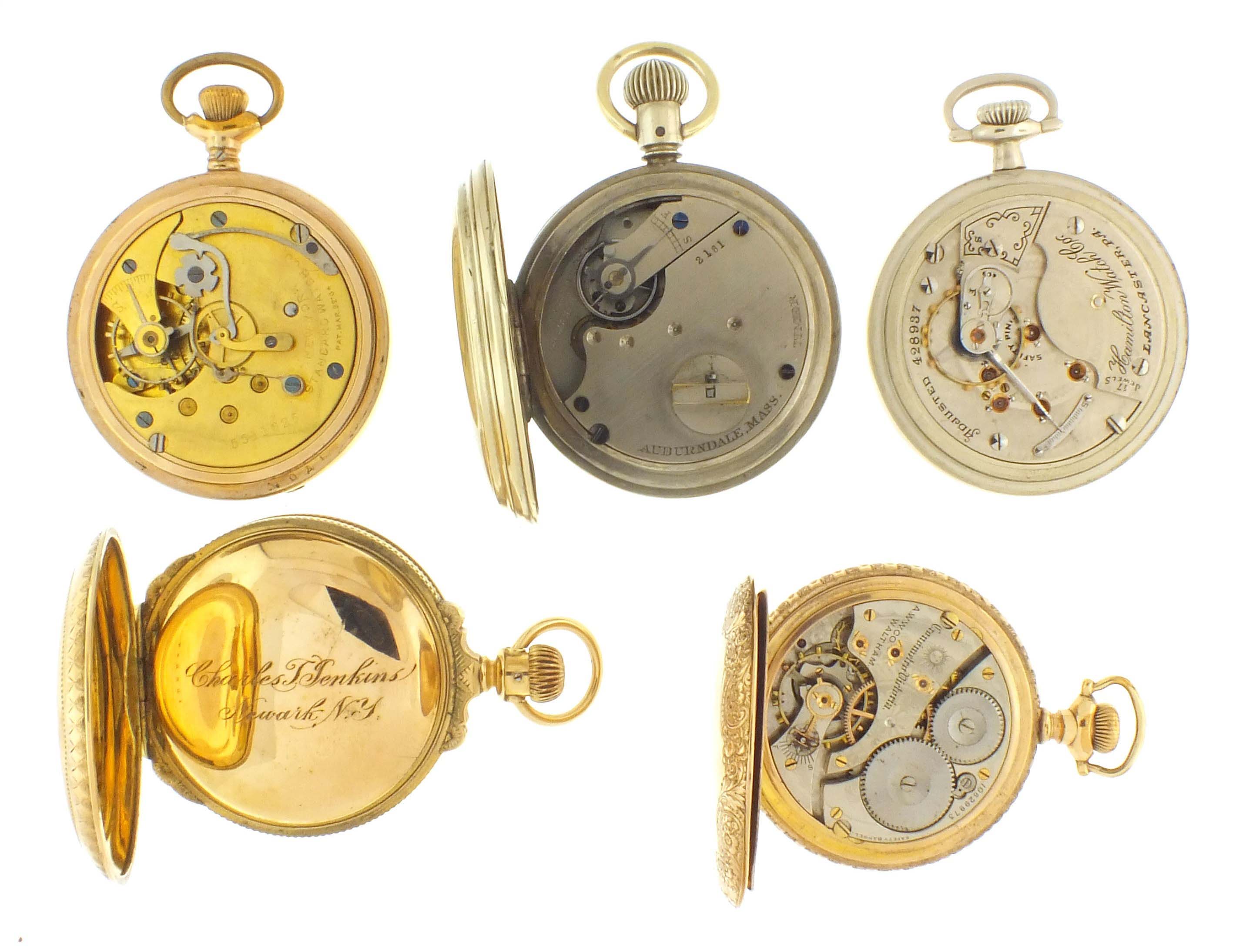 5 (Five) American pocket watches including an Auburndale timer recording 1/8 seconds, a Waltham Chronometro Victoria, others by Hamilton, Illinois, New York Standard, all 18 size, 4 -17 jewel movements, roman and arabic numeral enamel dials, nickel and gold filled open face and hunting cases