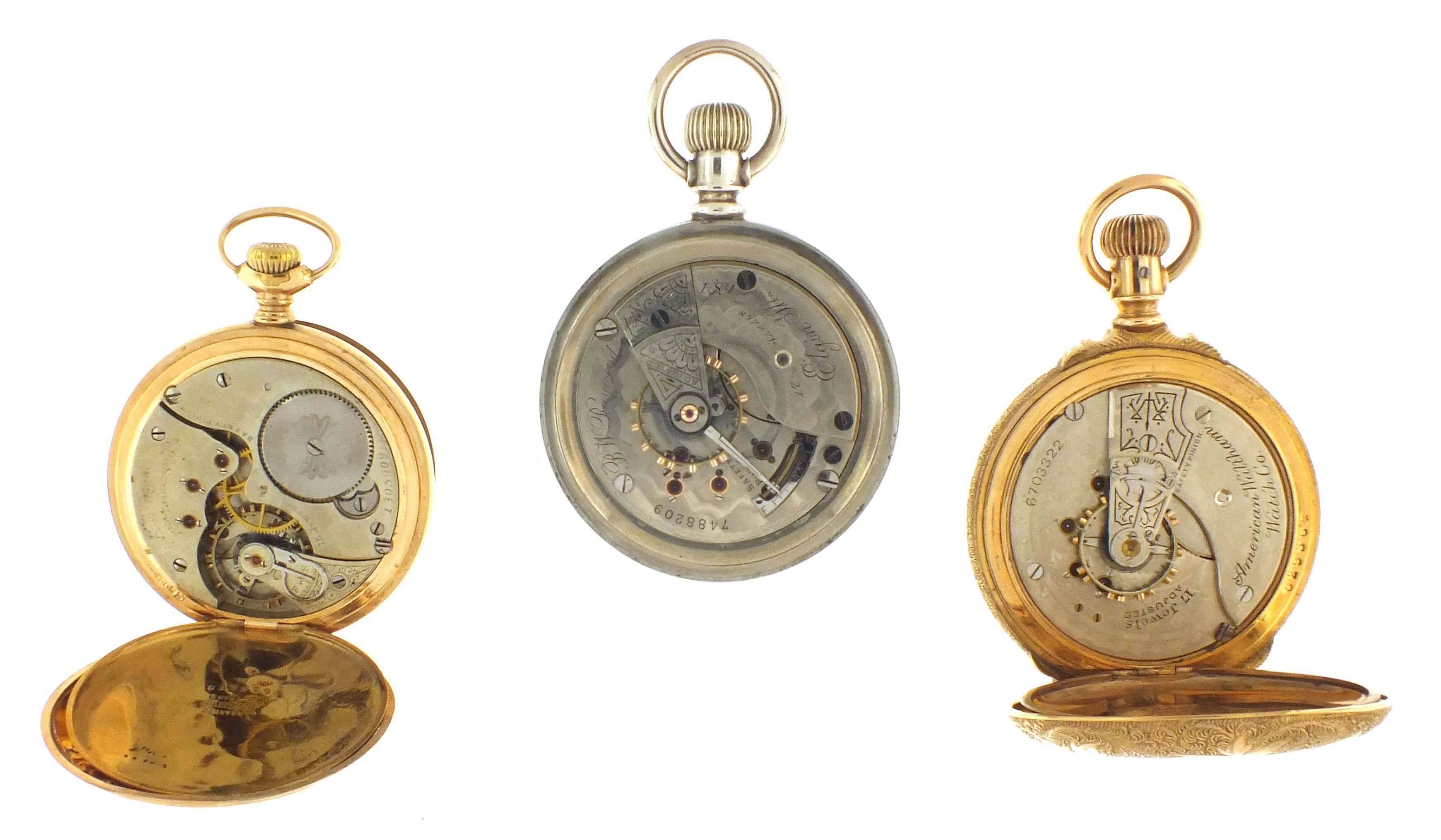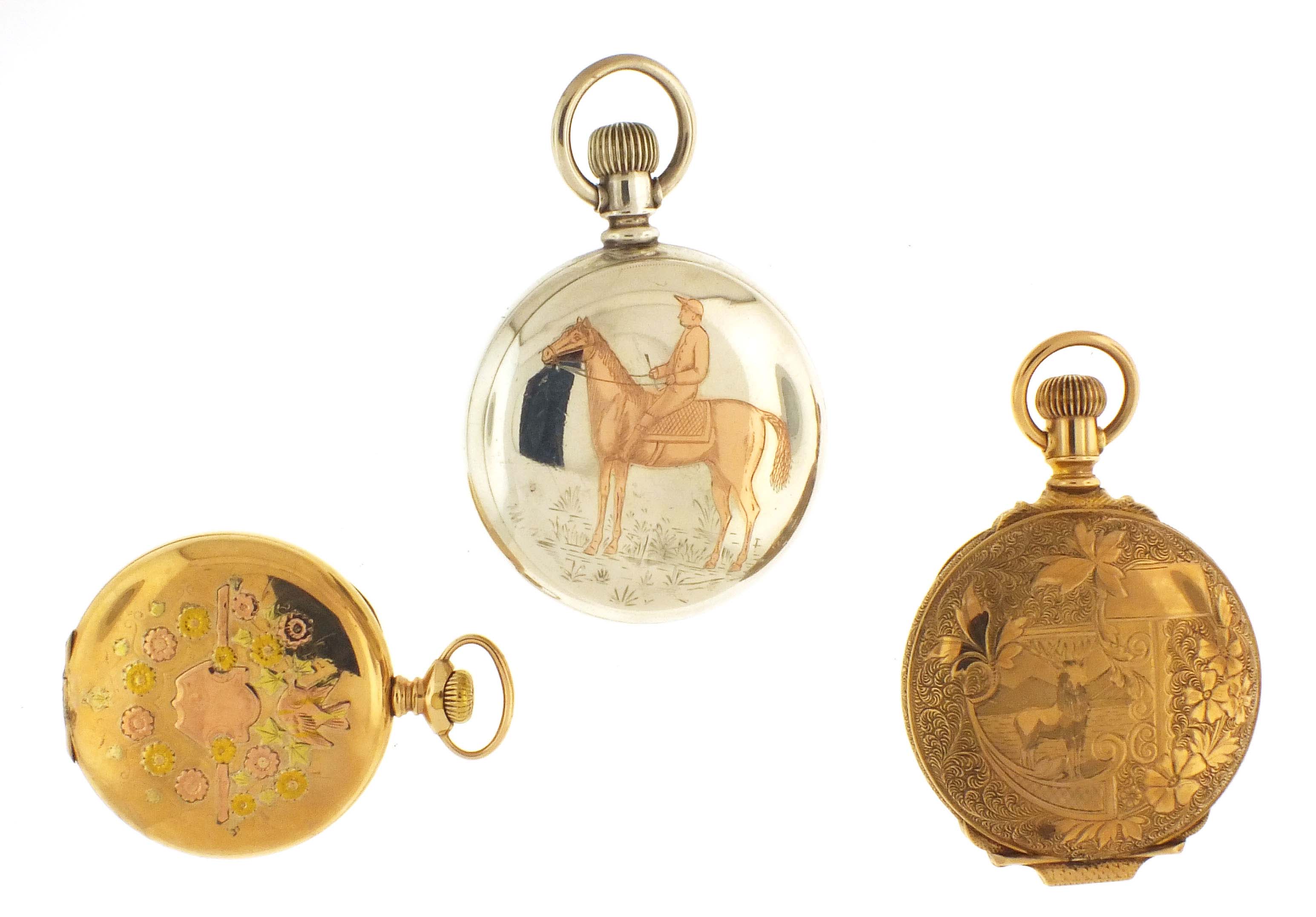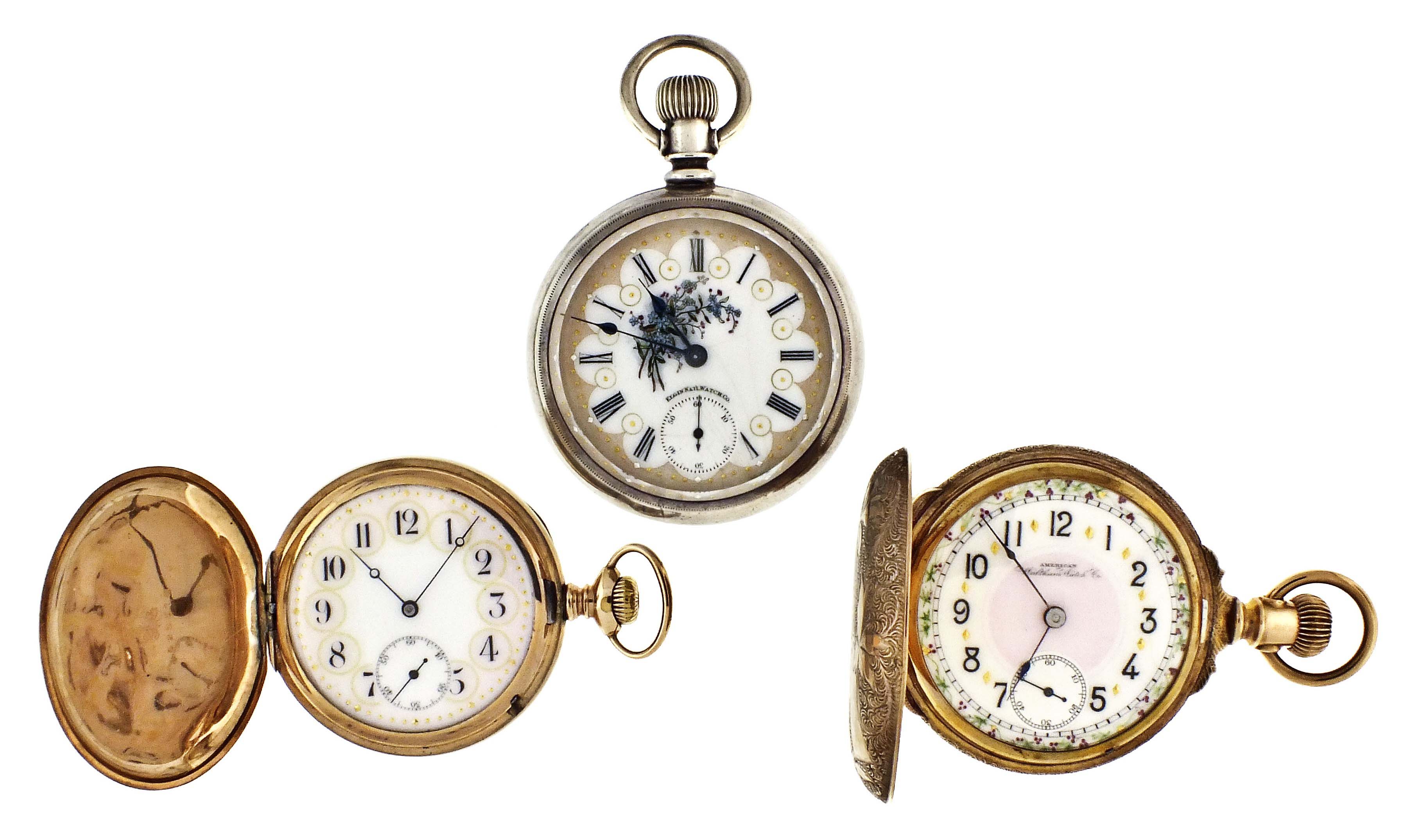3 (Three) American pocket watches, 16 to18 size with fancy multicolor dials including an Elgin model 7,grade 180, 17 jewel movement in coin silver case with gold horse, serial #7488209, a Waltham model 1883, grade 87, 17 jewel movement in an engraved gold filled hunting case serial #6703322, and an Illinois model 4, grade 173, 15 jewel movement in a gold filled hunting case, serial #1305909