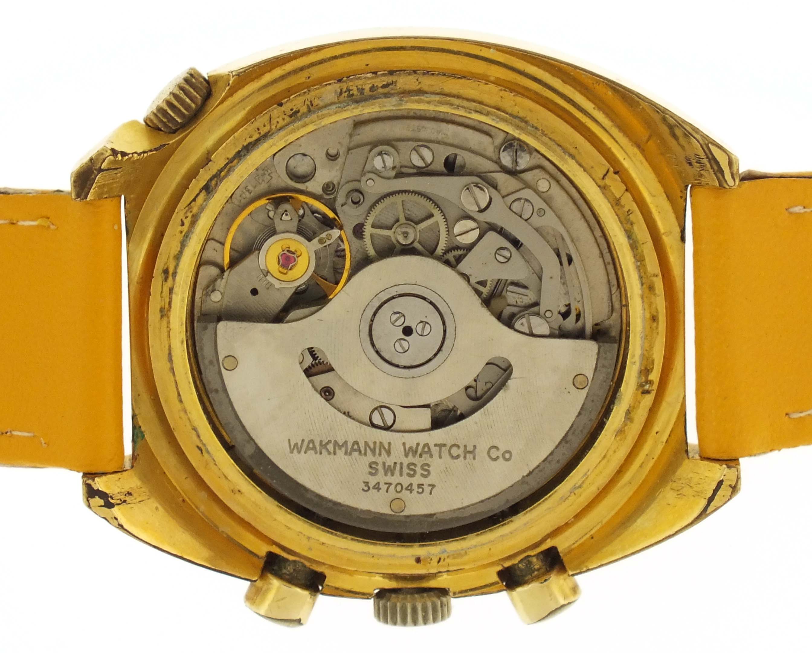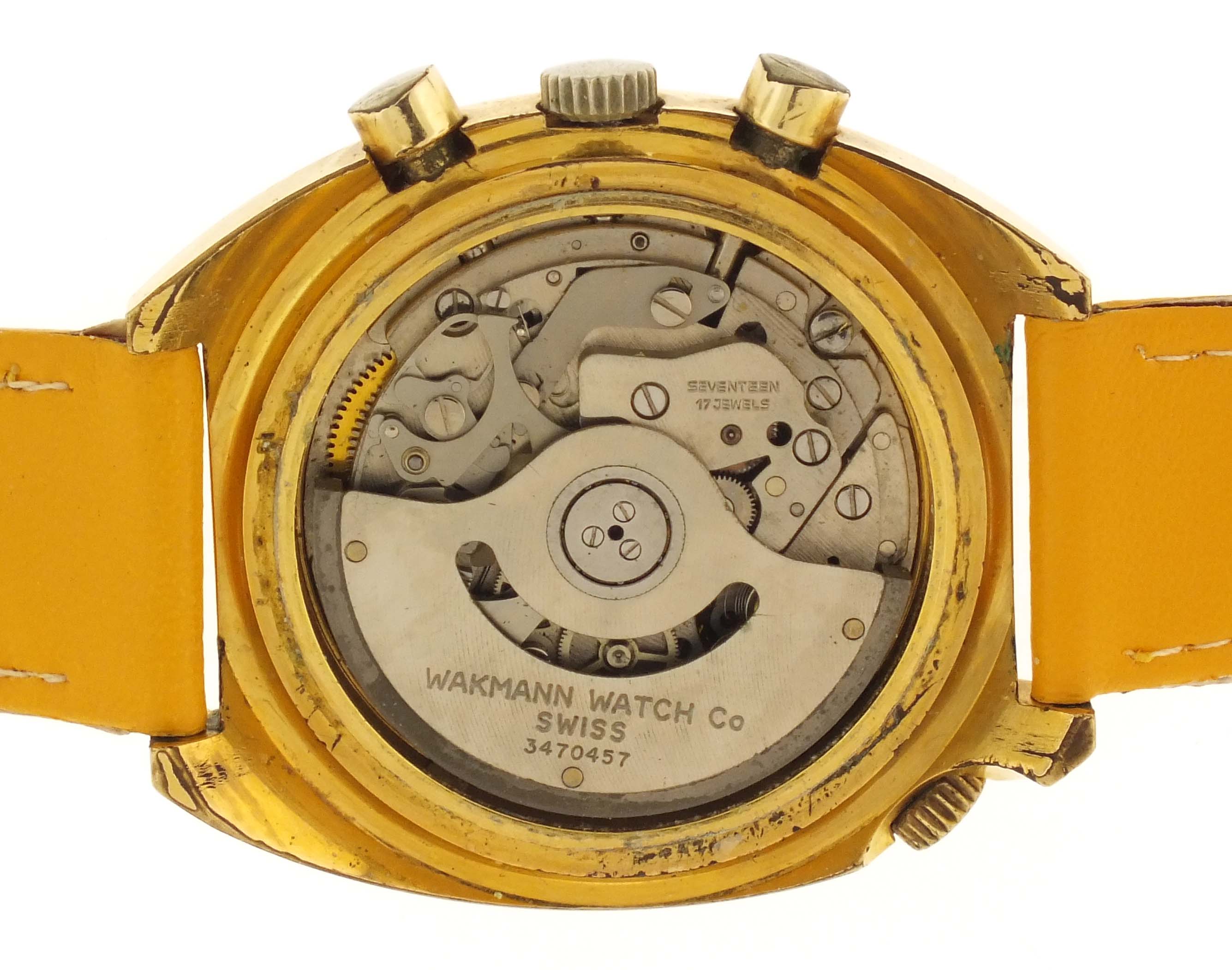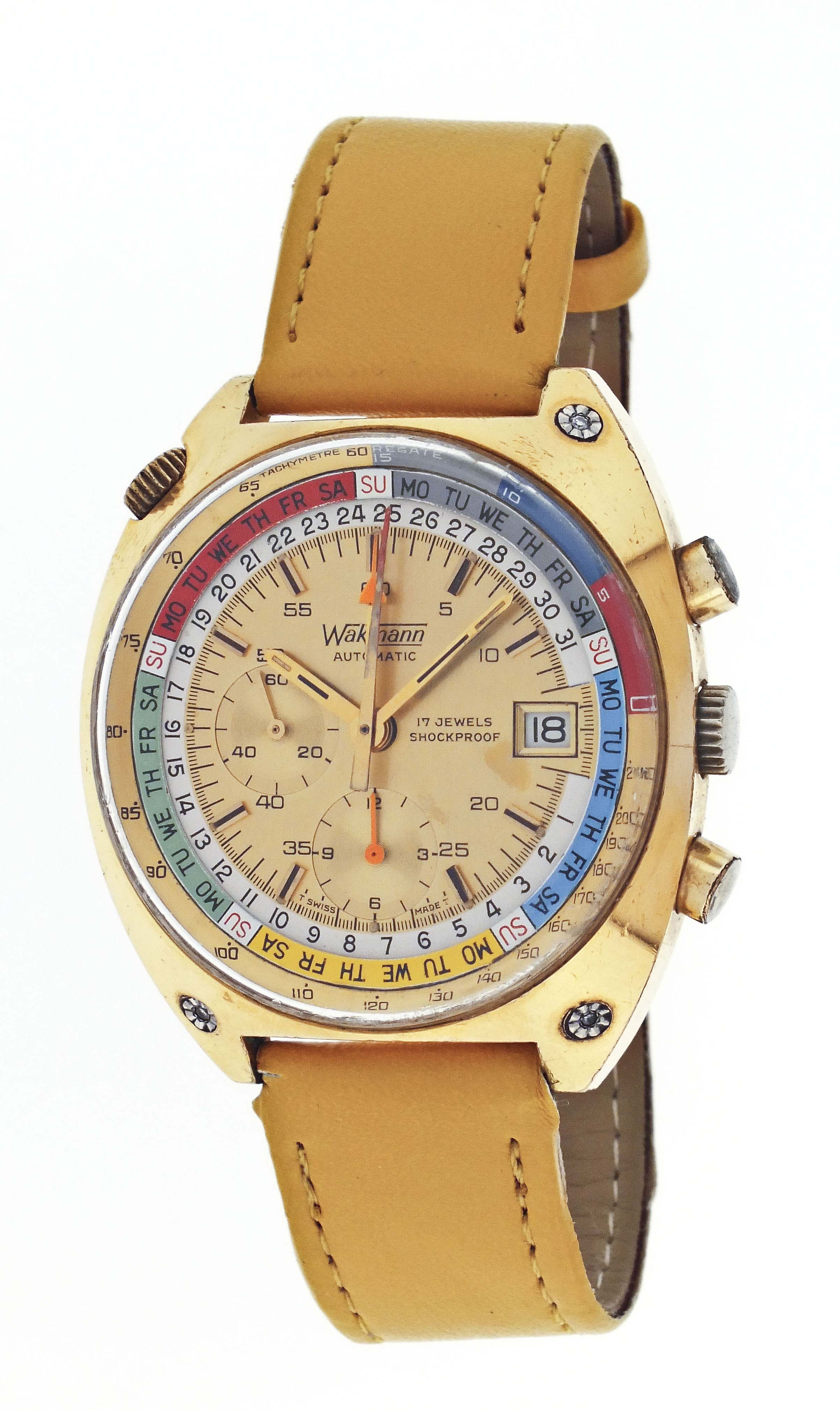 Wakmann Watch Co., New York, a ref. 9804 "Regate" automatic wrist chronograph, 17 jewels, automatic winding rhodium plated Lemania cal. 1341 movement with lever escapement in a gold plated tonneau case set with three faux diamonds and with a yellow leather strap, baton marker, brushed champagne dial with date aperture at 3:00, hour register at 6:00, constant seconds at 9:00, and central elapsed minute counter, with concentric date ring, rotating day of the week display, and tachymetre scale, gold plated hands, 42mm x 47.5mm