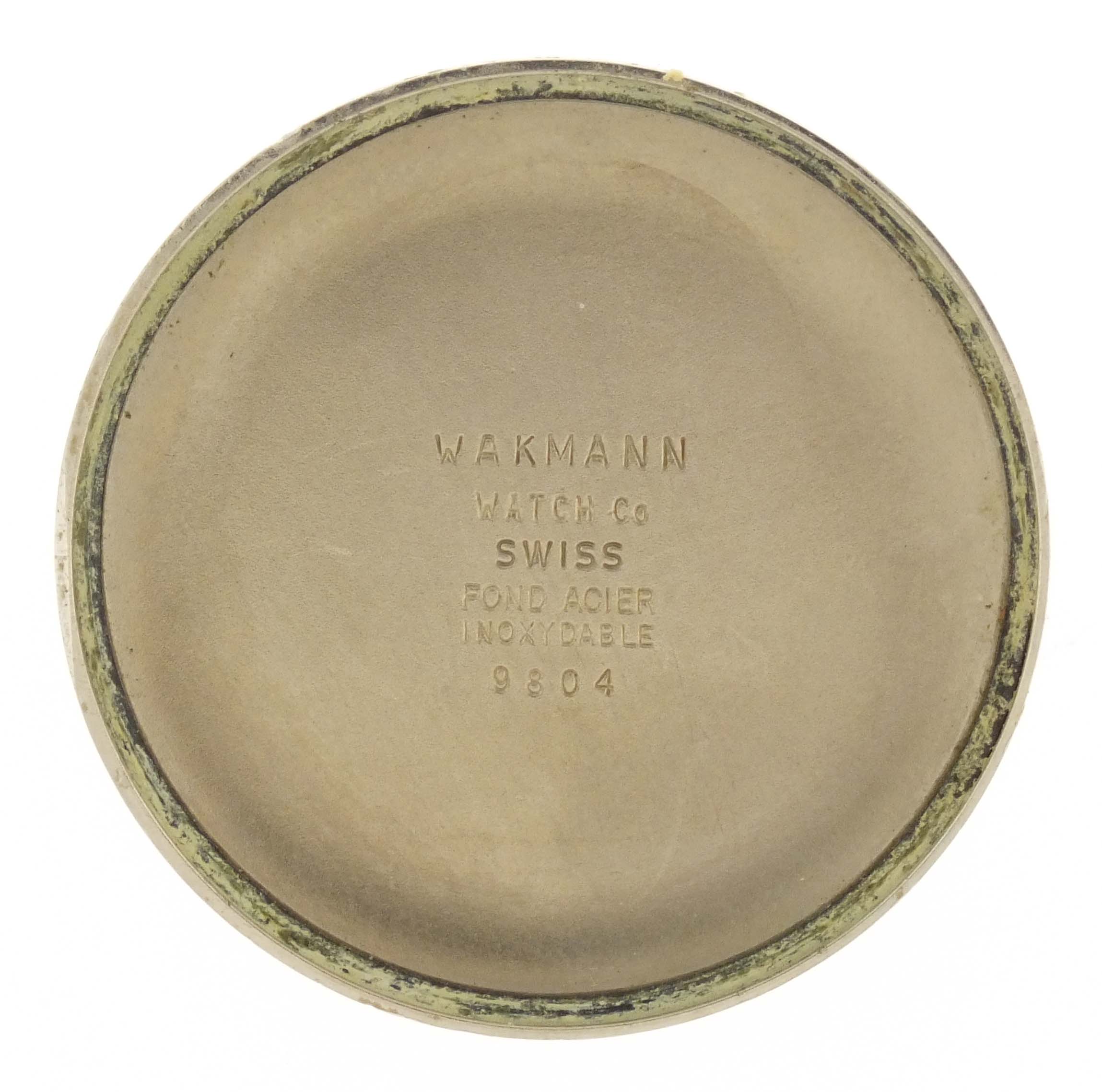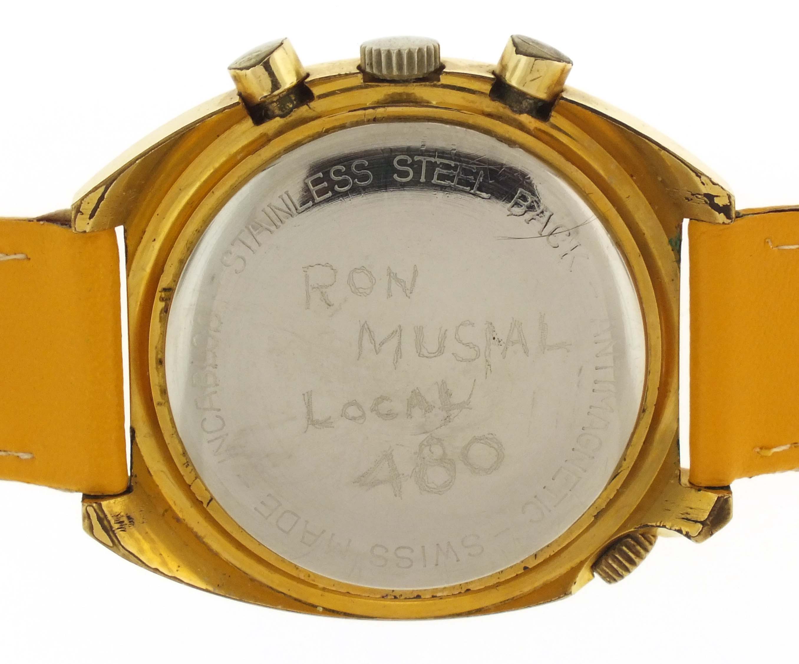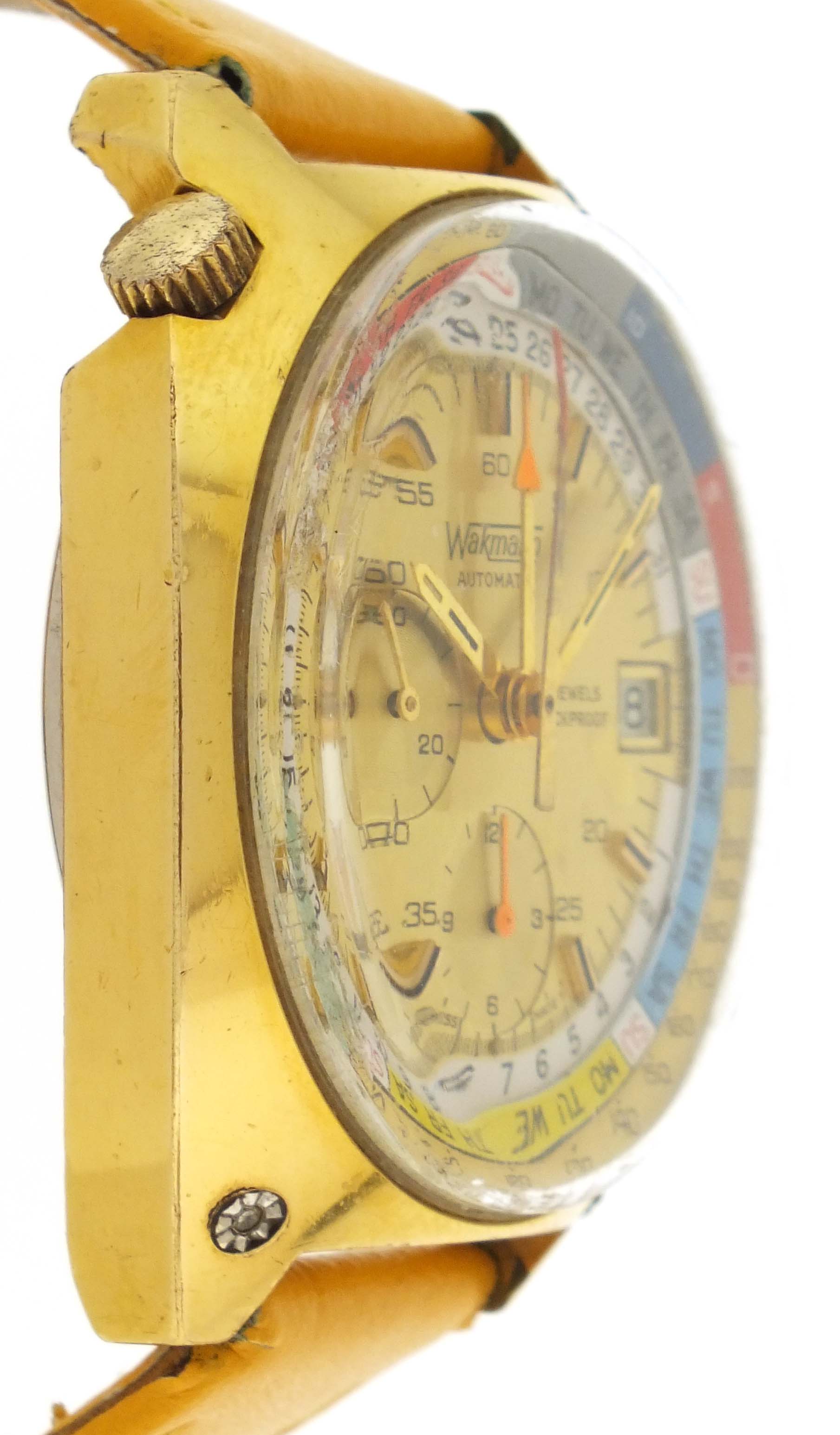 Wakmann Watch Co., New York, a ref. 9804 "Regate" automatic wrist chronograph, 17 jewels, automatic winding rhodium plated Lemania cal. 1341 movement with lever escapement in a gold plated tonneau case set with three faux diamonds and with a yellow leather strap, baton marker, brushed champagne dial with date aperture at 3:00, hour register at 6:00, constant seconds at 9:00, and central elapsed minute counter, with concentric date ring, rotating day of the week display, and tachymetre scale, gold plated hands, 42mm x 47.5mm