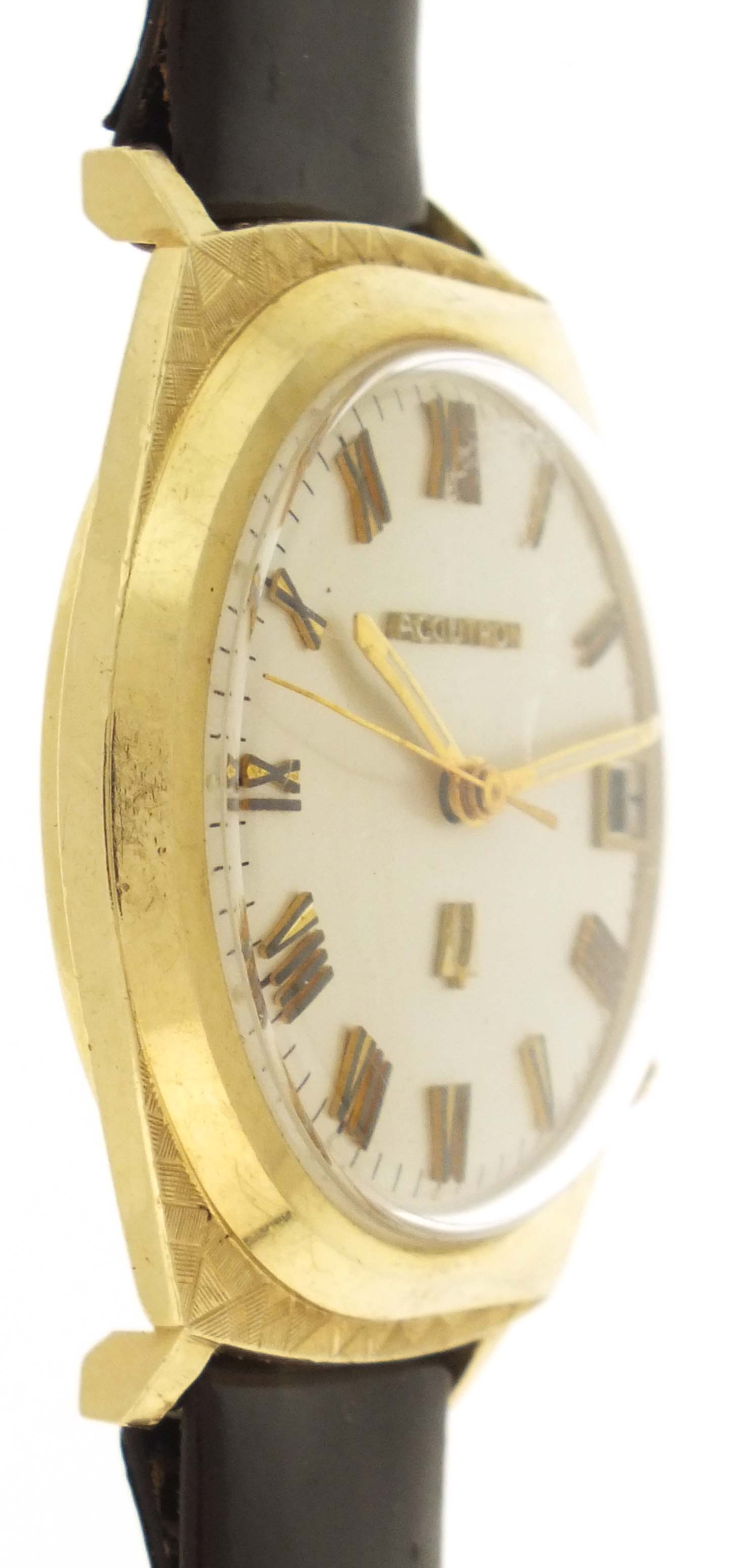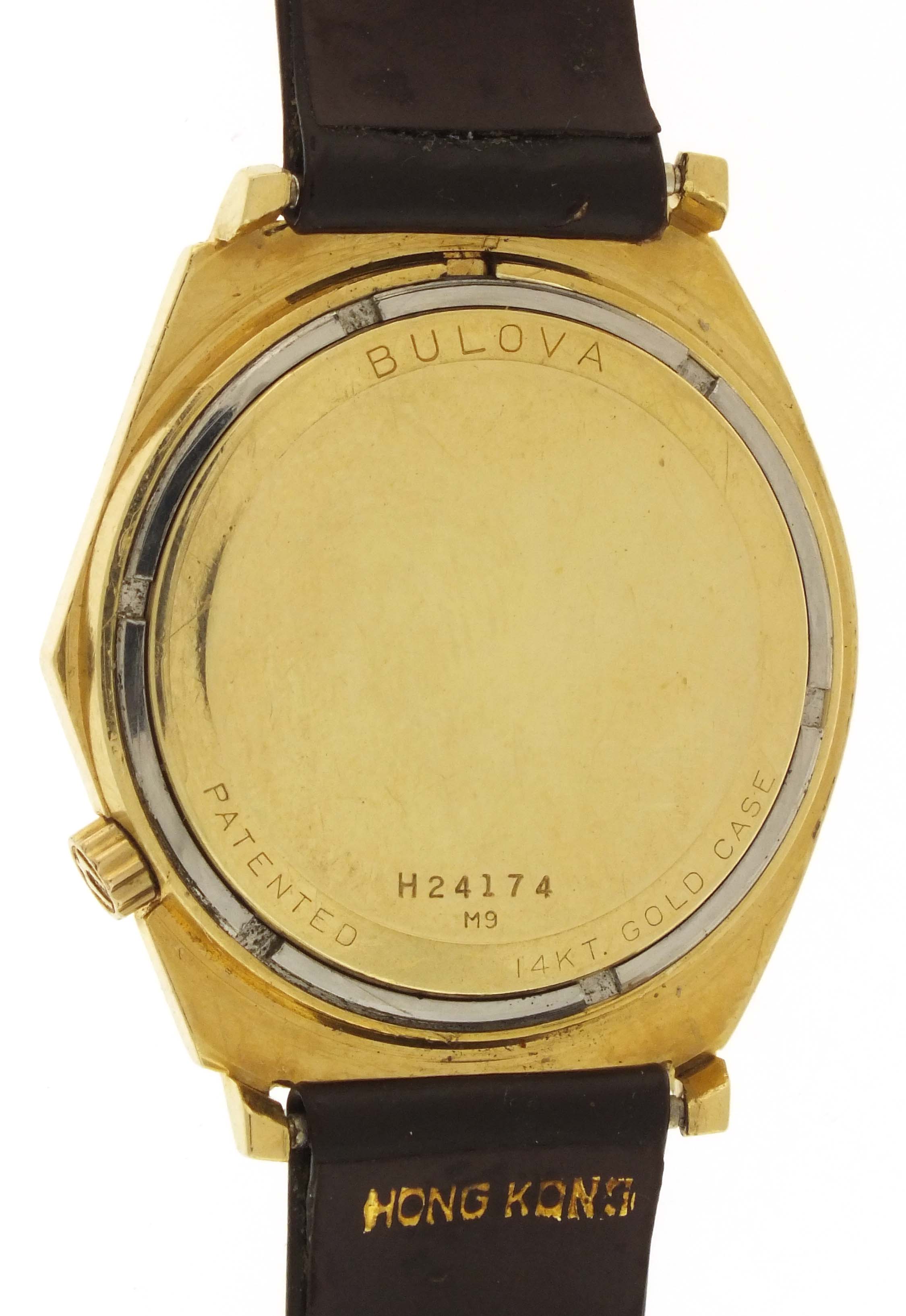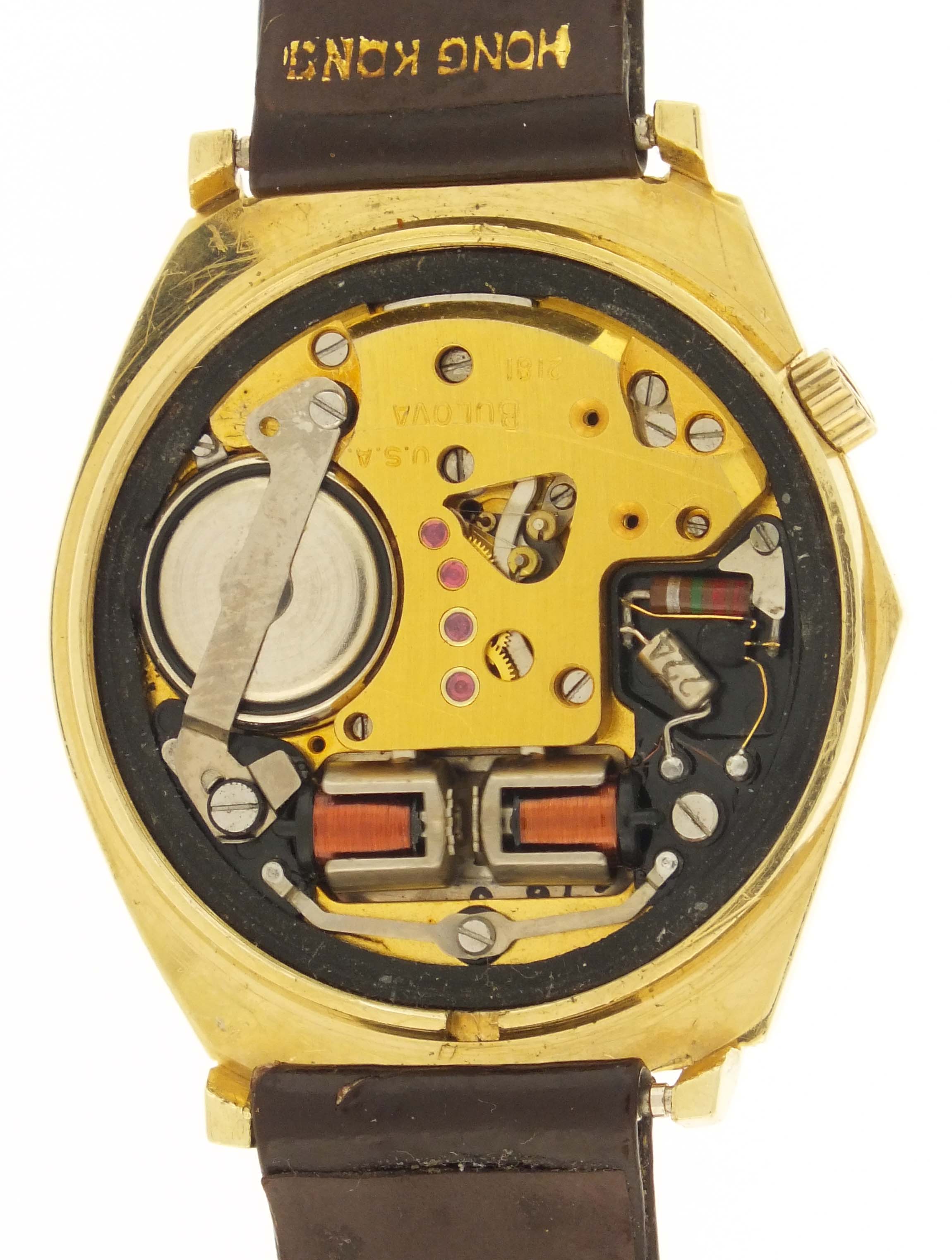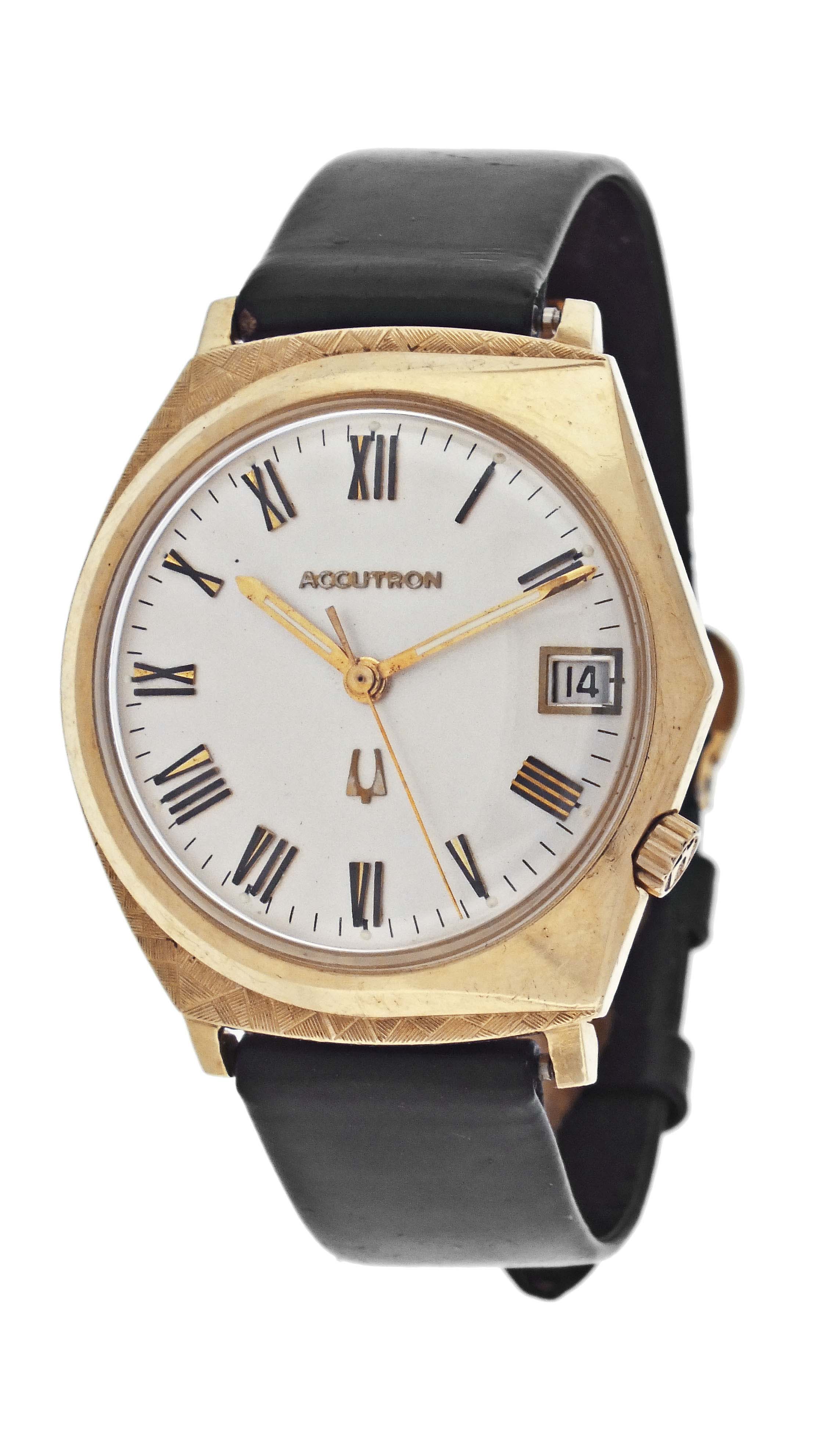 Bulova, New York, a mid 20th century gold Accutron wrist watch, 15 jewels, battery powered gilt plate cal. 2181 movement in an unusual 14 karat yellow gold case with textured and polished surfaces, roman numeral matte silver dial with date aperture at 3:00 and gold baton hands, serial #H24174, 43.3g TW