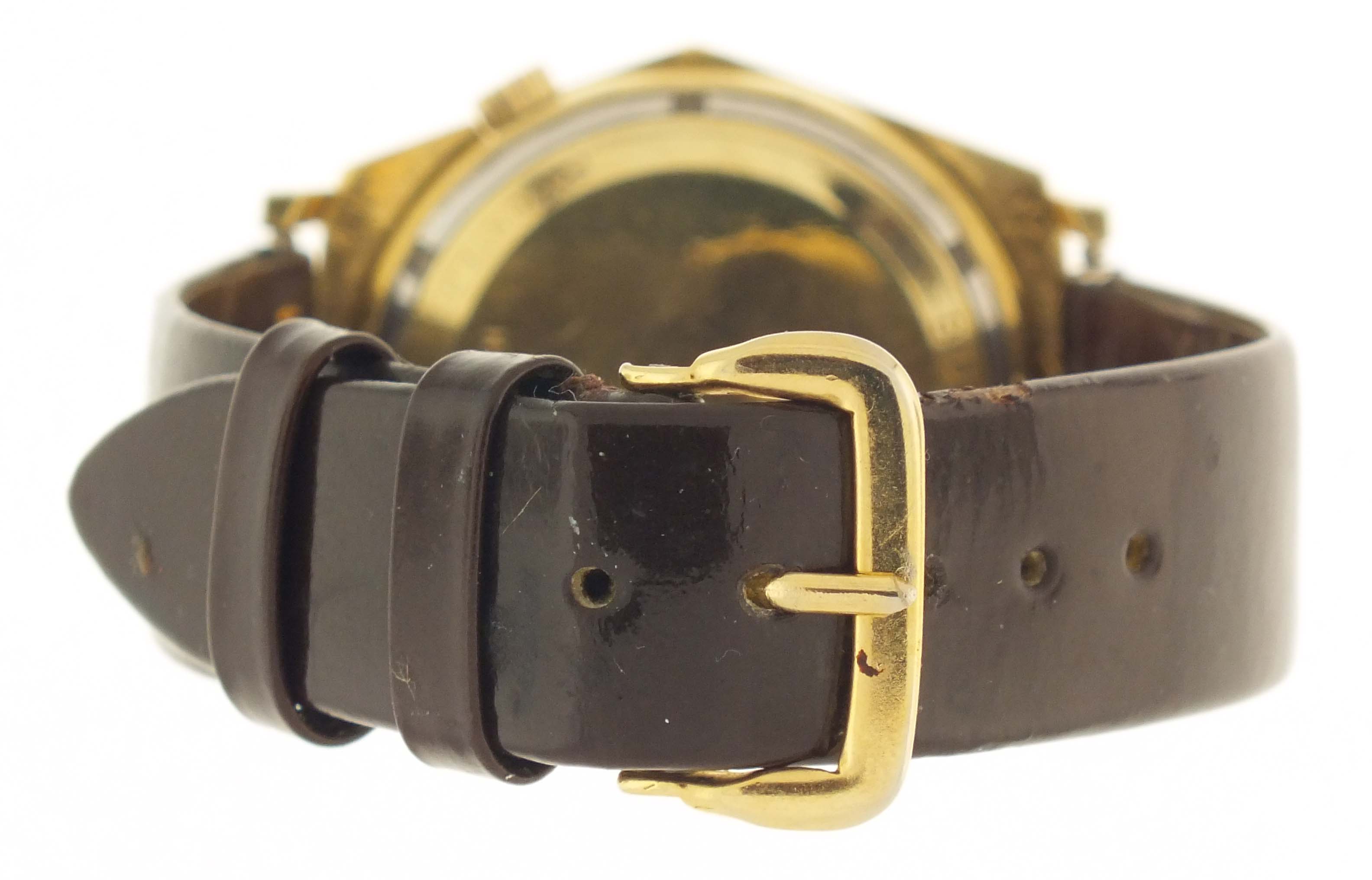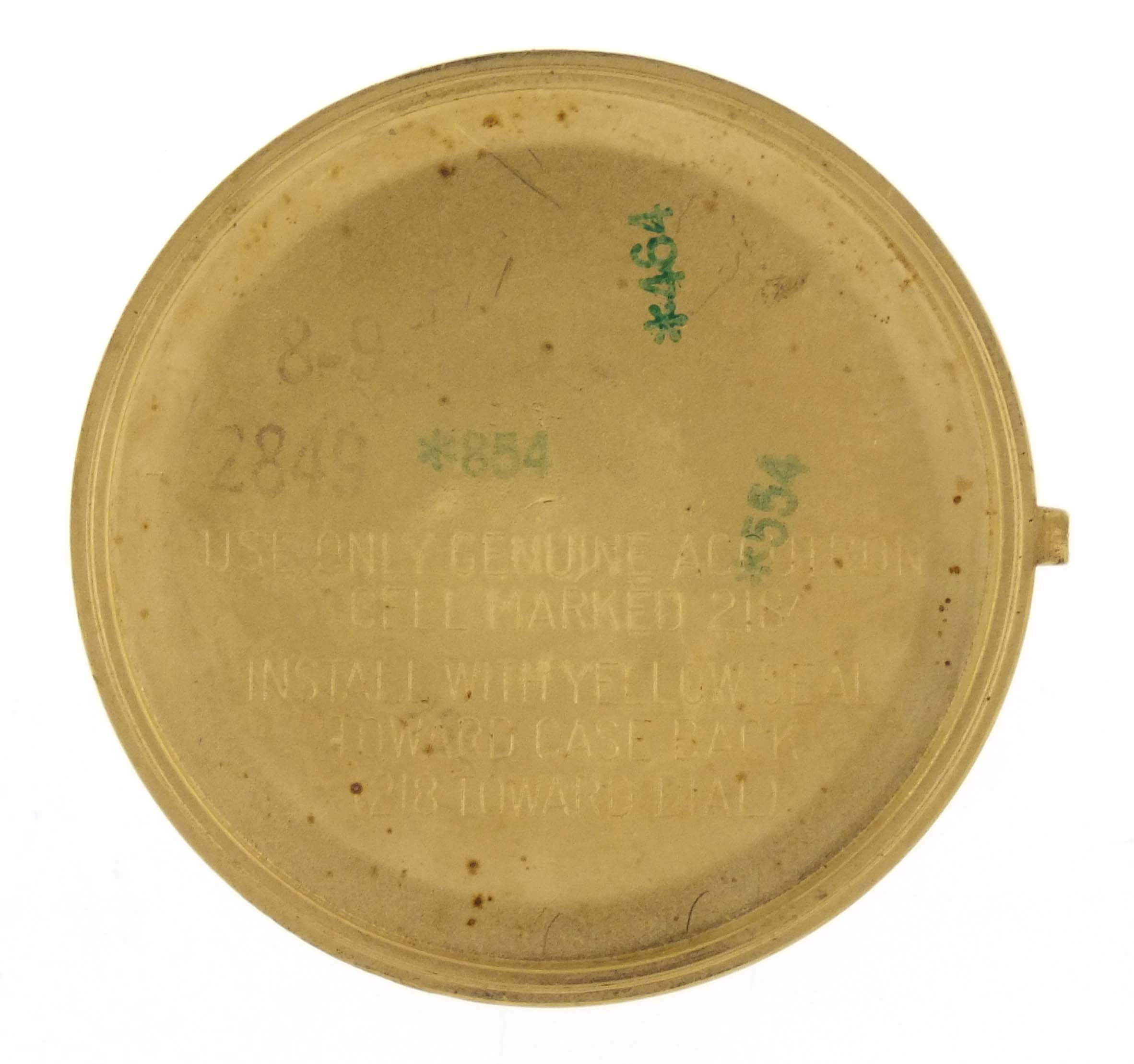 CASE: Dings and very fine scratches on outer surface of case; Underside of case with minor scratches; Lugs with bracelet wear; Case back with polished scratches and dents; Acrylic crystal; Precious metal content marked. DIAL: Very good. HANDS: Very good MOVEMENT PLATES: Very fine scratches on plate; A more significant scratch from the battery clamp screw to the opposite side of the plate; Some screw heads with minor marring. MOVEMENT FUNCTION: Running; Setting and date advance functional.