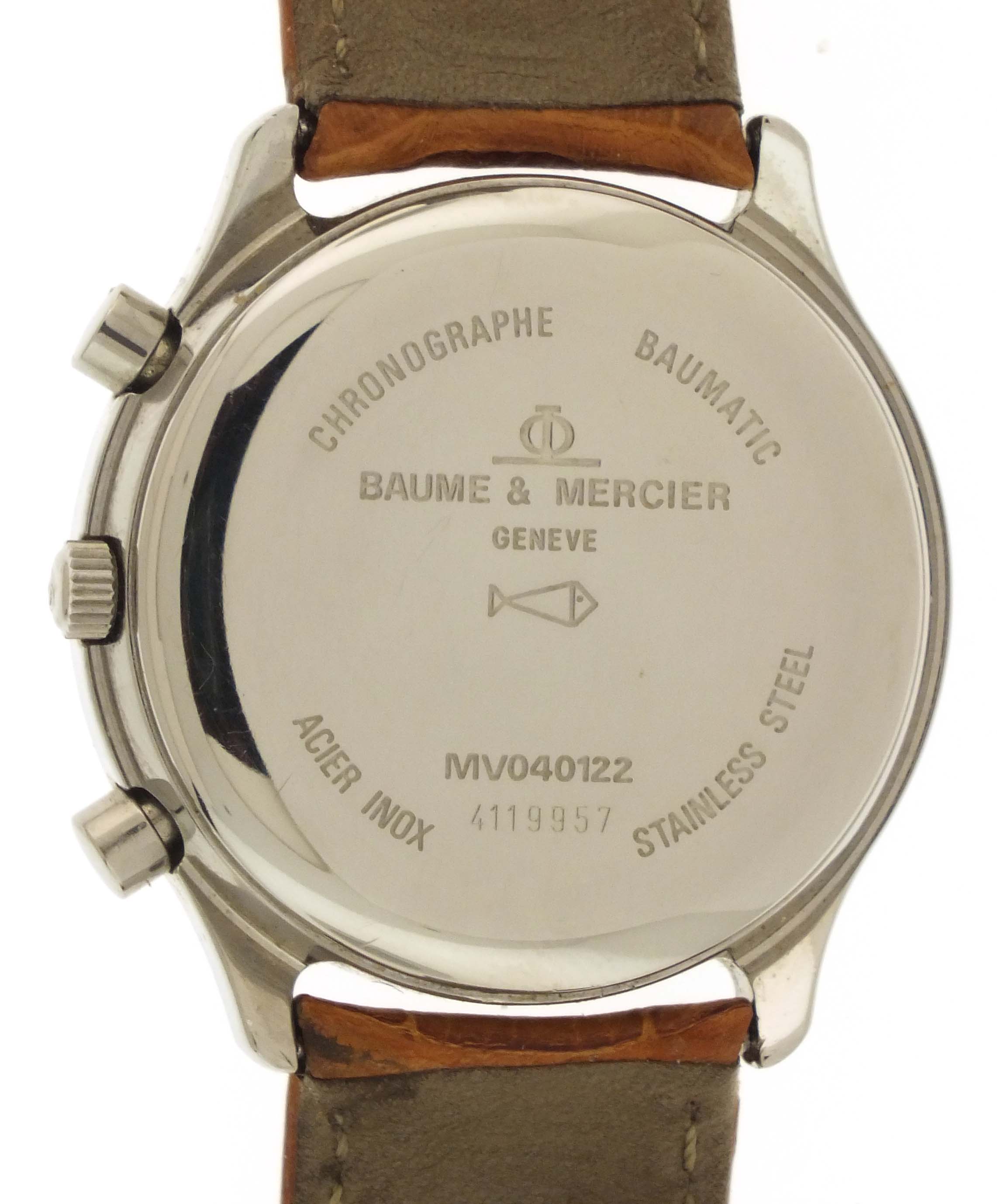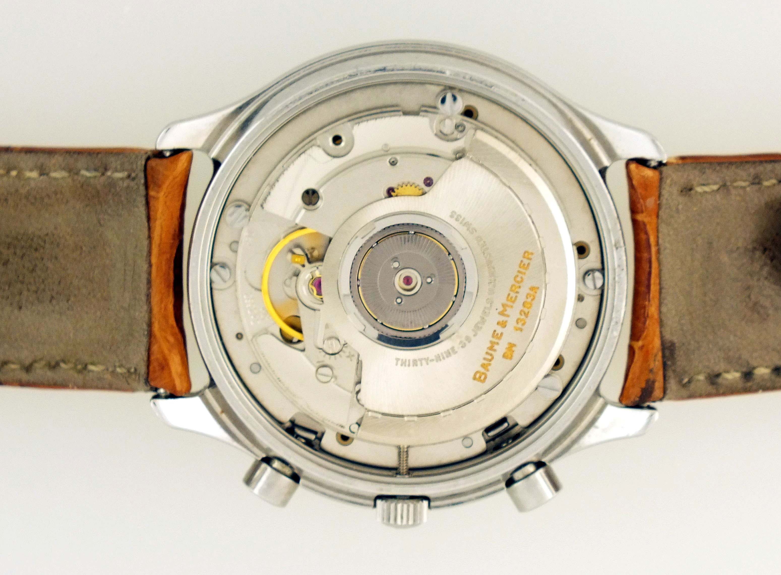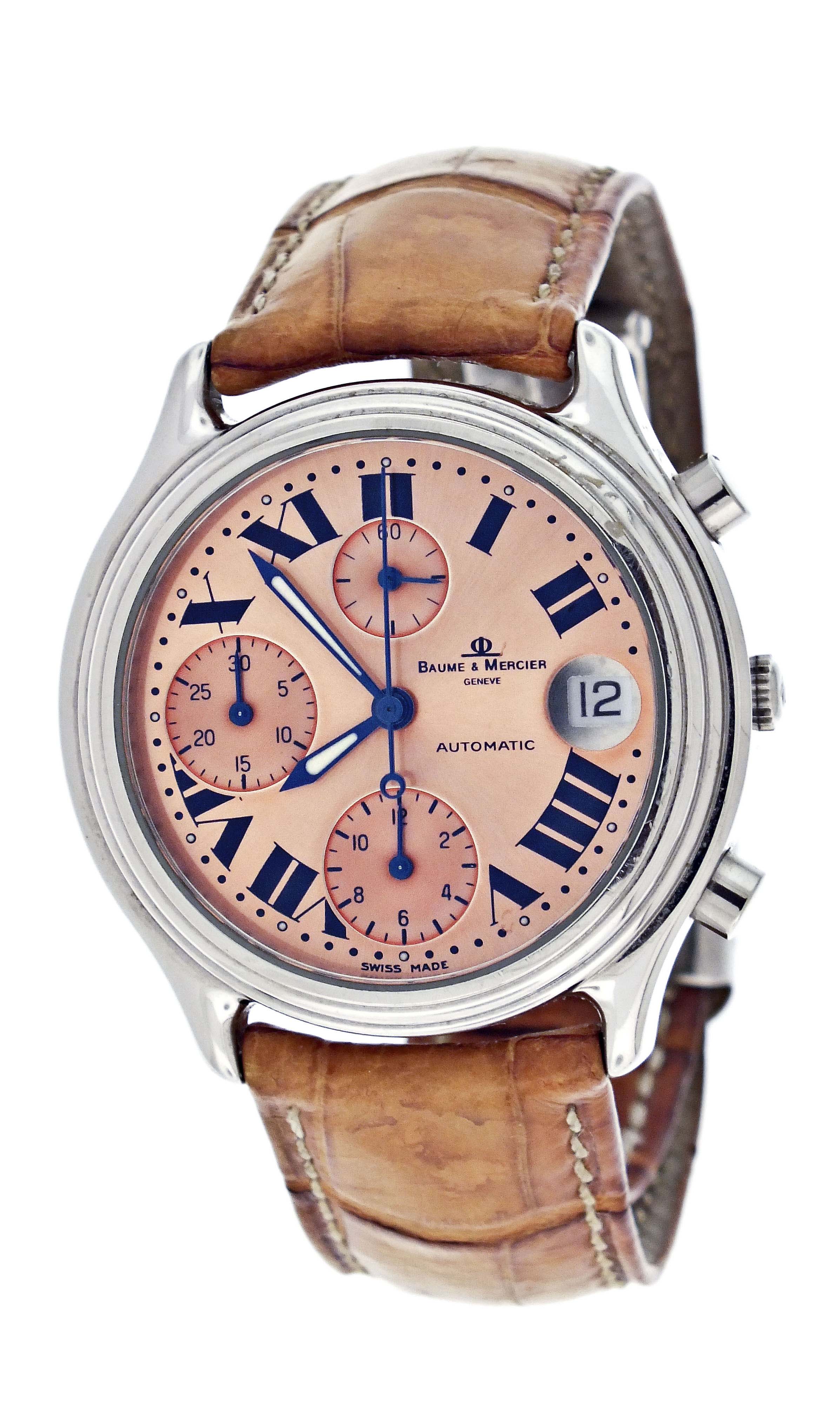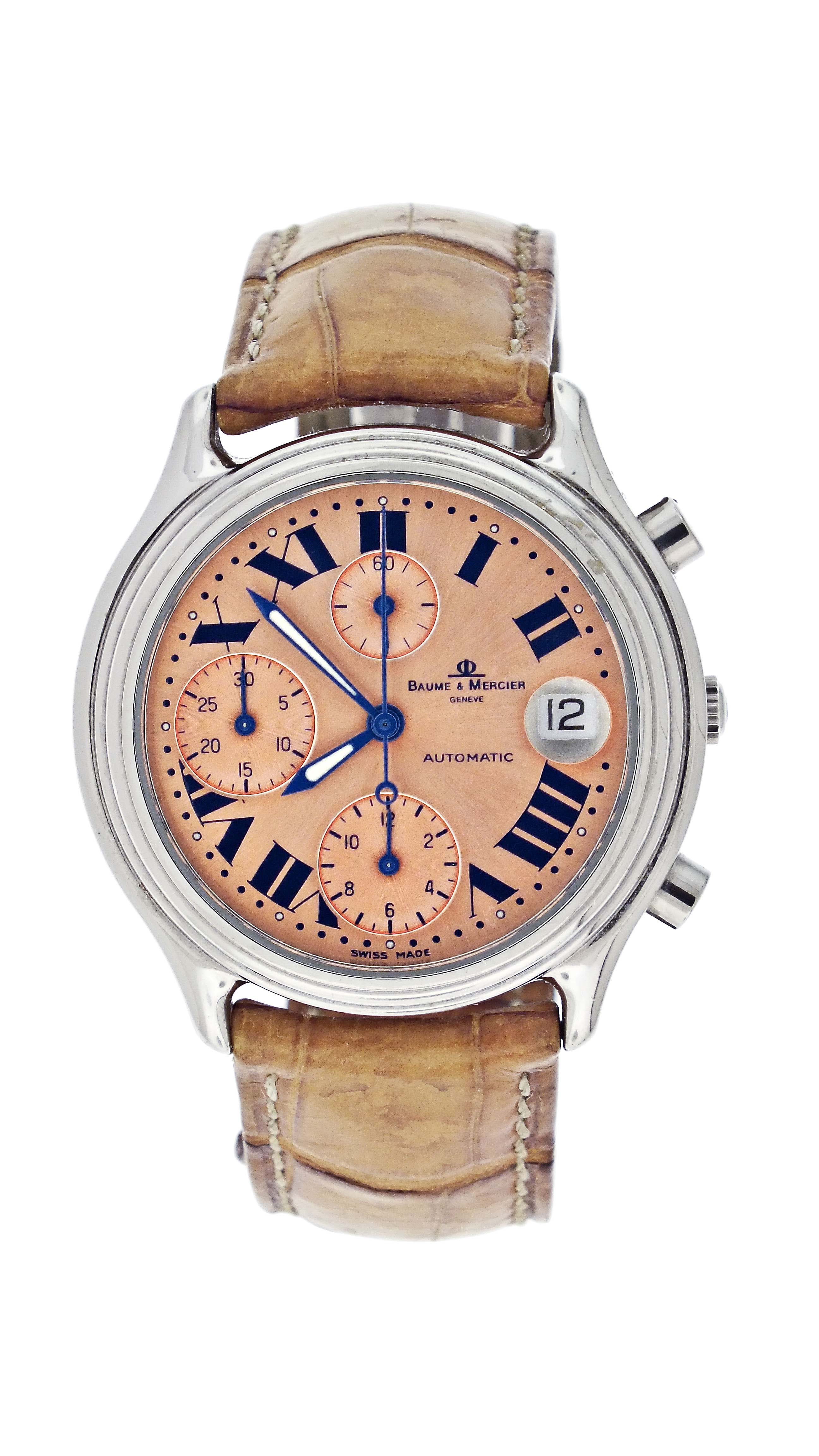 Baume & Mercier, Switzerland, a ref. MV040122 wrist chronograph, 39 jewels, automatic winding, rhodium plated ETA cal. 2892A2 movement with lever escapement in a round, stainless steel case with reptile strap and stainless clasp, roman numeral salmon sunburst dial with date aperture at 3:00, hour and minute registers, and constant seconds at 6, 9, and 12:00 respectively, with blued steel, luminous sword hands, serial #4119957, 36mm