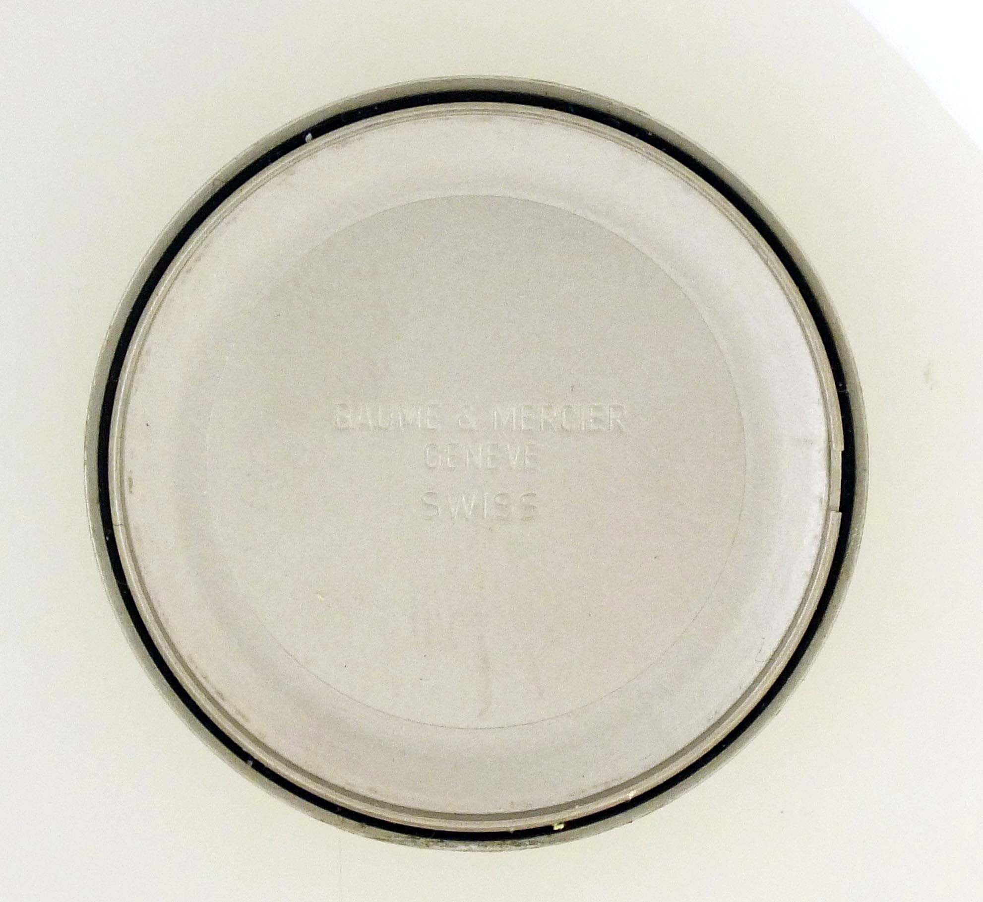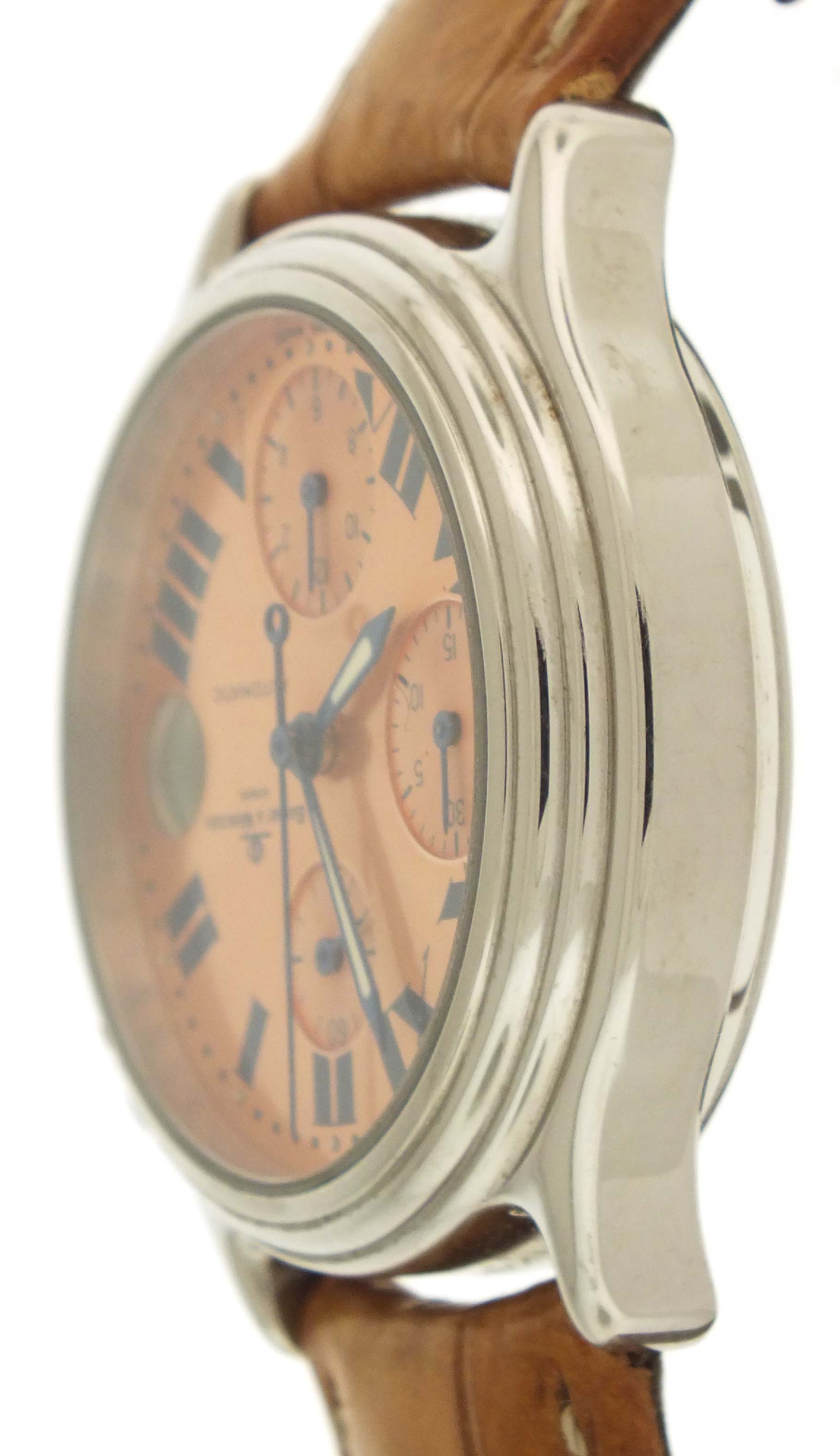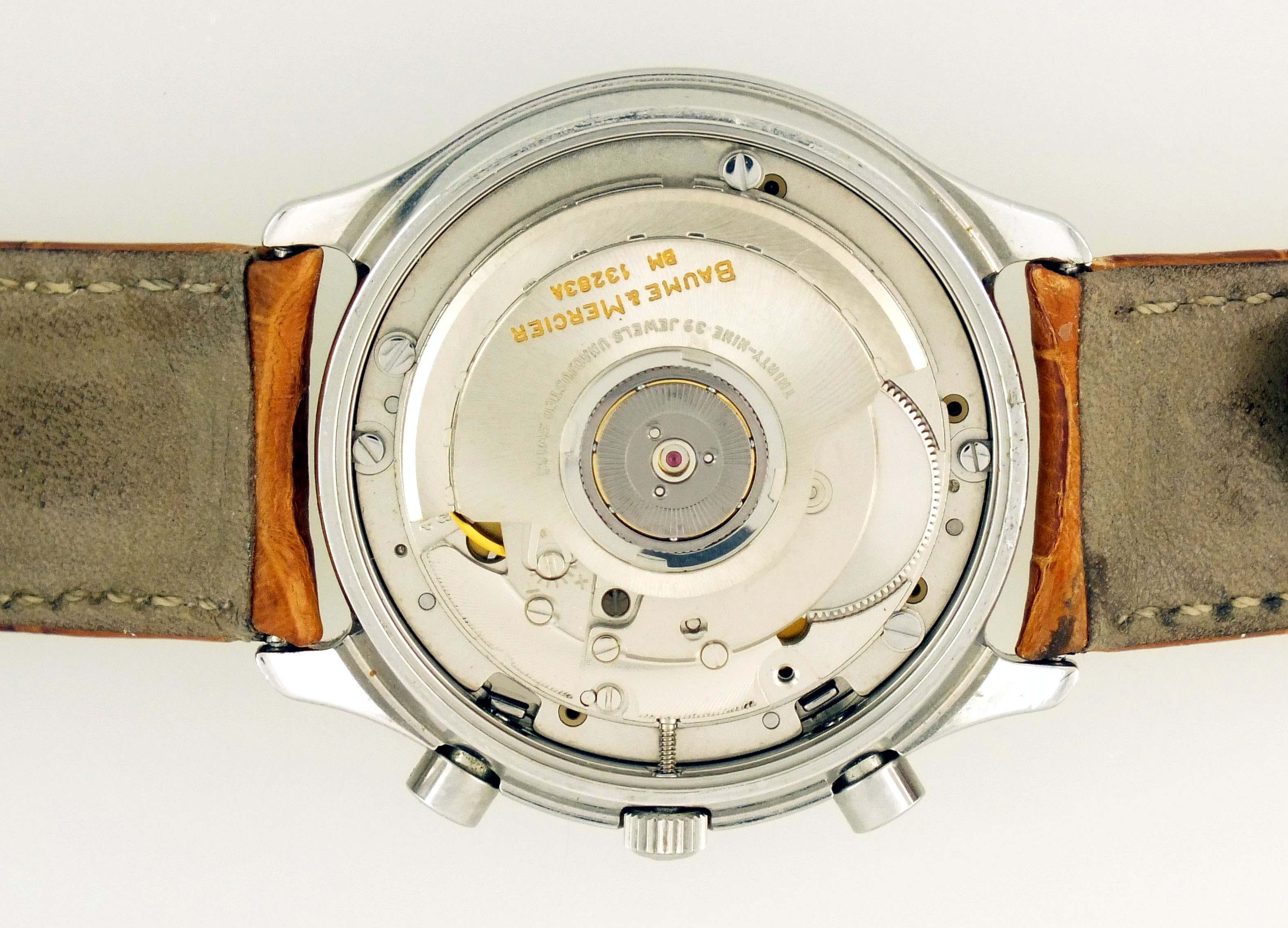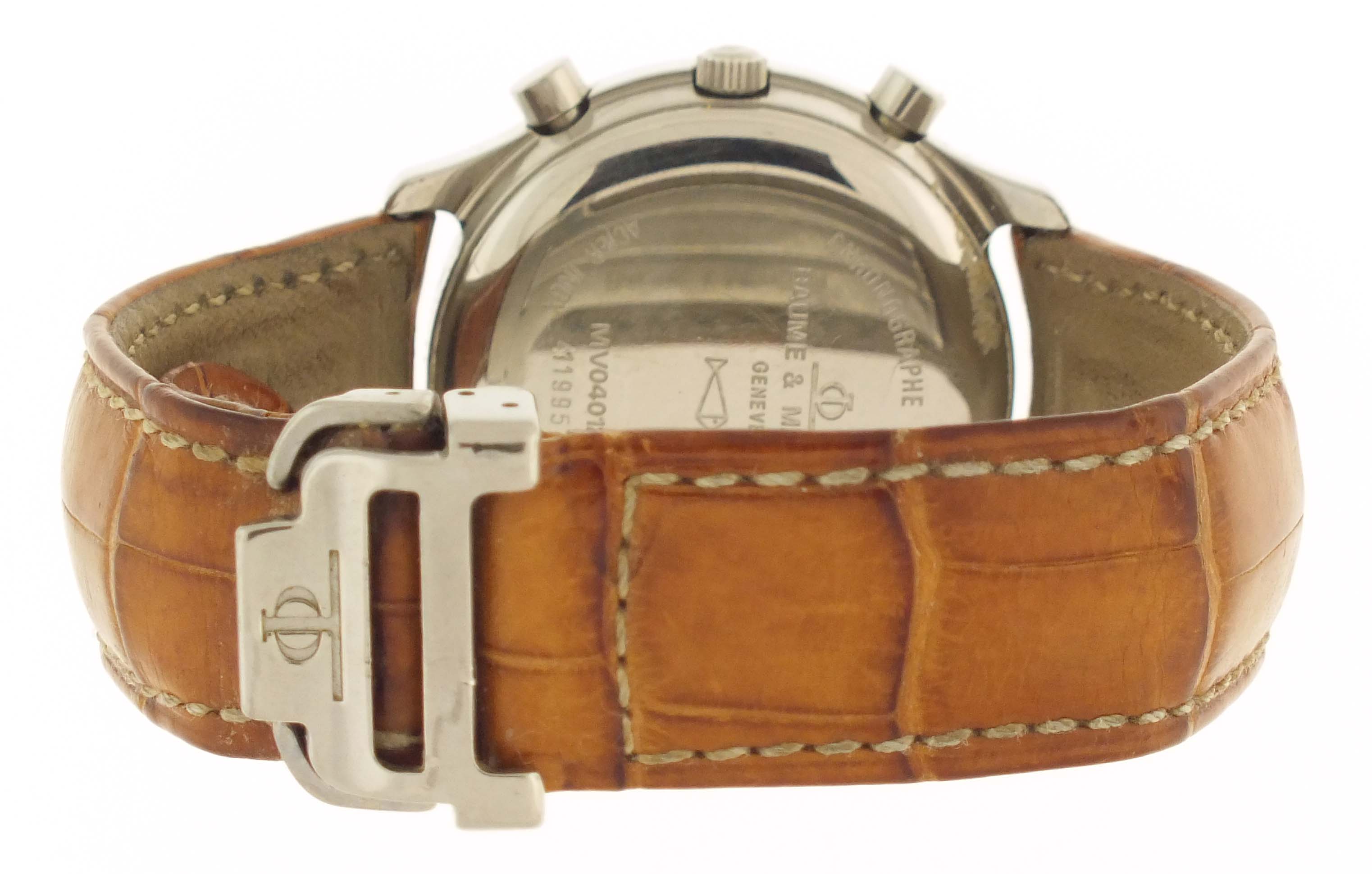 Baume & Mercier, Switzerland, a ref. MV040122 wrist chronograph, 39 jewels, automatic winding, rhodium plated ETA cal. 2892A2 movement with lever escapement in a round, stainless steel case with reptile strap and stainless clasp, roman numeral salmon sunburst dial with date aperture at 3:00, hour and minute registers, and constant seconds at 6, 9, and 12:00 respectively, with blued steel, luminous sword hands, serial #4119957, 36mm