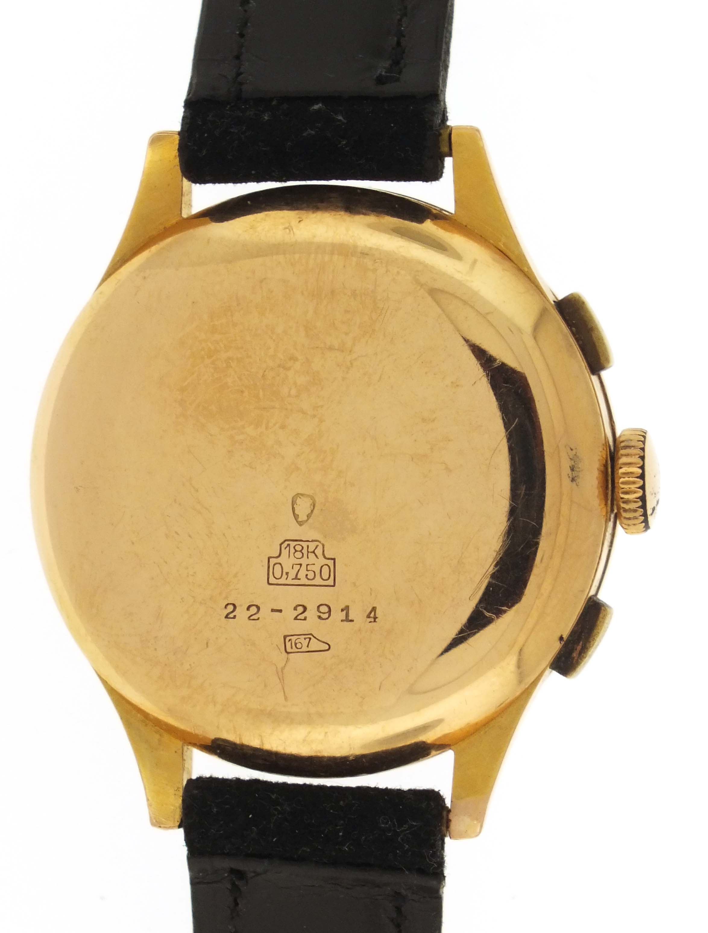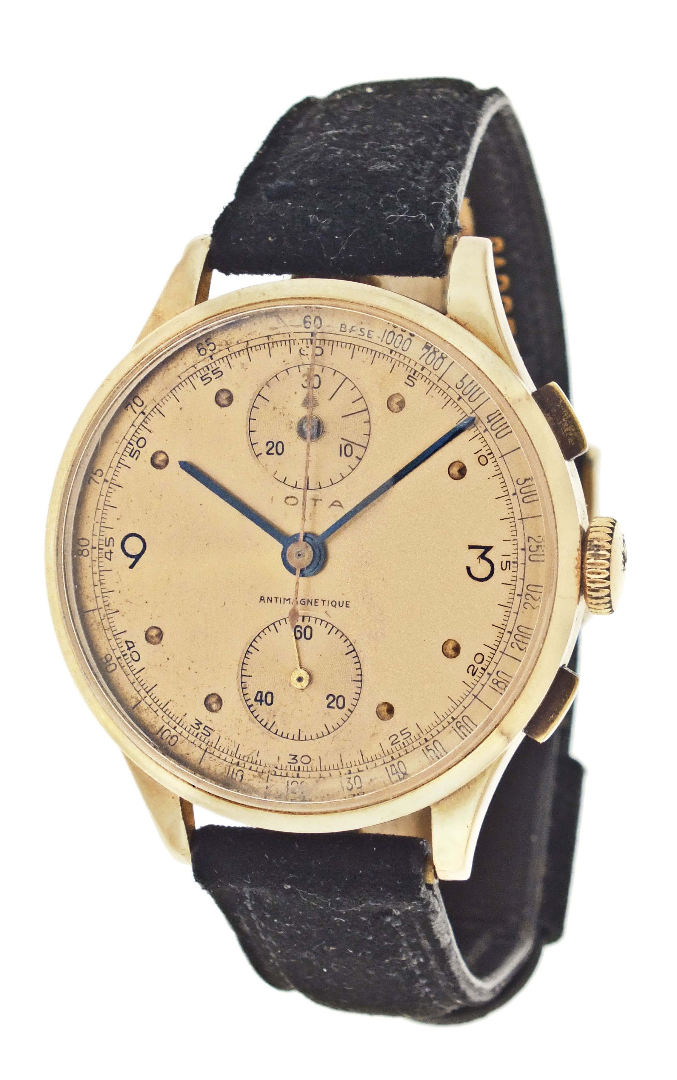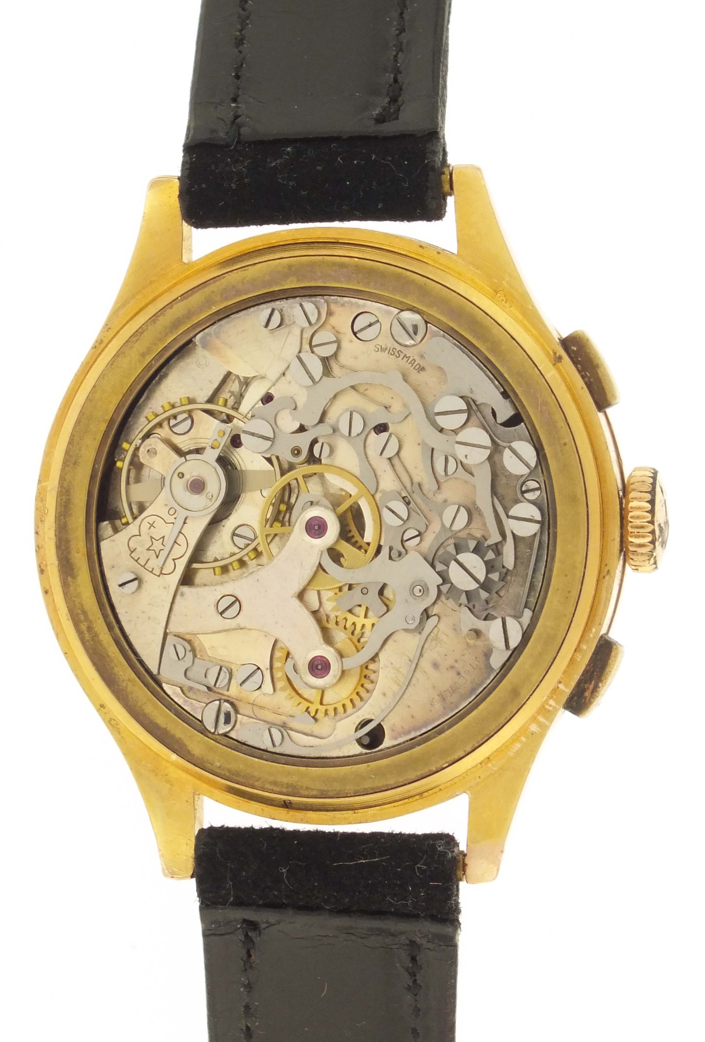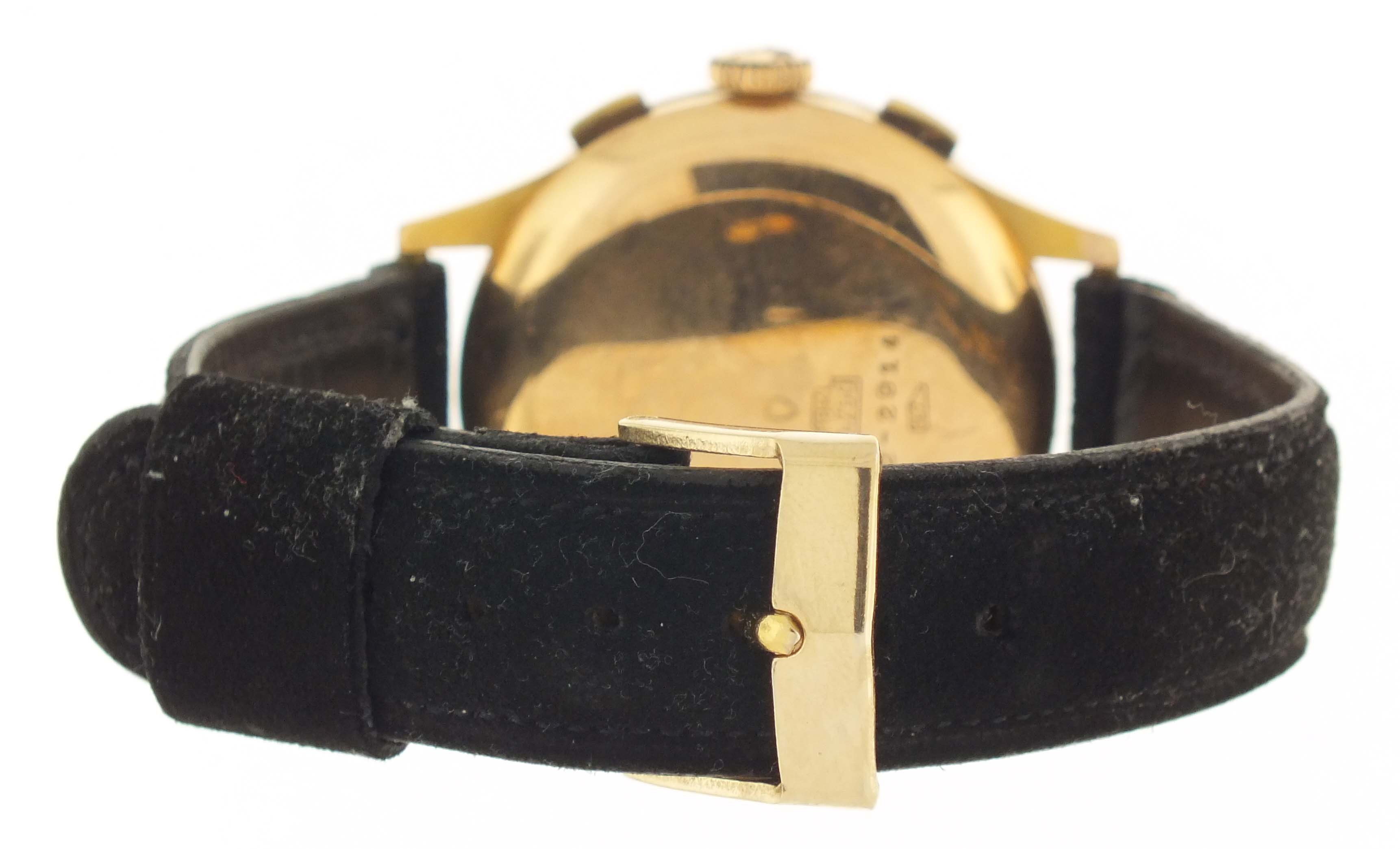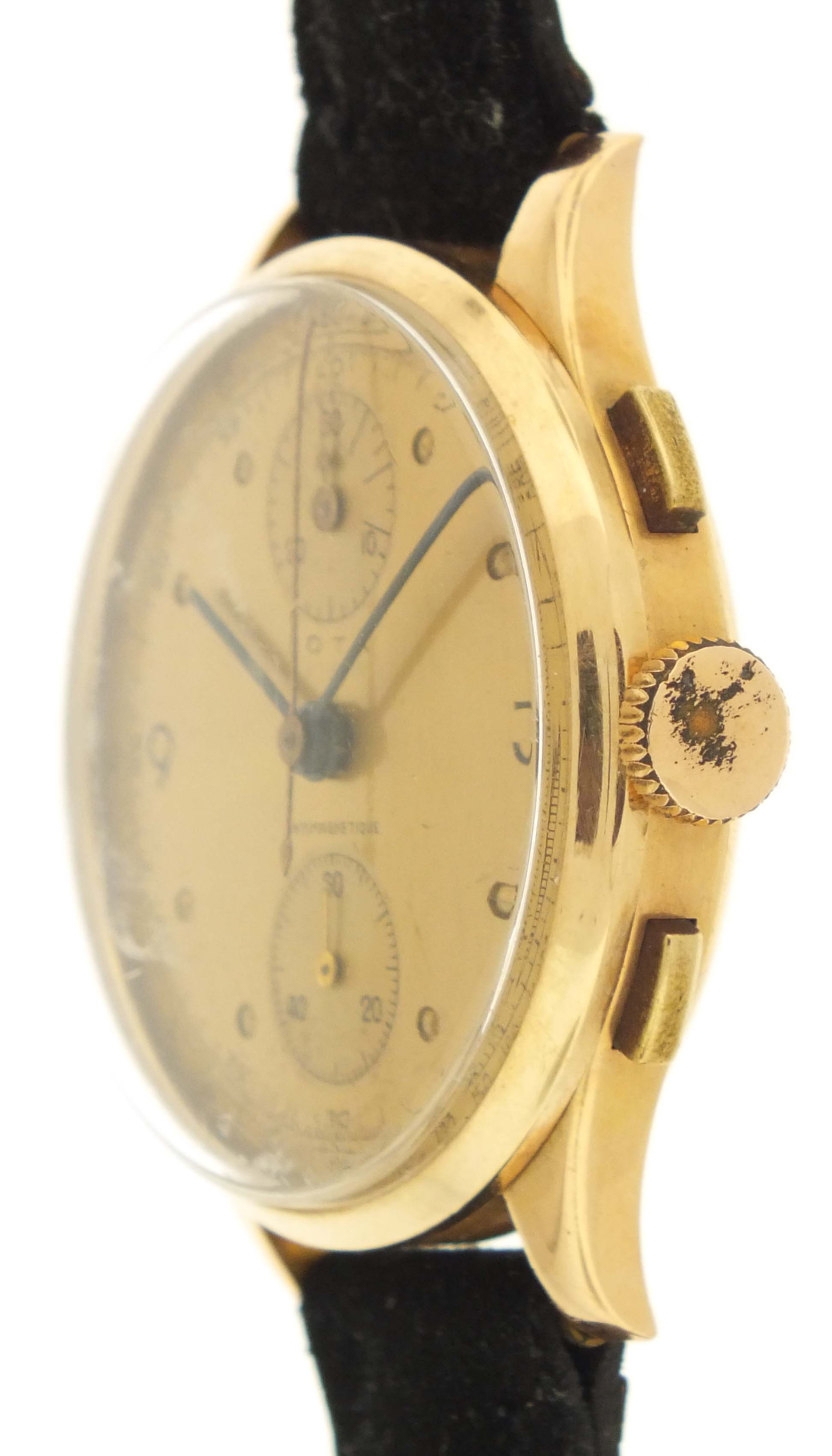 Switzerland, a mid 20th century gold wrist chronograph, 17 jewels, manual winding rhodium plated Venus cal. 170 movement with lever escapement in a round, 18 karat rose gold case with suede strap, dot and arabic numeral champagne dial with blued steel stick hands, 36mm, 43.6g TW