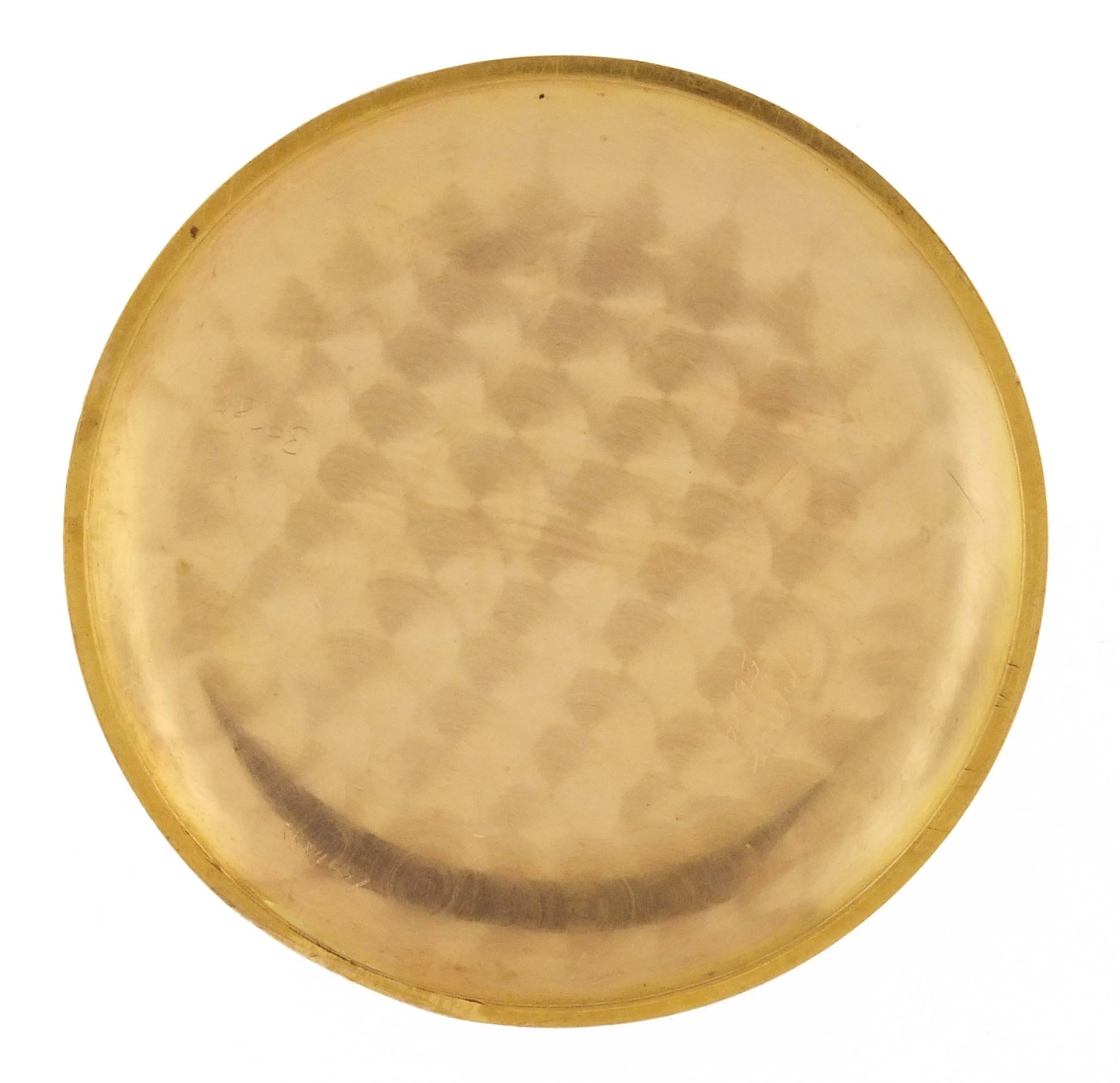 CASE: Very fine scratches on outer surface of case; A few scratches between lugs at 12:00; Back with fine scratches and a few dings; 9:00 side of case with dents; Back with tiny dent; Pushers with losses to plating; Crown shell worn through; Strap good; Acrylic crystal; Precious metal content marked. DIAL: Minor losses to printing at edge; Minor spotting and losses to lacquer; A few fine scratches. HANDS: Specks of oxide. MOVEMENT PLATES: Very fine scratches on plate; Cluster of fine scratches under hammer spring; Minor discoloration to plating. MOVEMENT FUNCTION: Running order (winds, sets and ticks). COMPLICATION: Functions properly.