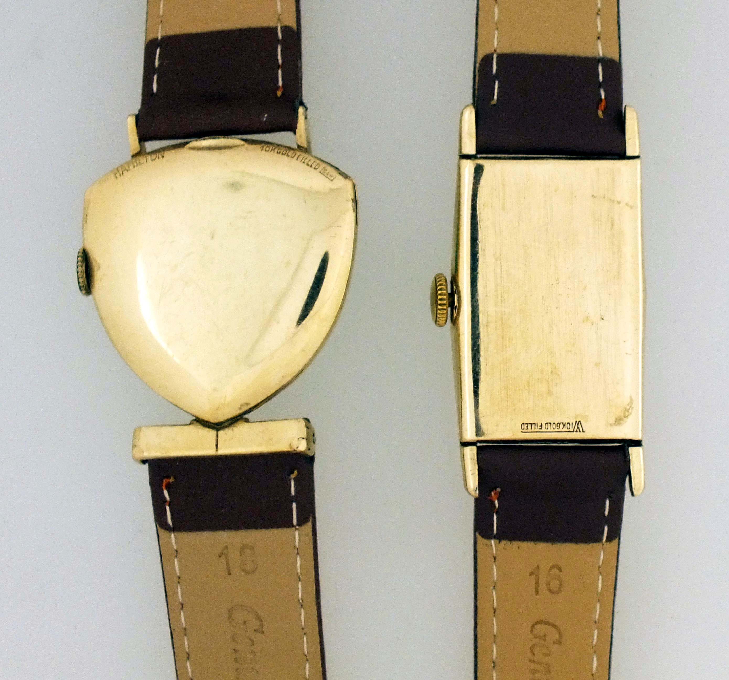 2 (Two) Hamilton wrist watches, manual winding, including a "Thor", cal. 770, 23 jewel, in a modified triangular shaped gold filled case, and a "Seckron," doctor's watch, cal. 980B, split dial for minutes and seconds, 17 jewel, in a gold filled case