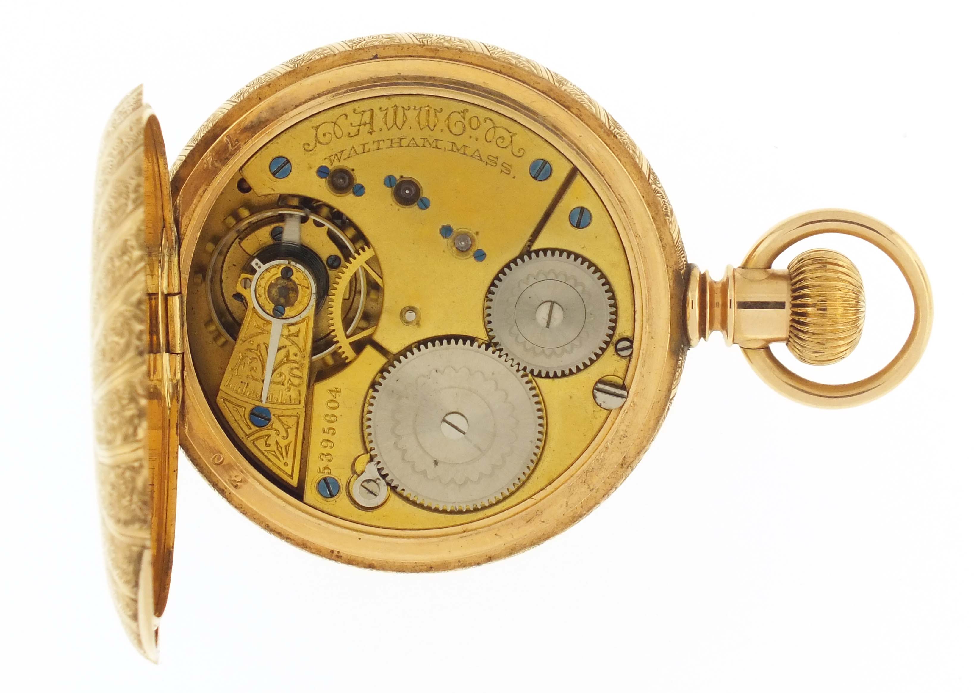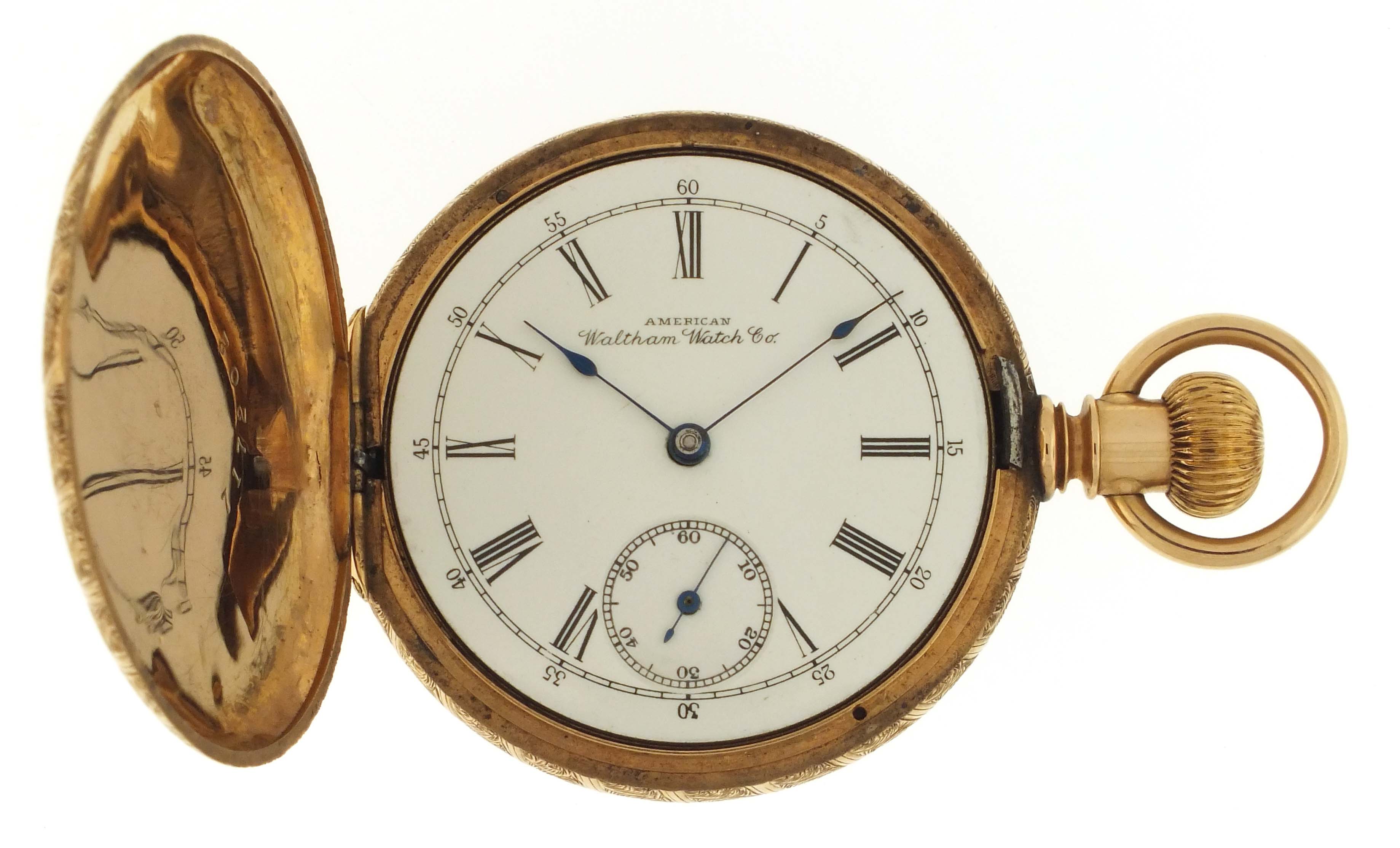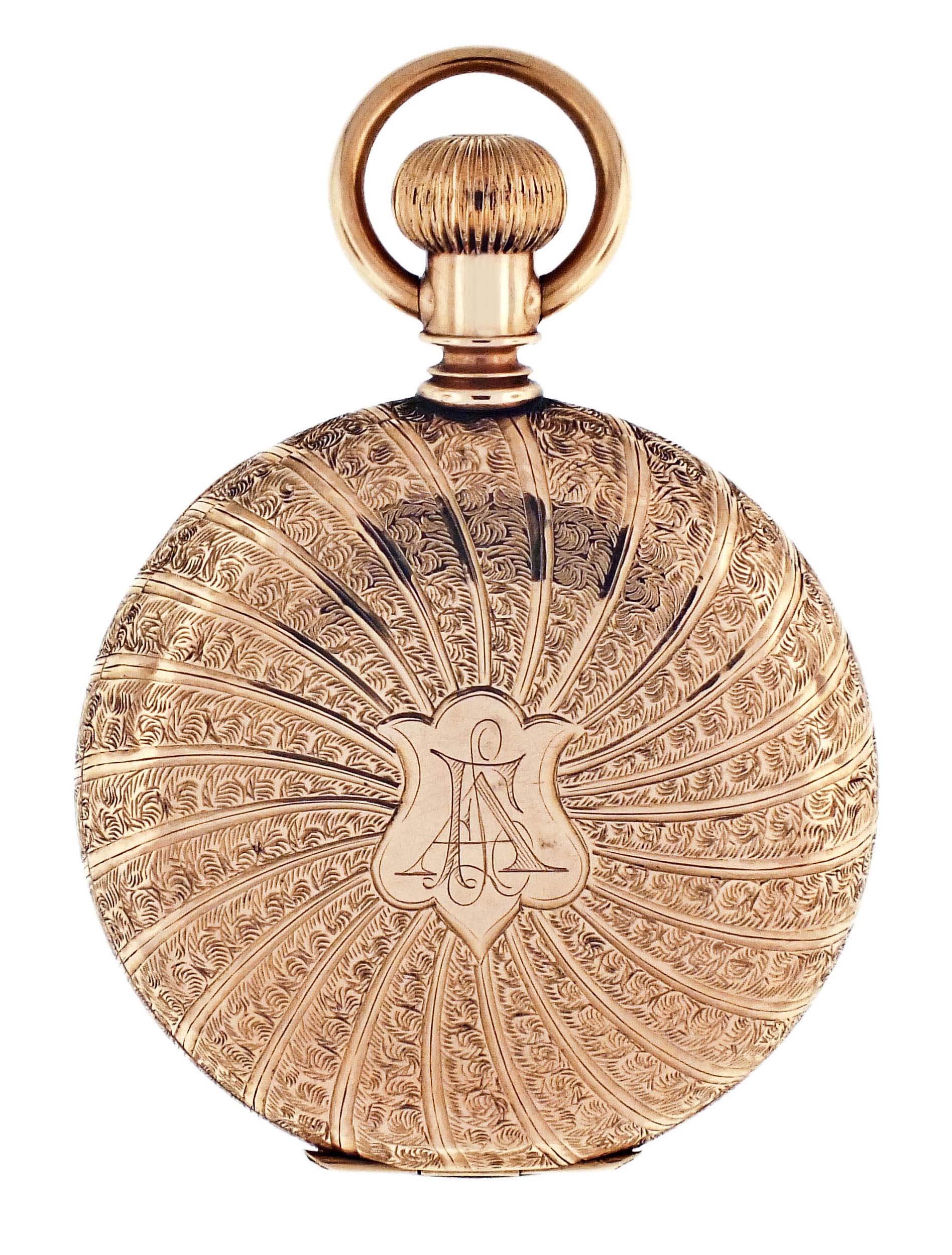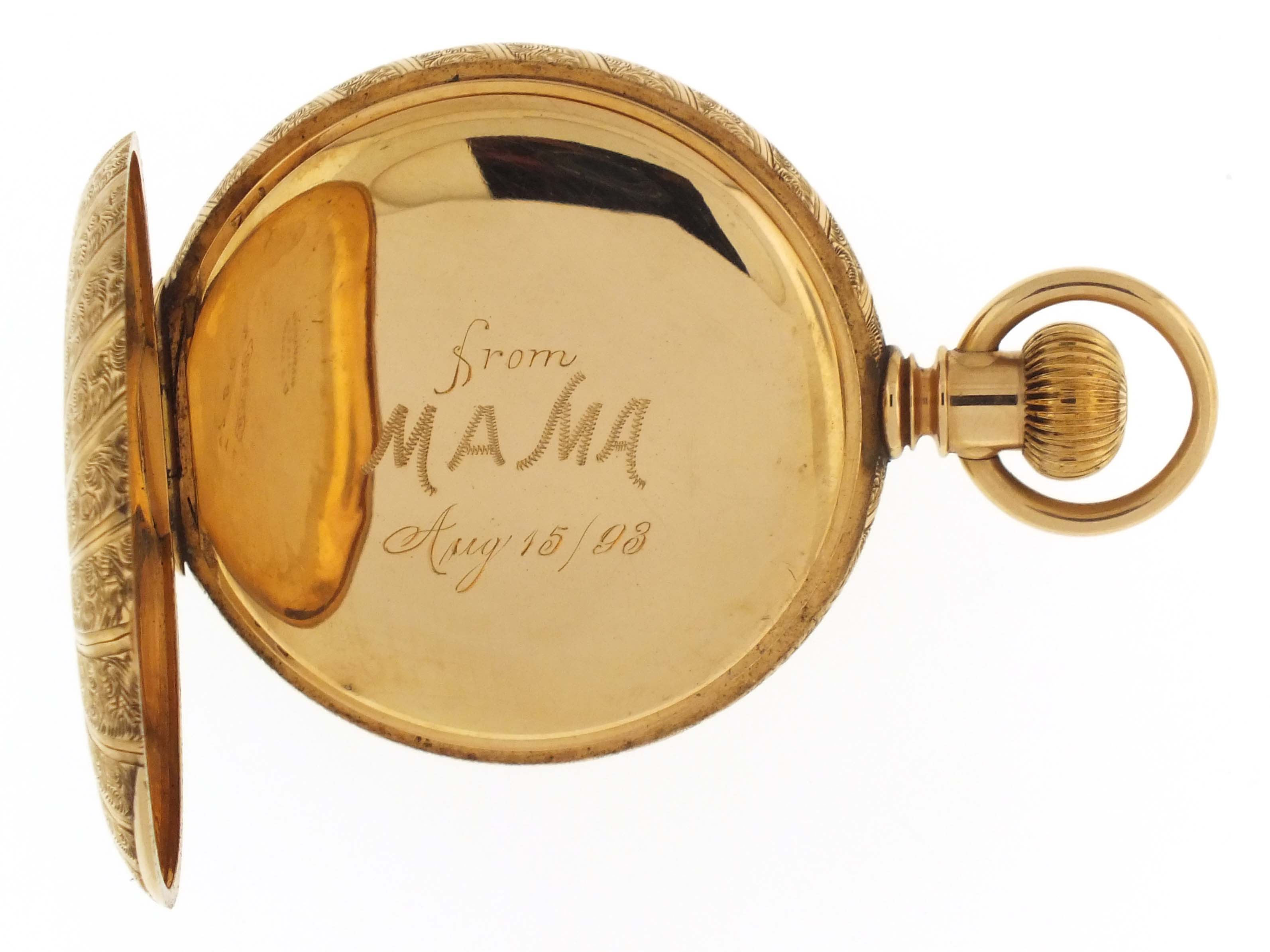 American Waltham Watch Co., Waltham, Mass., a late 19th century model 1888 pocket watch, 16 size, 11 jewels, stem wind and set gilt plate movement with lever escapement and cut bimetallic balance in a 14 karat yellow gold engraved hunting case with engraved cipher on front cover, and dedication on cuvette, roman numeral, outer black five minute markers, single sunk white enamel dial with blued steel spade hands, serial #5395604, 116.6g TW