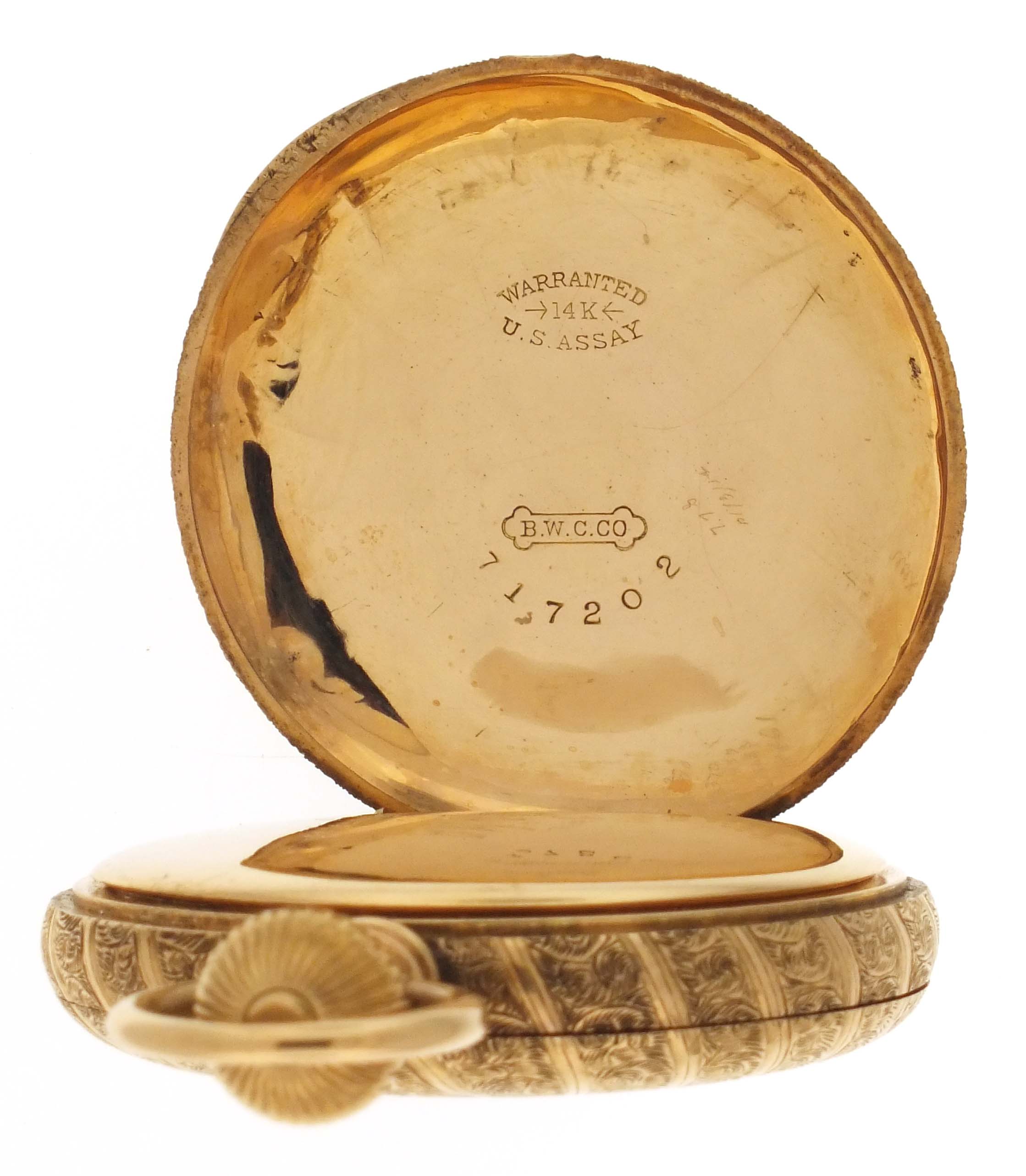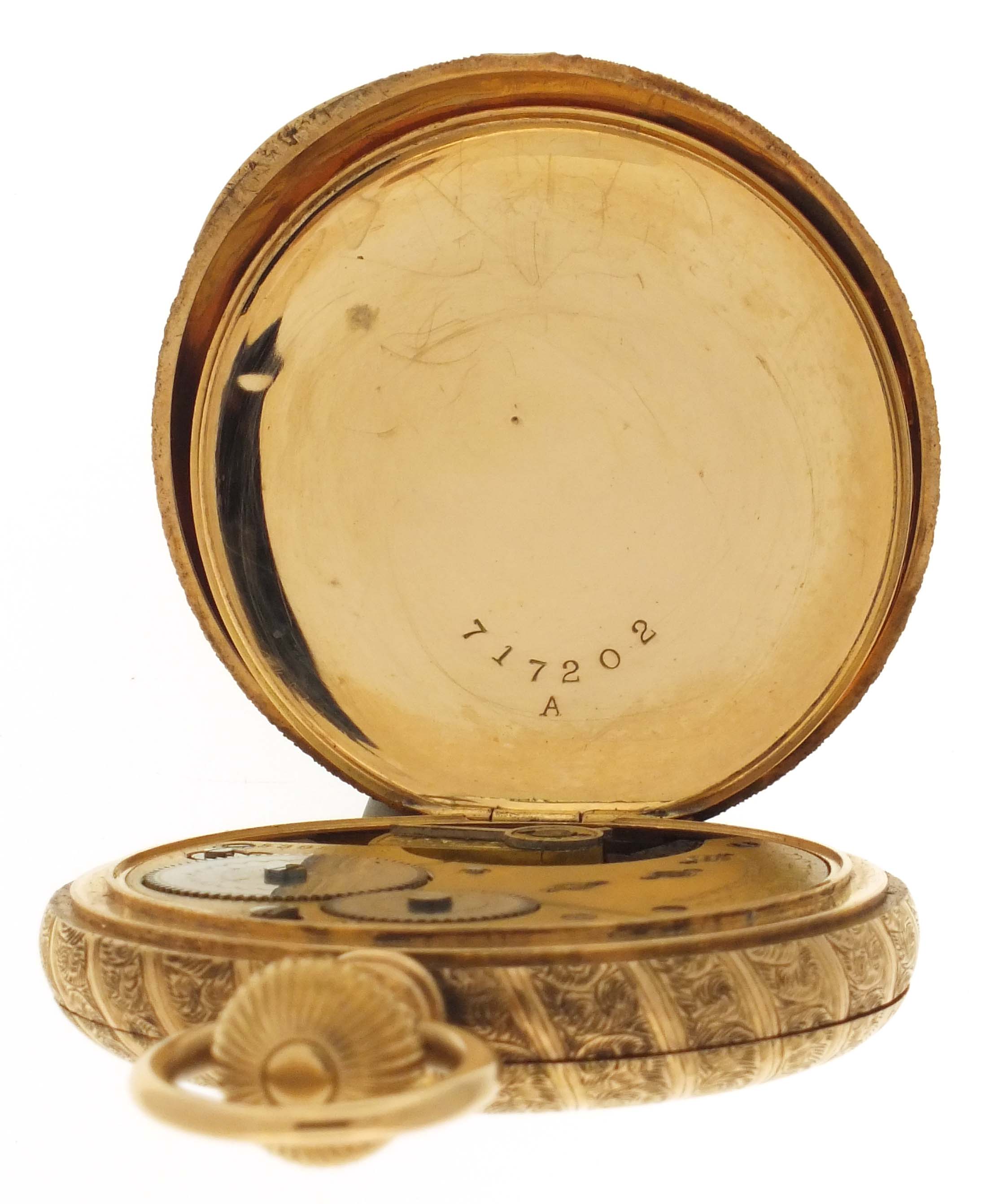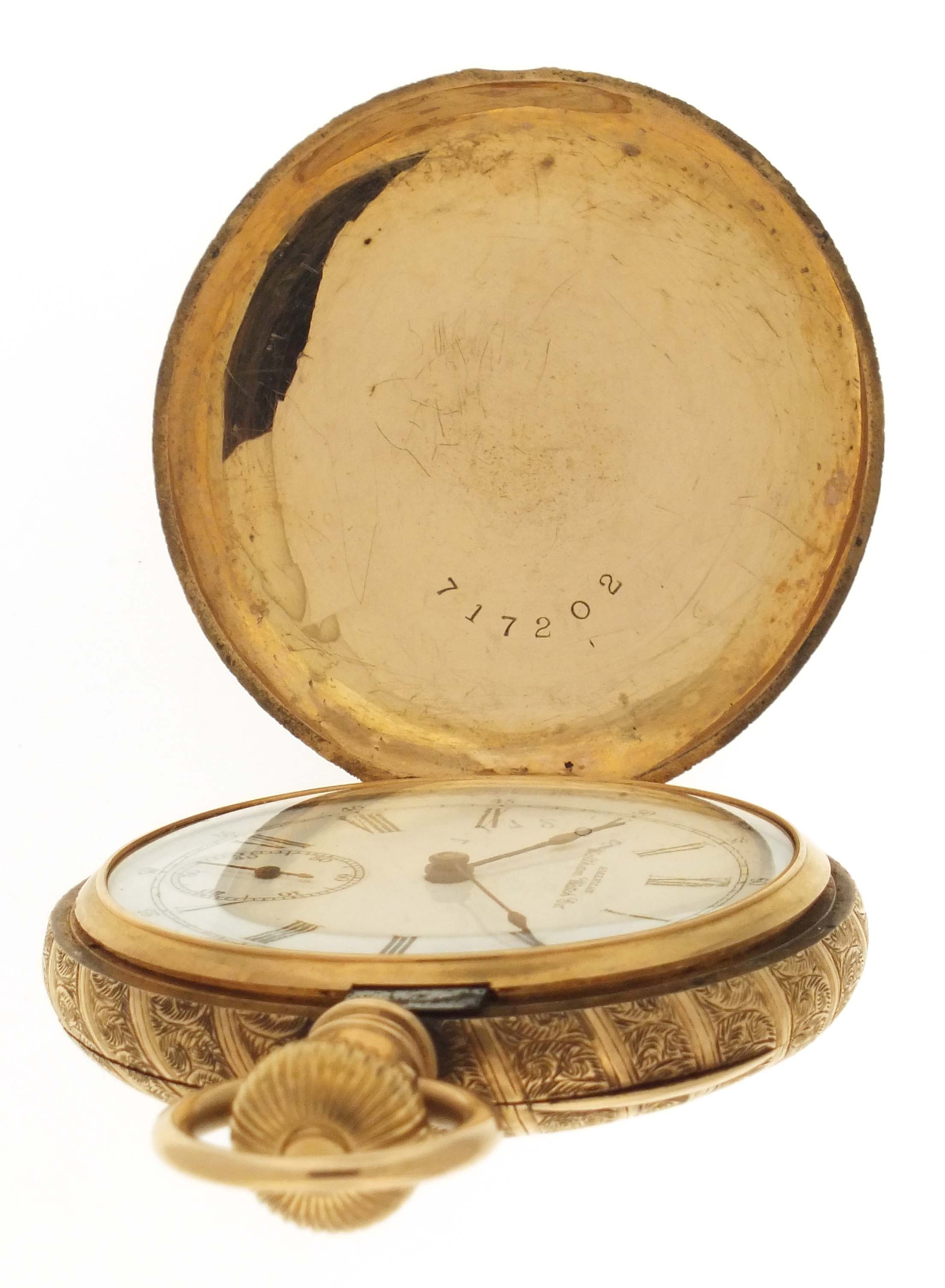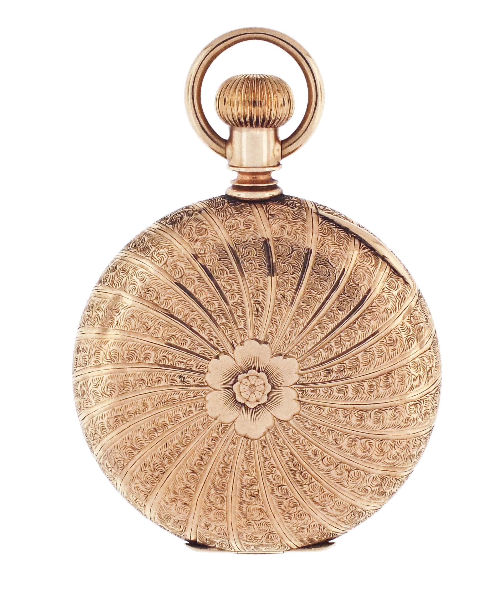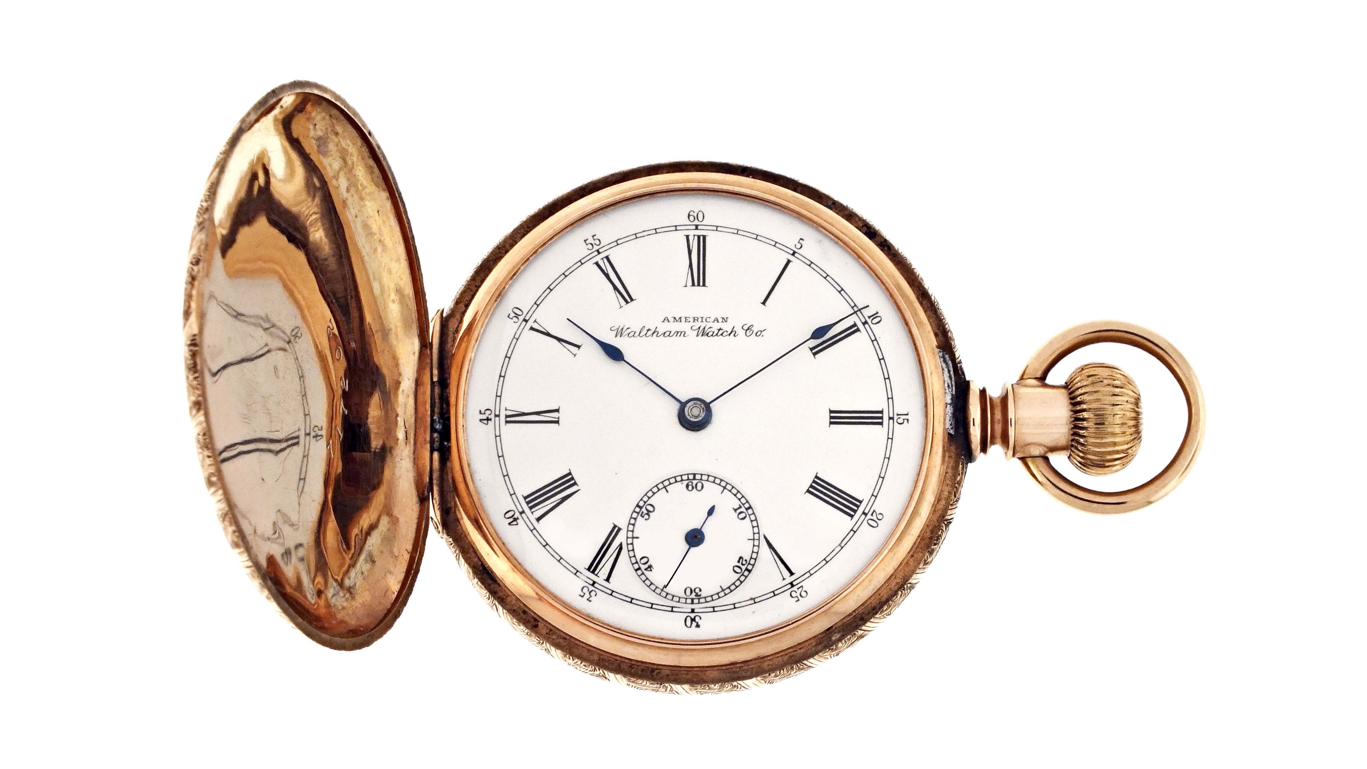 American Waltham Watch Co., Waltham, Mass., a late 19th century model 1888 pocket watch, 16 size, 11 jewels, stem wind and set gilt plate movement with lever escapement and cut bimetallic balance in a 14 karat yellow gold engraved hunting case with engraved cipher on front cover, and dedication on cuvette, roman numeral, outer black five minute markers, single sunk white enamel dial with blued steel spade hands, serial #5395604, 116.6g TW
