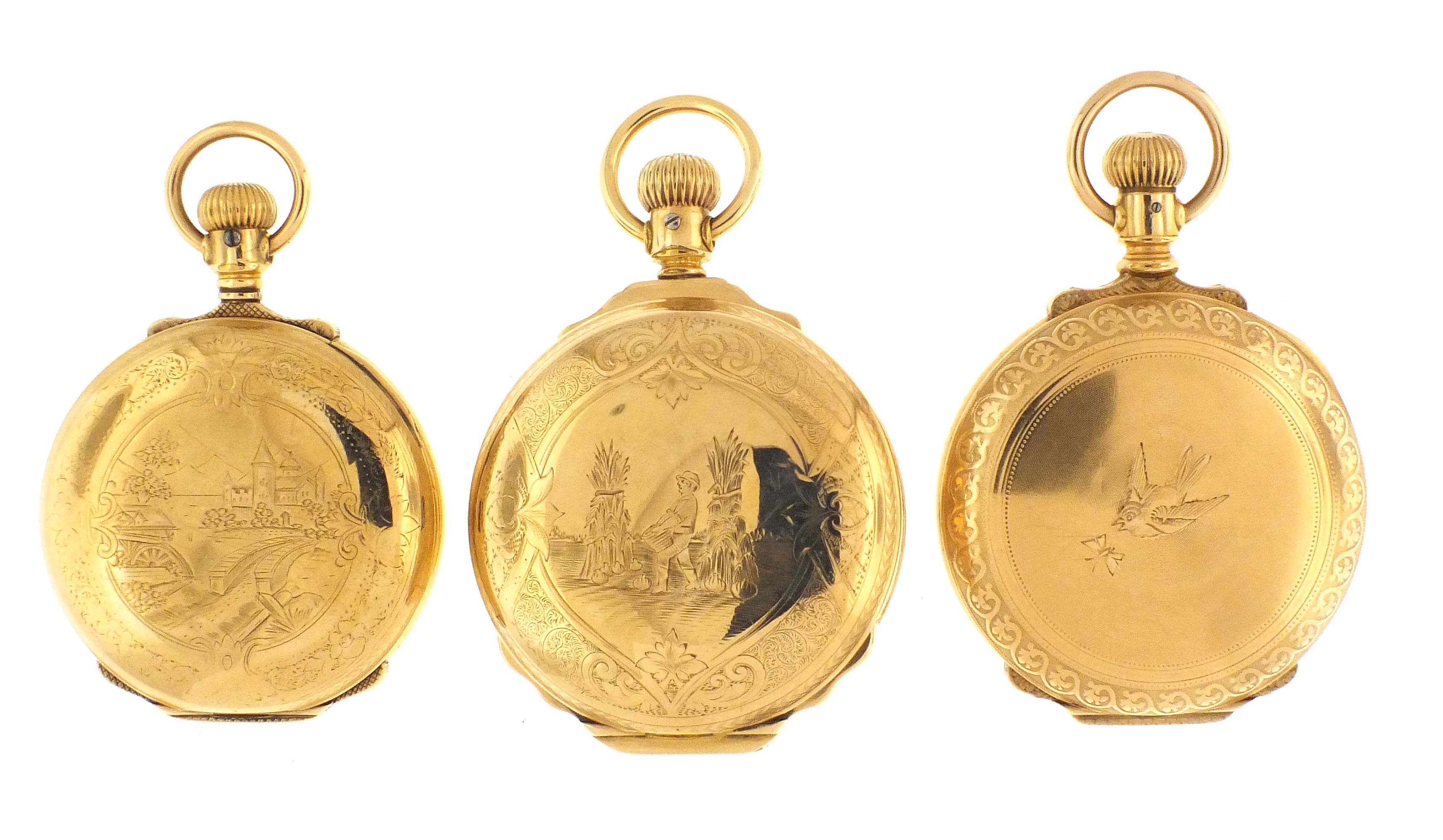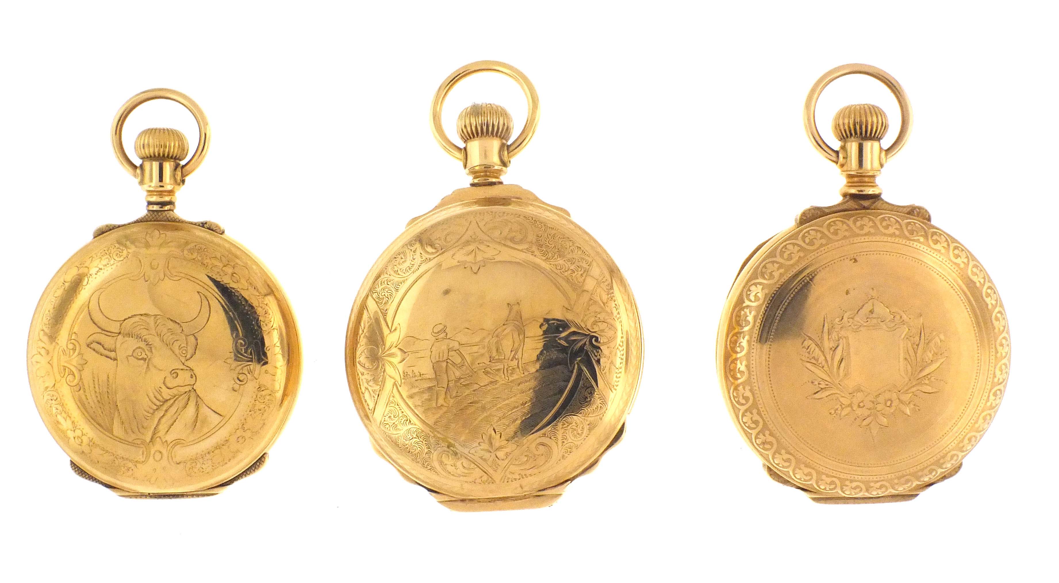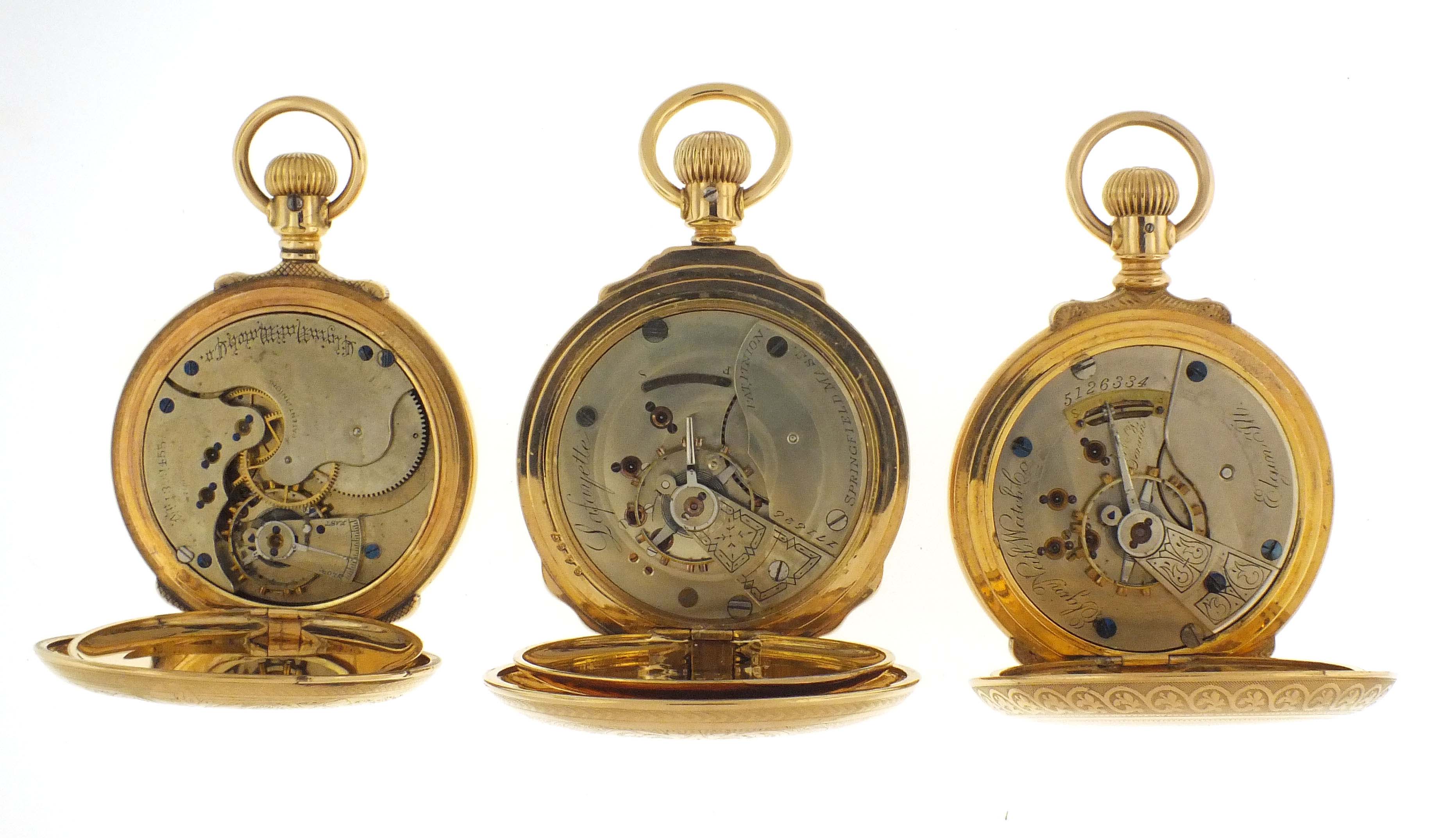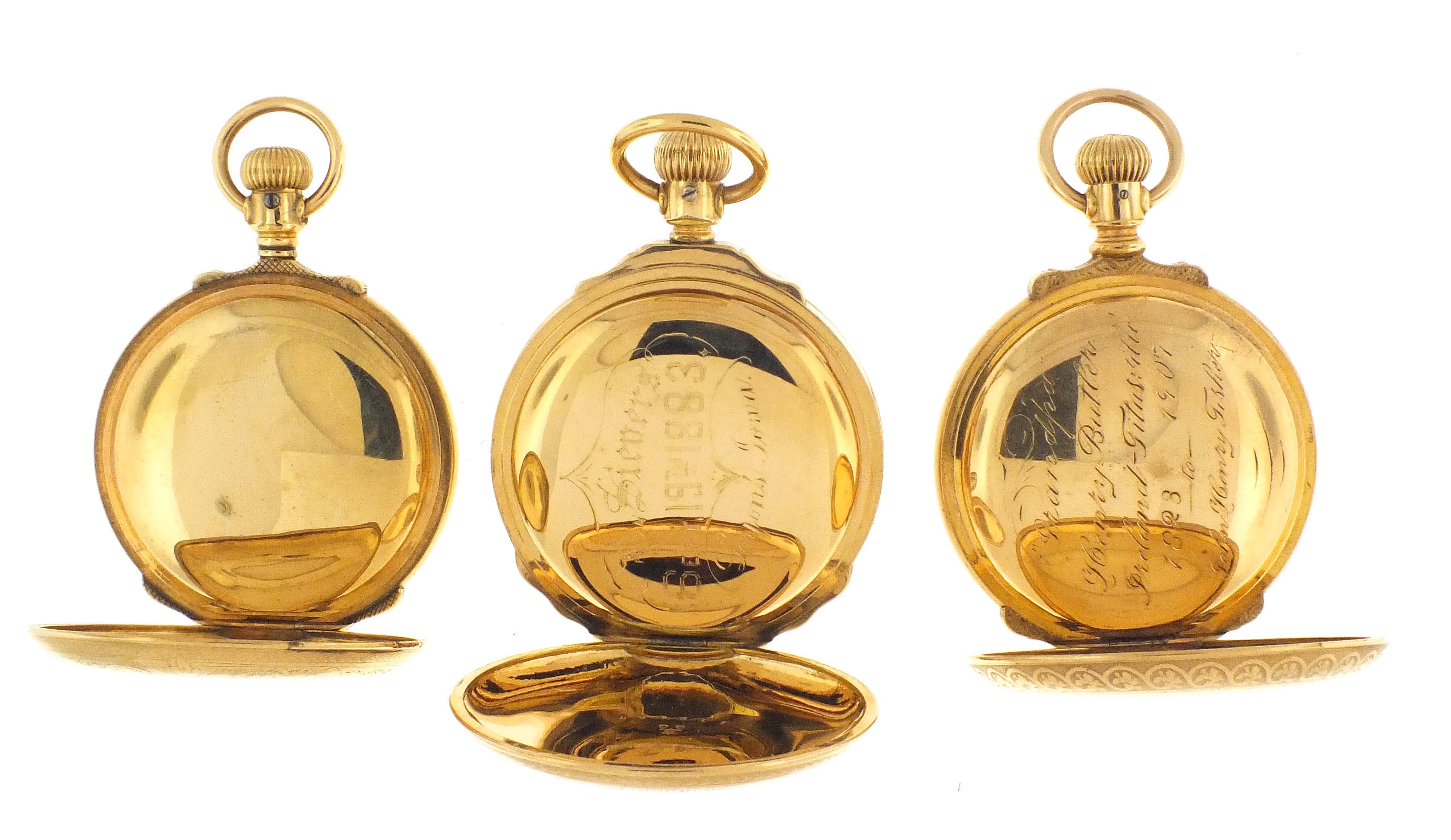 3 (Three) pocket watches with multicolor O'Hara style dials including an Elgin 18 size, grade 103, 15 jewel movement in gold filled hunting case, serial #5126334, an Elgin 16 size, grade 4, 15 jewel movement in gold filled hunting case, serial #1399455, and a Hampden, grade Lafeyette, 11 jewel movement in gold filled hunting case, serial #171526