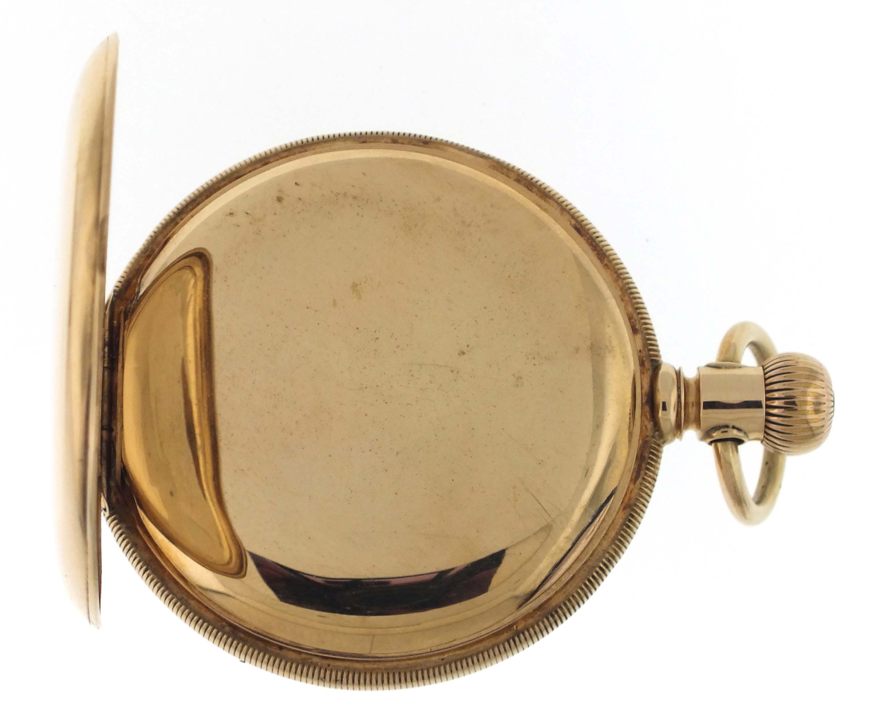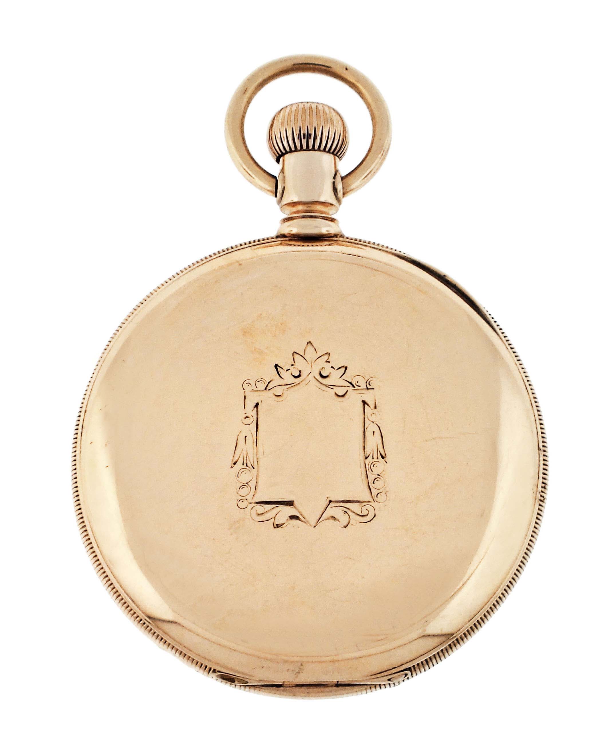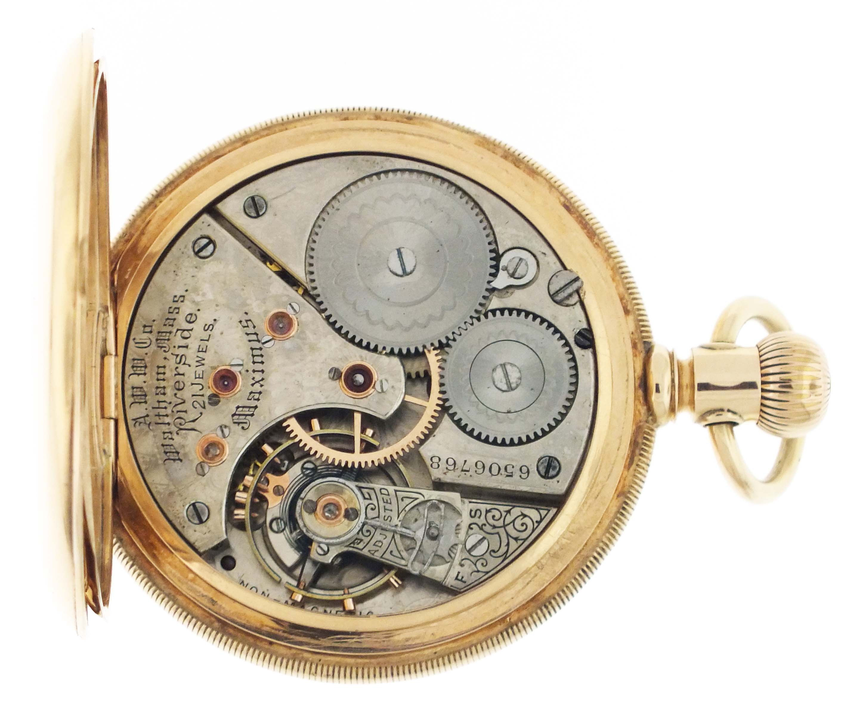 American Waltham Watch Co., Waltham, Mass., a model 1888 "Riverside Maximus" pocket watch, 16 size, 21 jewels, stem wind and set, adjusted, damascened nickel plate movement with lever escapement, cut bimetallic balance with gold screws, diamond endstones, gold jewel settings, and Church micrometric regulator in a 14 karat, yellow gold, hinged back and bezel, engine turned and engraved open face case, roman numeral, outer red 5-minute markers, double sunk white enamel dial with blued steel spade and whip hands, serial #6506768, 94.3g TW