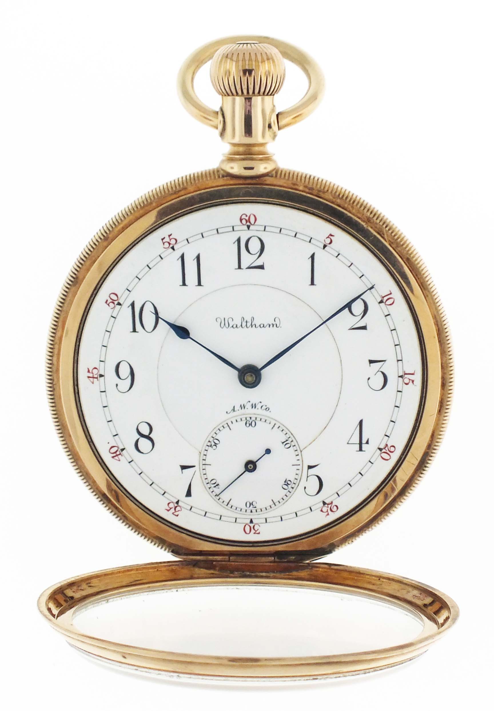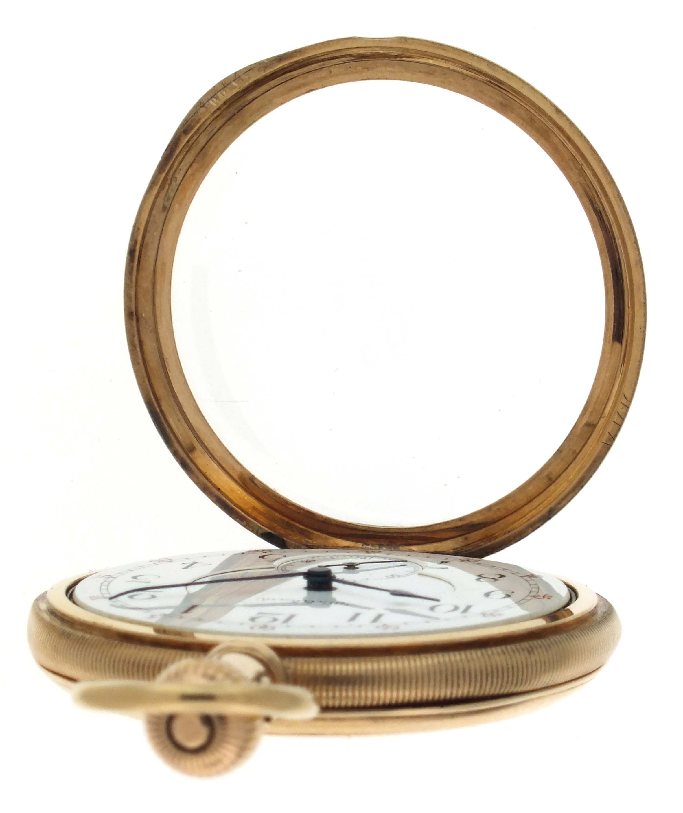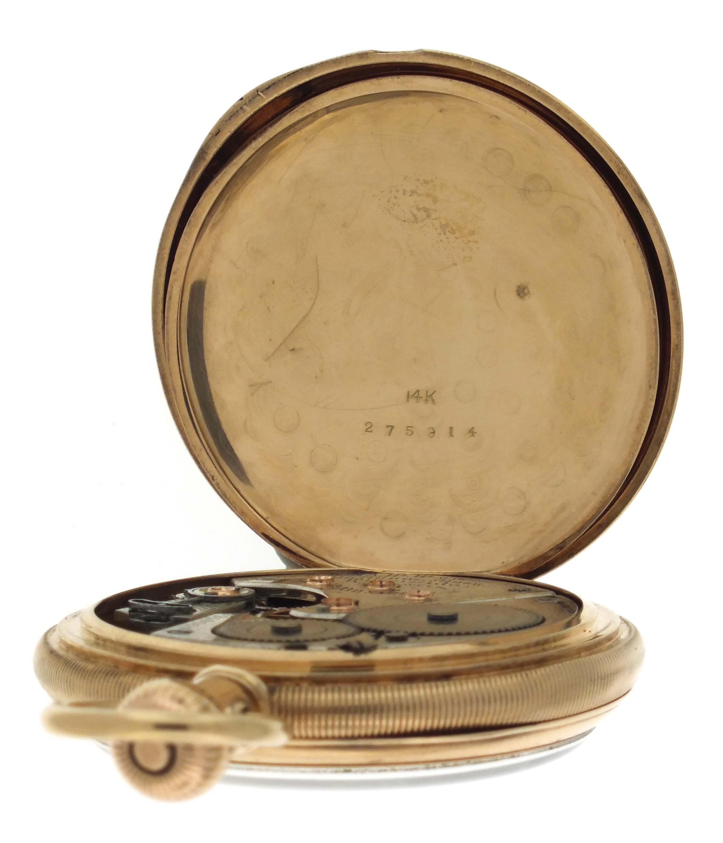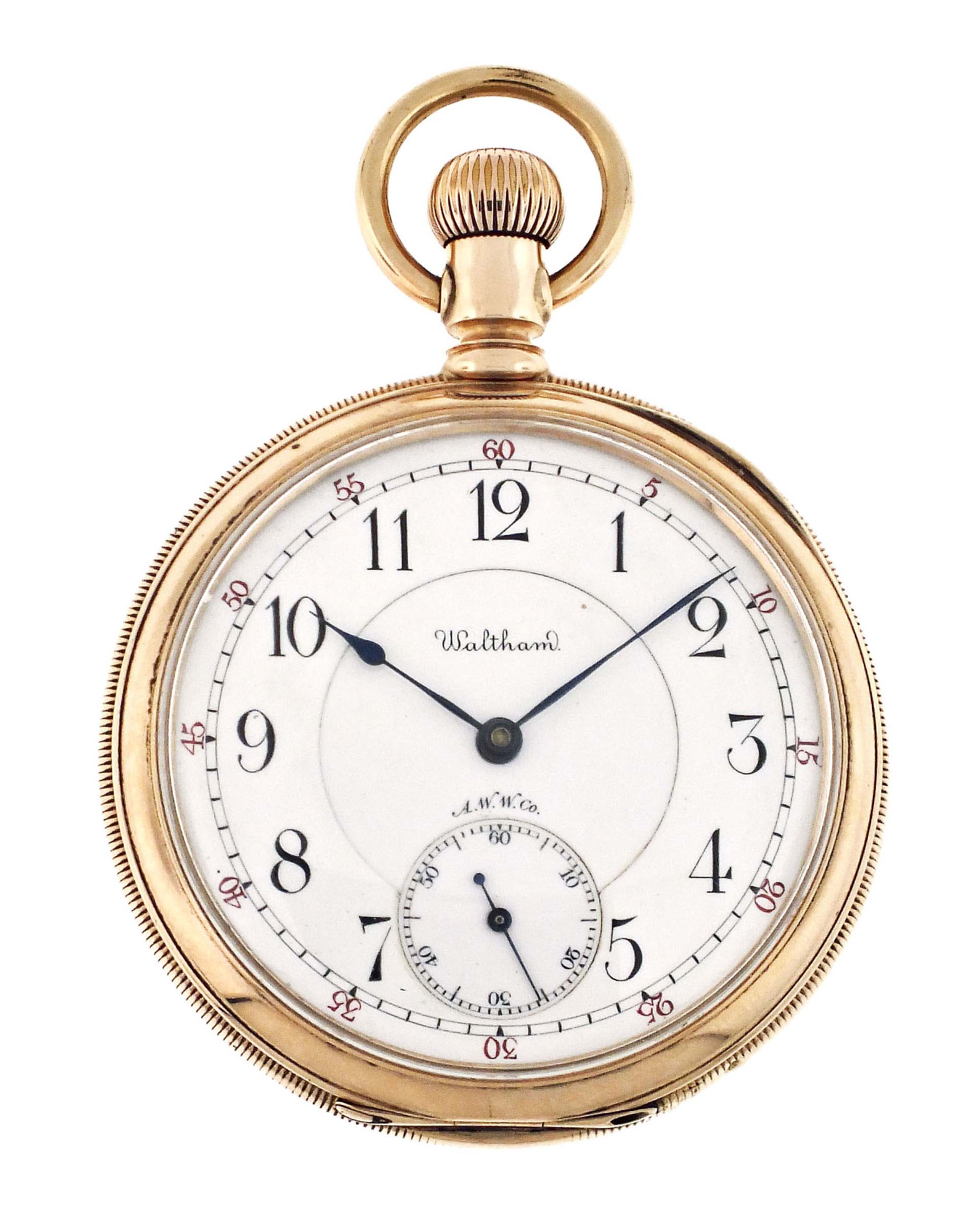 American Waltham Watch Co., Waltham, Mass., a model 1888 "Riverside Maximus" pocket watch, 16 size, 21 jewels, stem wind and set, adjusted, damascened nickel plate movement with lever escapement, cut bimetallic balance with gold screws, diamond endstones, gold jewel settings, and Church micrometric regulator in a 14 karat, yellow gold, hinged back and bezel, engine turned and engraved open face case, roman numeral, outer red 5-minute markers, double sunk white enamel dial with blued steel spade and whip hands, serial #6506768, 94.3g TW