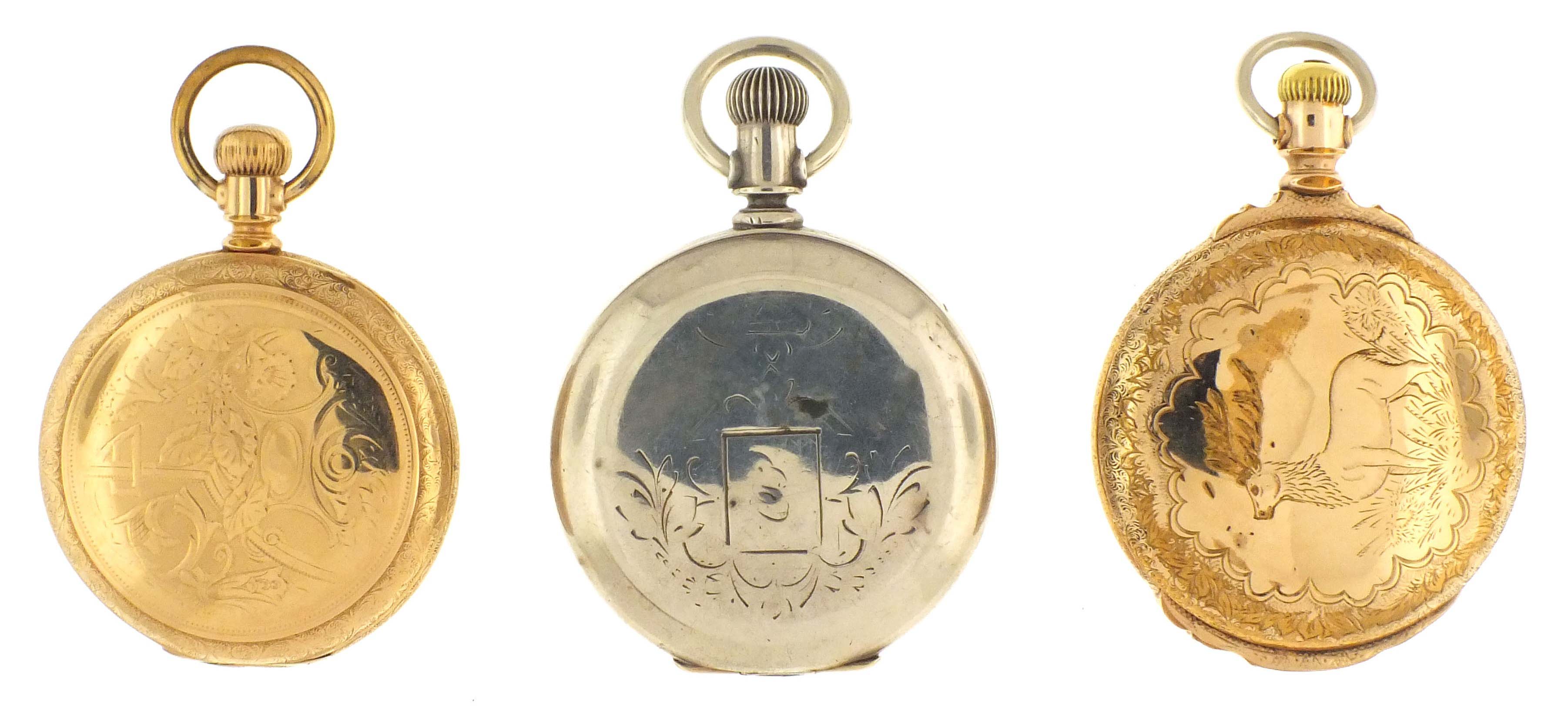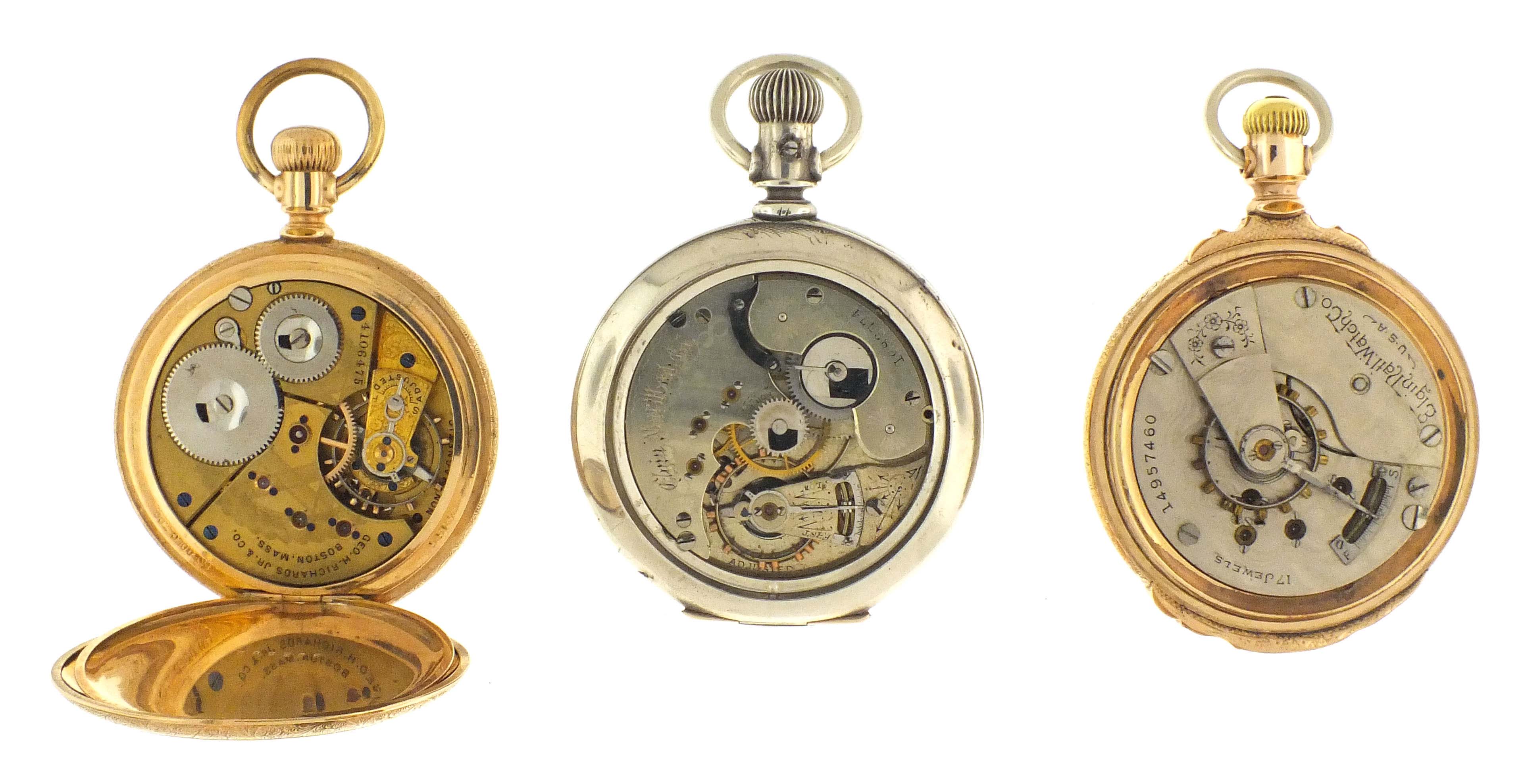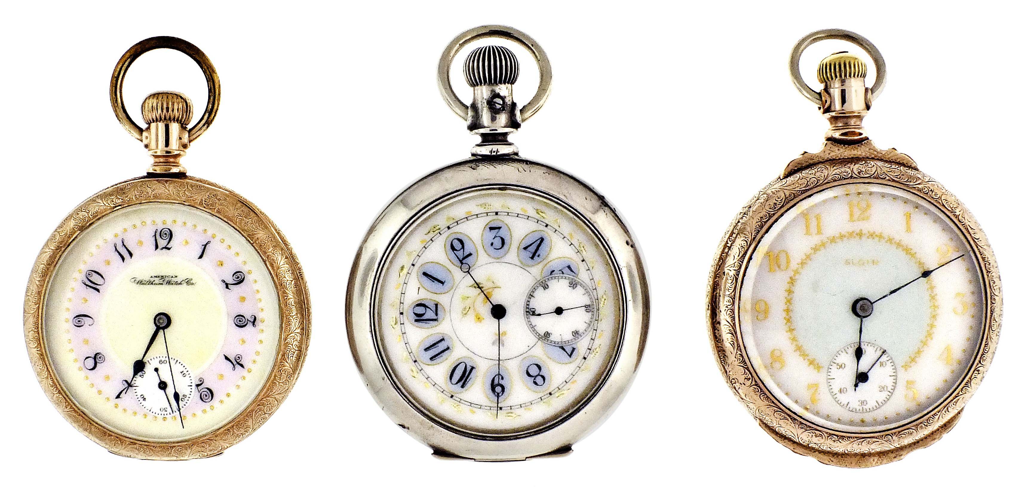 3 (Three) American pocket watches, 18 size, arabic numeral multicolor O'Hara style enamel dials, including an Elgin, model 5, grade "336", 17 jewel movement in gold filled open face case, serial #14957460, a Waltham model 1888, "Riverside", 15 jewel movement in gold hunting case, serial #4106475, and a Rockford model 1, grade 50,15 jewel movement in a coin silver, open face, muckle style case, serial #1683774