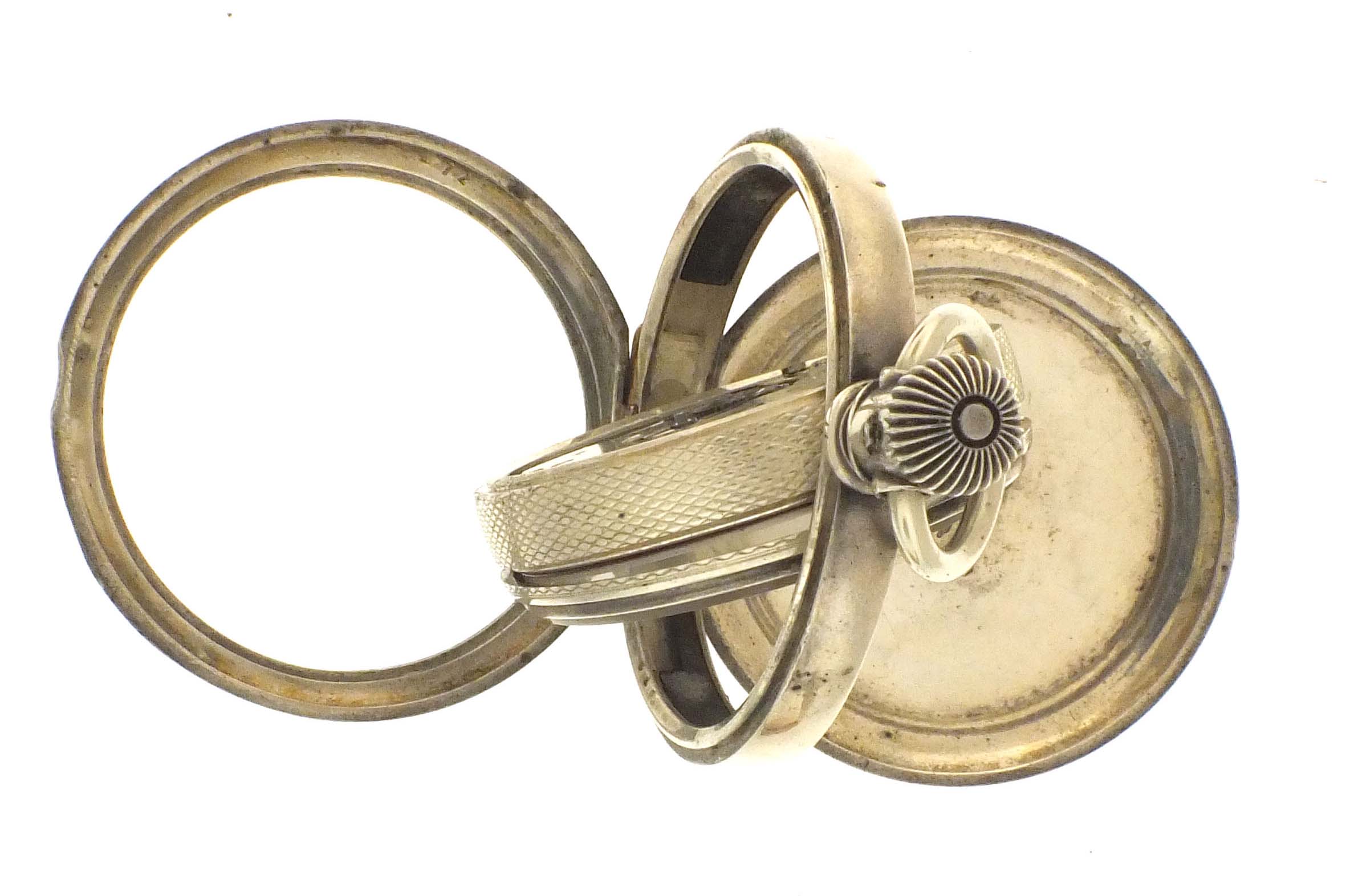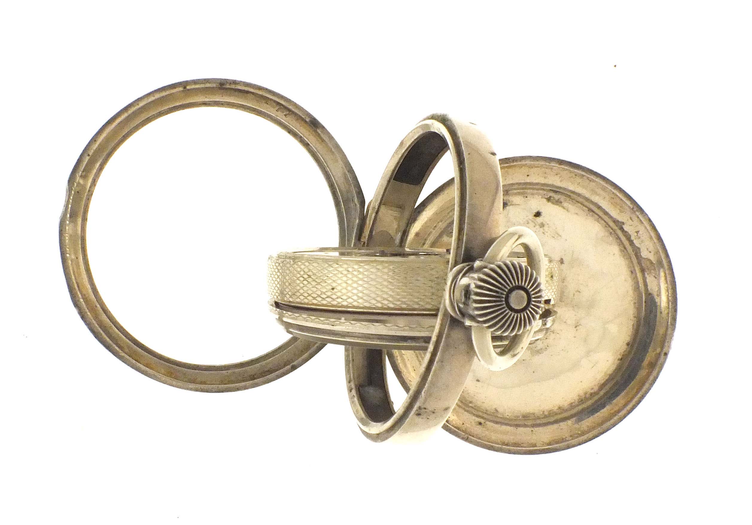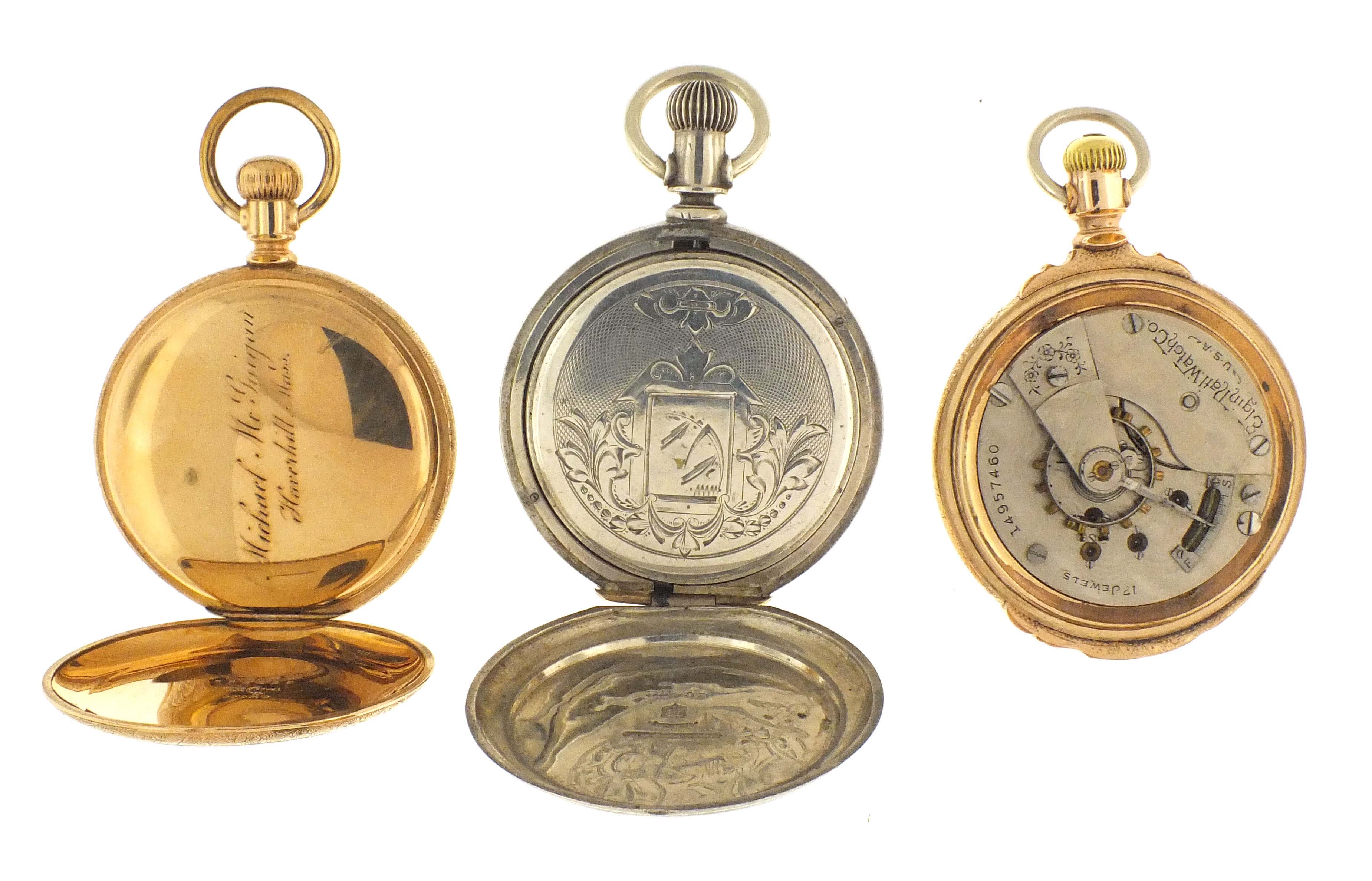 3 (Three) American pocket watches, 18 size, arabic numeral multicolor O'Hara style enamel dials, including an Elgin, model 5, grade "336", 17 jewel movement in gold filled open face case, serial #14957460, a Waltham model 1888, "Riverside", 15 jewel movement in gold hunting case, serial #4106475, and a Rockford model 1, grade 50,15 jewel movement in a coin silver, open face, muckle style case, serial #1683774
