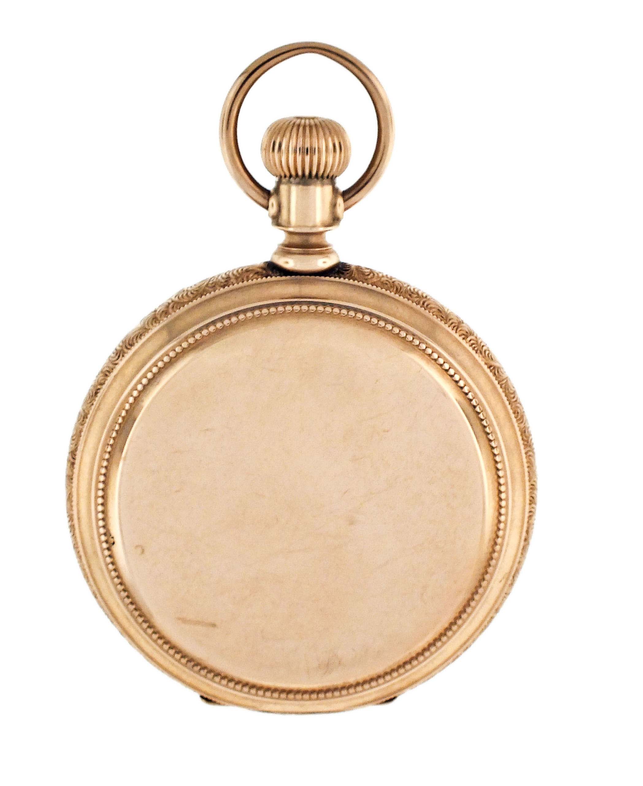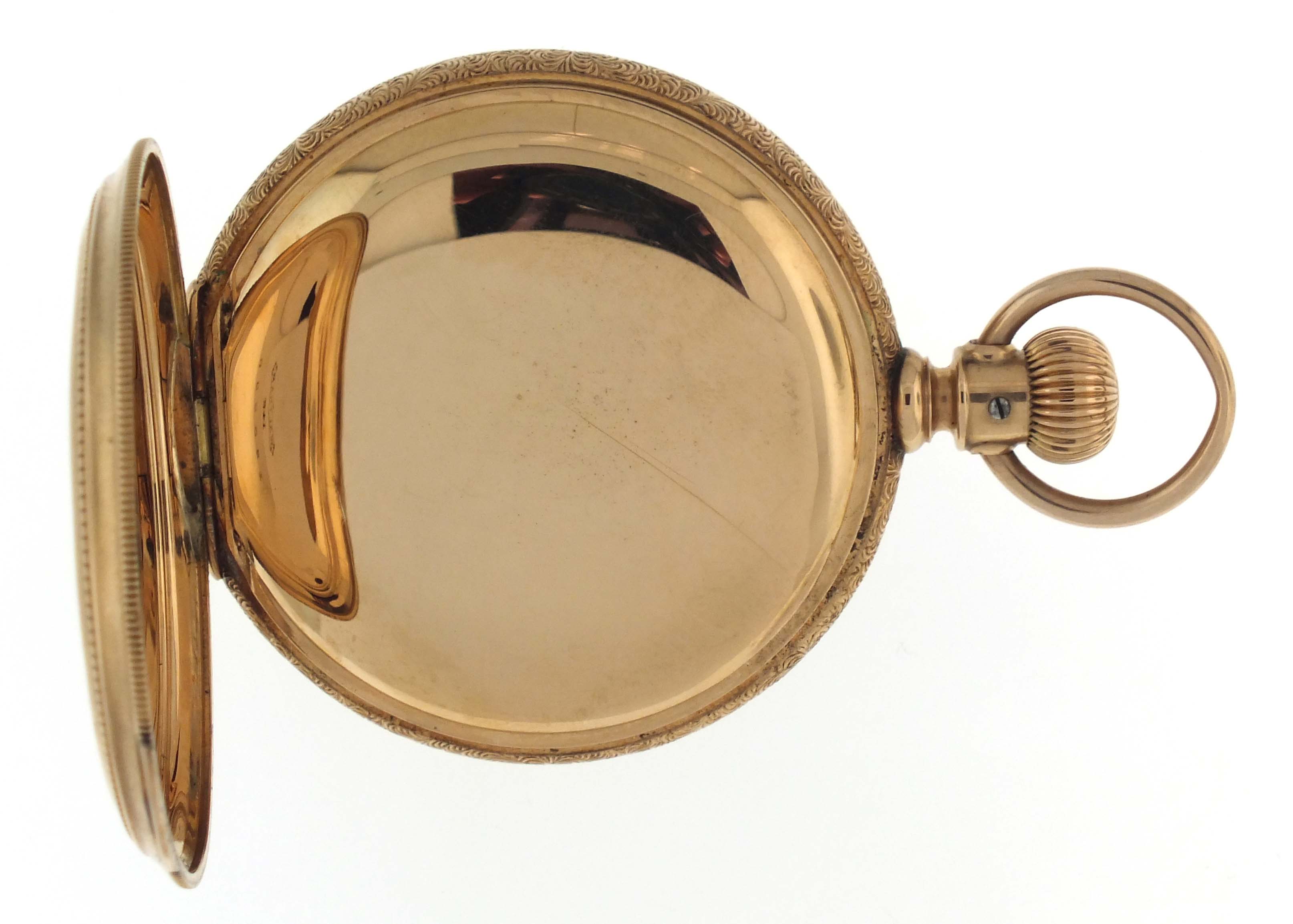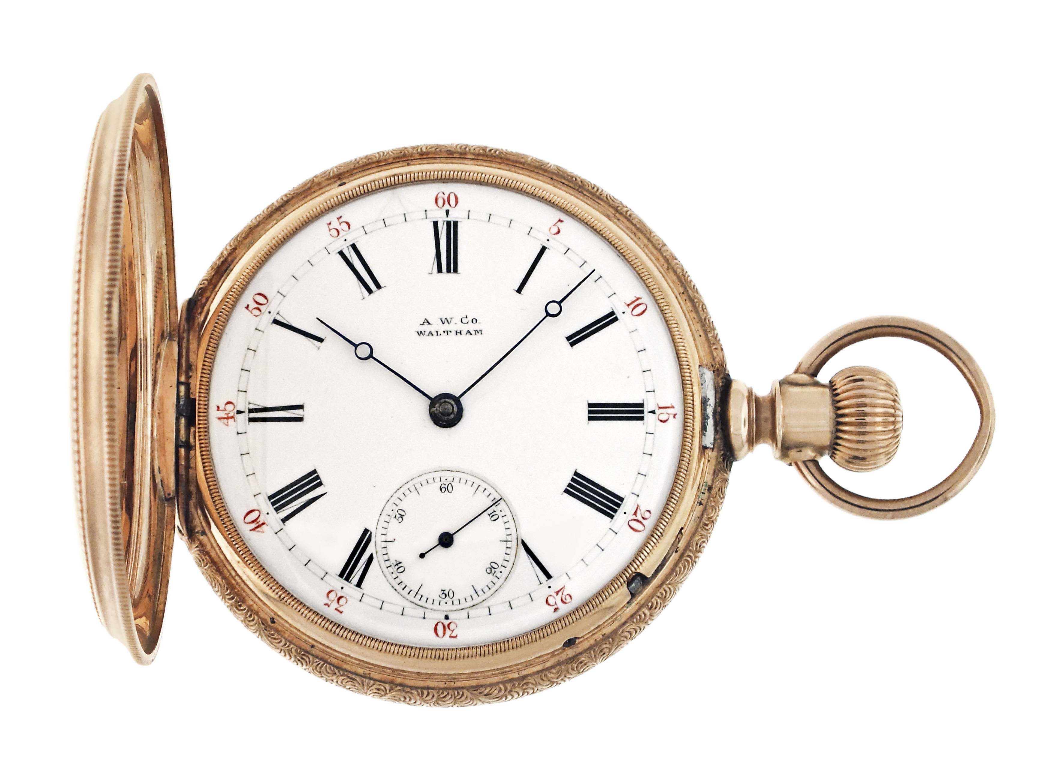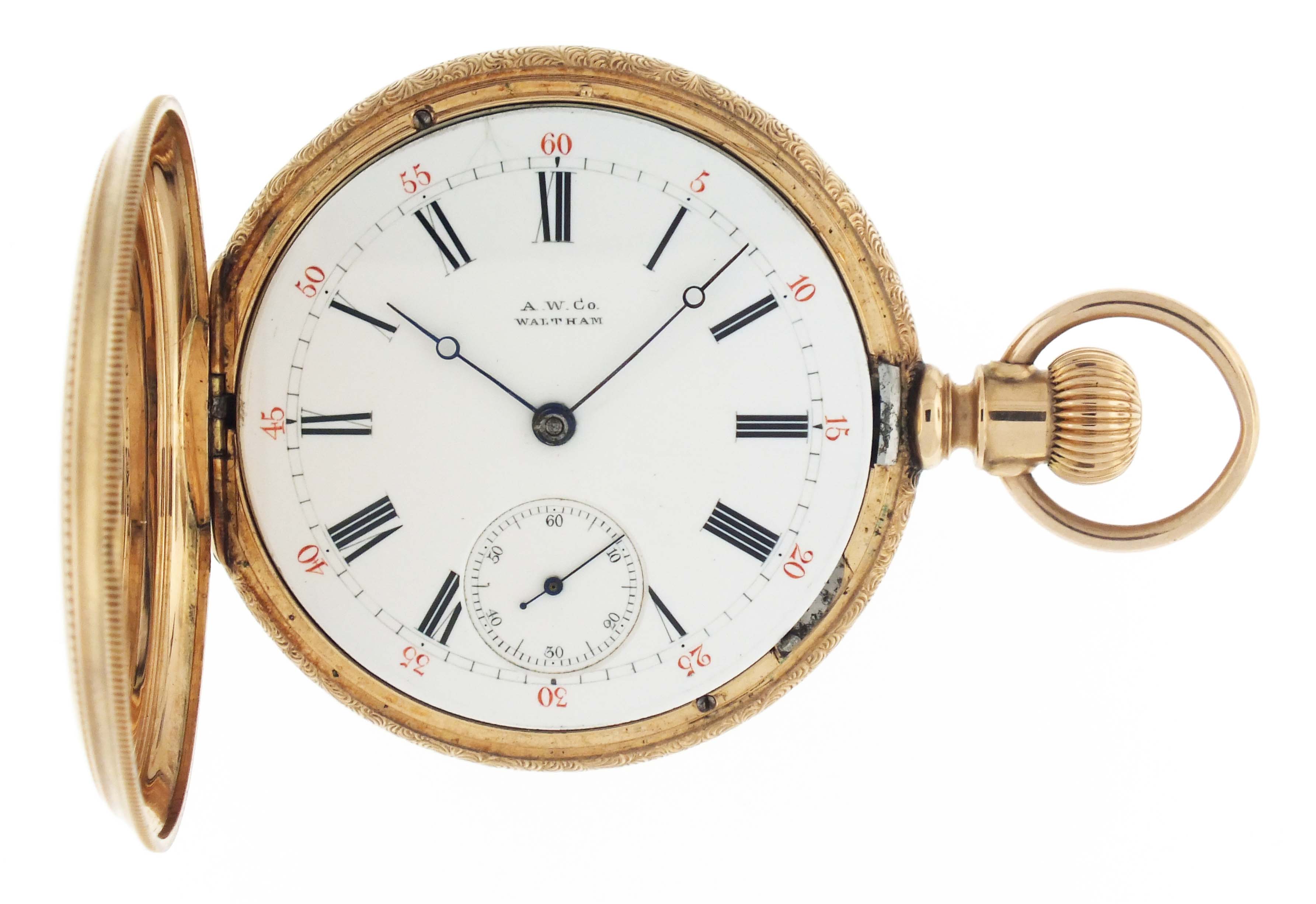 American Waltham Watch Co., Waltham, Mass., a model 1872 pocket watch, 16 size, 15 jewels, stem wind and lever set, adjusted, damascened nickel plate movement with lever escapement, cut bimetallic balance with gold screws, and Woerd micrometric regulator in a 14 karat, rose gold hunting case with engraved band, roman numeral, outer red 5-minute markers, single sunk white enamel dial with blued steel hands, serial #1880172, 106.4g TW