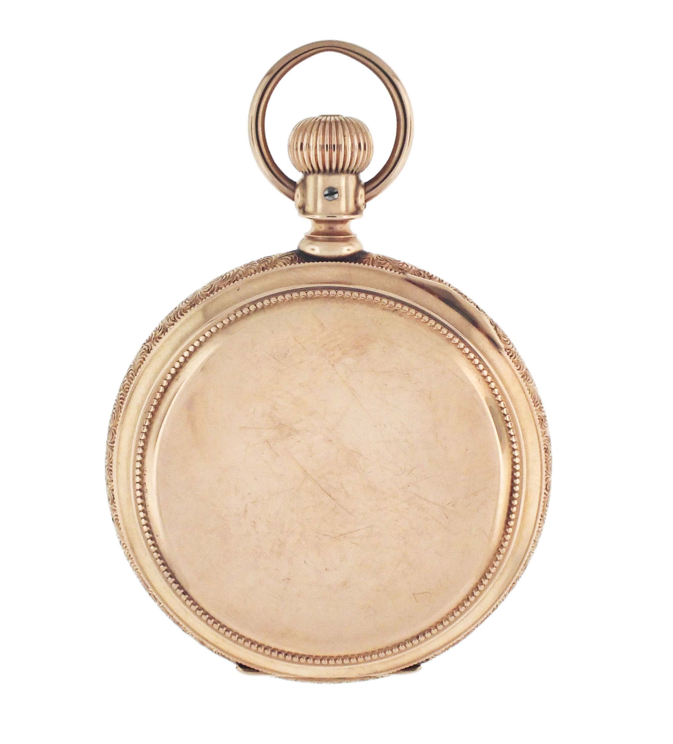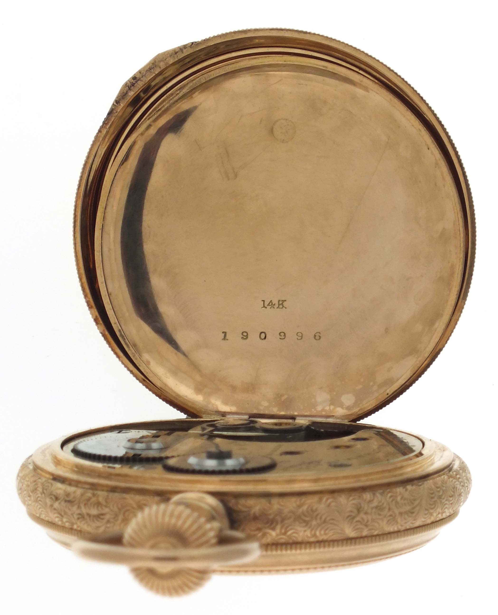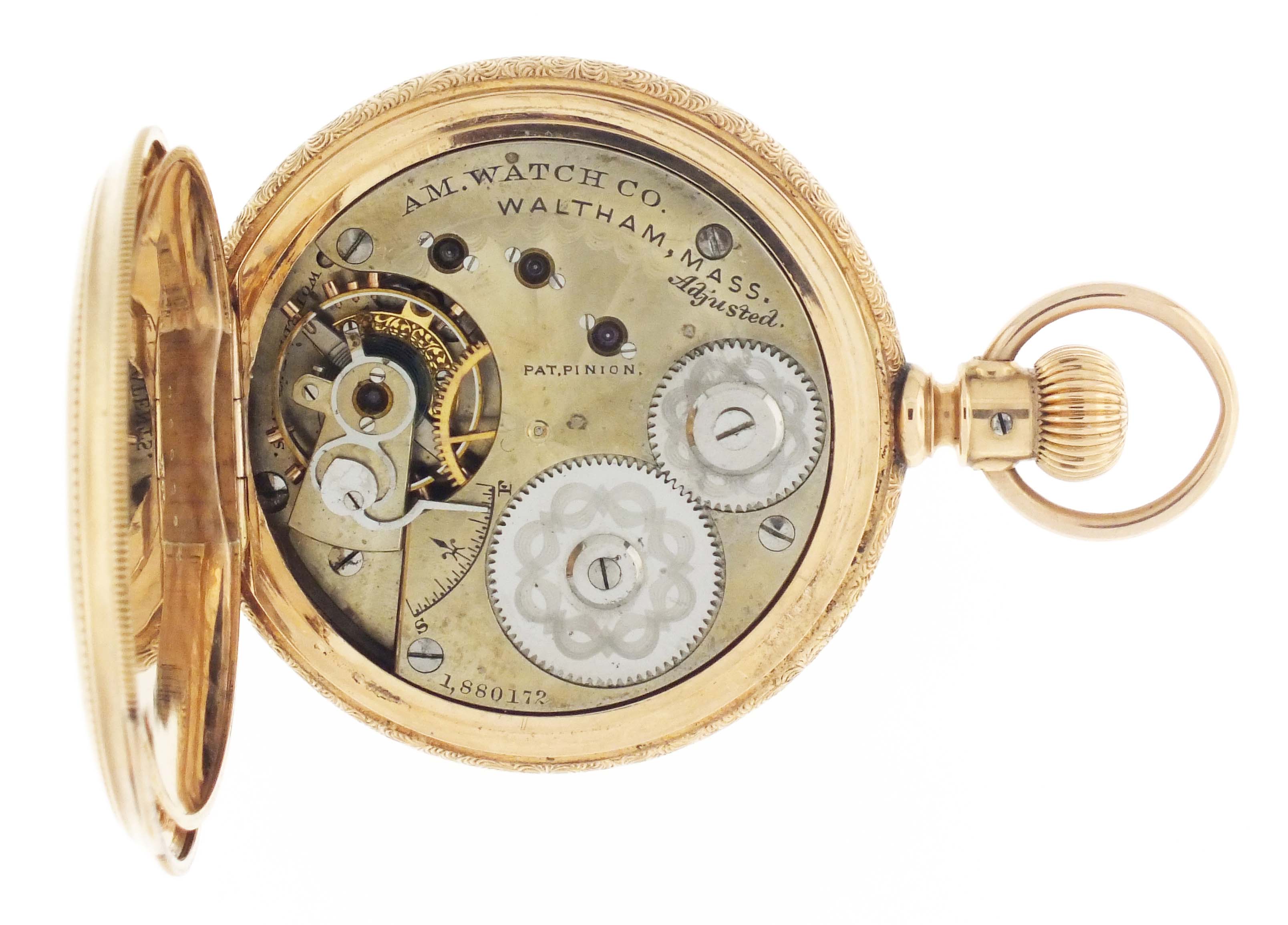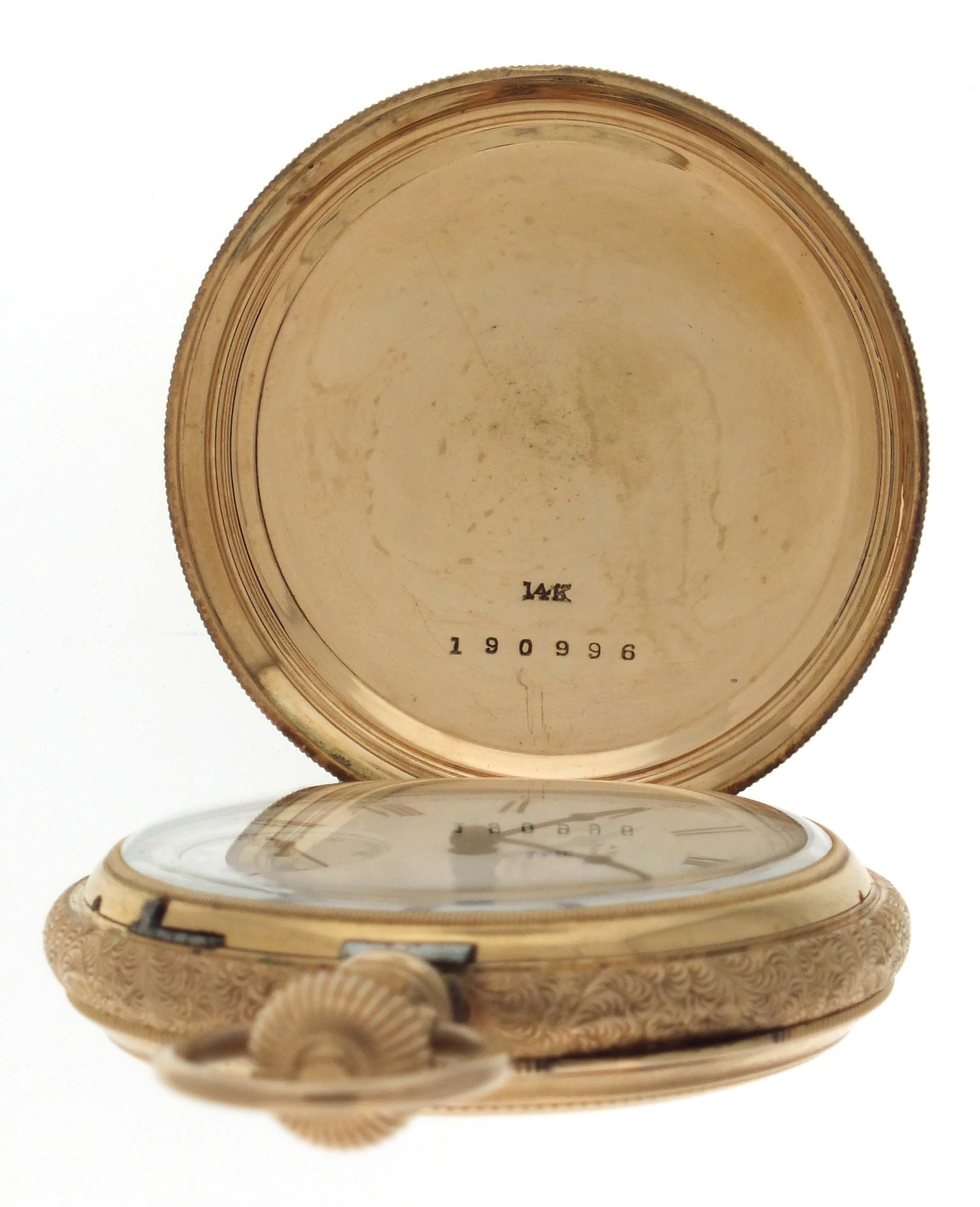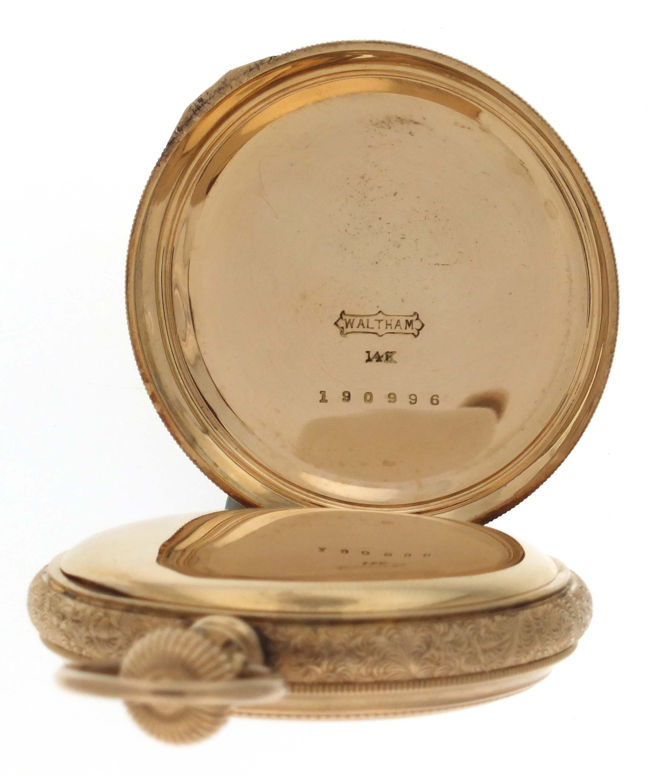 American Waltham Watch Co., Waltham, Mass., a model 1872 pocket watch, 16 size, 15 jewels, stem wind and lever set, adjusted, damascened nickel plate movement with lever escapement, cut bimetallic balance with gold screws, and Woerd micrometric regulator in a 14 karat, rose gold hunting case with engraved band, roman numeral, outer red 5-minute markers, single sunk white enamel dial with blued steel hands, serial #1880172, 106.4g TW