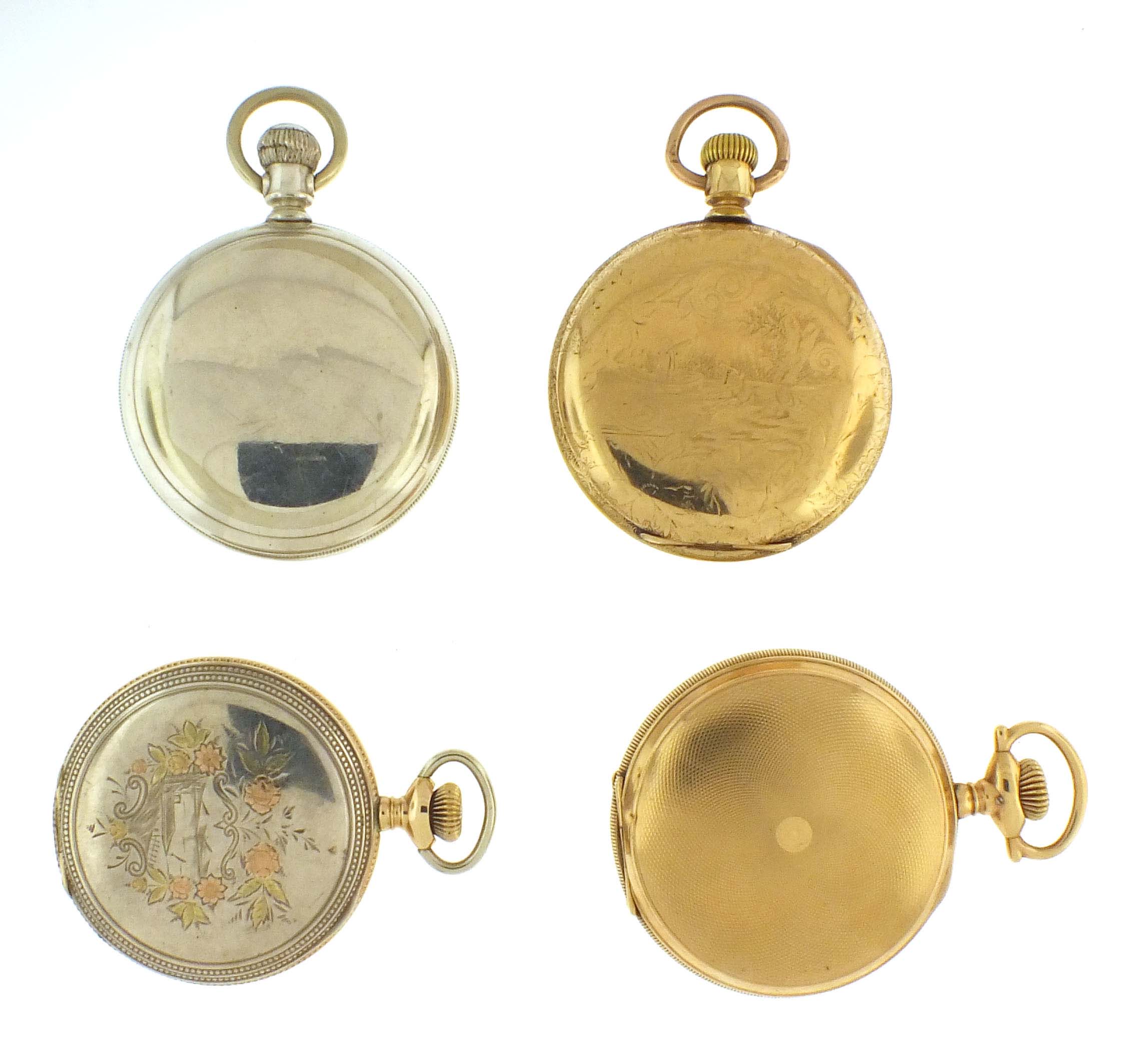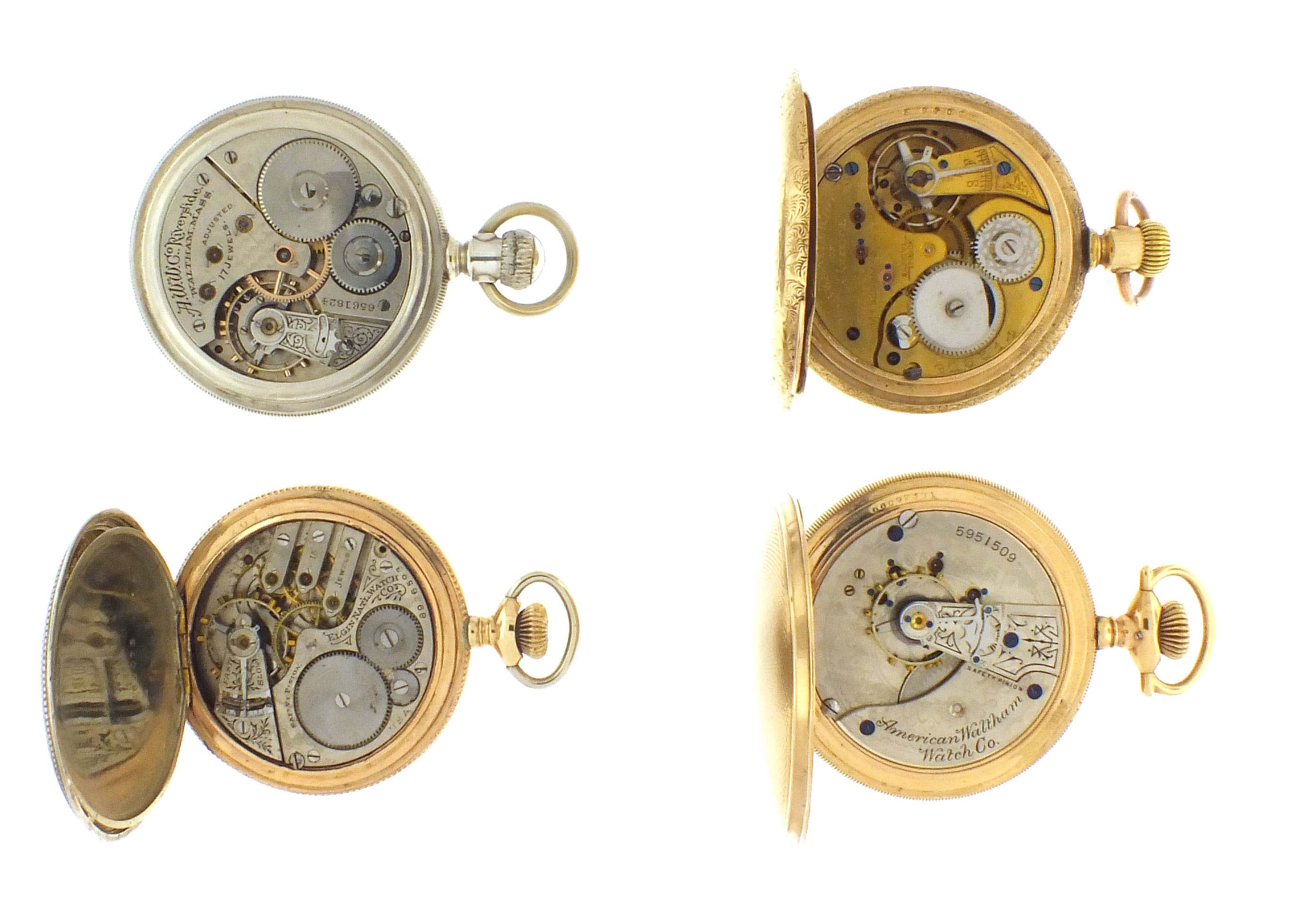 4 (Four) American pocket watches, 18 size, arabic and roman numeral dial, one O'Hara style, including an Elgin, model 6, grade 247, 15 jewel movement in gold filled and sterling silver hunting case serial #8926593, a Waltham, model 1883 grade 15, 17 jewel movement in a gold filled hunting case, serial #5951509, a Non Magnetic watch, model 2, grade 96,11 jewel movement in gold filled hunting case, serial #326214 and a Waltham model 1888, "Riverside", 17 jewel movement in nickel case, serial #6561824
