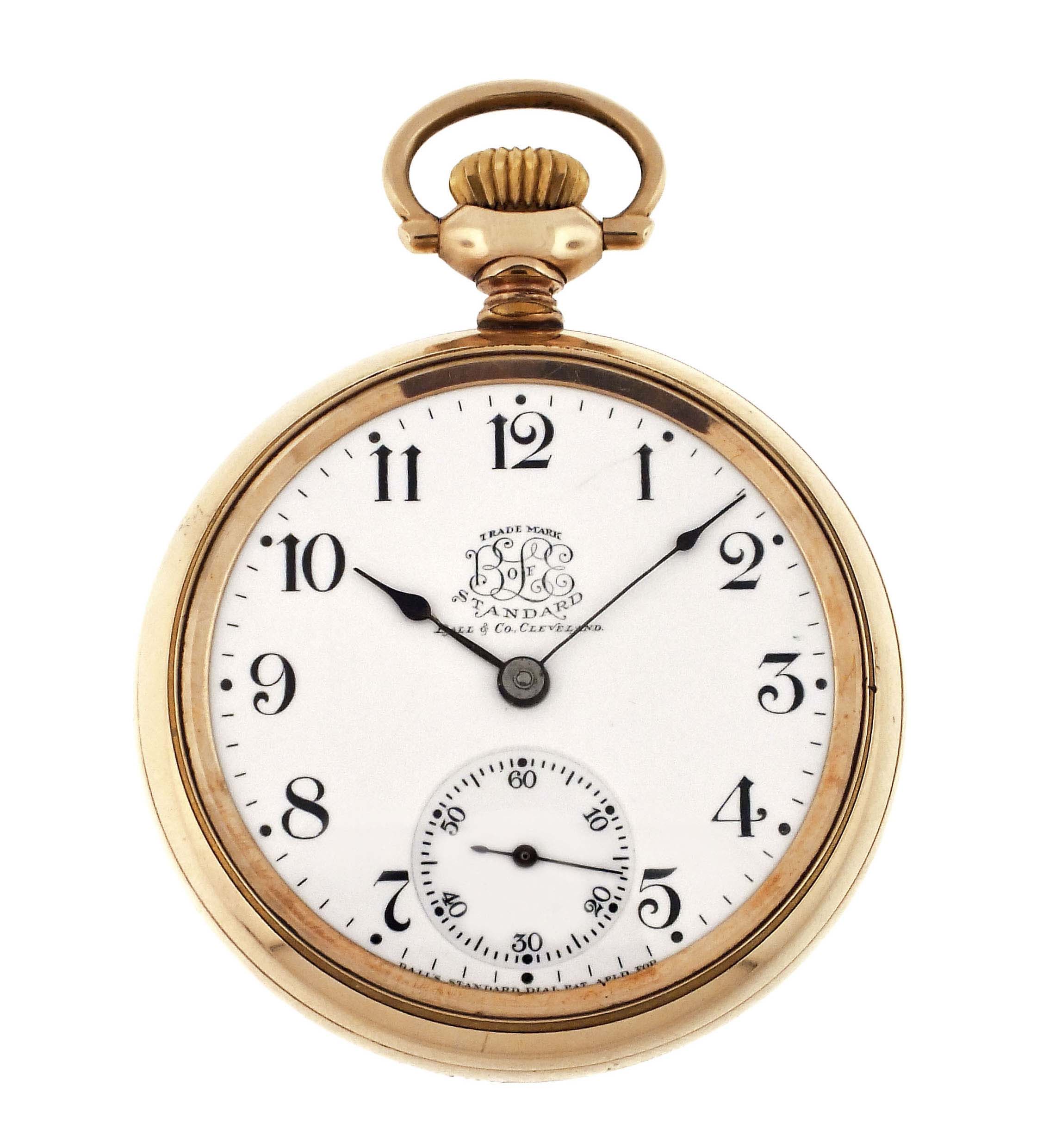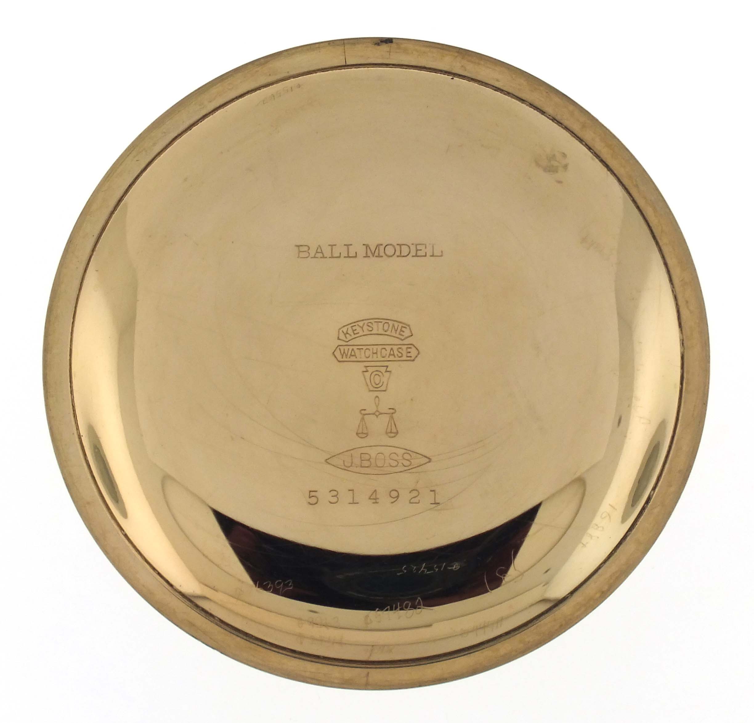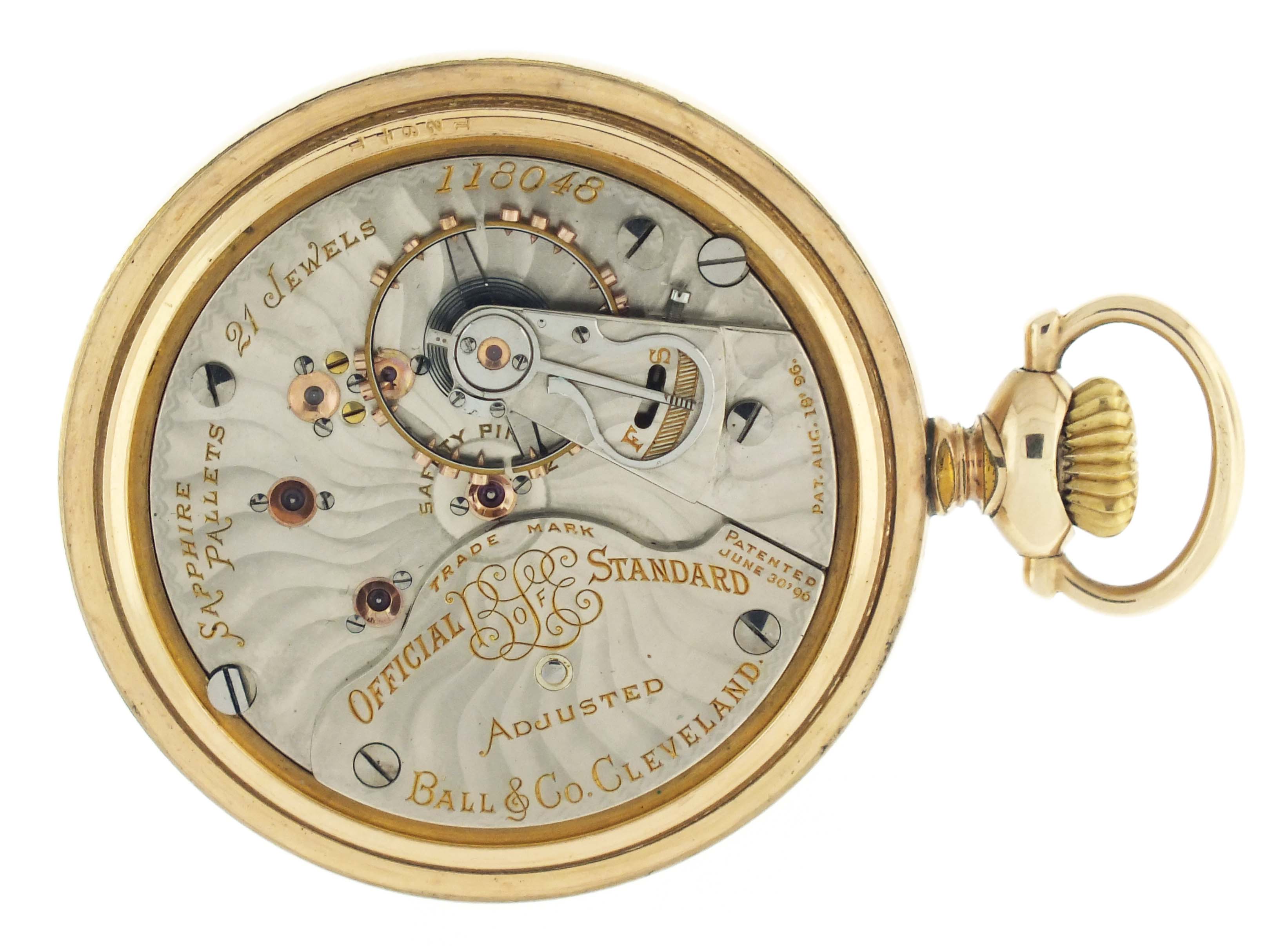Ball Watch Co., Cleveland, Ohio, a Ball - Hamilton 999A "Brotherhood of Locomotive Engineers" pocket watch, 18 size, 21 jewels, stem wind and lever set, adjusted to 5 positions and temperature, damascened nickel plate movement with lever escapement, cut bimetallic balance with gold screws, gold jewel settings, and whiplash micrometric regulator in a gold filled, Ball model screw back and bezel open face case, the back with engraved locomotive, arabic numeral, single sunk white enamel dial marked "B of LE Standard", with plum colored steel spade hands, serial #118048