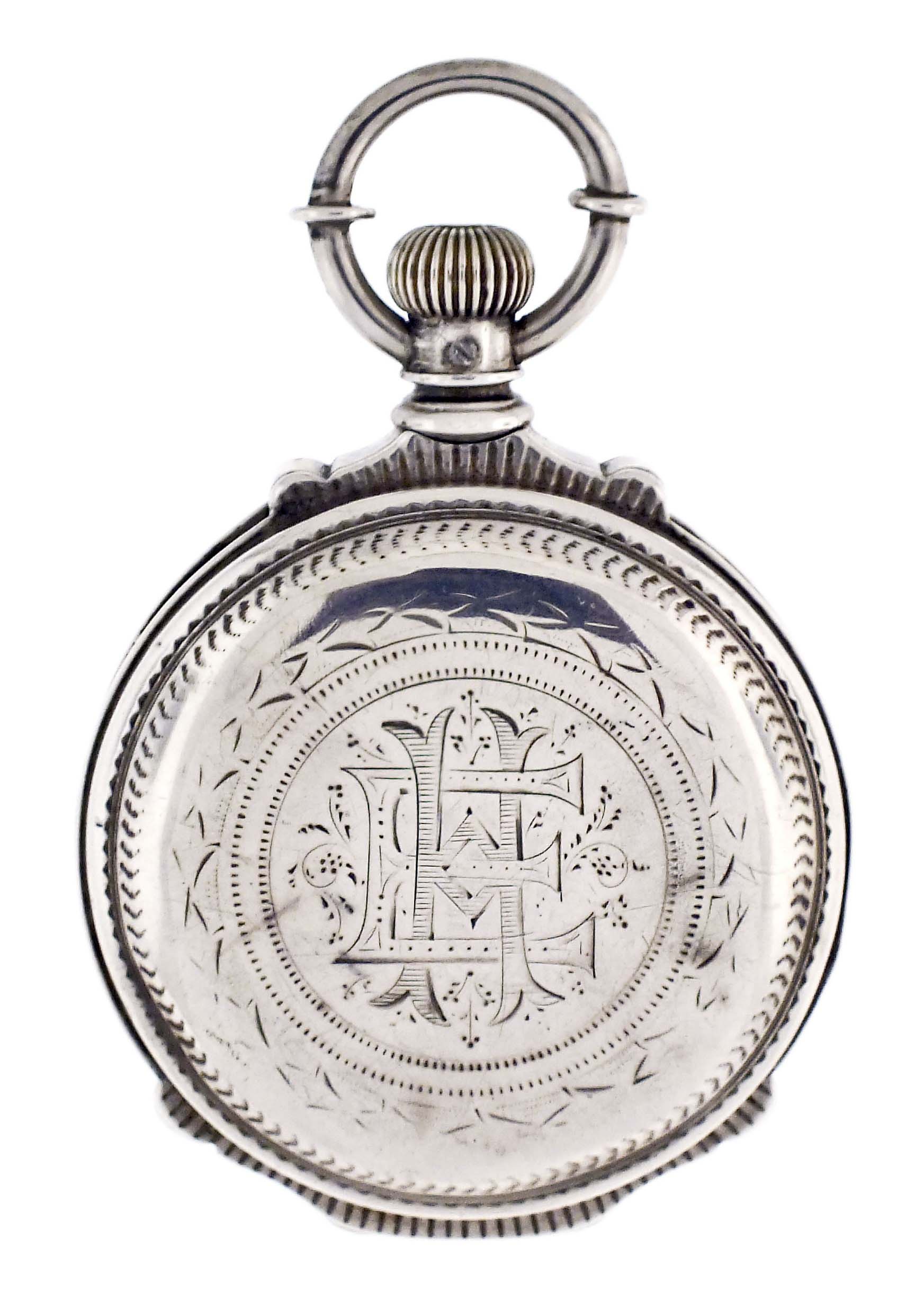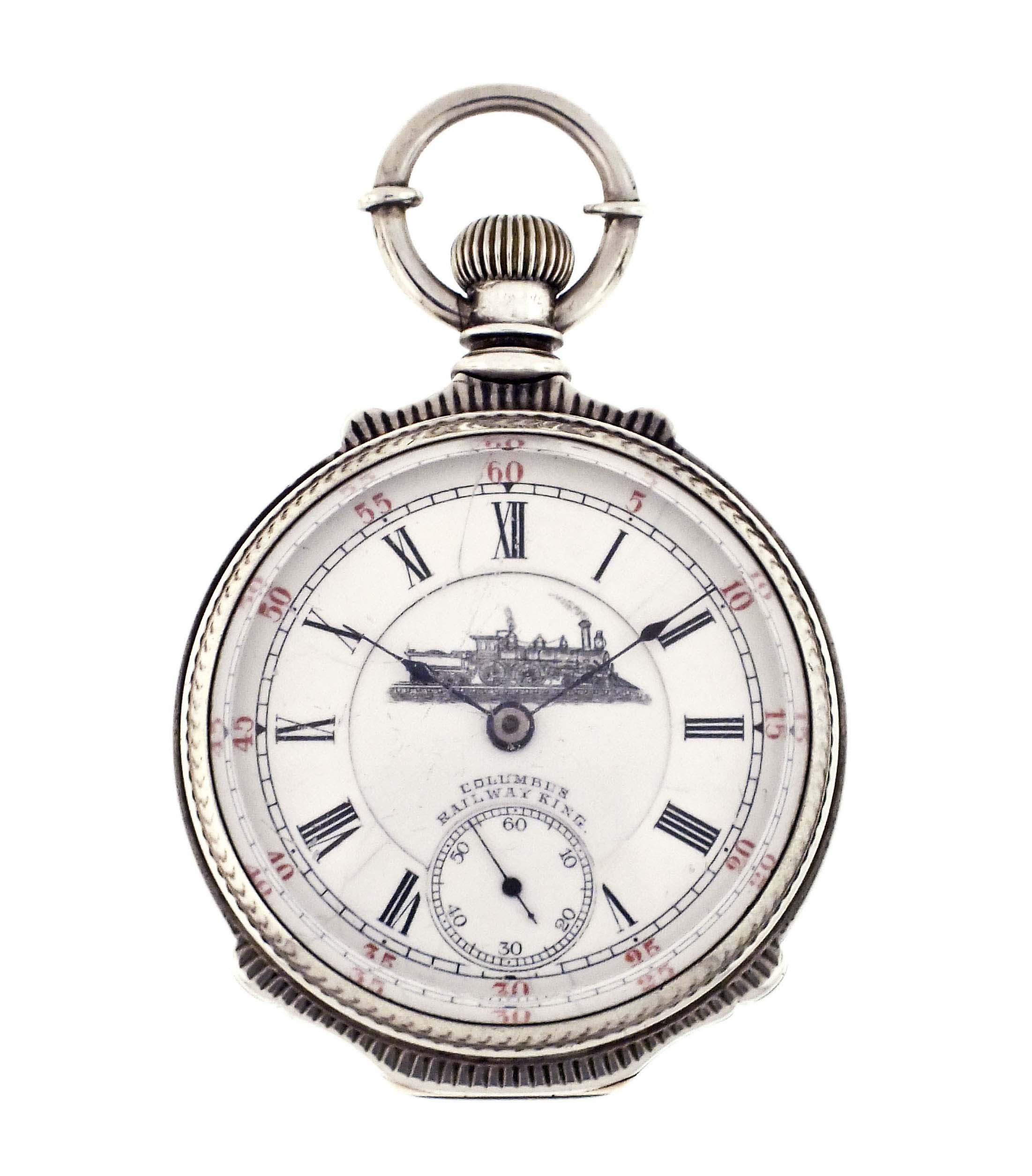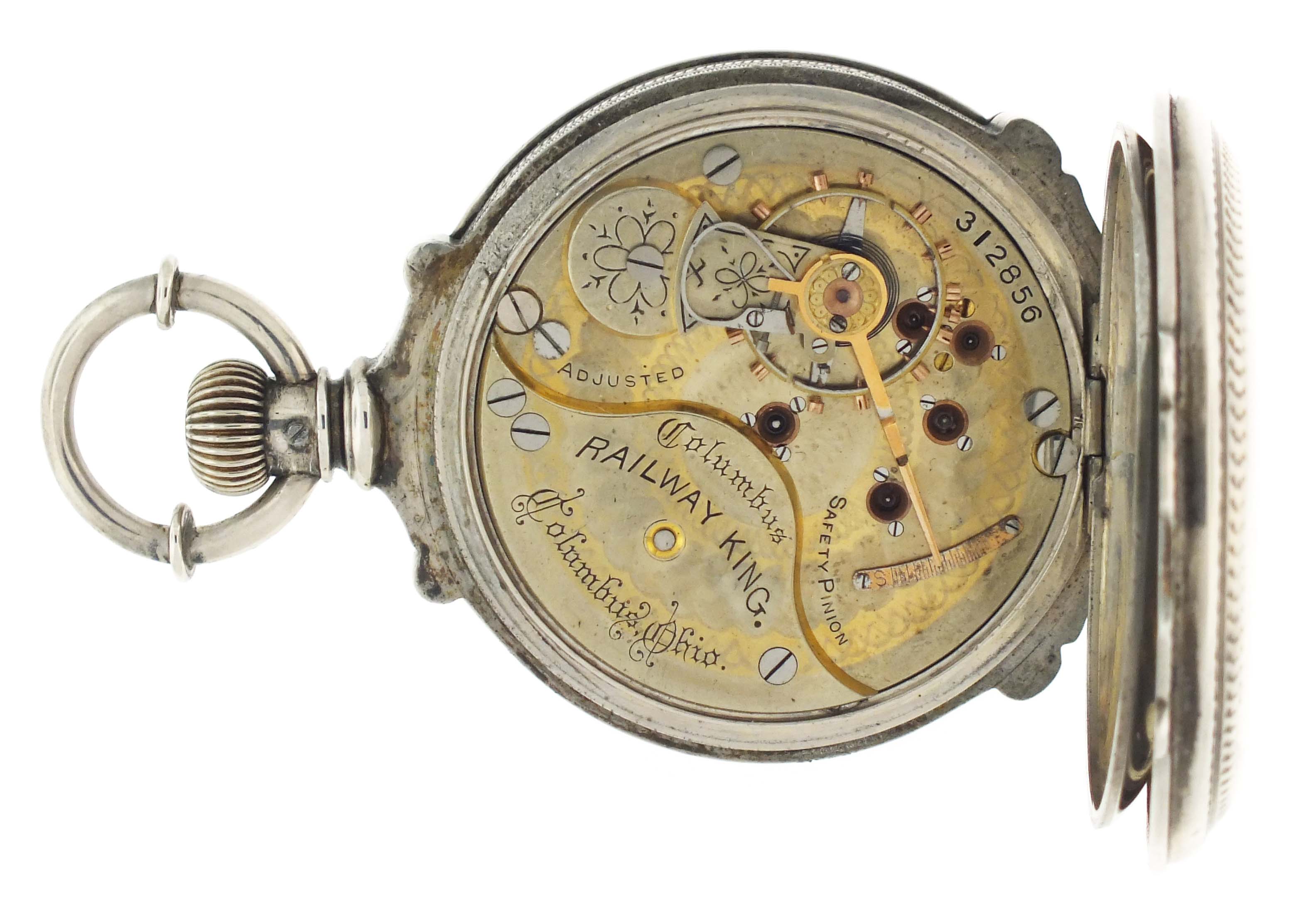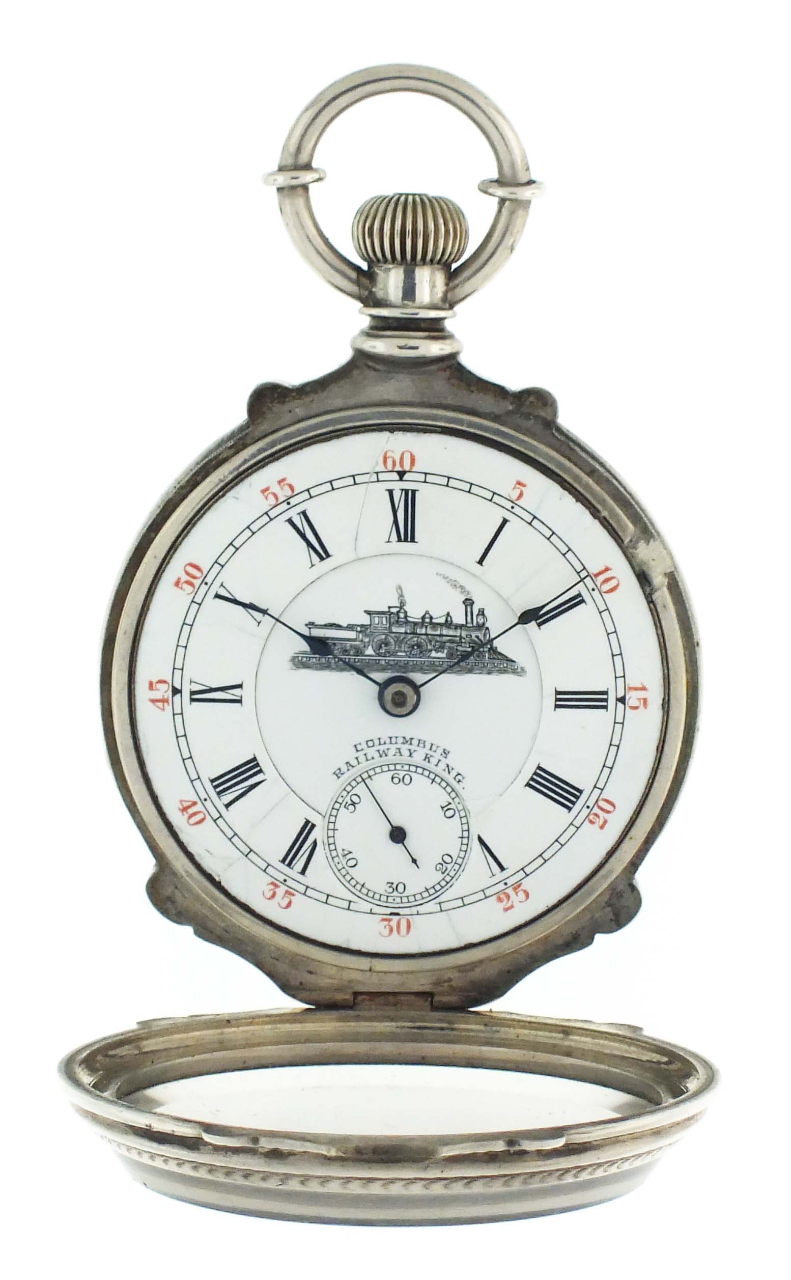 Columbus Watch Co., Columbus, Ohio, a silver cased "Columbus Railway King" pocket watch, 18 size, 16 jewels, stem wind and lever set, adjusted to 5 positions, two tone damascened nickel plate movement with lever escapement, cut bimetallic balance with gold screws, gold jewel settings and micrometric regulator in a coin silver, hinged back and bezel, engraved open face case with engraved cipher on back cover, roman numeral, outer red 5-minute markers, double sunk white enamel dial with blued steel spade hands, serial #312856