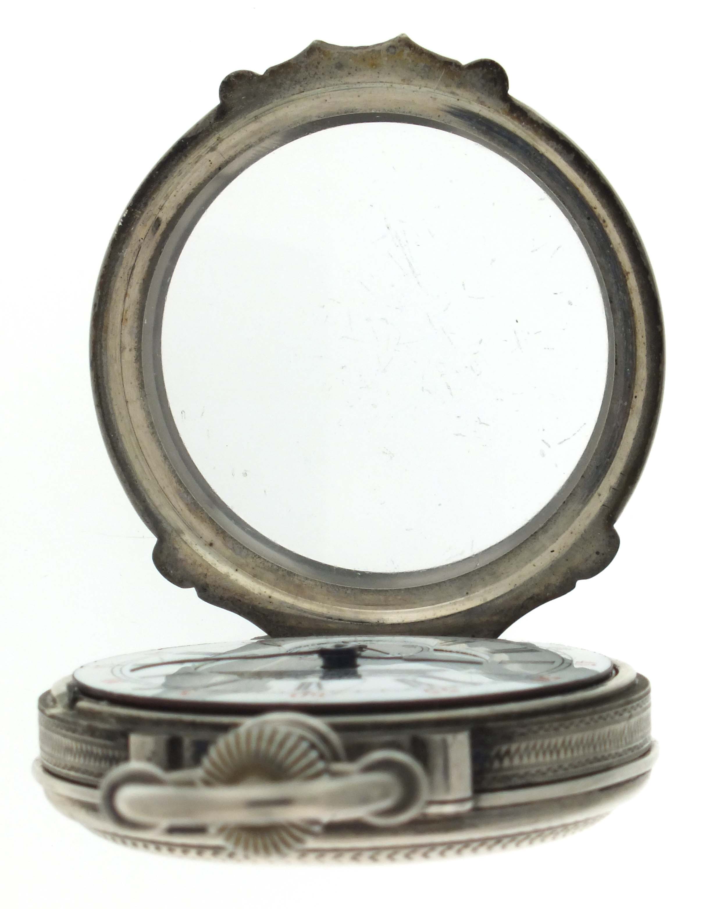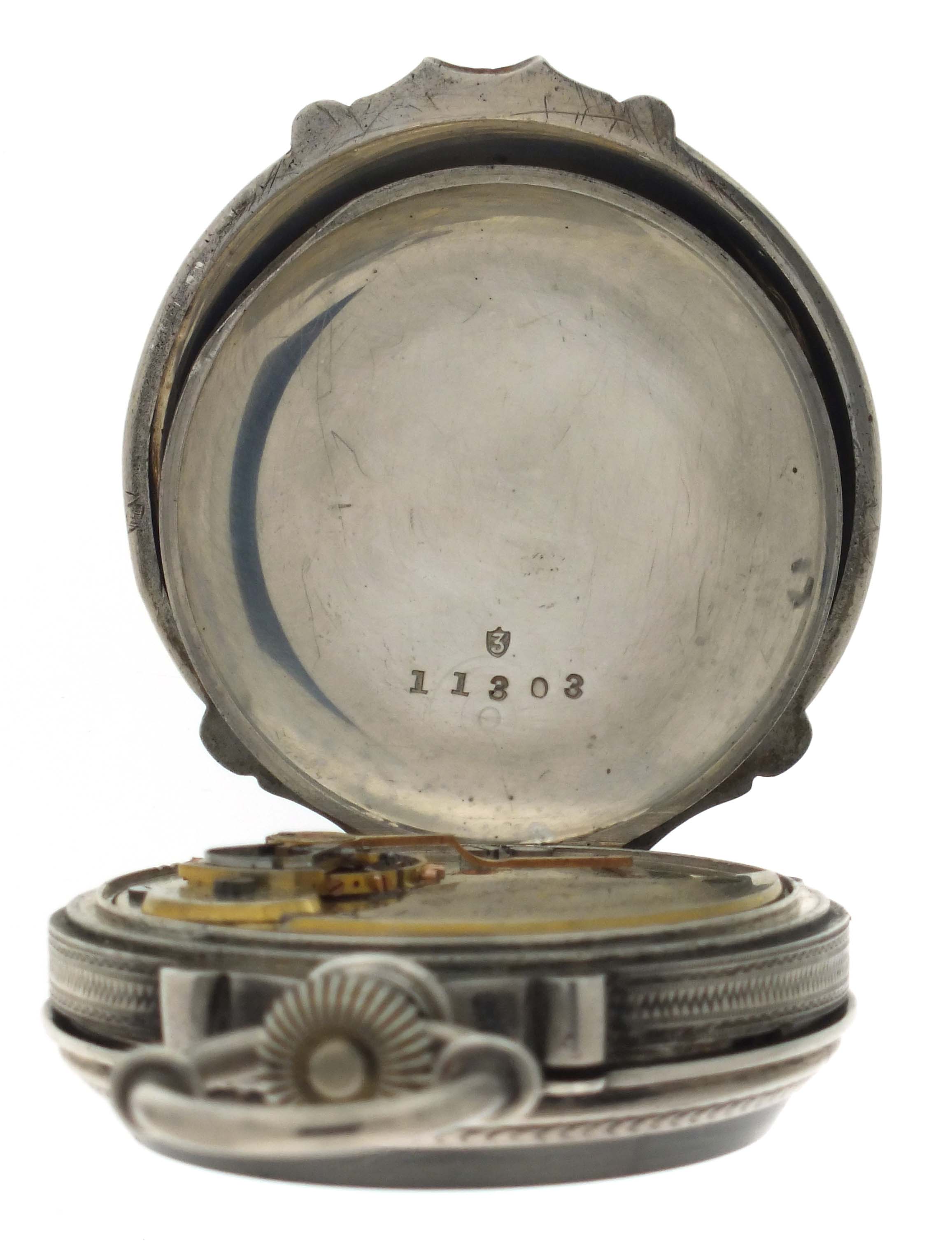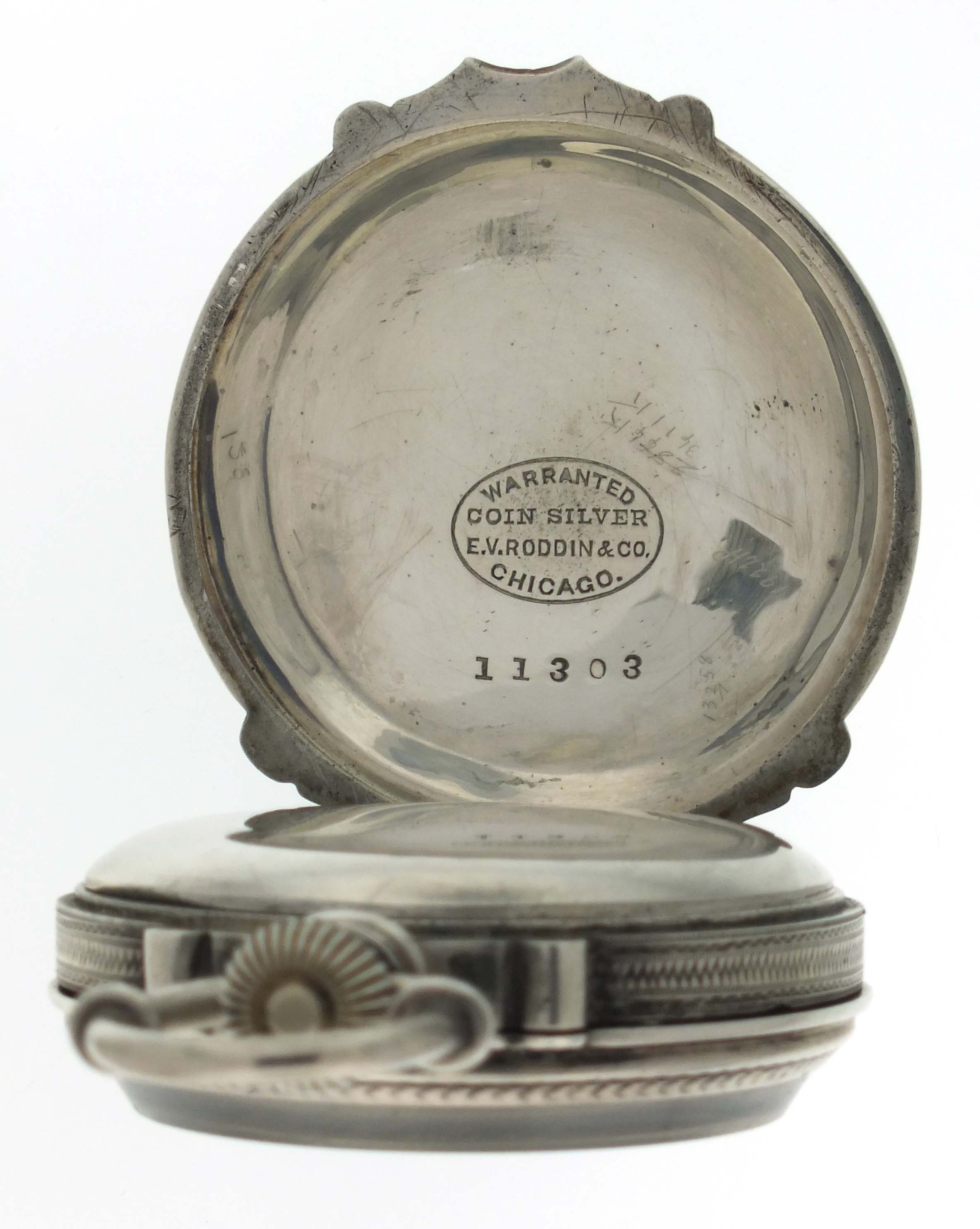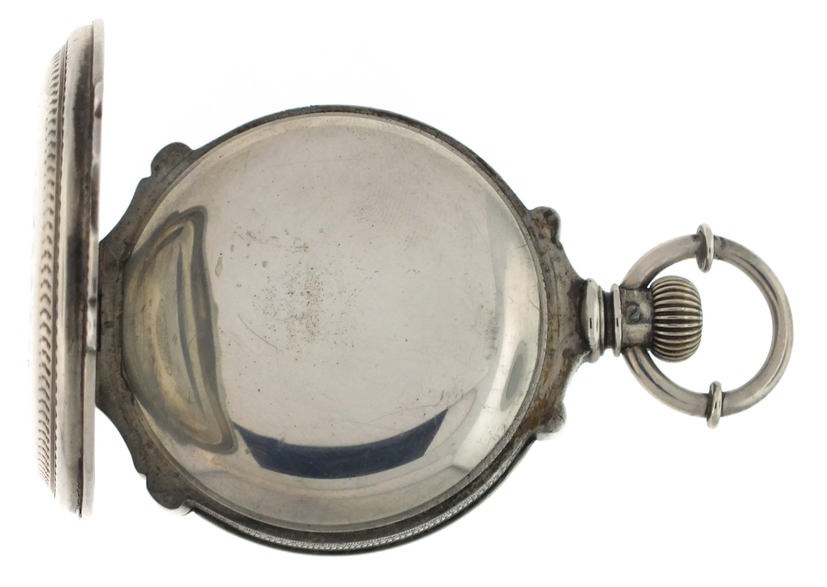Columbus Watch Co., Columbus, Ohio, a silver cased "Columbus Railway King" pocket watch, 18 size, 16 jewels, stem wind and lever set, adjusted to 5 positions, two tone damascened nickel plate movement with lever escapement, cut bimetallic balance with gold screws, gold jewel settings and micrometric regulator in a coin silver, hinged back and bezel, engraved open face case with engraved cipher on back cover, roman numeral, outer red 5-minute markers, double sunk white enamel dial with blued steel spade hands, serial #312856