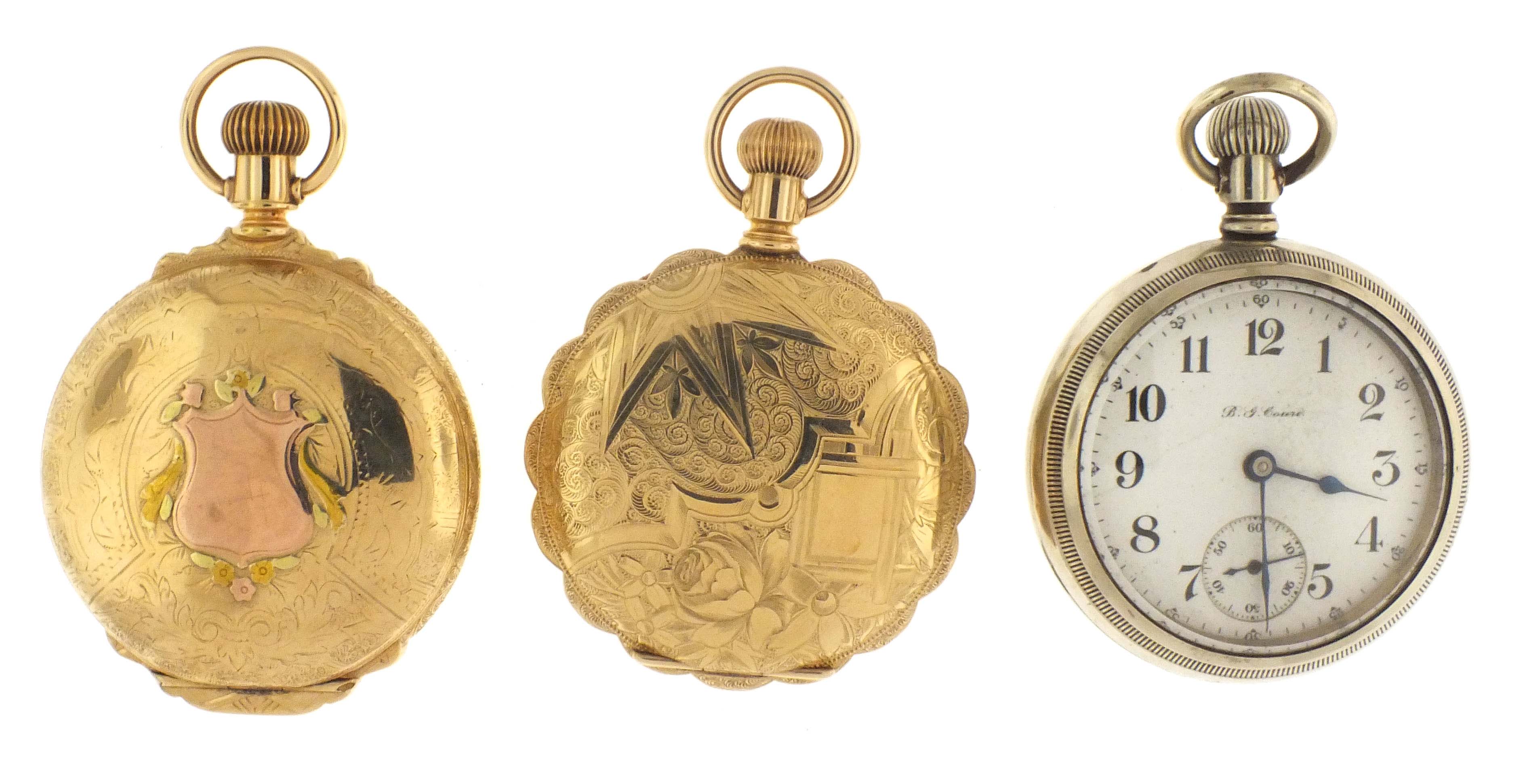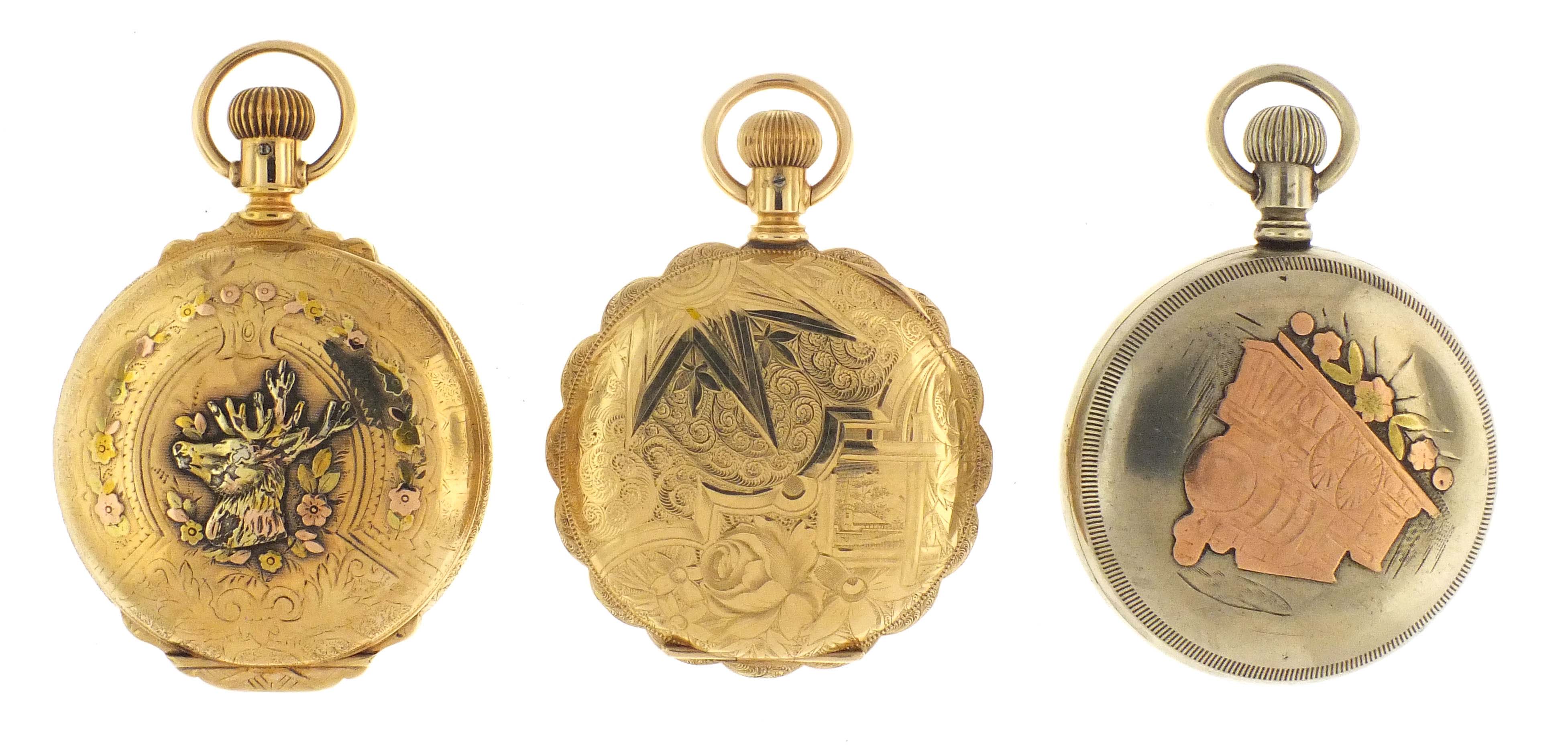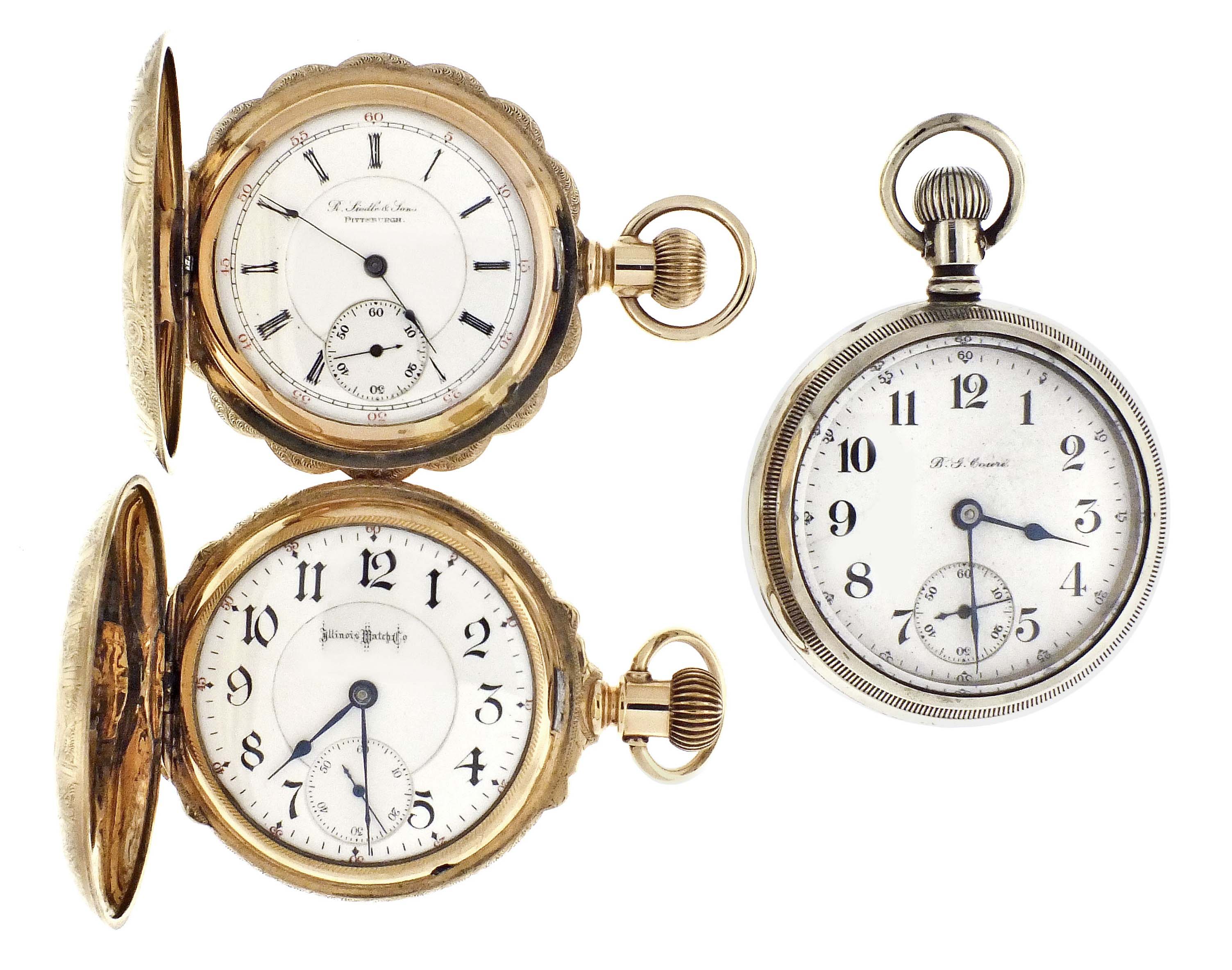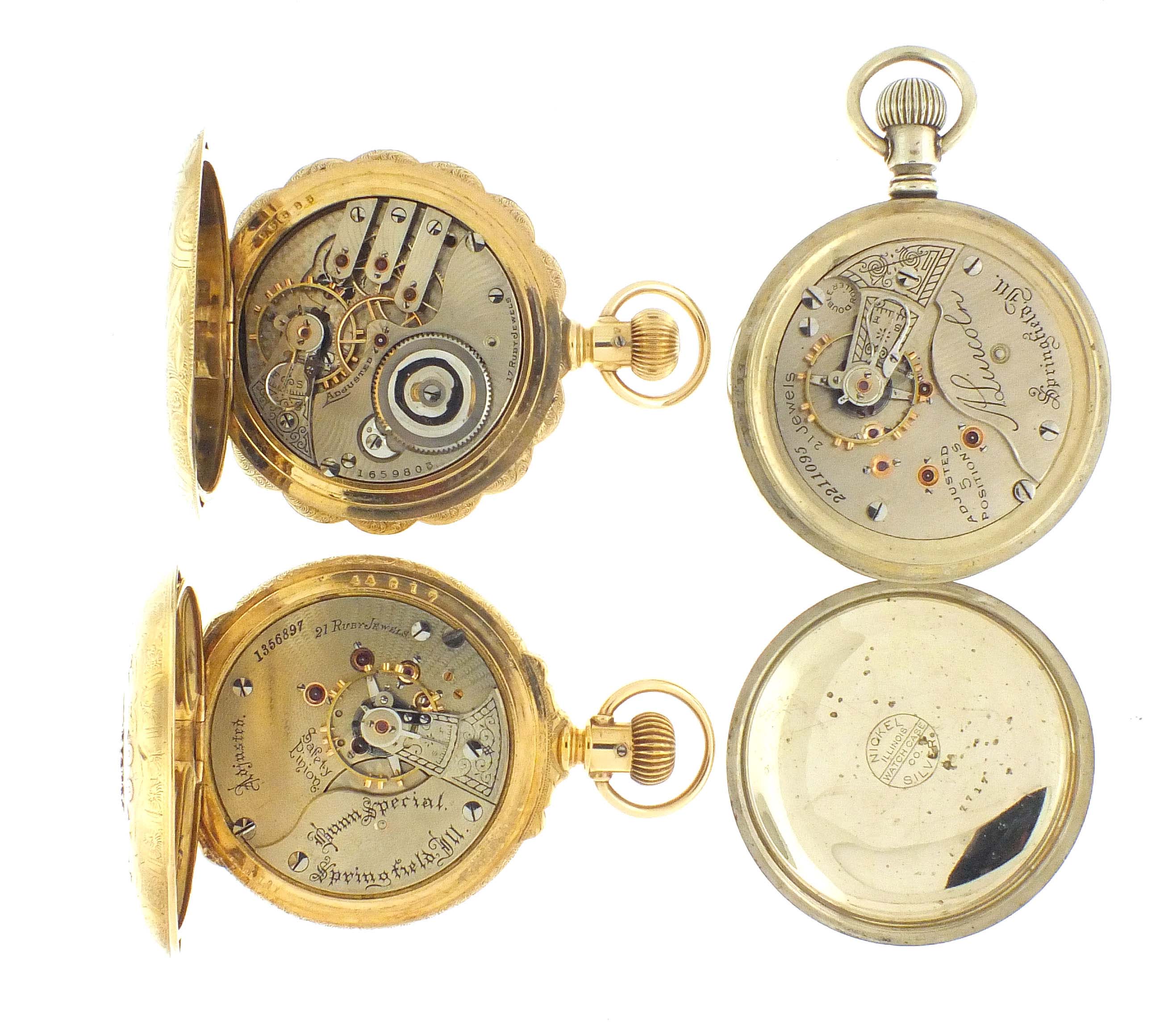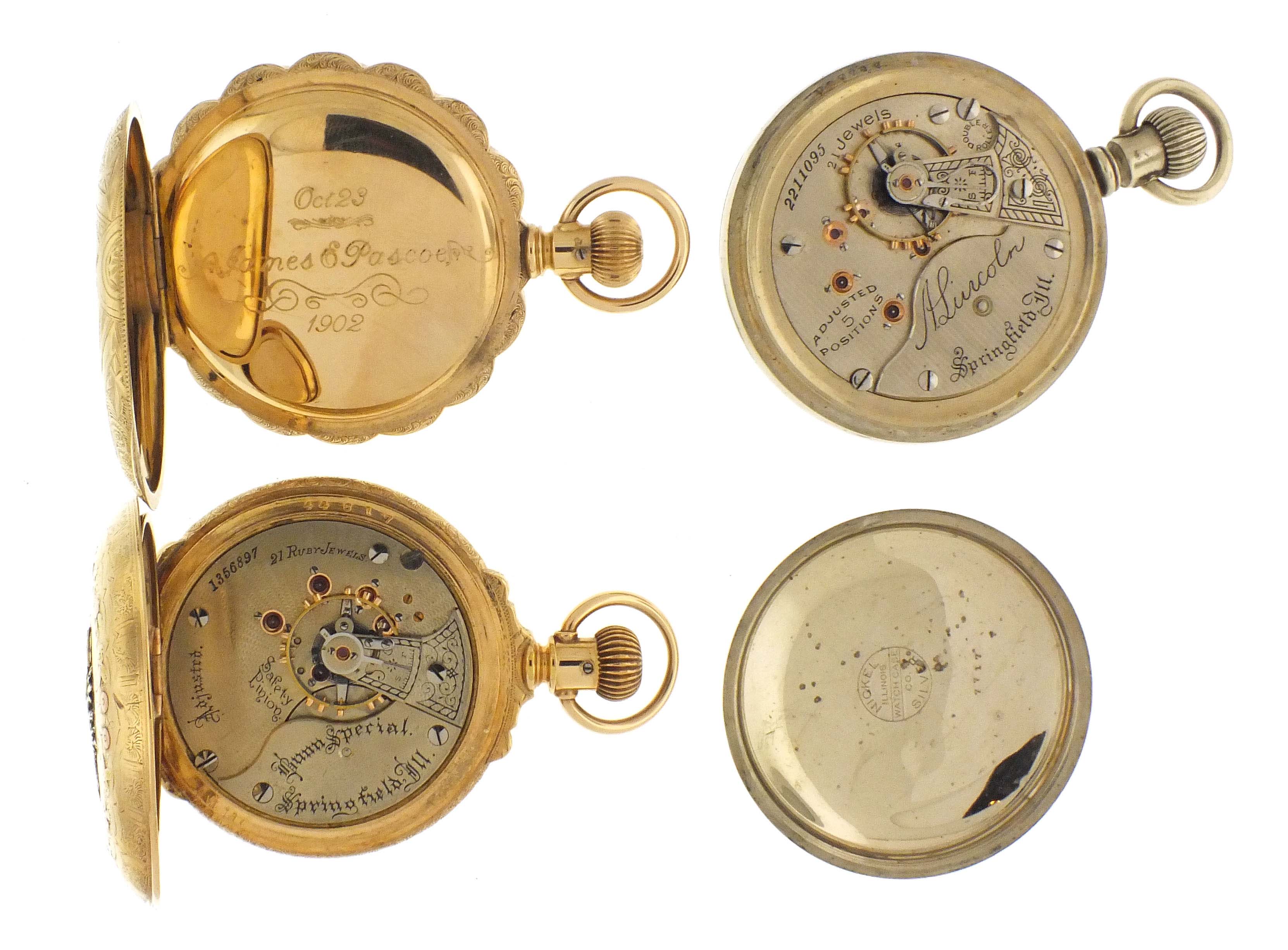3 (Three) pocket watches, 18 size, including an Illinois, grade Bunn Special, 21 jewel movement in gold filled hunting case, serial #1356897, an Illinois, grade "A. Lincoln", 21 jewel movement in open face nickel case with a multicolor gold locomotive, serial #2211095, and an Elgin, grade 187, 17 jewel movement in gold filled hunting case, serial #1659803