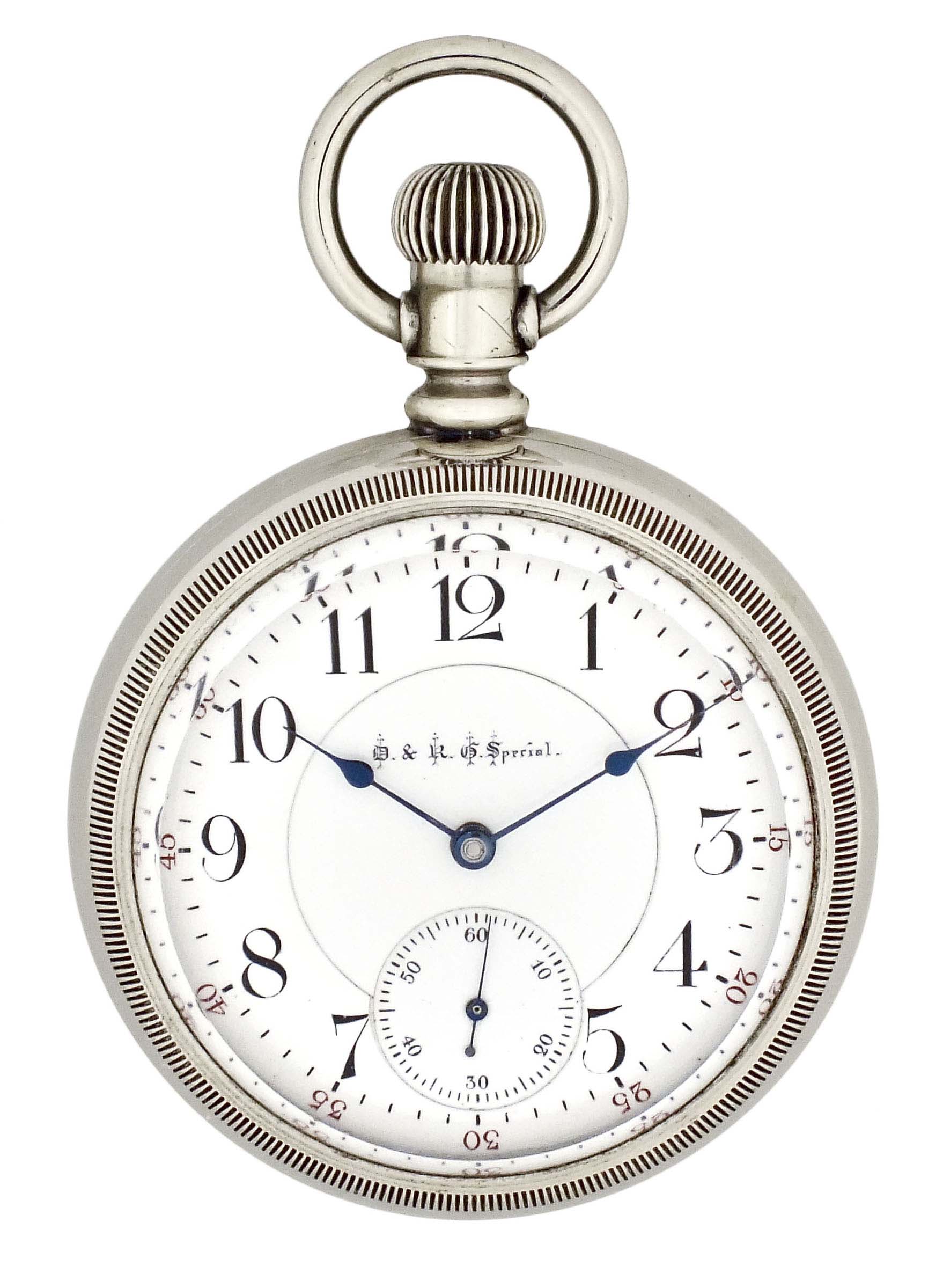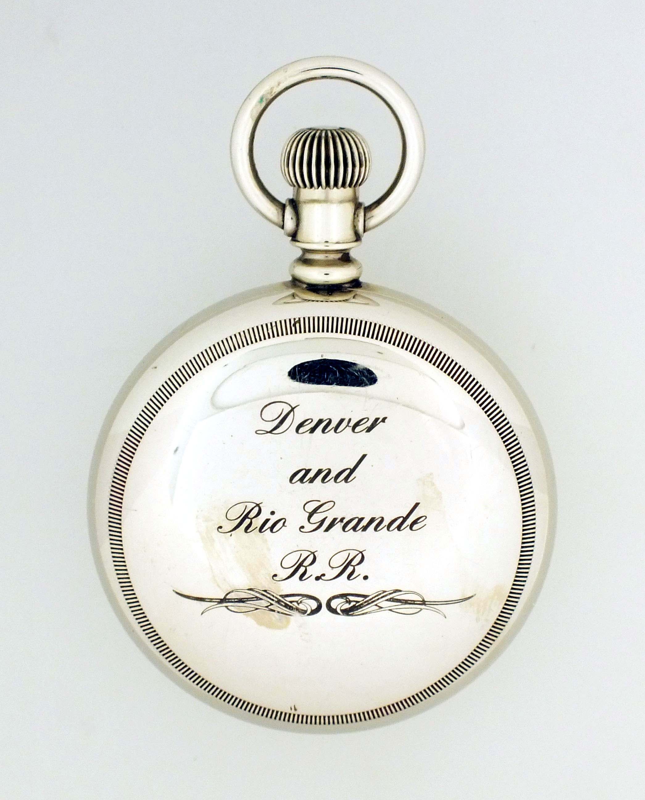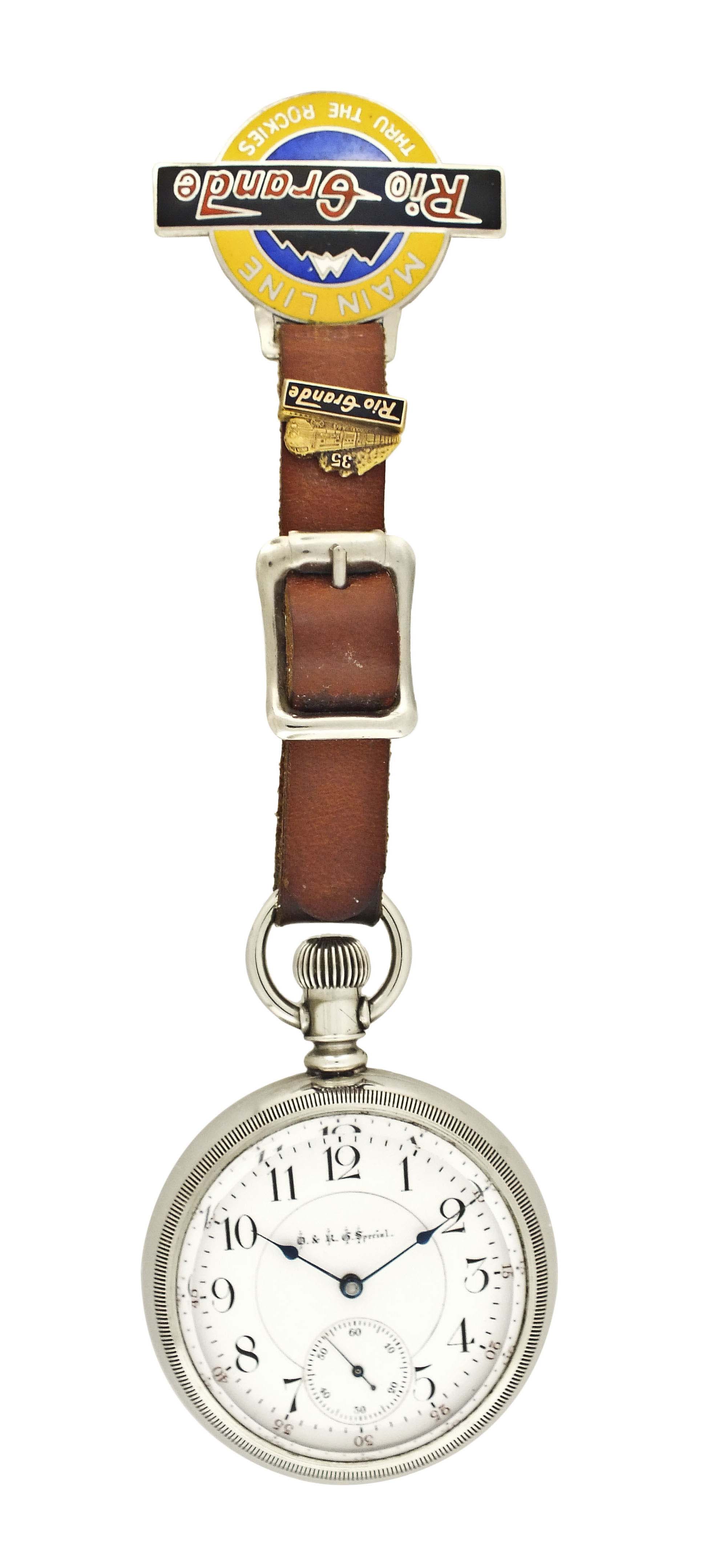 American Waltham Watch Co., Waltham, Mass., a model 1892 "Special" grade pocket watch for the Denver and Rio Grande railroad, 21 jewels, stem wind and lever set, adjusted, damascened nickel plate movement with lever escapement, cut bimetallic balance with gold screws, gold jewel settings and Church micrometric regulator, the top plate marked "D. & R.G. Special" in a nickel, screw back and bezel open face case, the back with later Denver and Rio Grande RR applique, and arabic numeral, outer red 5-minute markers, double sunk white enamel dial marked "D. & R.G. Special", with blued steel spade hands, serial #7902796, together with a late 20th century enamel Rio Grande fob and oak storage box