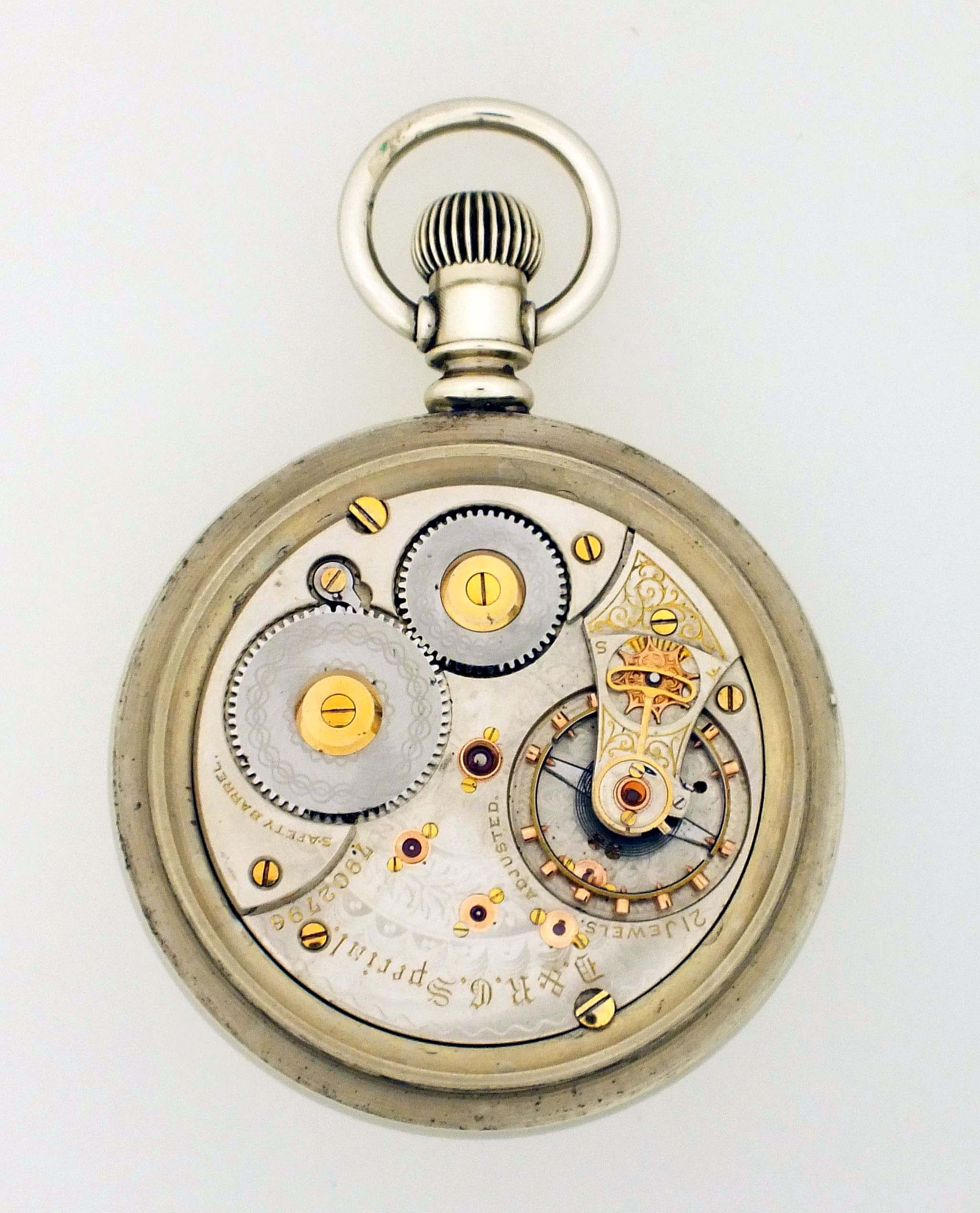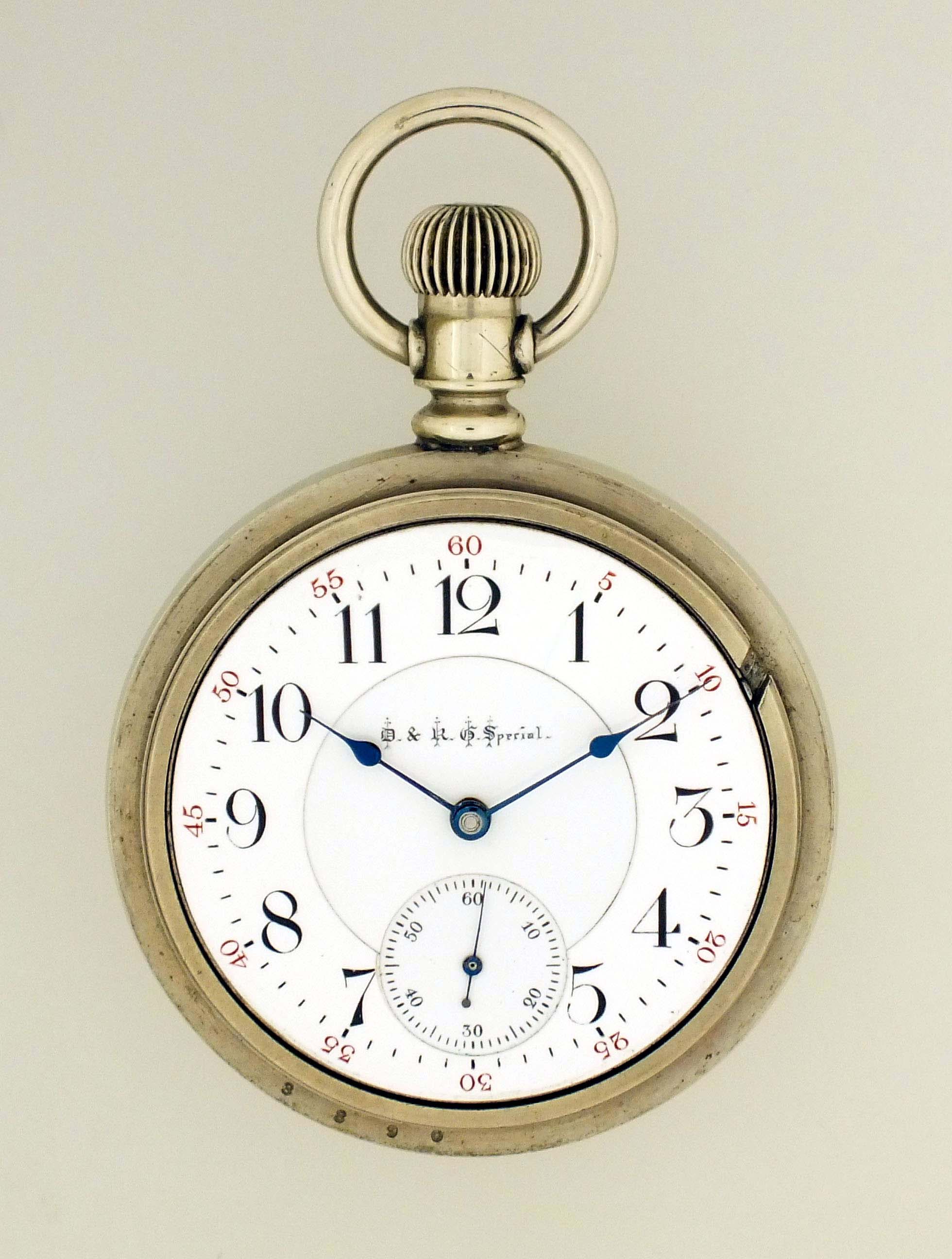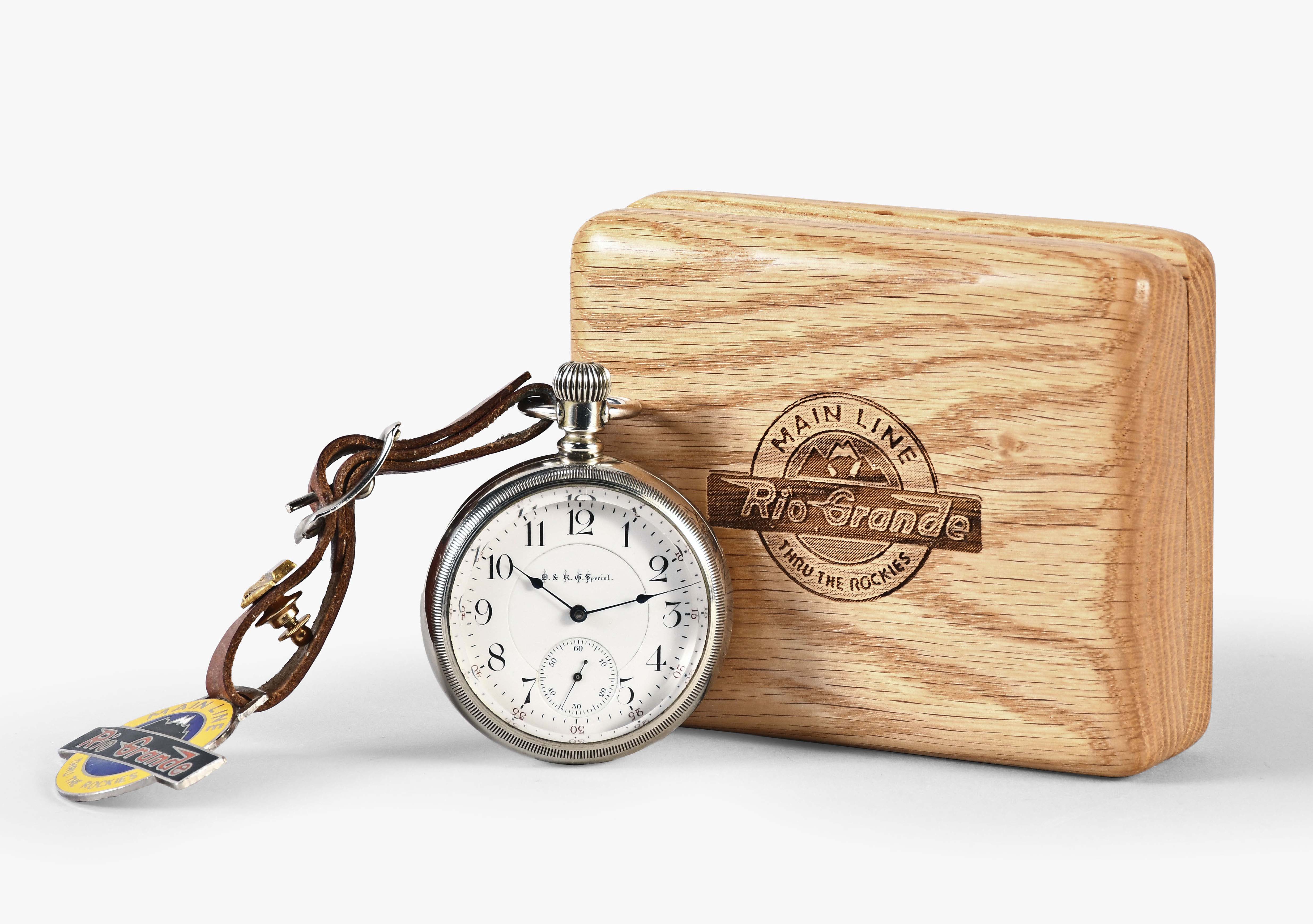 American Waltham Watch Co., Waltham, Mass., a model 1892 "Special" grade pocket watch for the Denver and Rio Grande railroad, 21 jewels, stem wind and lever set, adjusted, damascened nickel plate movement with lever escapement, cut bimetallic balance with gold screws, gold jewel settings and Church micrometric regulator, the top plate marked "D. & R.G. Special" in a nickel, screw back and bezel open face case, the back with later Denver and Rio Grande RR applique, and arabic numeral, outer red 5-minute markers, double sunk white enamel dial marked "D. & R.G. Special", with blued steel spade hands, serial #7902796, together with a late 20th century enamel Rio Grande fob and oak storage box