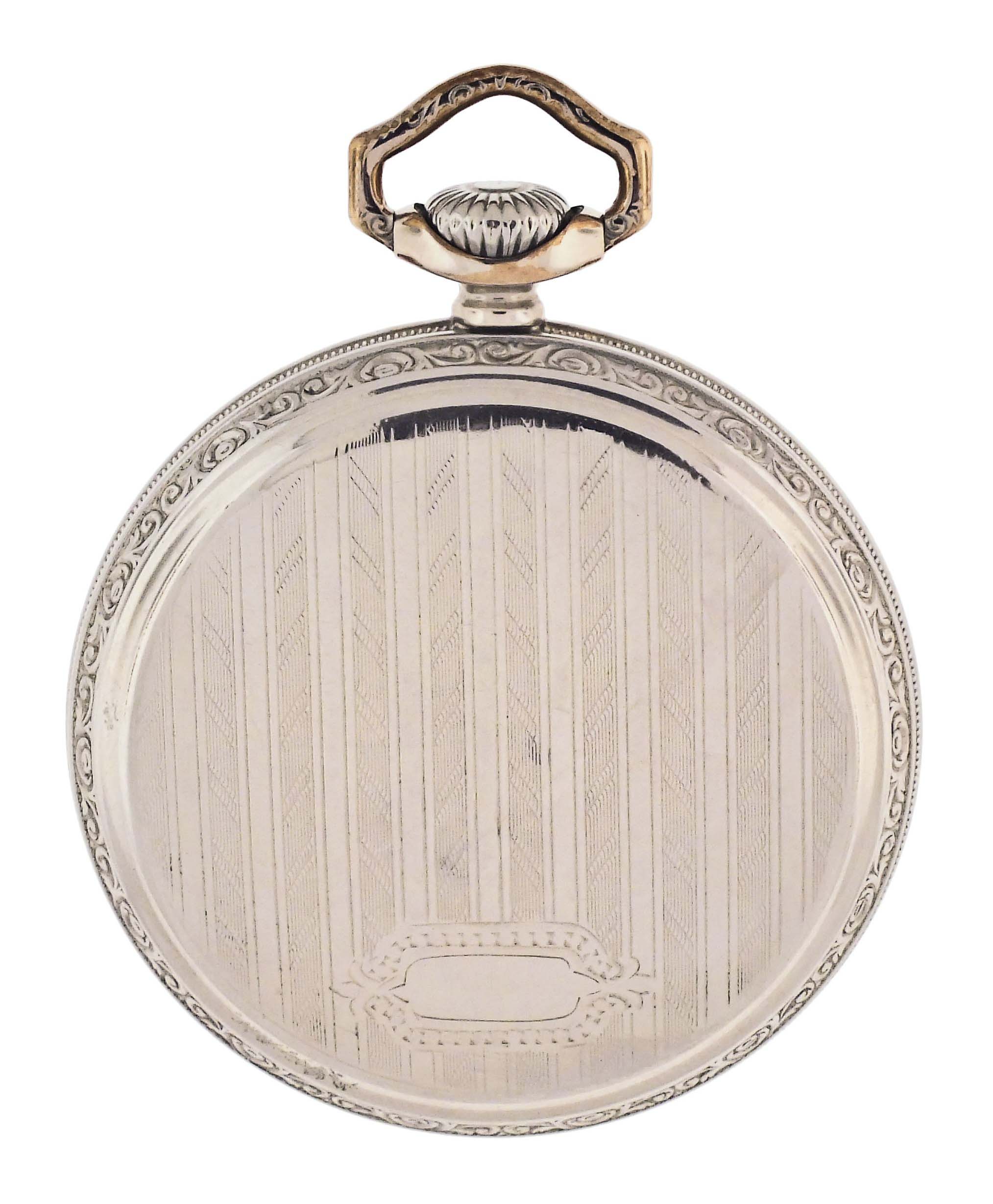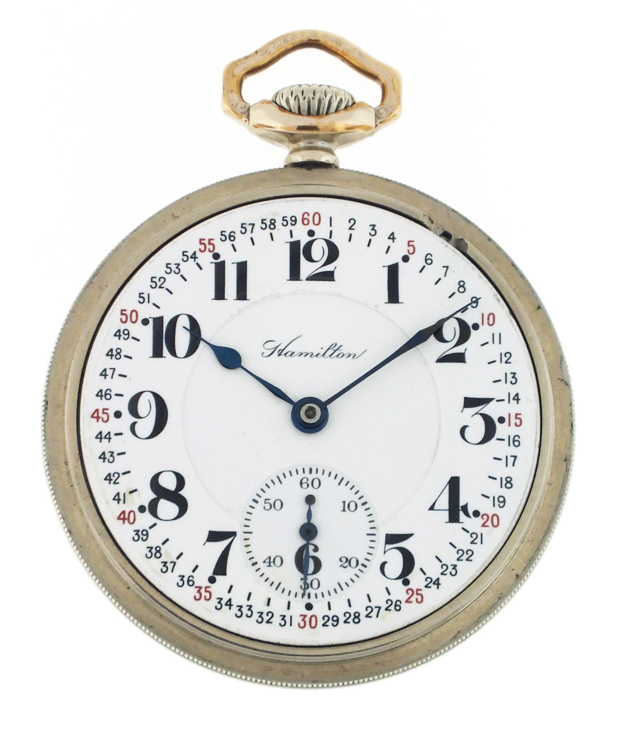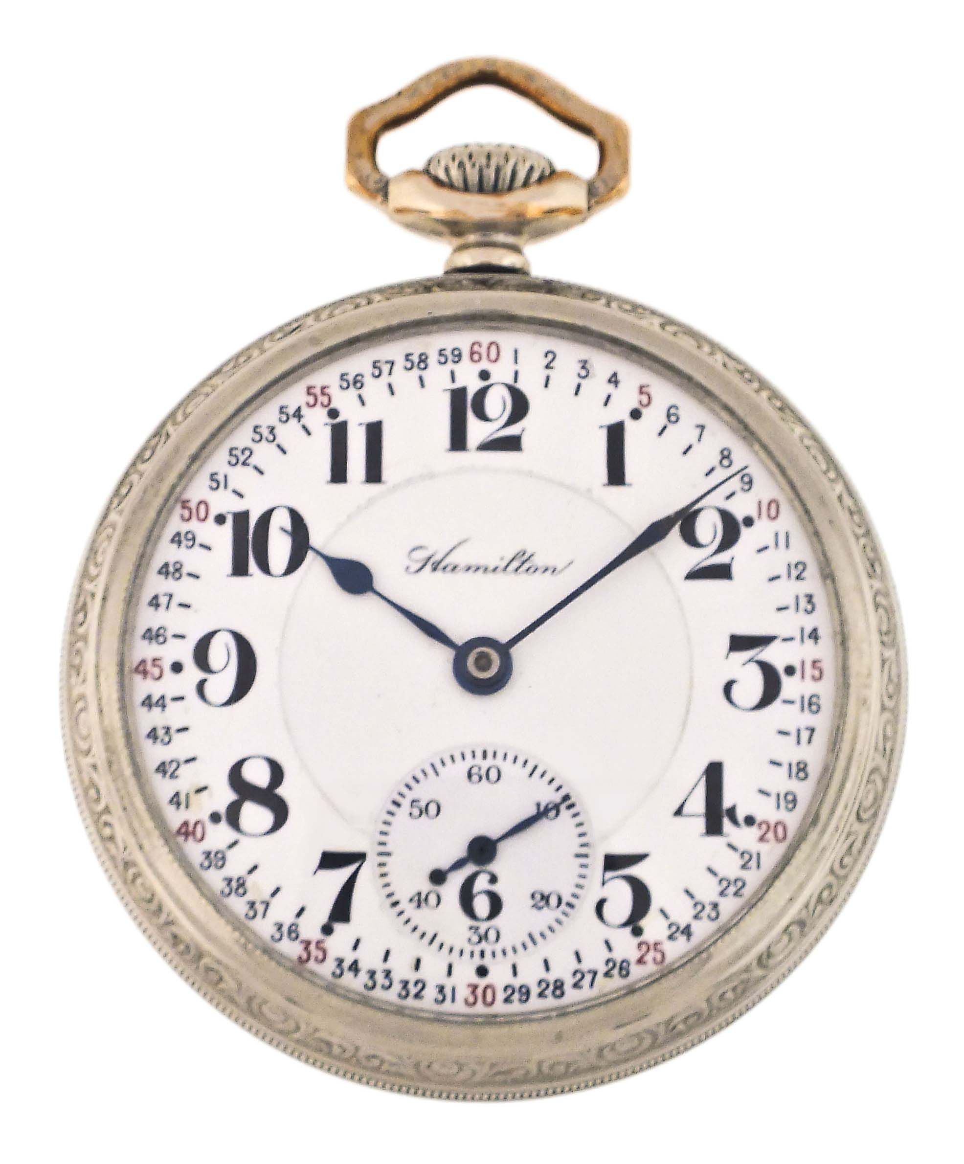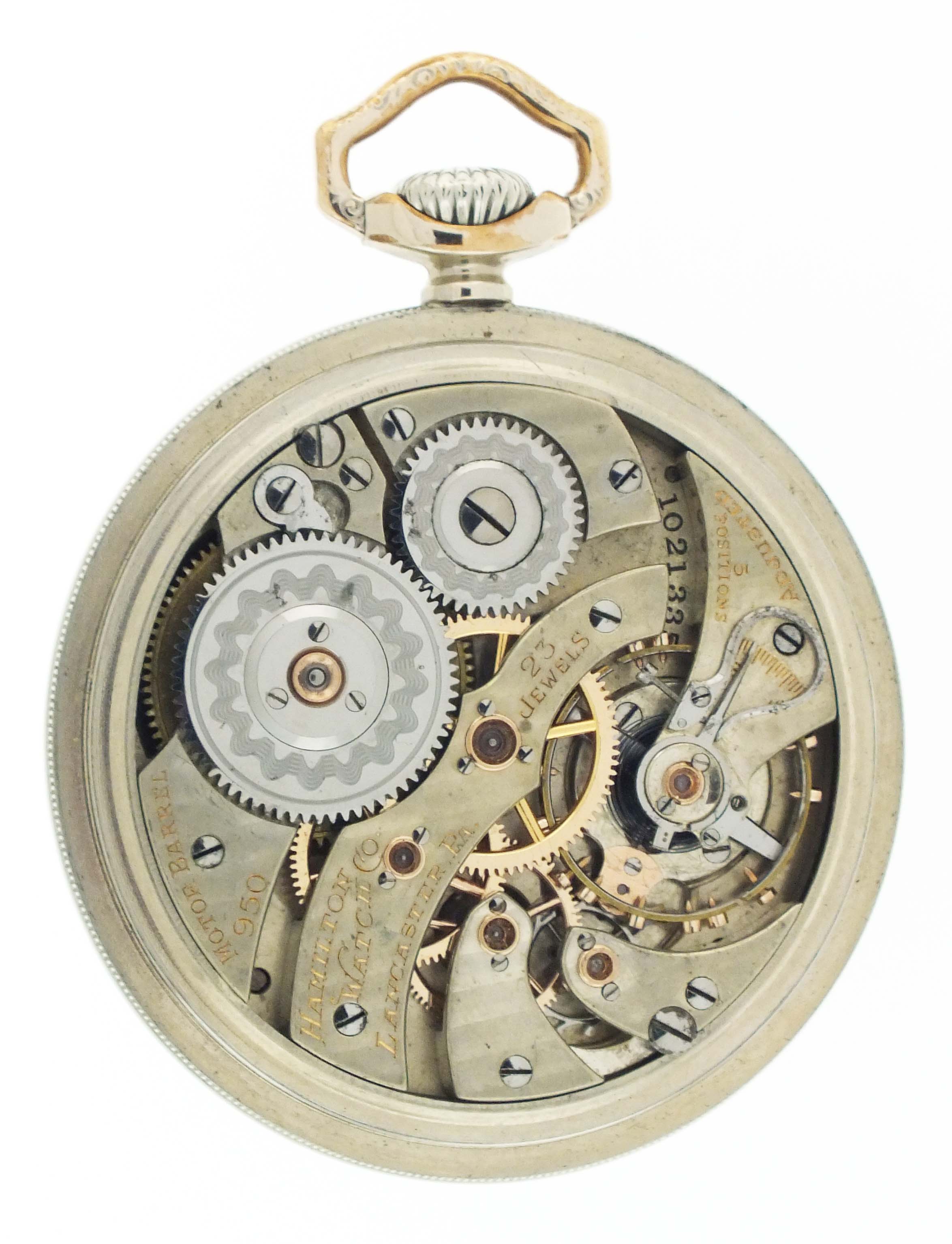 Hamilton Watch Co., Lancaster, Penn., a grade "950" pocket watch, 16 size, 23 jewels, stem wind and lever set, adjusted to 5 positions, temperature and isochronism, damascened nickel plate movement with lever escapement, cut bimetallic balance balance with gold screws, gold jewel settings, gold wheel train and whiplash micrometric regulator in a white gold filled, screw back and bezel, engraved open face case, Montgomery arabic numeral double sunk white enamel dial, blued steel spade and poker hands, serial #1021335
