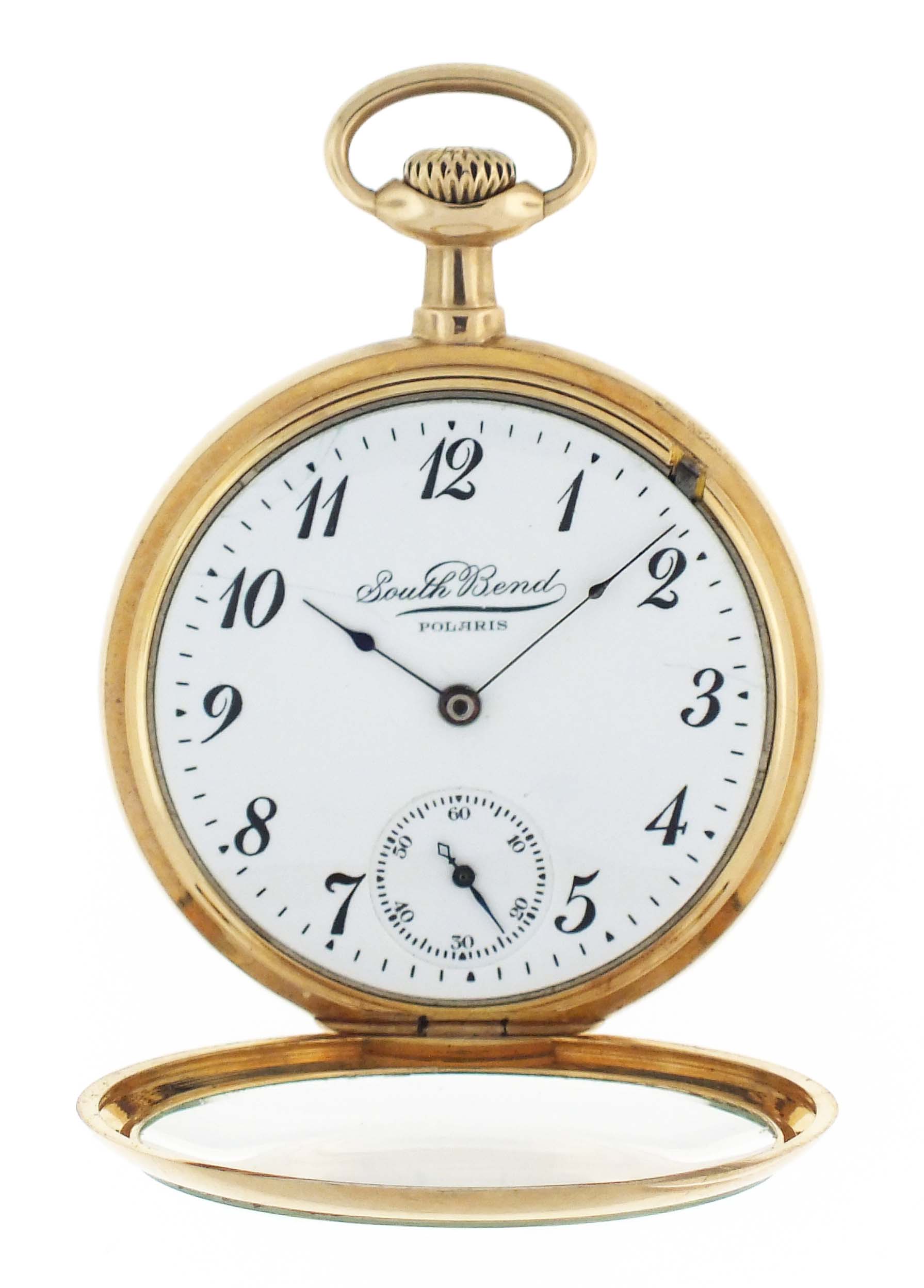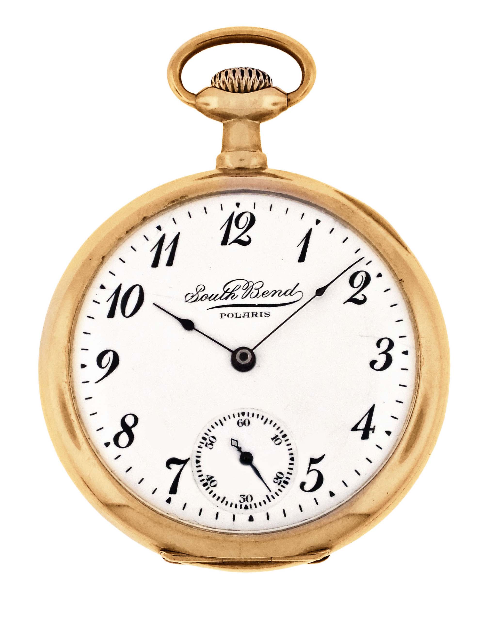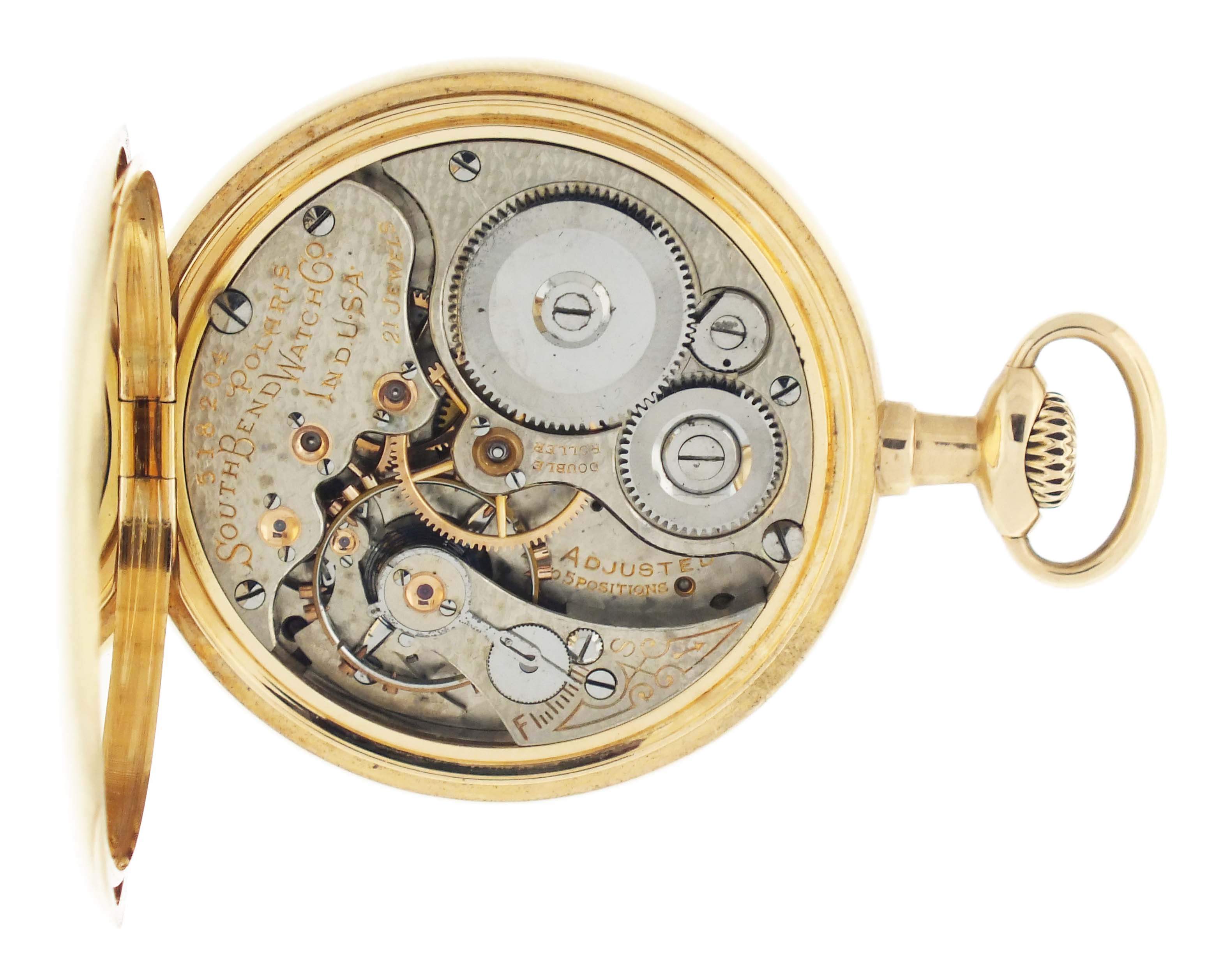 South Bend Watch Co., South Bend, Indiana, an early 20th century gold, grade 295 "Polaris" pocket watch, 16 size, 21 jewels, stem wind and lever set, adjusted to 5 positions, temperature, and isochronism, ornately damascened nickel plate movement with lever escapement, cut bimetallic balance with gold screws, gold jewel settings, gold wheel train, and micrometric regulator, in a 14 karat, yellow gold, hinged back and bezel, plain polished open face case with manufacturers details on gold cuvette, arabic numeral single sunk white enamel dial signed "South Bend Polaris", blued steel spade hands, serial #518204, 89.8g TW