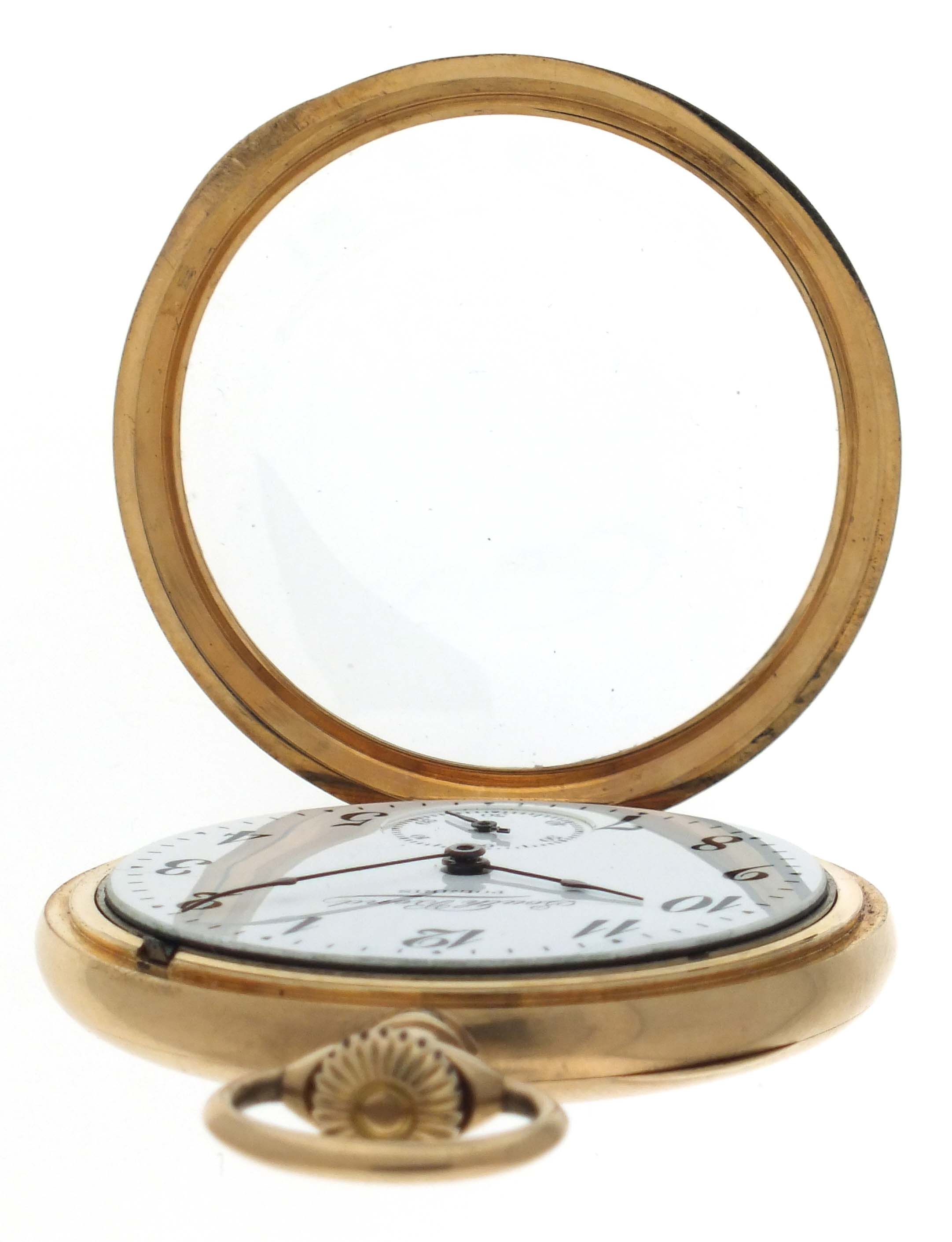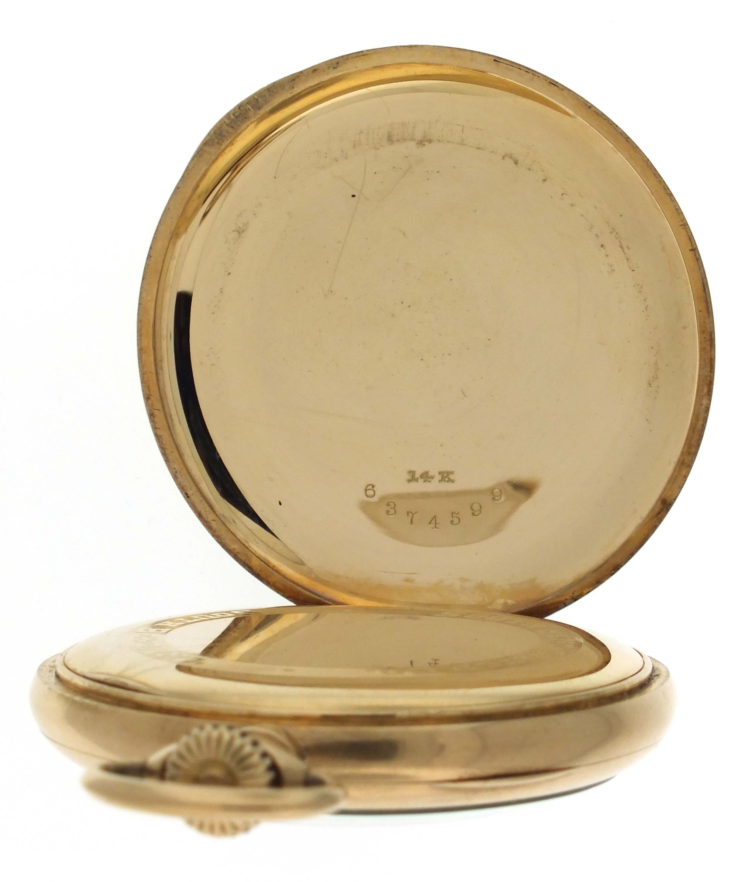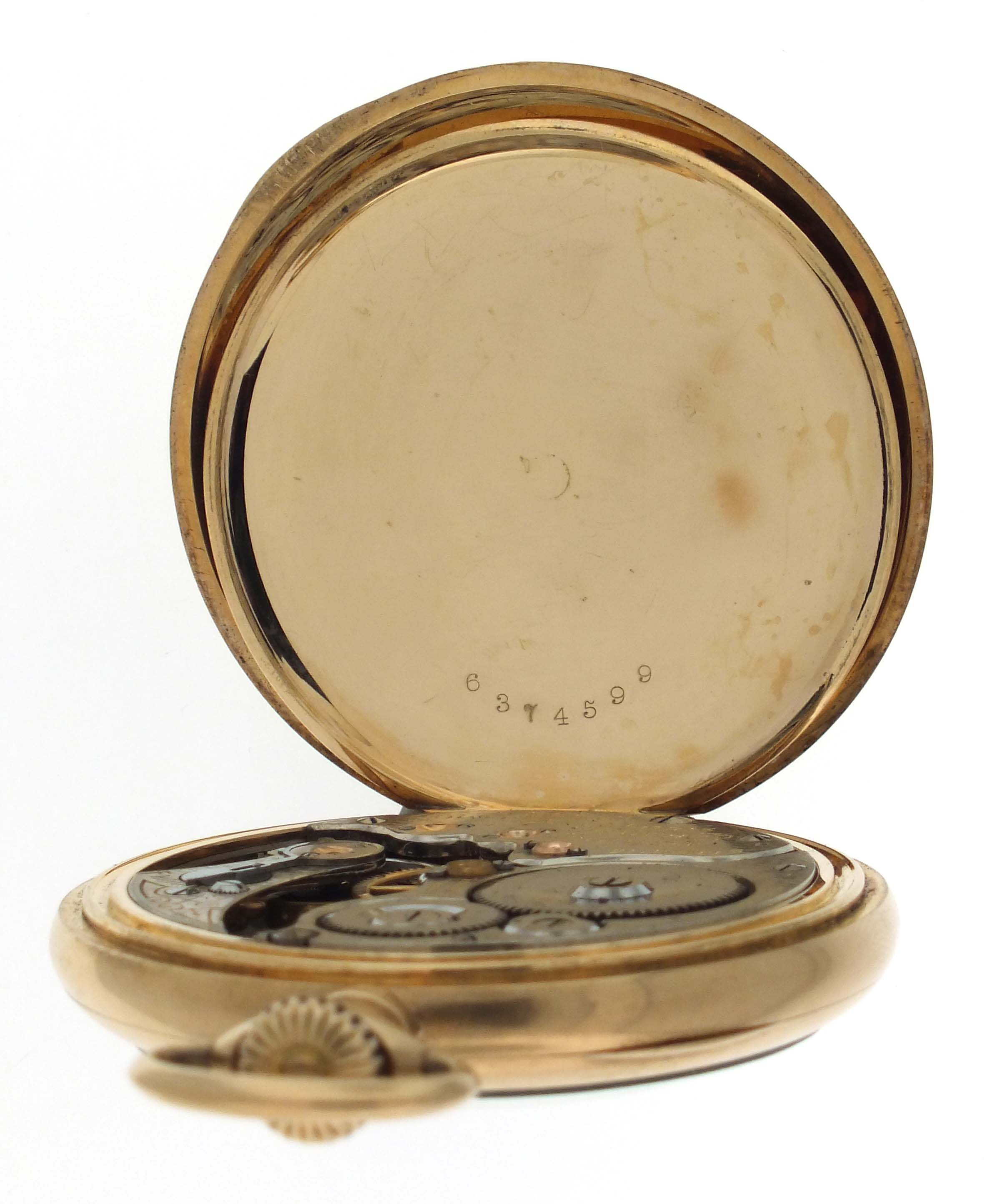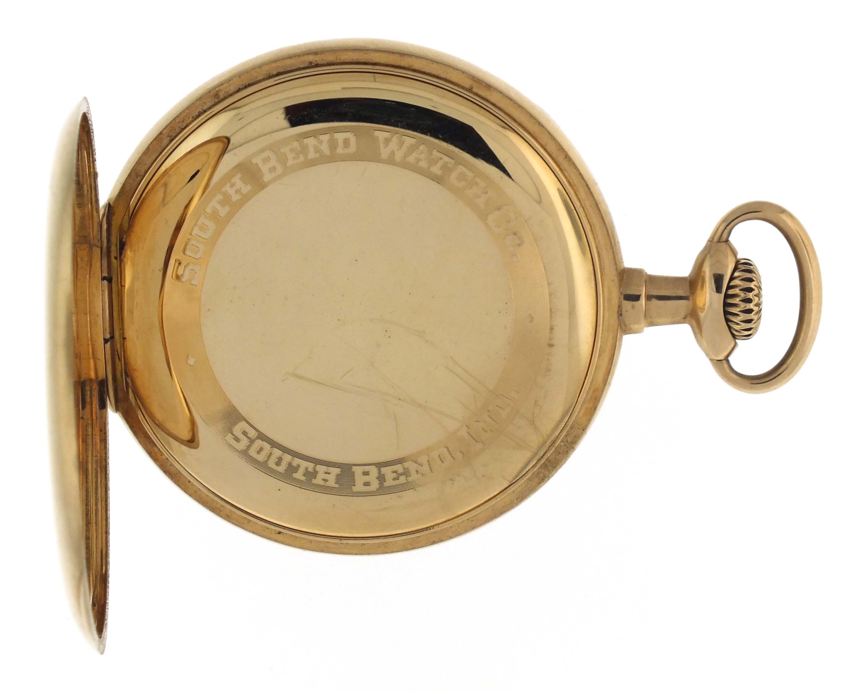 South Bend Watch Co., South Bend, Indiana, an early 20th century gold, grade 295 "Polaris" pocket watch, 16 size, 21 jewels, stem wind and lever set, adjusted to 5 positions, temperature, and isochronism, ornately damascened nickel plate movement with lever escapement, cut bimetallic balance with gold screws, gold jewel settings, gold wheel train, and micrometric regulator, in a 14 karat, yellow gold, hinged back and bezel, plain polished open face case with manufacturers details on gold cuvette, arabic numeral single sunk white enamel dial signed "South Bend Polaris", blued steel spade hands, serial #518204, 89.8g TW